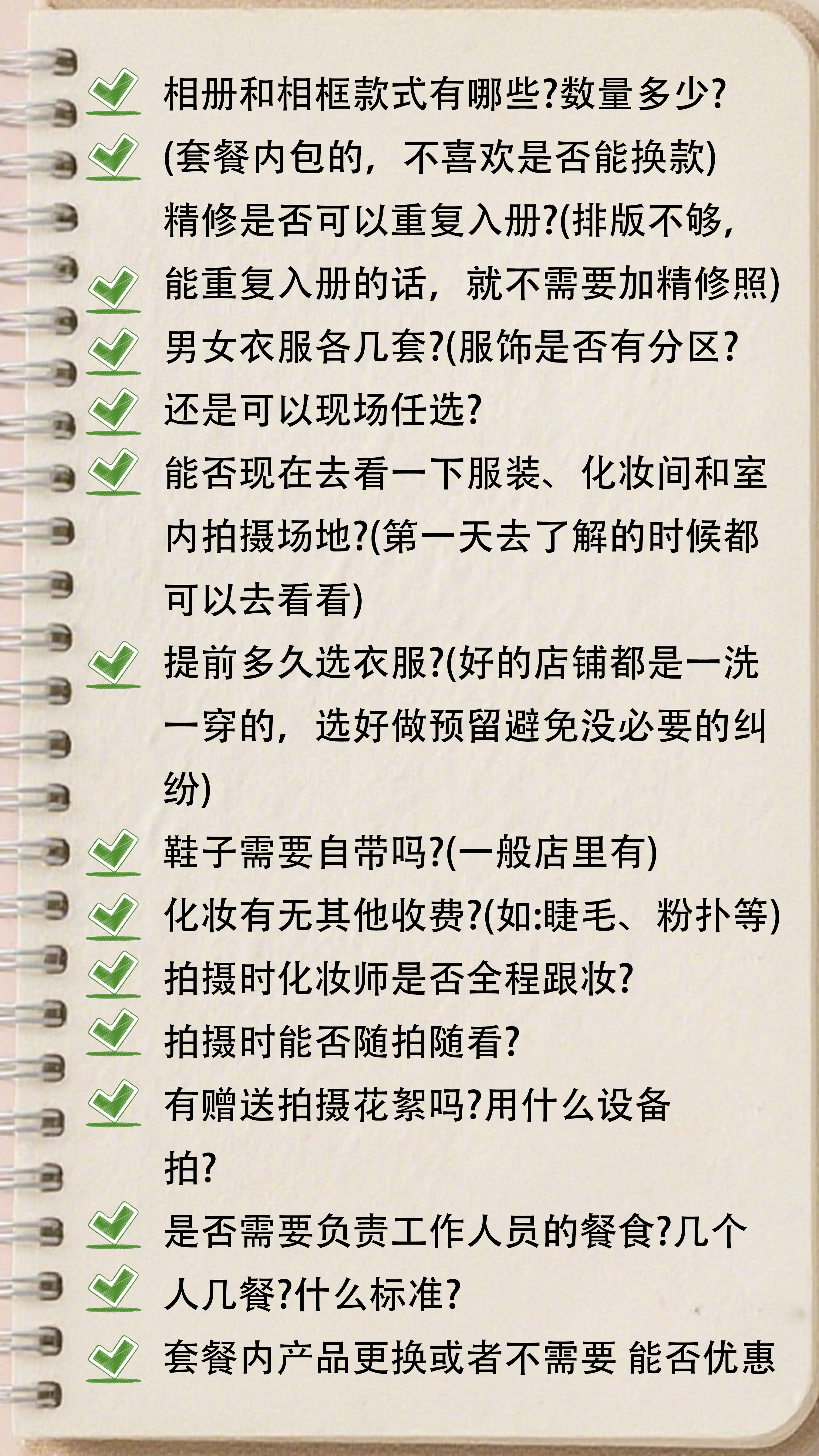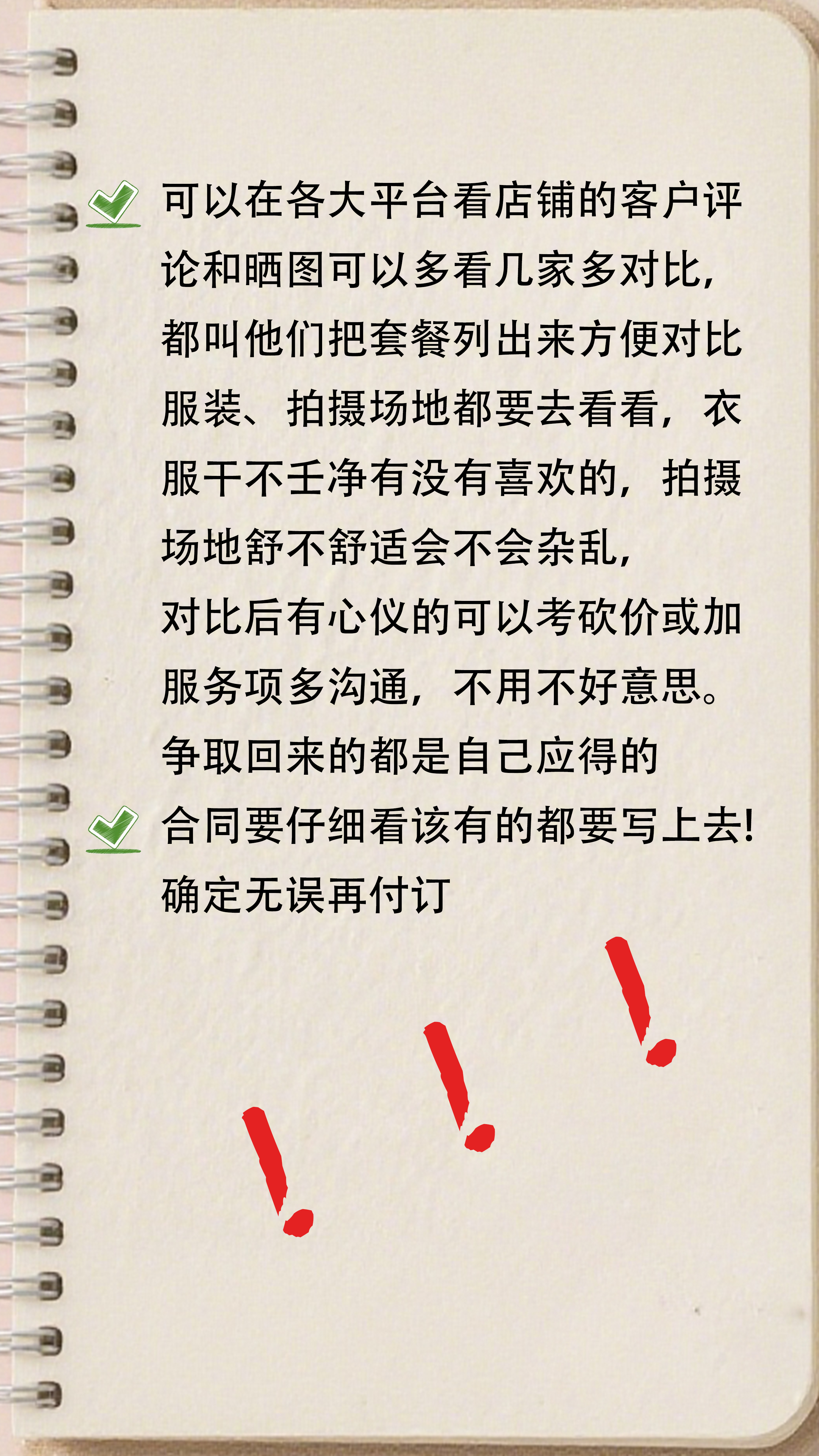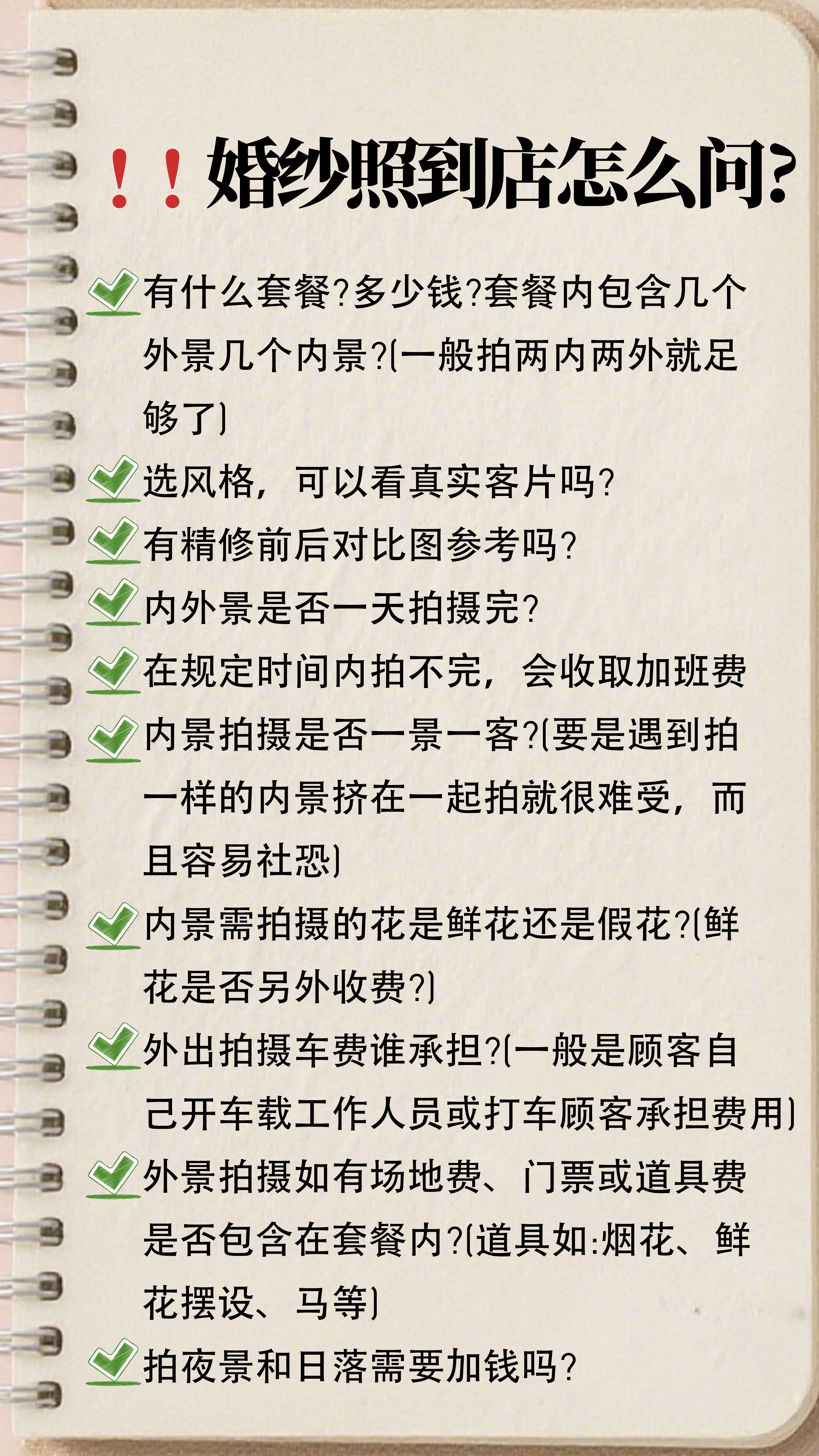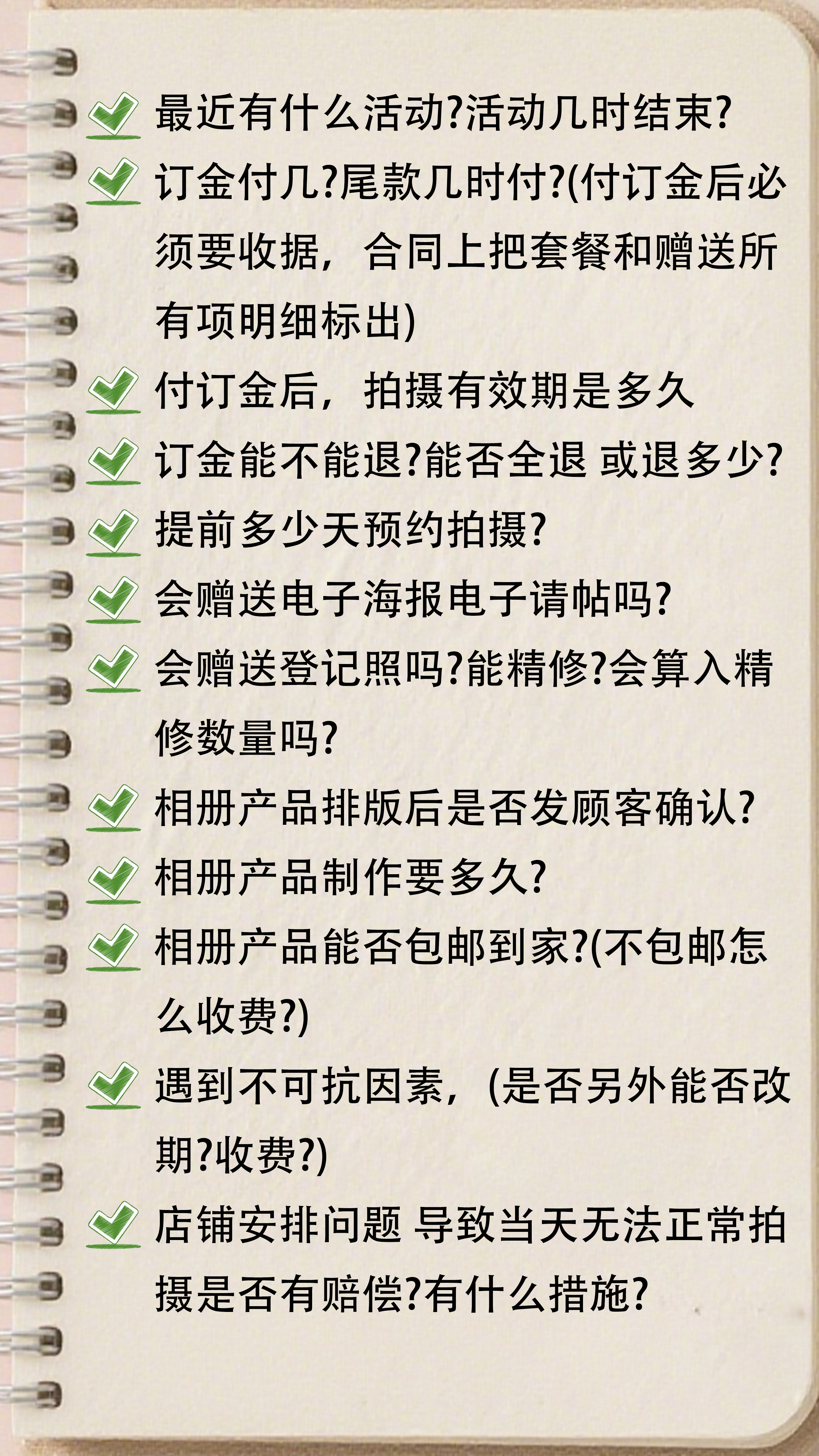 • 备婚仙女们注意啦!✨ 预约婚纱照千万别当傻白甜~ 这些必问清单赶紧码住!!📝 不问清楚分分钟踩雷😭 🔻【套餐核心三连问】🔻 ✅精修张数多少?底片是否全送?🎞️ ✅服装分区吗?任选or加钱?👗 ✅外景车费/门票谁承担?🚗 🔻【费用重点问清楚】🔻 ✅订金比例?尾款时间?💰 ✅改期如何收费?天气突变怎么办?☔ ✅所有费用写进合同!拒绝隐形消费!📄 🔻【摄影师超重要】🔻 ✅能看客片吗?指定要加钱吗?📸 ✅拍摄团队是否一对一?👥 ✅不满意可否重拍?流程怎么走?🔄 🔻【后期必问细节】🔻 ✅精修周期多久?重修几次?✏️ ✅相册材质?升级价格?🖼️ ✅所有成品邮寄费用谁出?📦 🔻【档期灵魂拷问】🔻 ✅保留多久?过期怎处理?⏰ ✅优先改期权有吗?🎫 ✅旺季延期如何保障?📅 ✨最终秘诀: 所有承诺必须写进合同! 口头答应都是泡沫!!🙅‍♀️ 现在预约记得掏出这条! 对着清单逐条问!! 省下钱钱买奶茶不香吗?🥤#鲜活又明媚的婚纱照