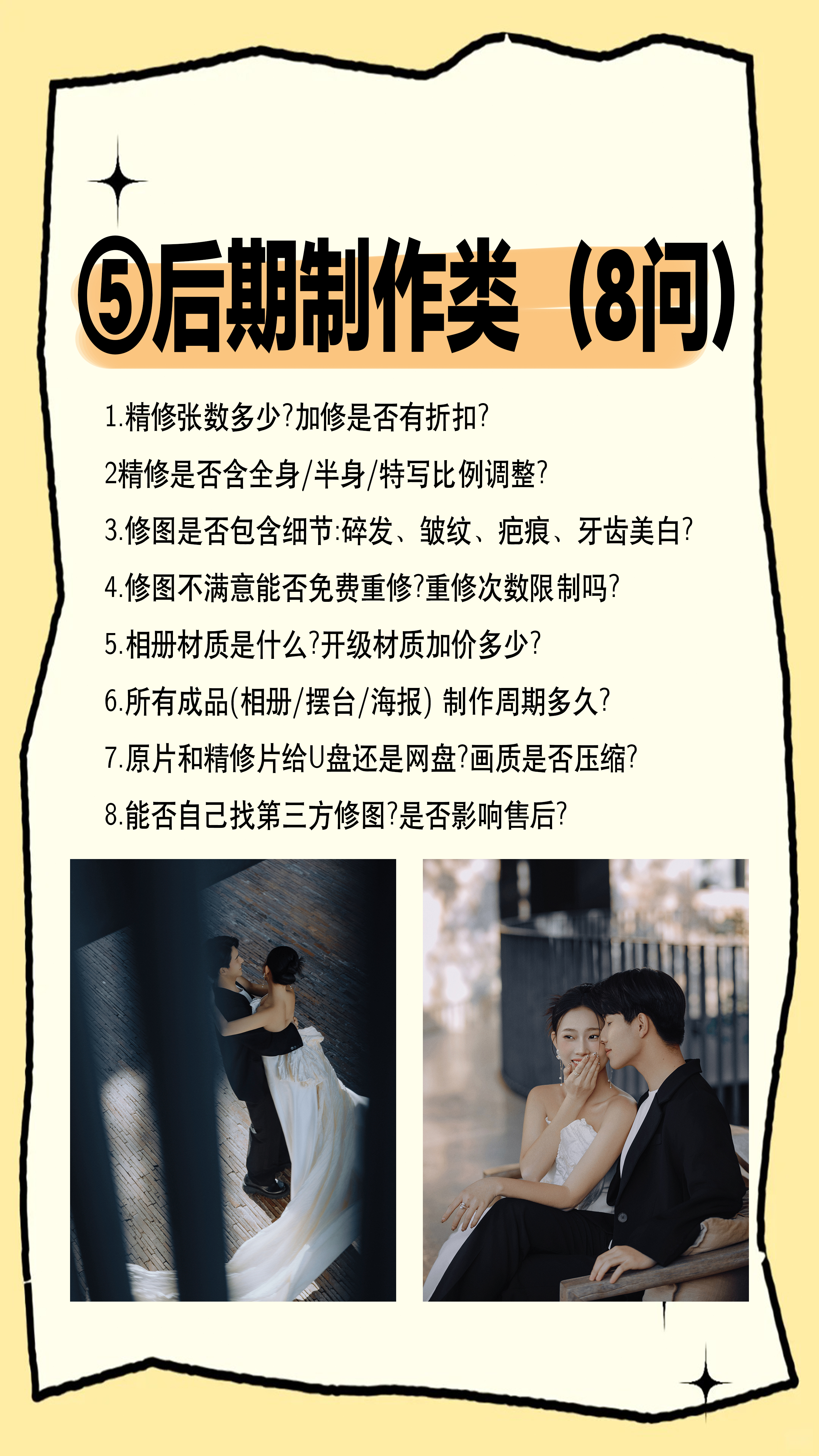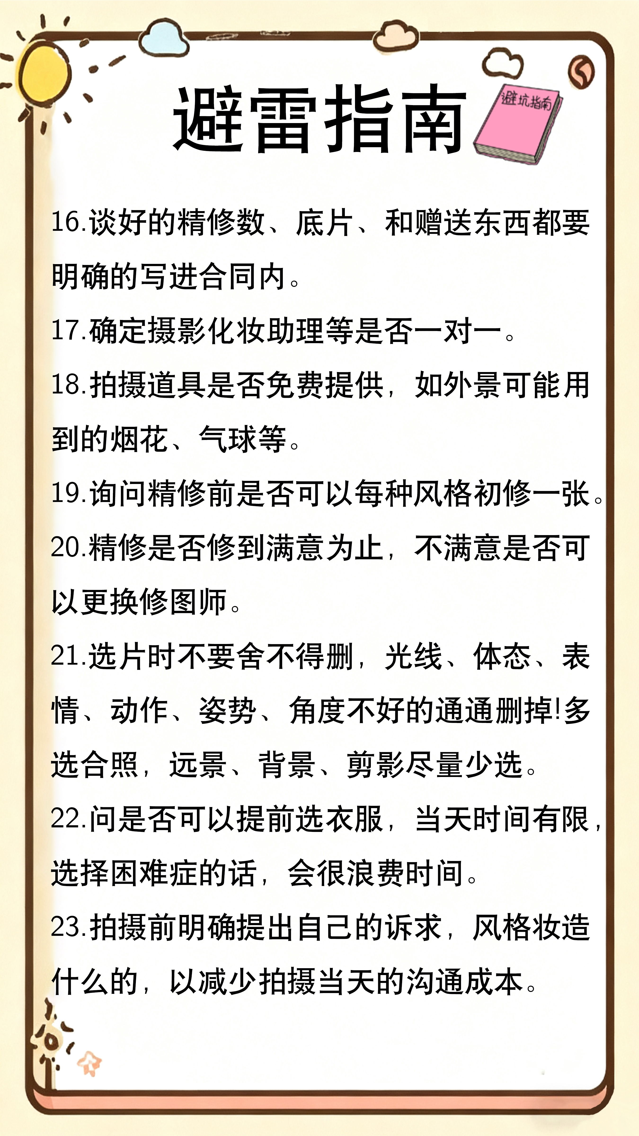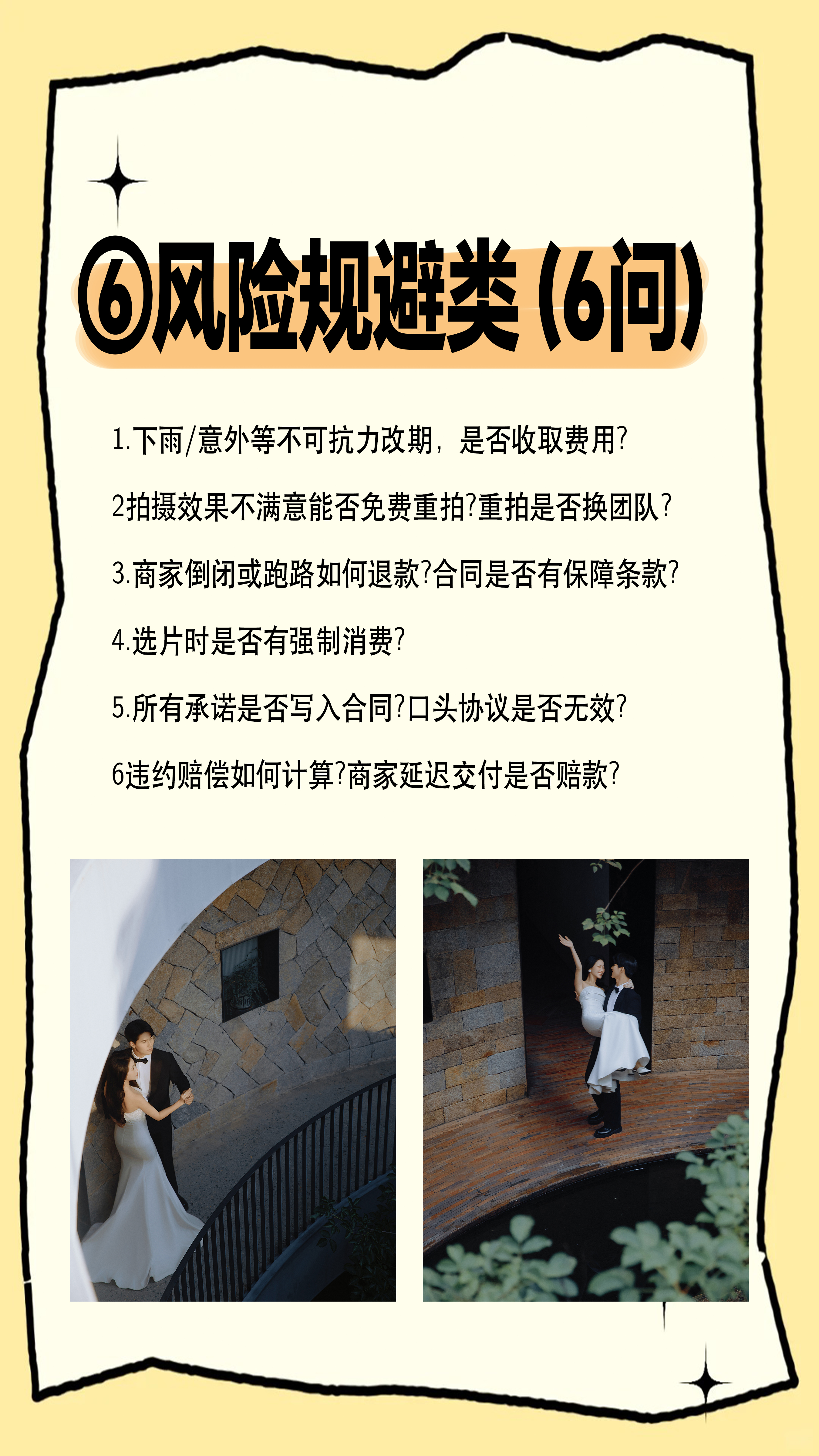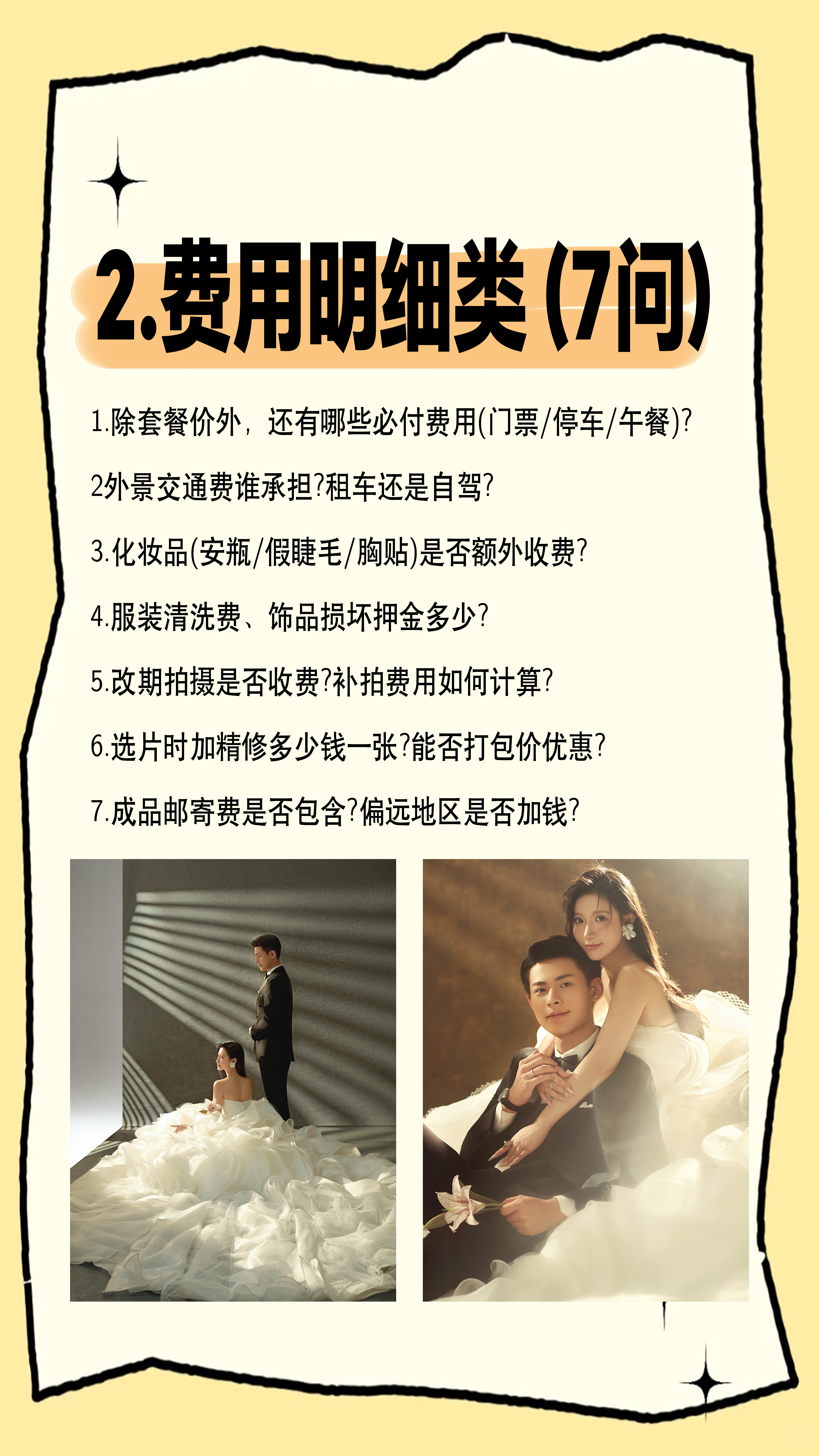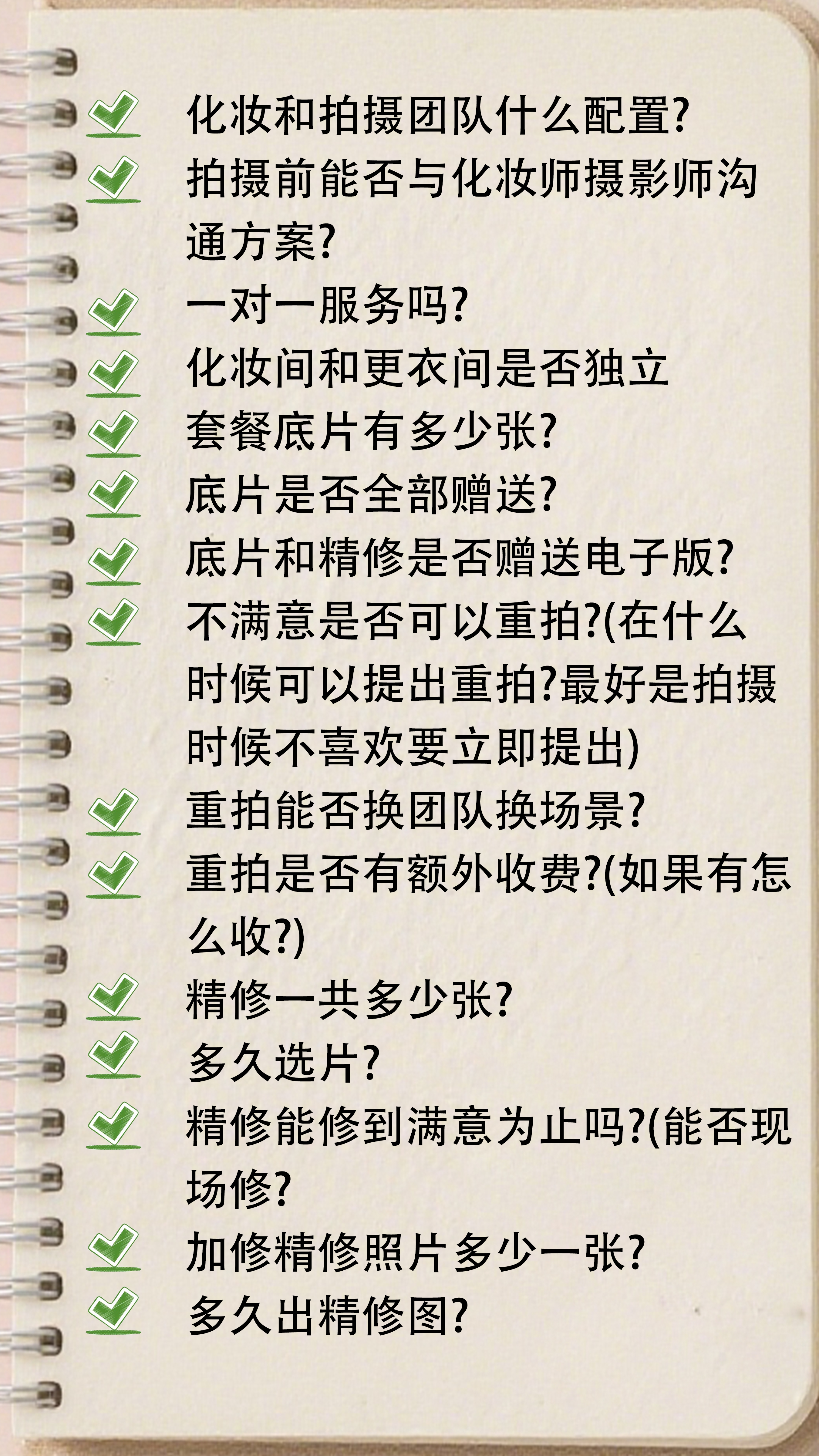 • 备婚仙女们注意啦!✨ 预约婚纱照千万别当傻白甜~ 这些必问清单赶紧码住!!📝 不问清楚分分钟踩雷😭 🔻【套餐核心三连问】🔻 ✅精修张数多少?底片是否全送?🎞️ ✅服装分区吗?任选or加钱?👗 ✅外景车费/门票谁承担?🚗 🔻【费用重点问清楚】🔻 ✅订金比例?尾款时间?💰 ✅改期如何收费?天气突变怎么办?☔ ✅所有费用写进合同!拒绝隐形消费!📄 🔻【摄影师超重要】🔻 ✅能看客片吗?指定要加钱吗?📸 ✅拍摄团队是否一对一?👥 ✅不满意可否重拍?流程怎么走?🔄 🔻【后期必问细节】🔻 ✅精修周期多久?重修几次?✏️ ✅相册材质?升级价格?🖼️ ✅所有成品邮寄费用谁出?📦 🔻【档期灵魂拷问】🔻 ✅保留多久?过期怎处理?⏰ ✅优先改期权有吗?🎫 ✅旺季延期如何保障?📅 ✨最终秘诀: 所有承诺必须写进合同! 口头答应都是泡沫!!🙅‍♀️ 现在预约记得掏出这条! 对着清单逐条问!! 省下钱钱买奶茶不香吗?🥤#鲜活又明媚的婚纱照