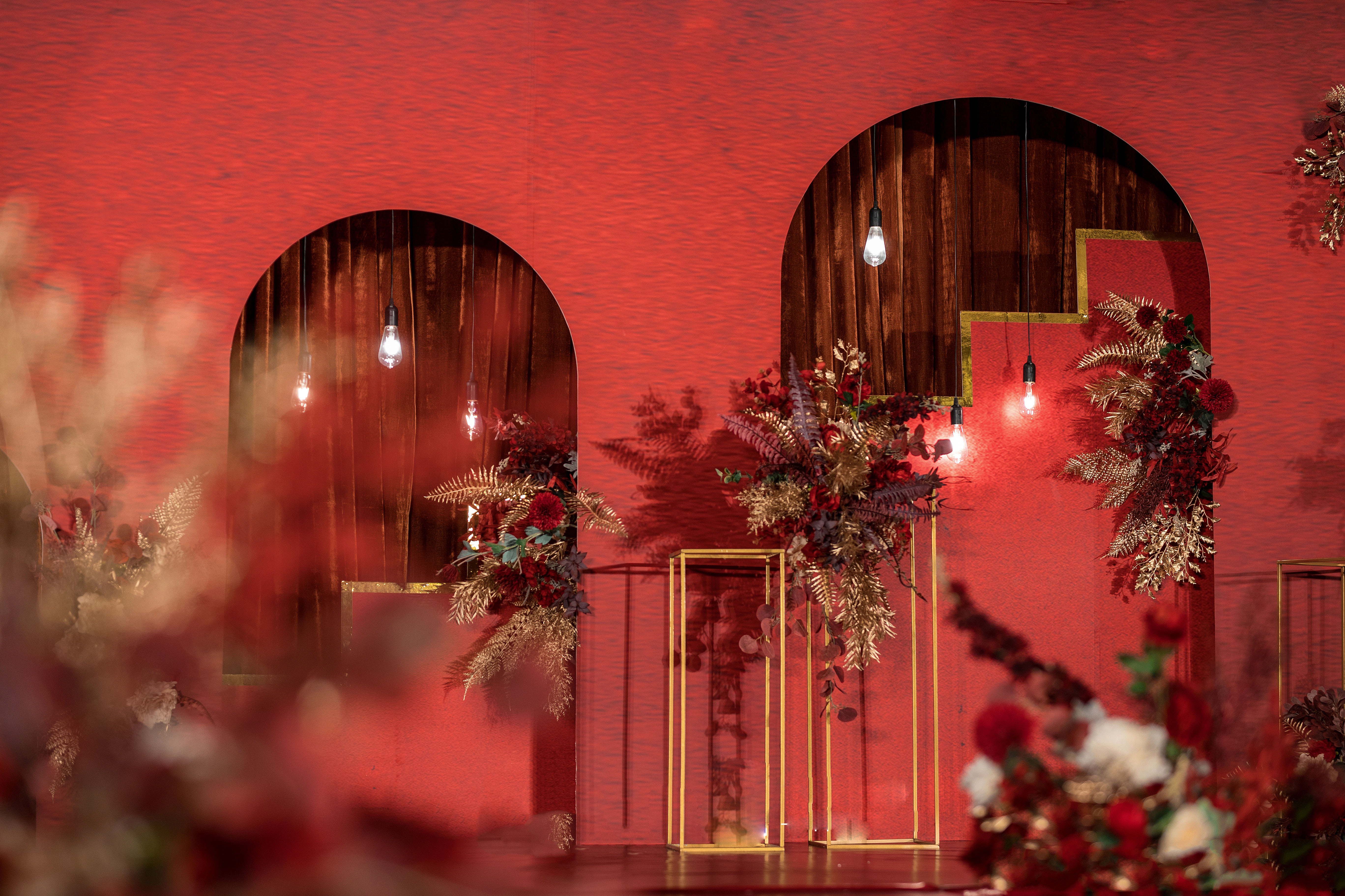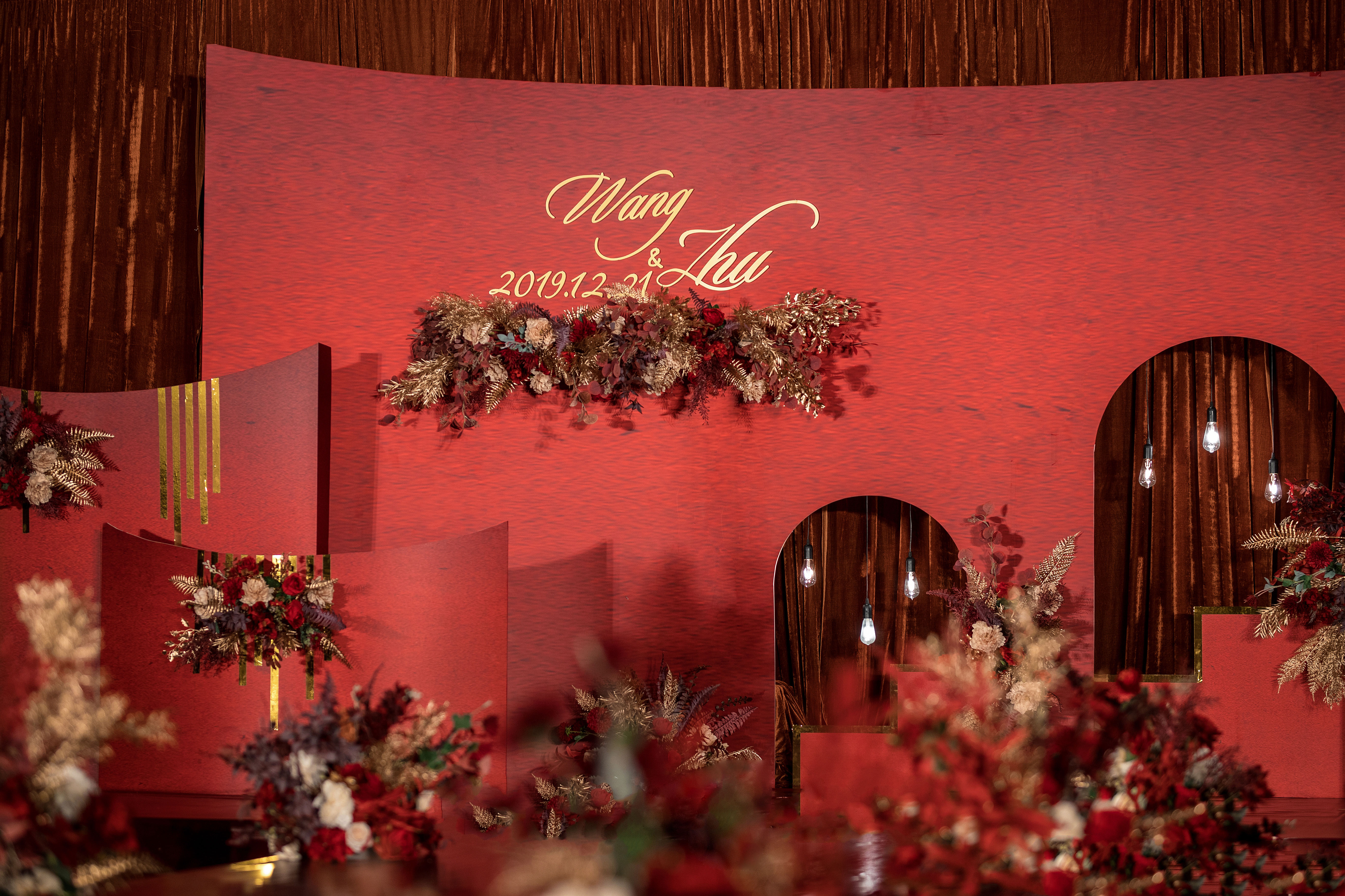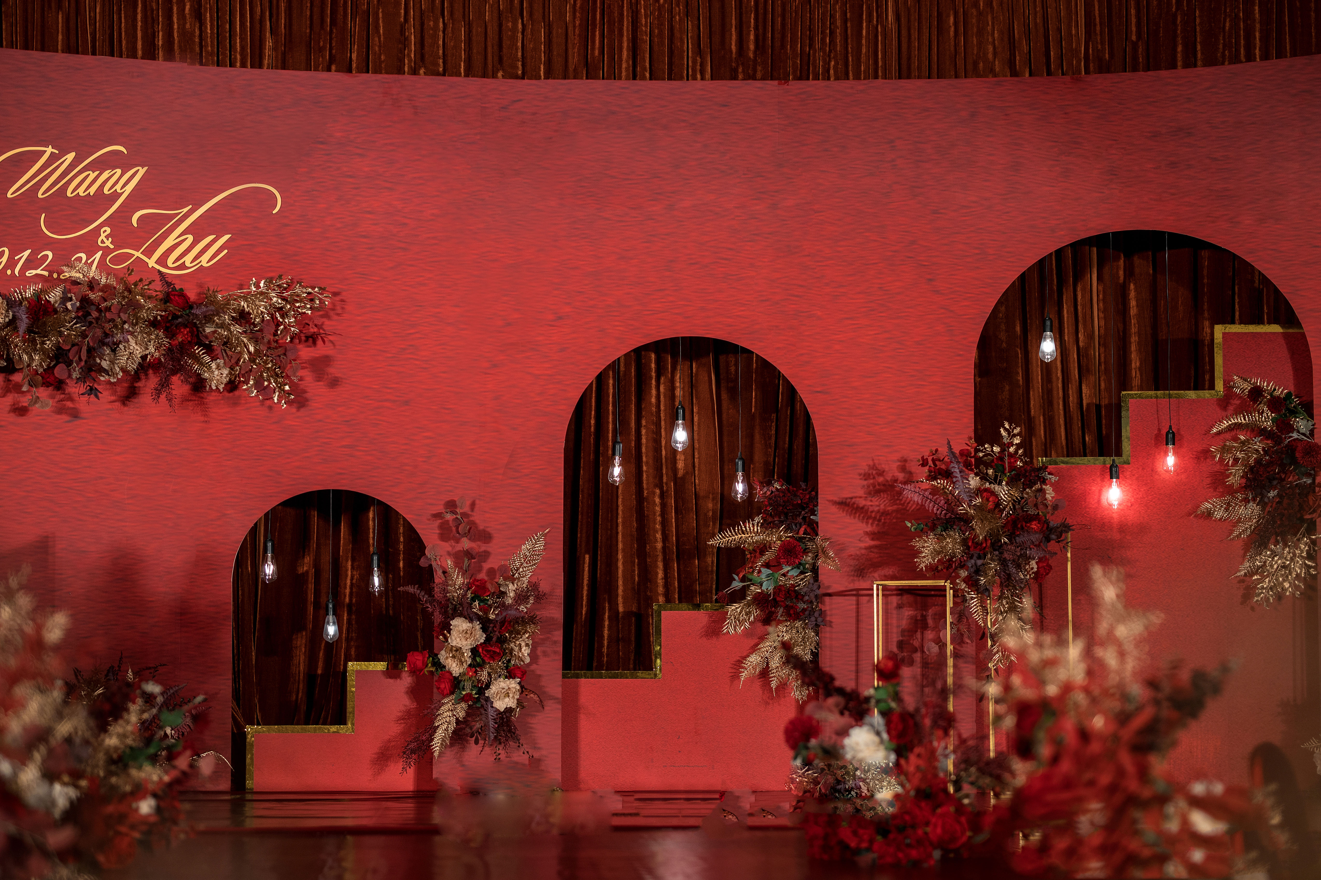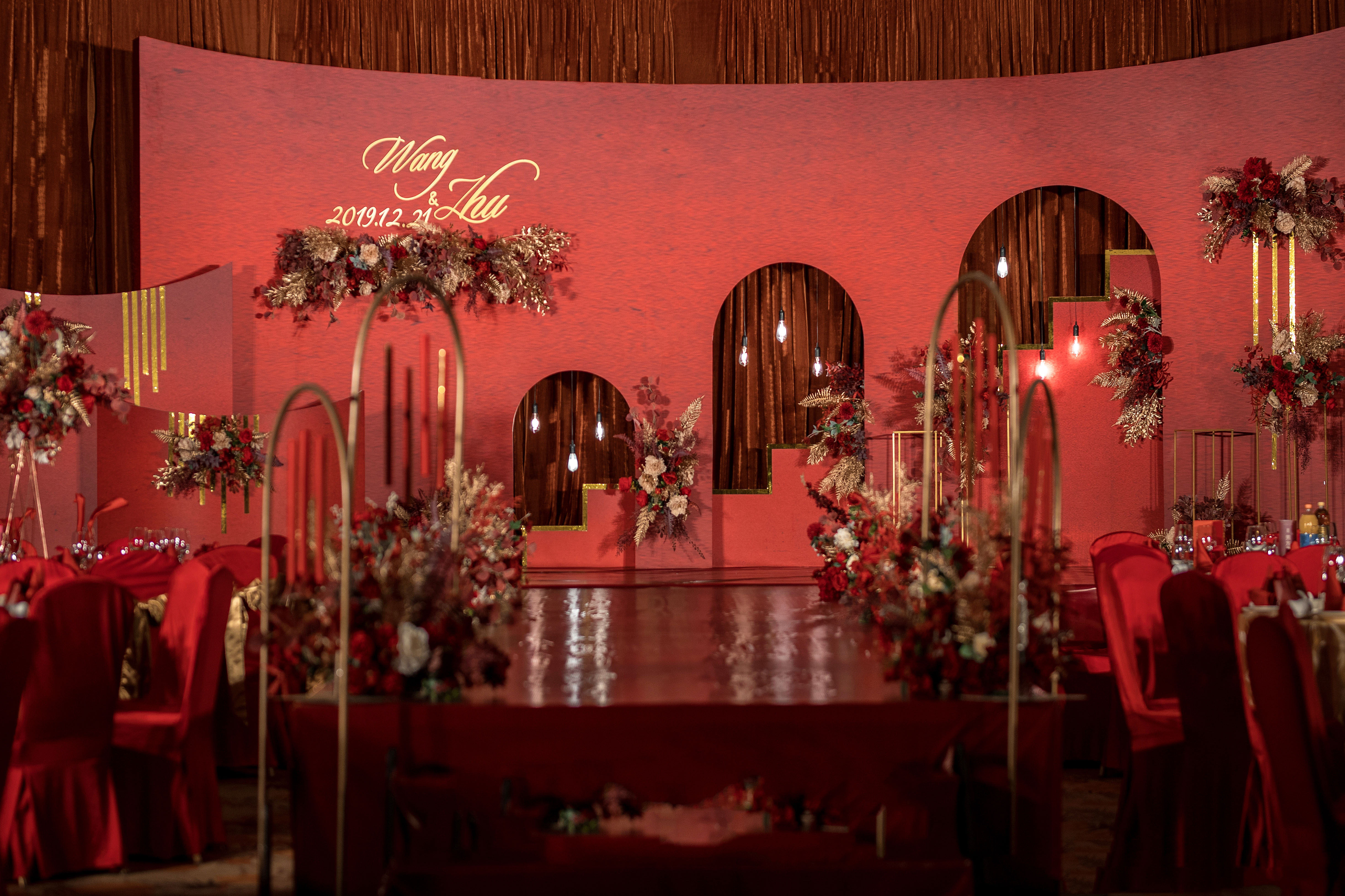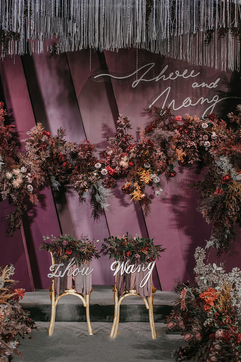 • 这是一位特别酷的新娘,一来就明确了想要暗黑系的婚礼,但是考虑到老一辈的感受,结合新人们色系的喜好和喜欢的元素做了一场属于他们的暗黑红色婚礼