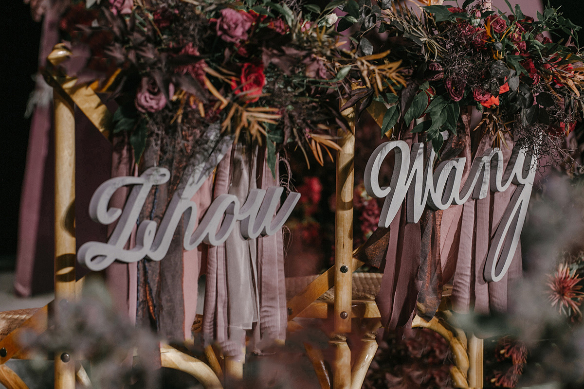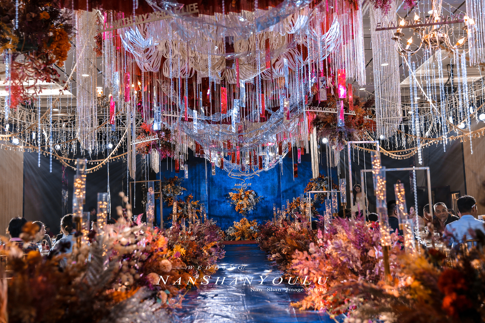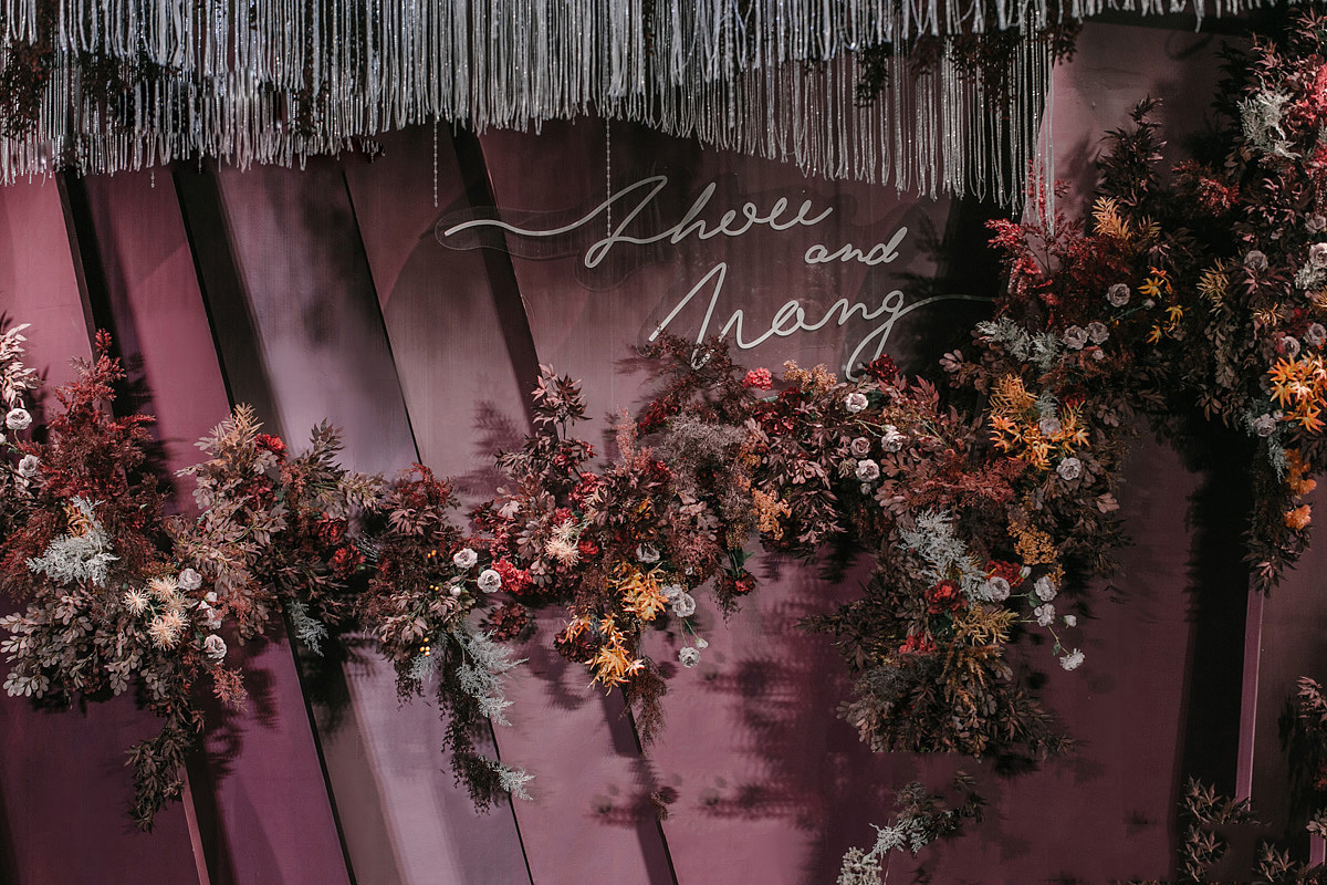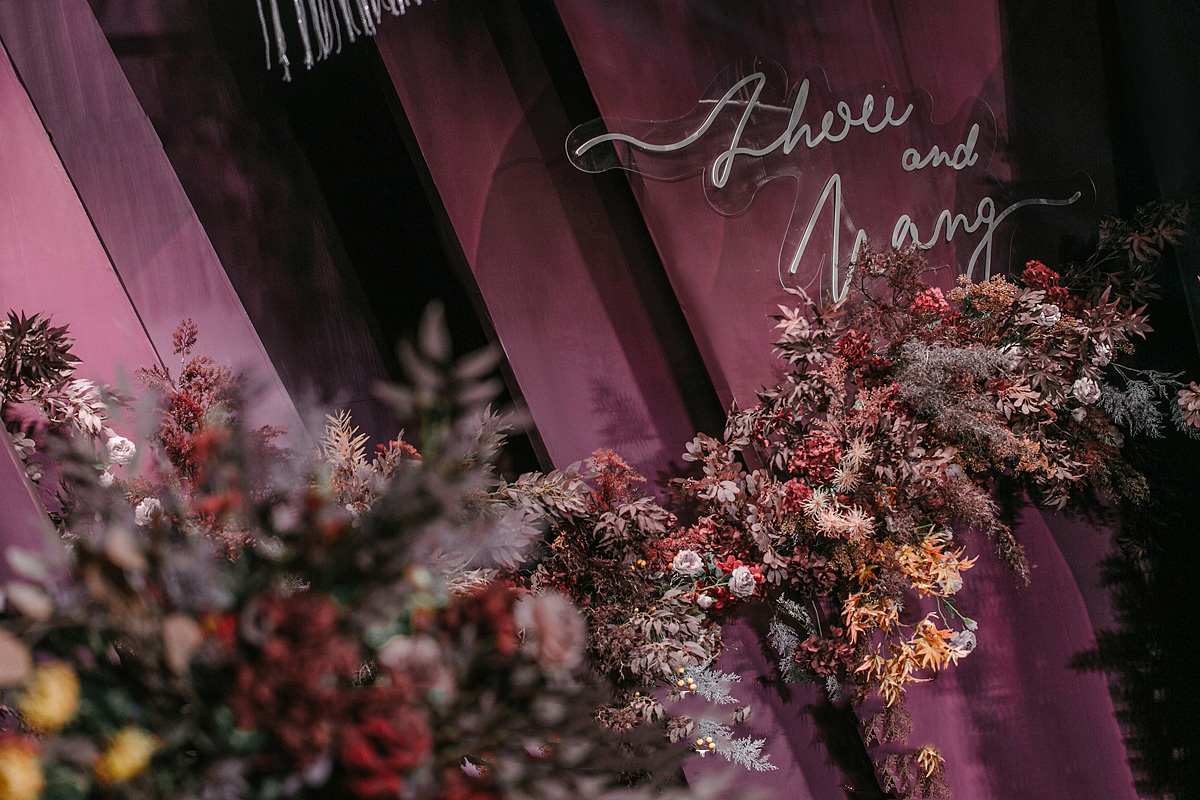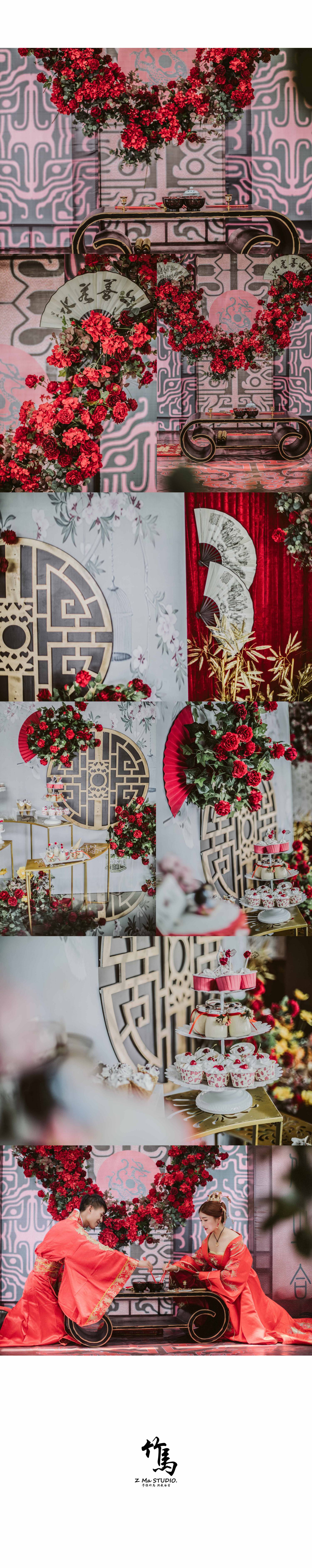 • 这是一位特别酷的新娘,一来就明确了想要暗黑系的婚礼,但是考虑到老一辈的感受,结合新人们色系的喜好和喜欢的元素做了一场属于他们的暗黑红色婚礼