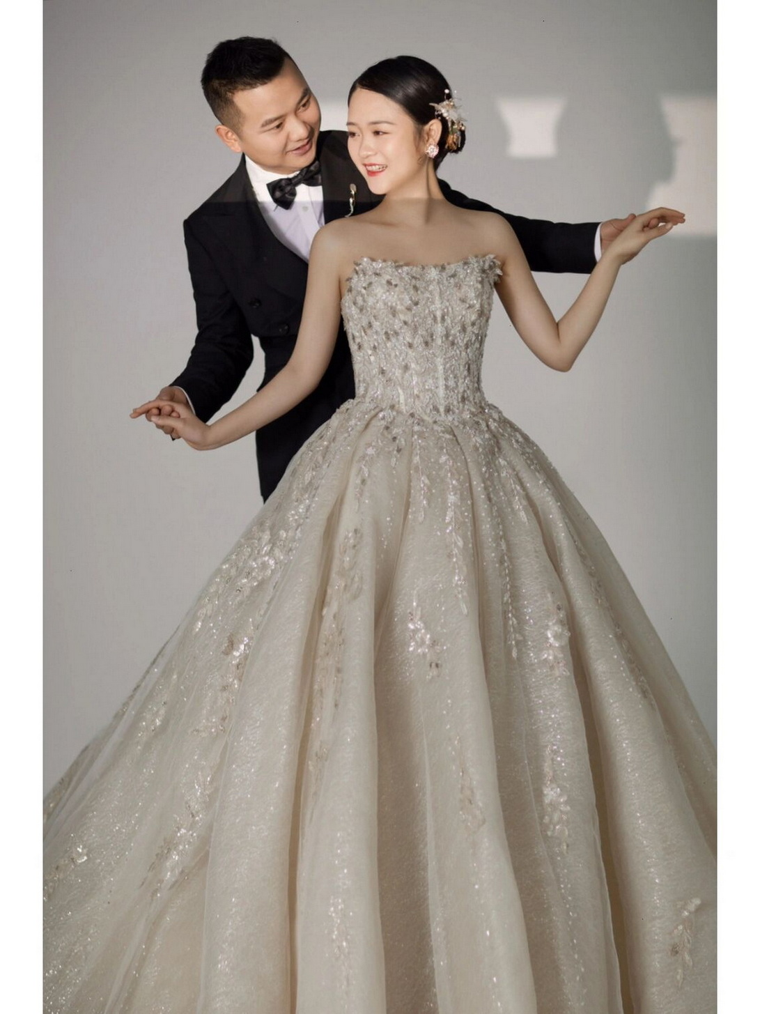 • 婚纱照准备拍摄当天我就感到特别兴奋,到了之后化妆师就根据我喜欢的风格为我挑选了美丽的婚纱礼服,开始了第一轮拍摄,摄影师教我们摆动作,还让我们开怀大笑,灯光师在拍摄间隙里也为我们理裙摆,让我们拥有完美的造型。真的特别感谢所有拍摄的工作人员,你们的眼睛里有一双发现美的眼睛,拍出了我心目中最美的样子,谢谢你们!