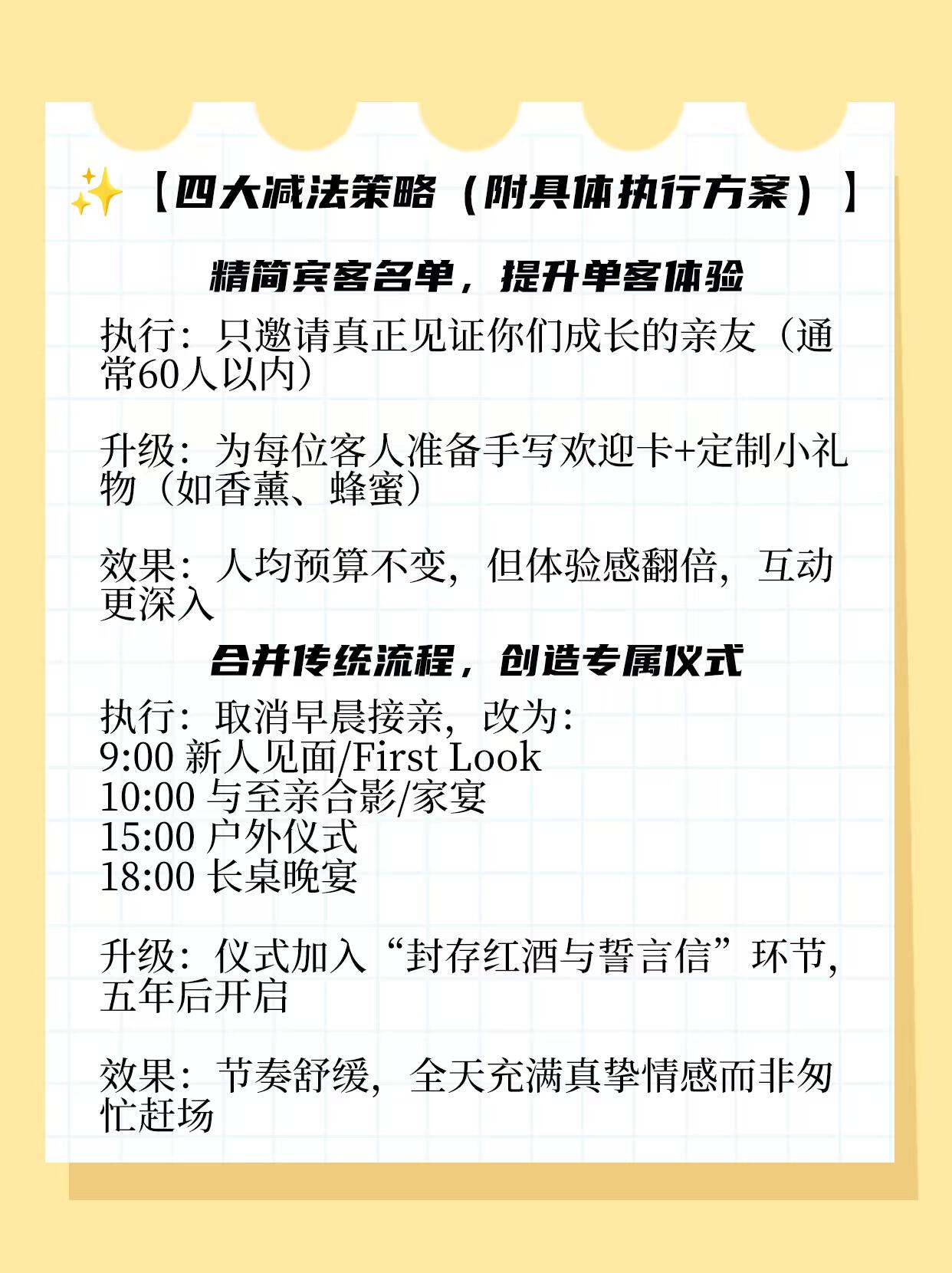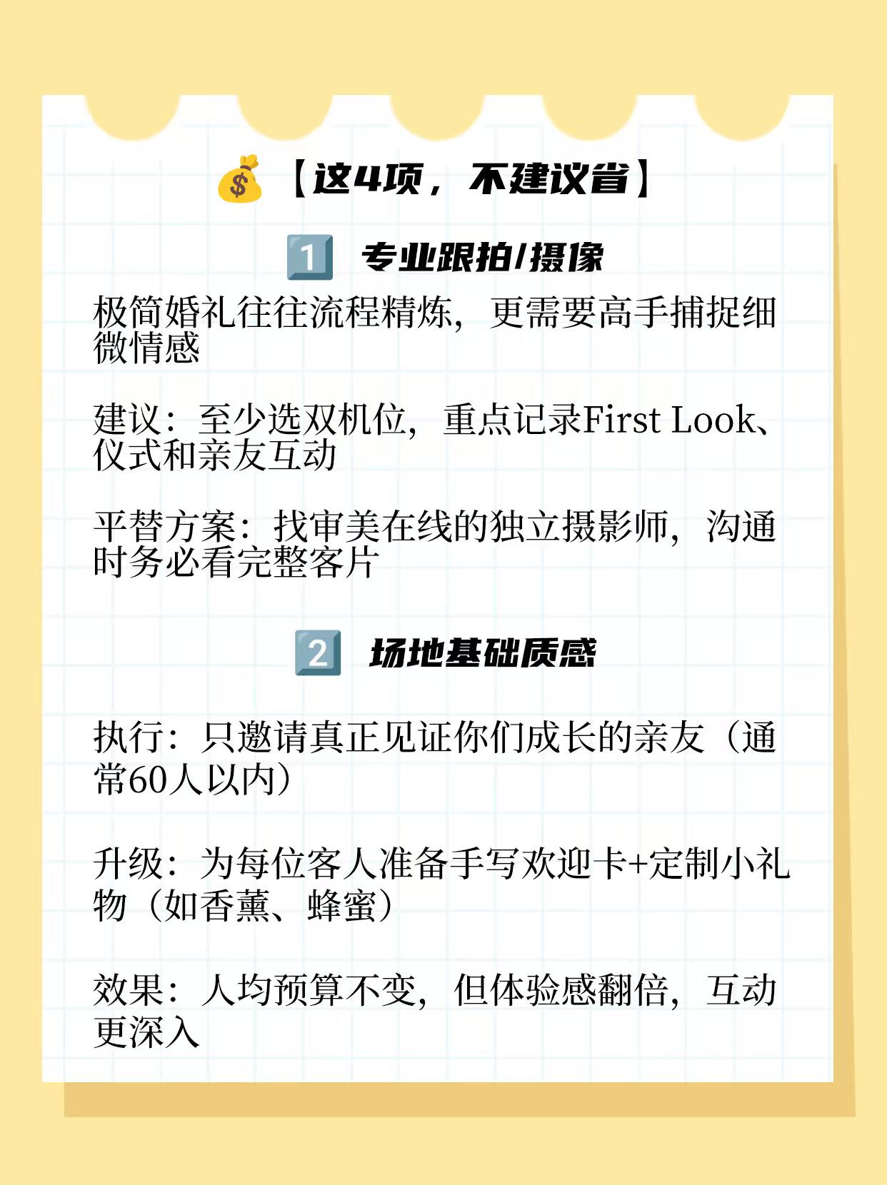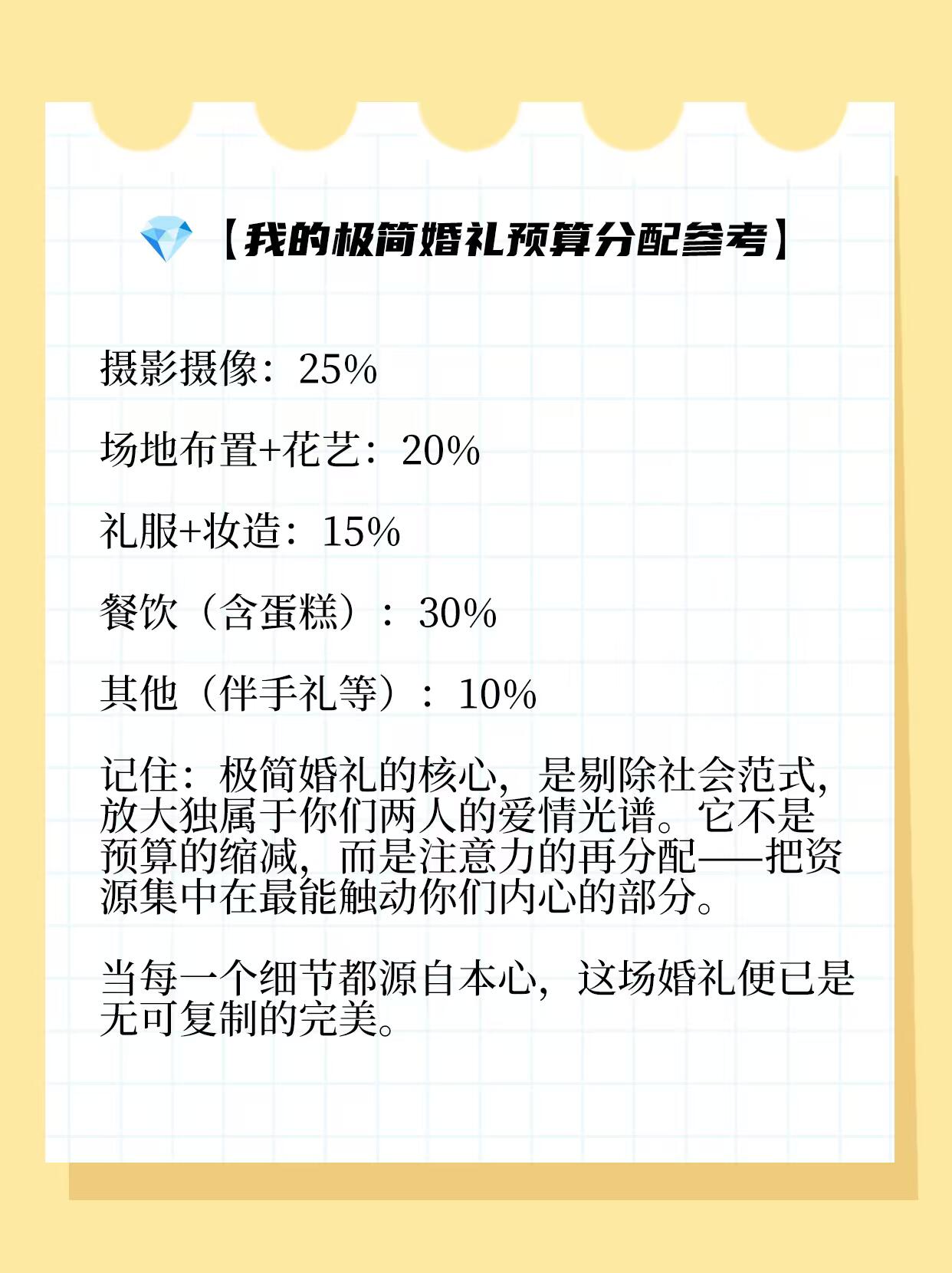 • #淮安备婚攻略 最近和几位刚办完婚礼的姐妹聊天,发现大家有个共同困惑:本想办一场轻松高级的极简婚礼,结果一不小心变得“简陋”,事后总觉遗憾。 深耕婚礼行业5年,见证了上百场婚礼后,我总结了这份【极简婚礼核心法则】:减的是冗余流程与不必要的开销,而非质感、心意与仪式感。