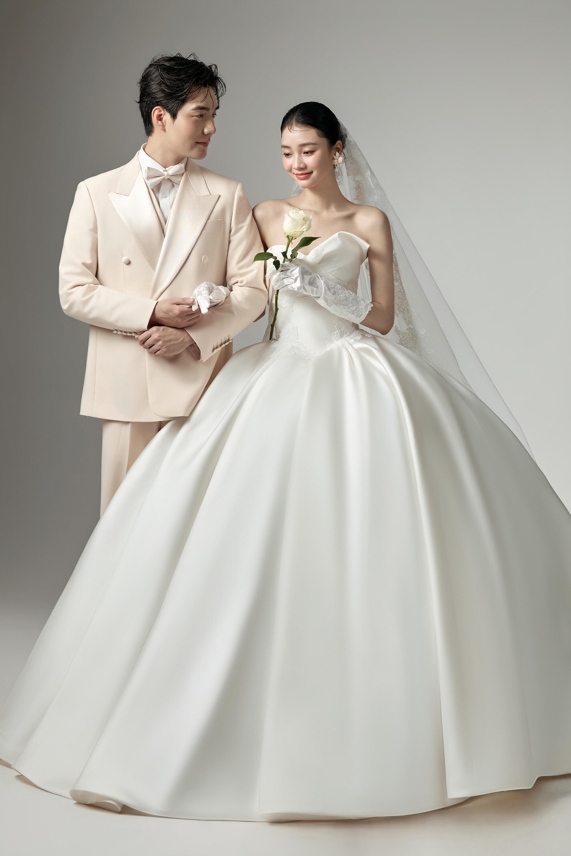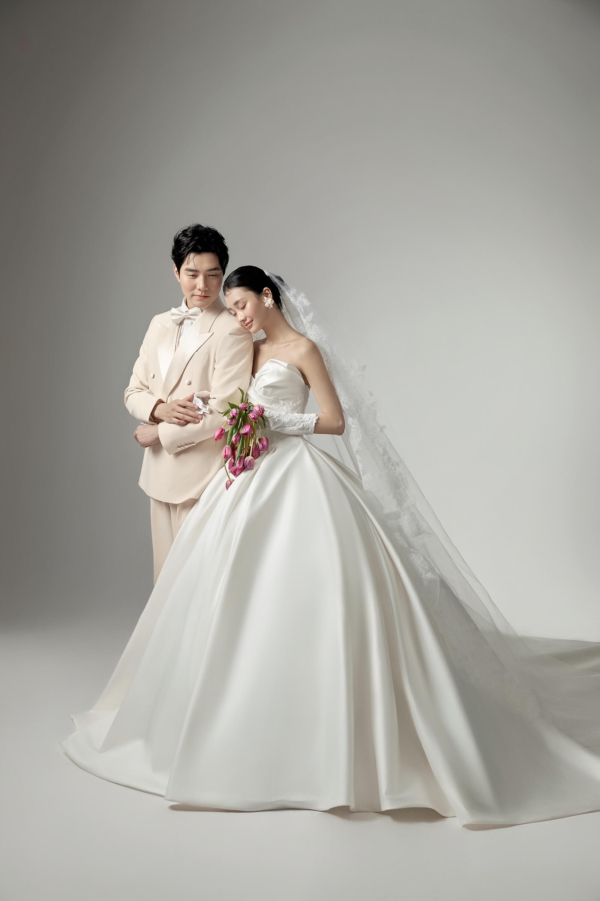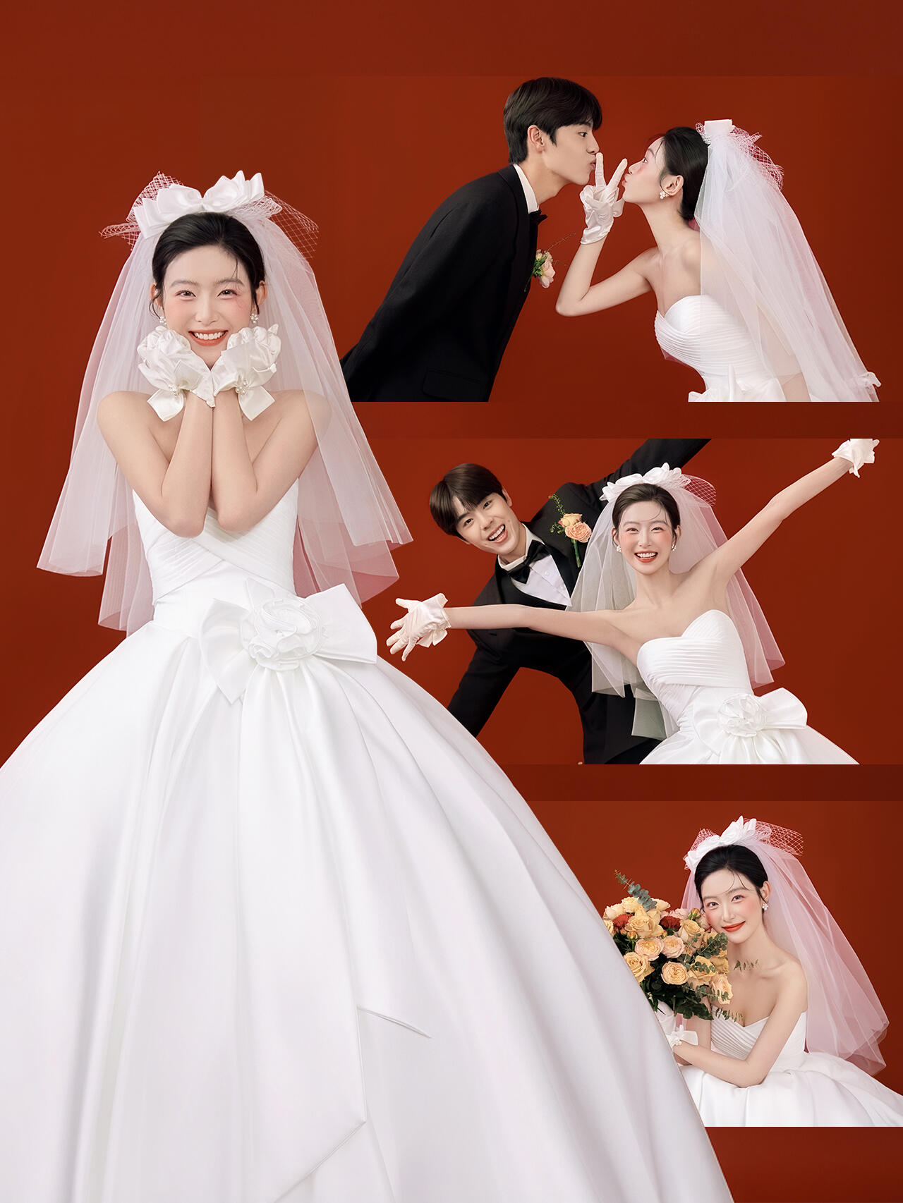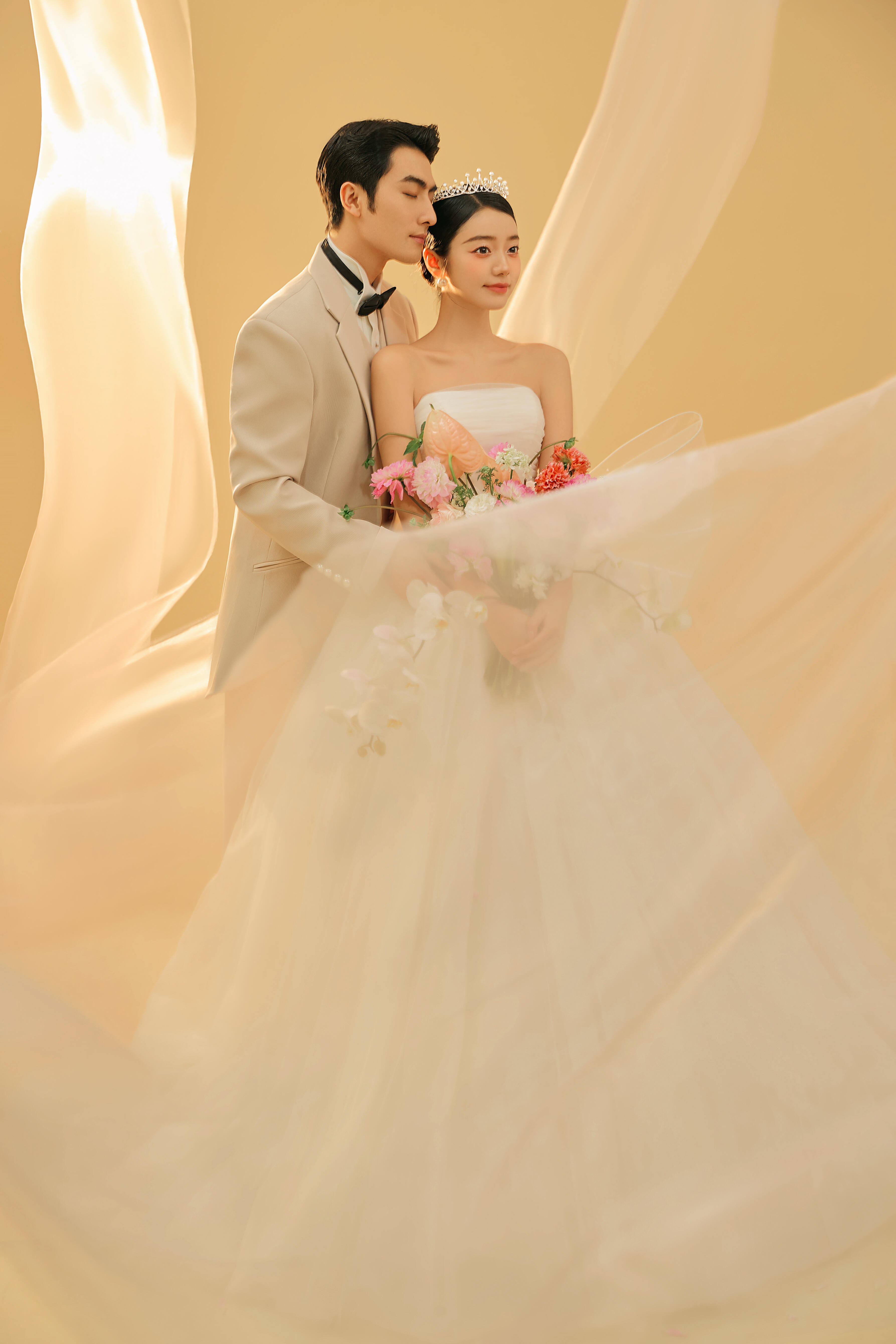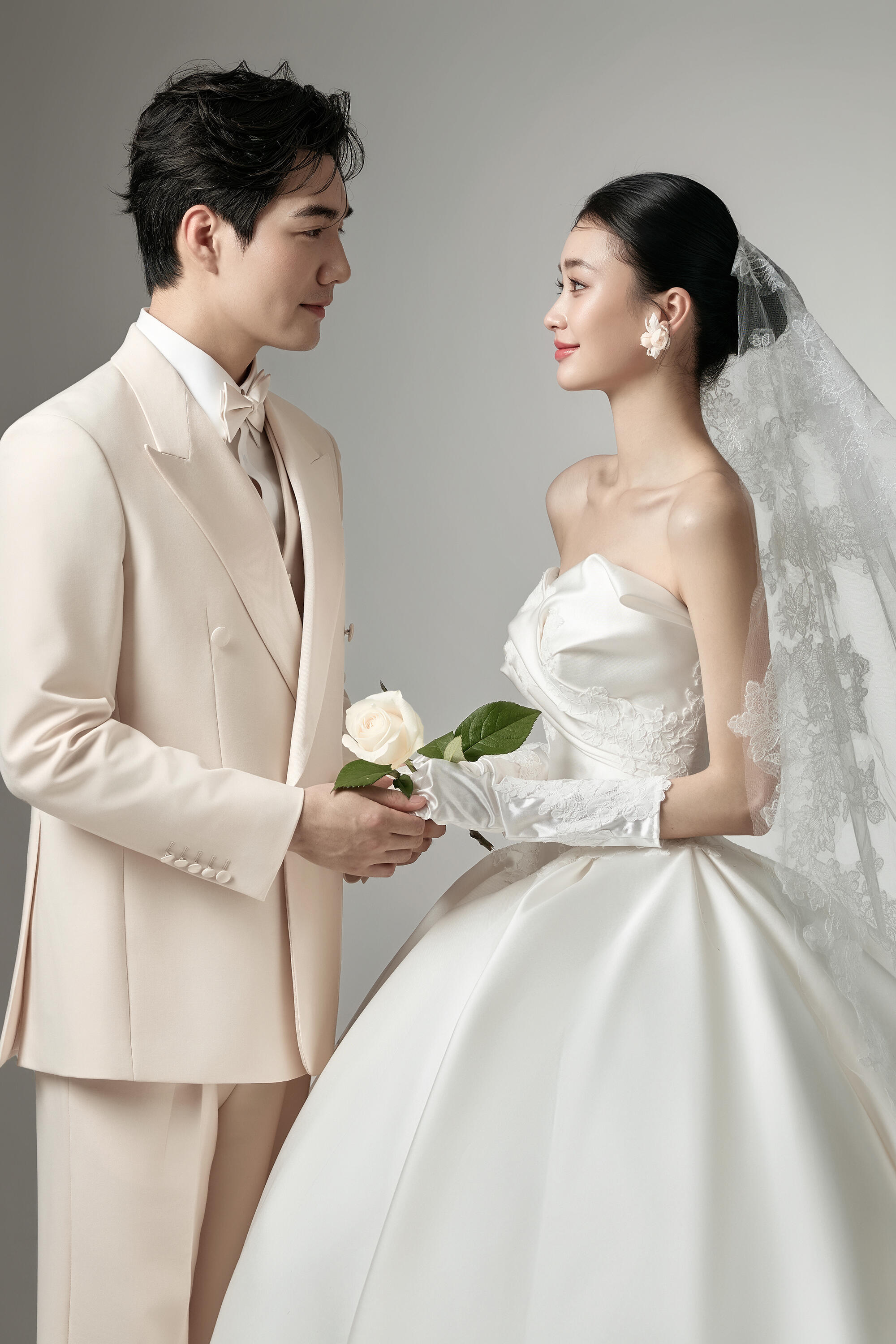 • #浪漫光影婚纱照室内 | 主纱 | 极简 - 经典的纯白缎面主纱 简约大气,质感满满 流畅的剪裁勾勒出优雅身姿 没有过多繁杂装饰却尽显高贵 - 干净的纯色背景 让焦点全部集中在新人身上 简单的场景✨ 却能拍出历久弥新的高级感