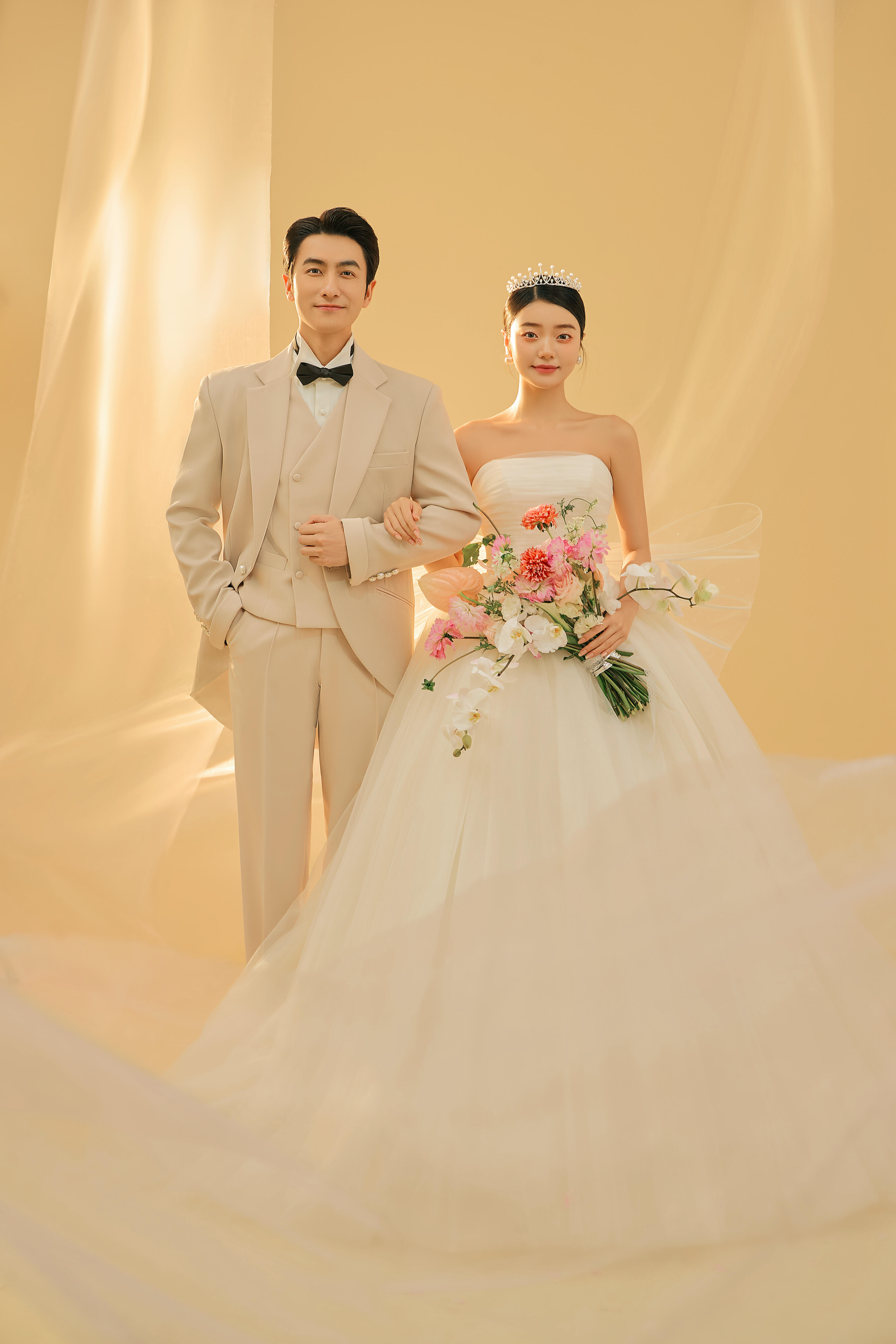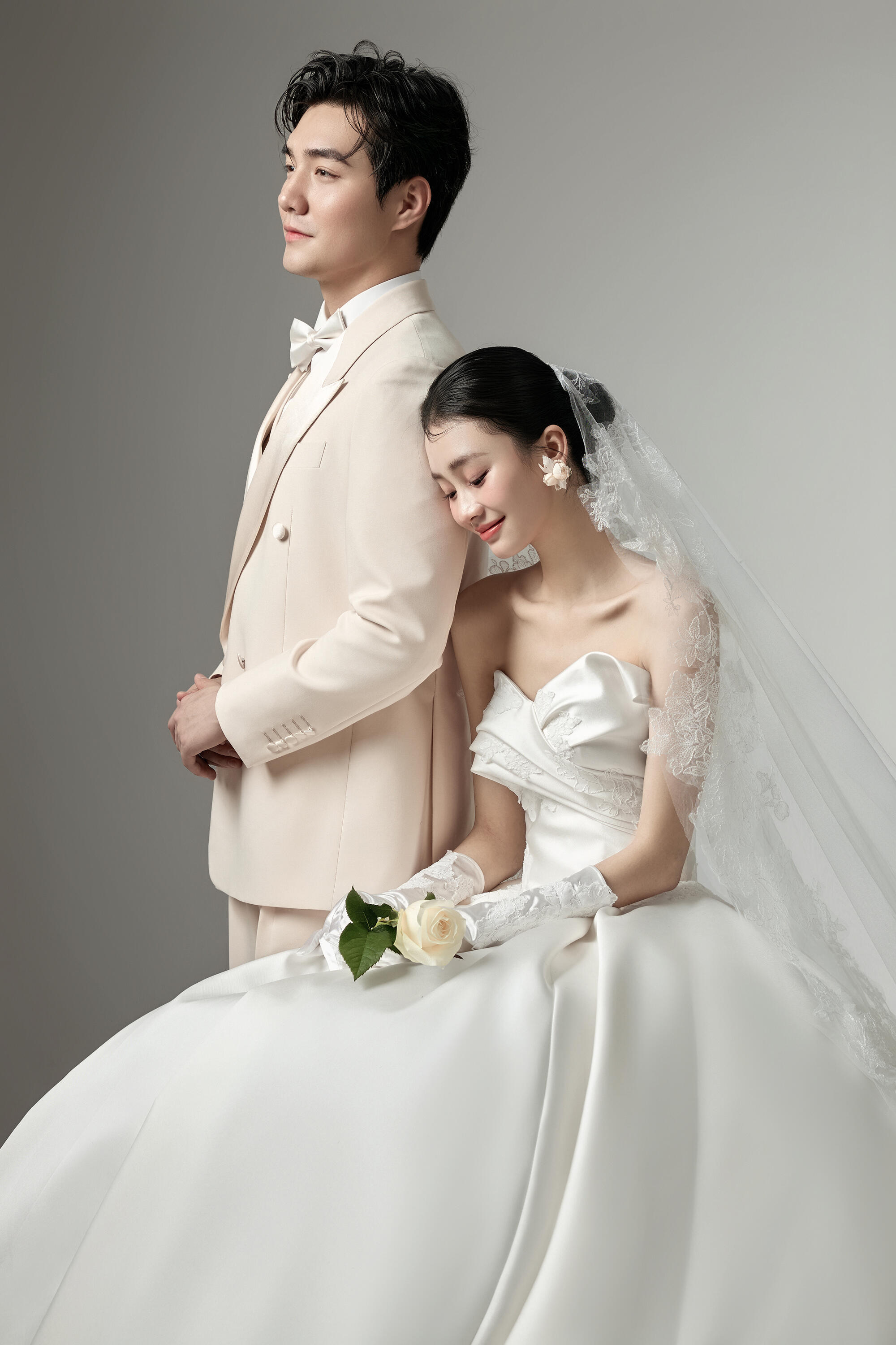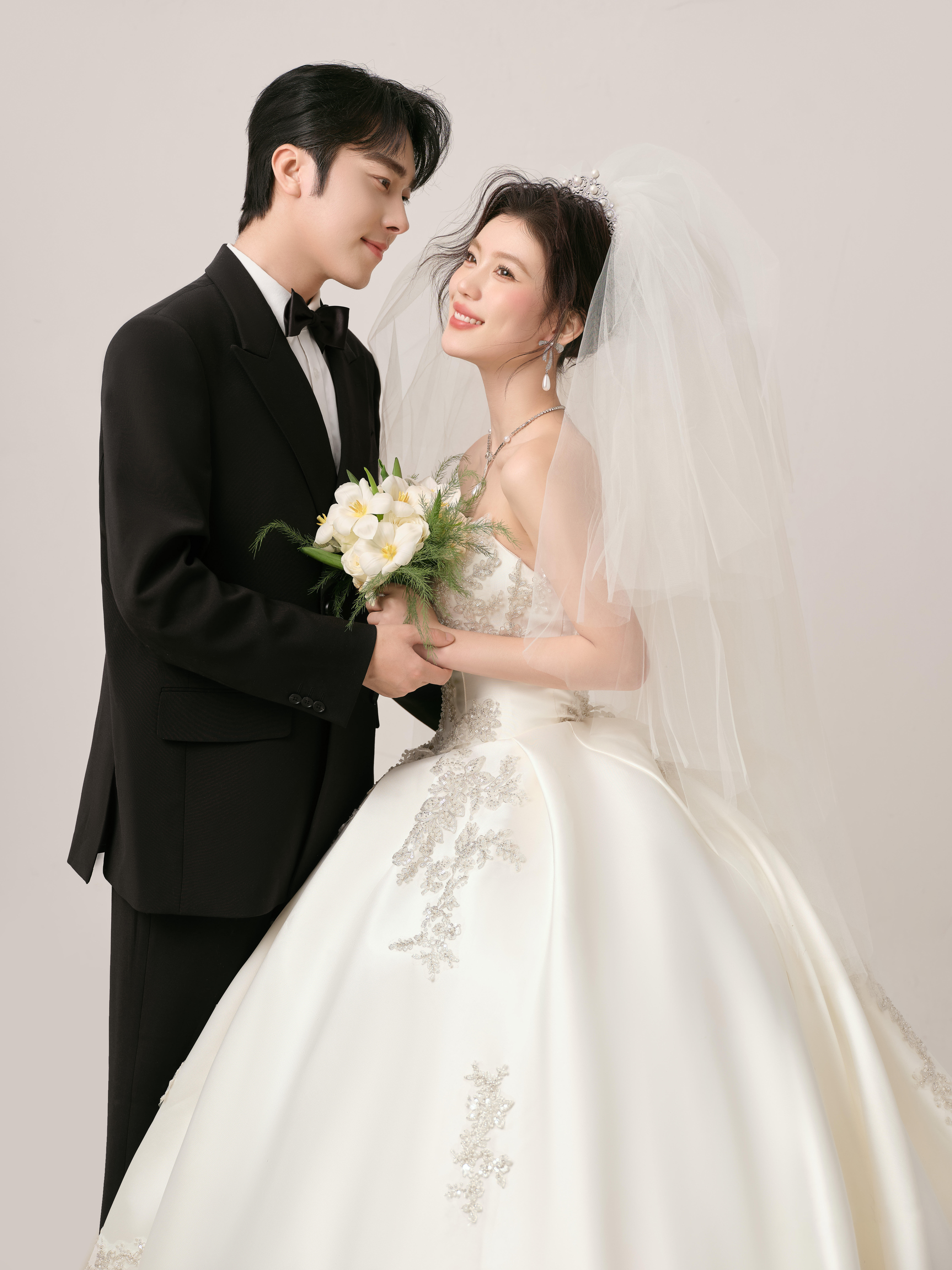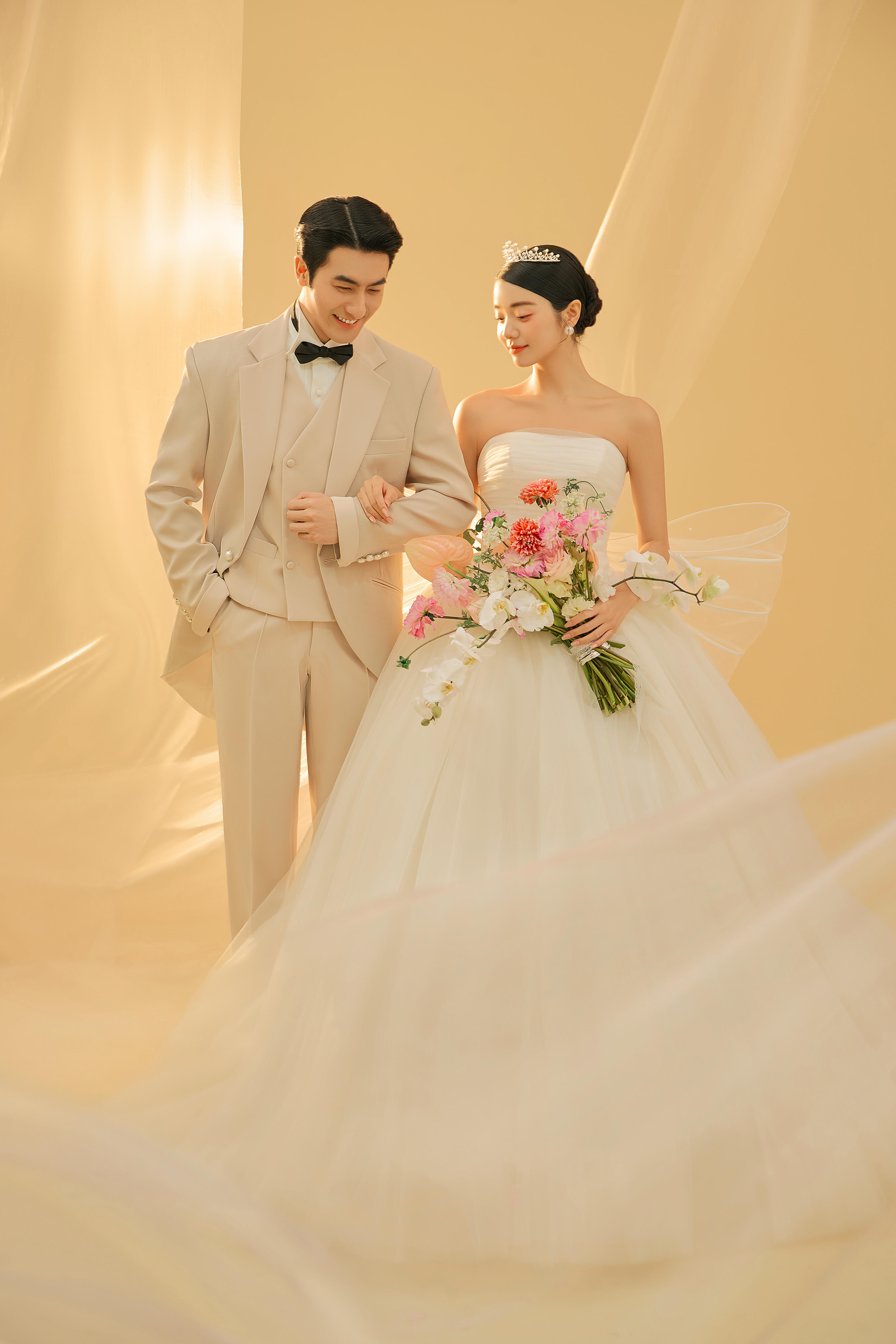 • #浪漫光影婚纱照室内 | 主纱 | 极简 - 经典的纯白缎面主纱 简约大气,质感满满 流畅的剪裁勾勒出优雅身姿 没有过多繁杂装饰却尽显高贵 - 干净的纯色背景 让焦点全部集中在新人身上 简单的场景✨ 却能拍出历久弥新的高级感