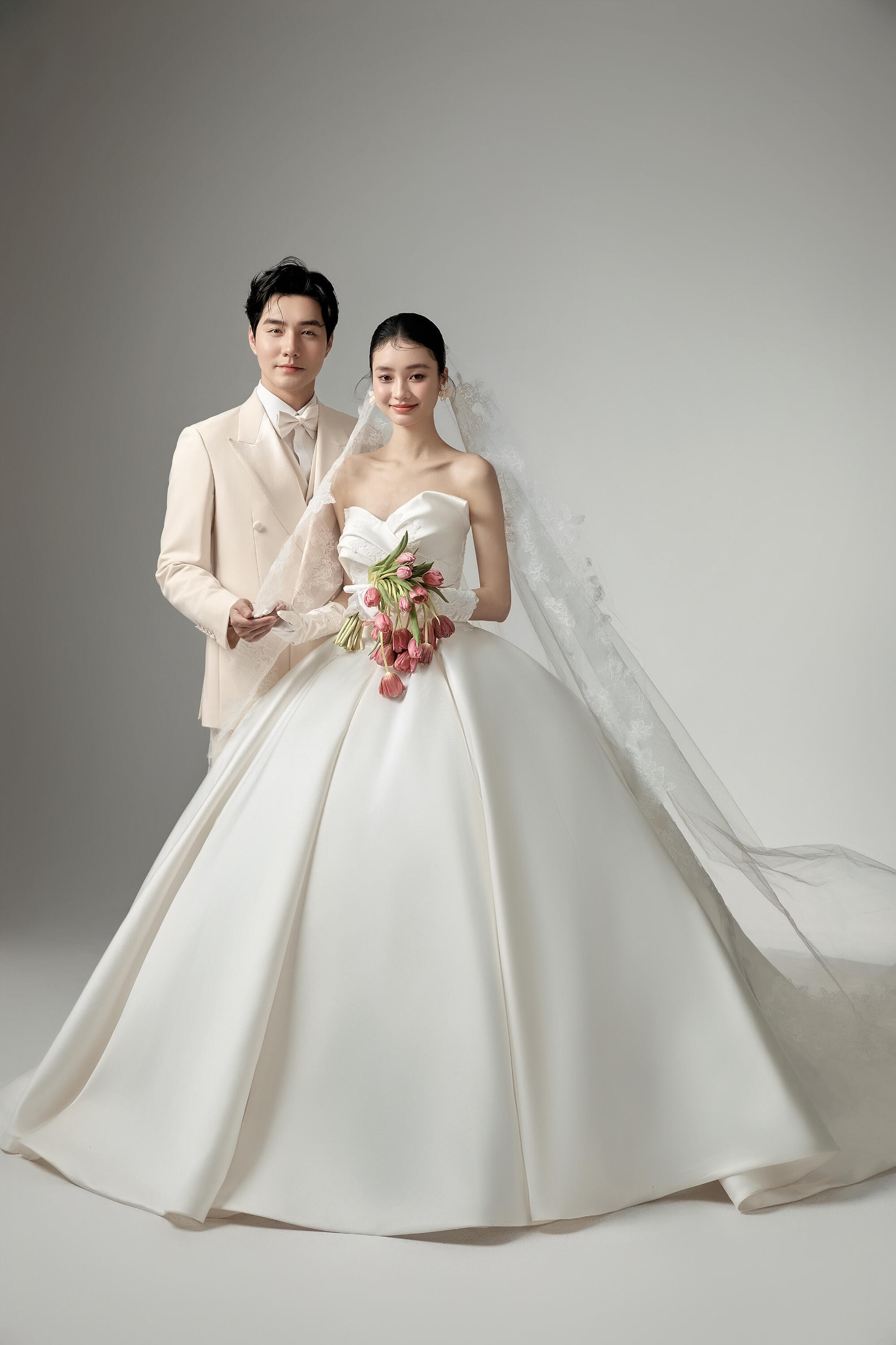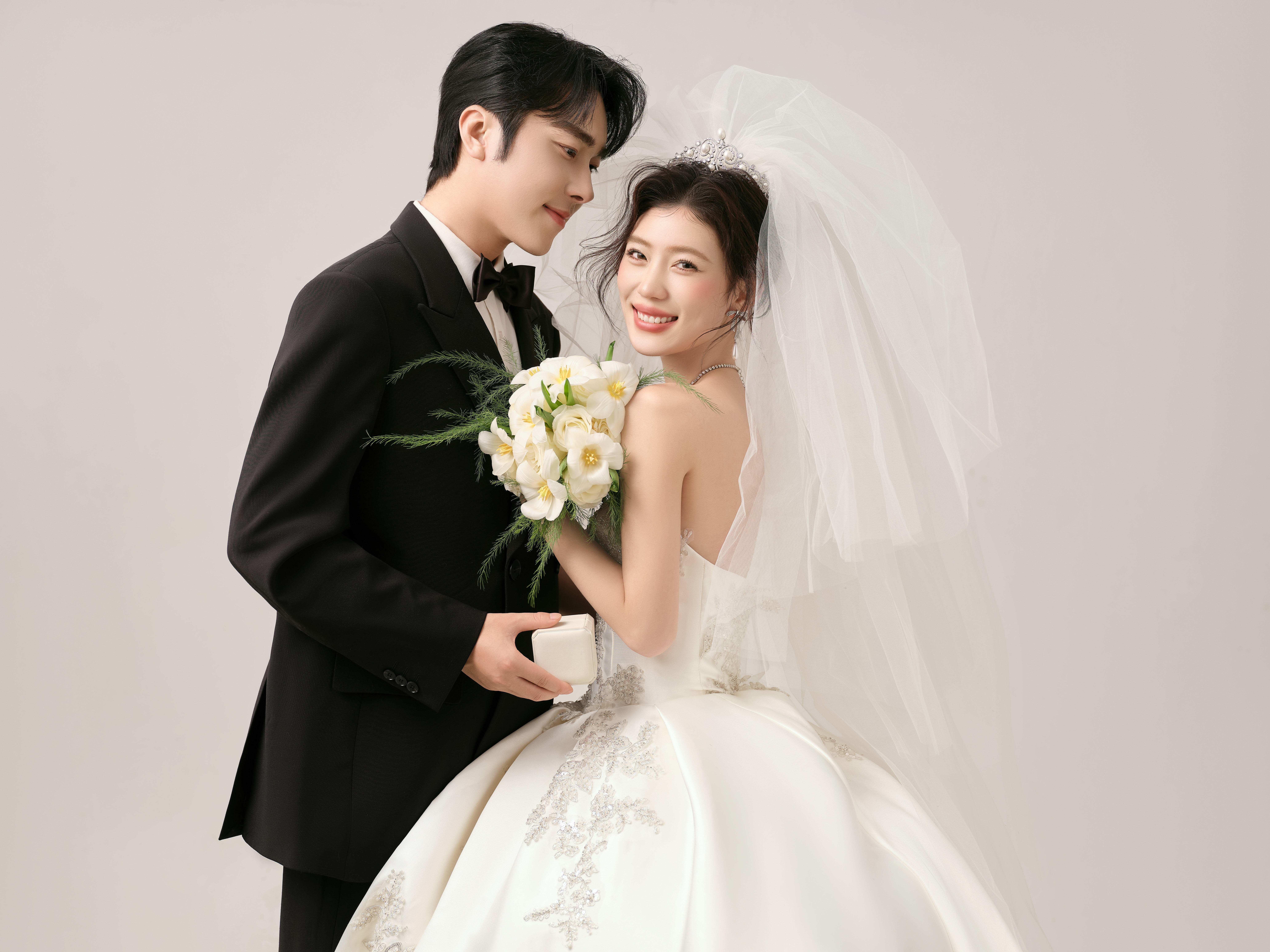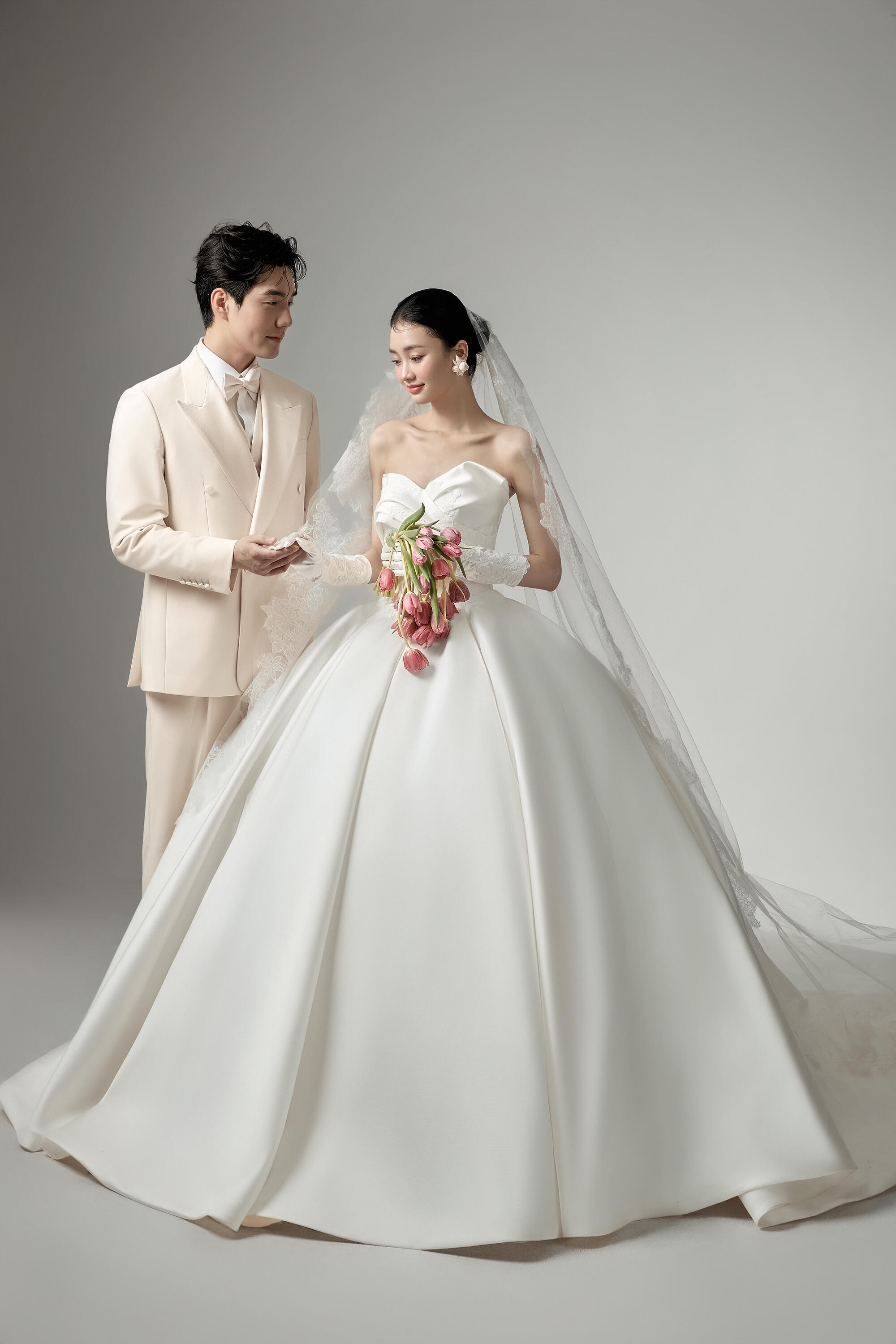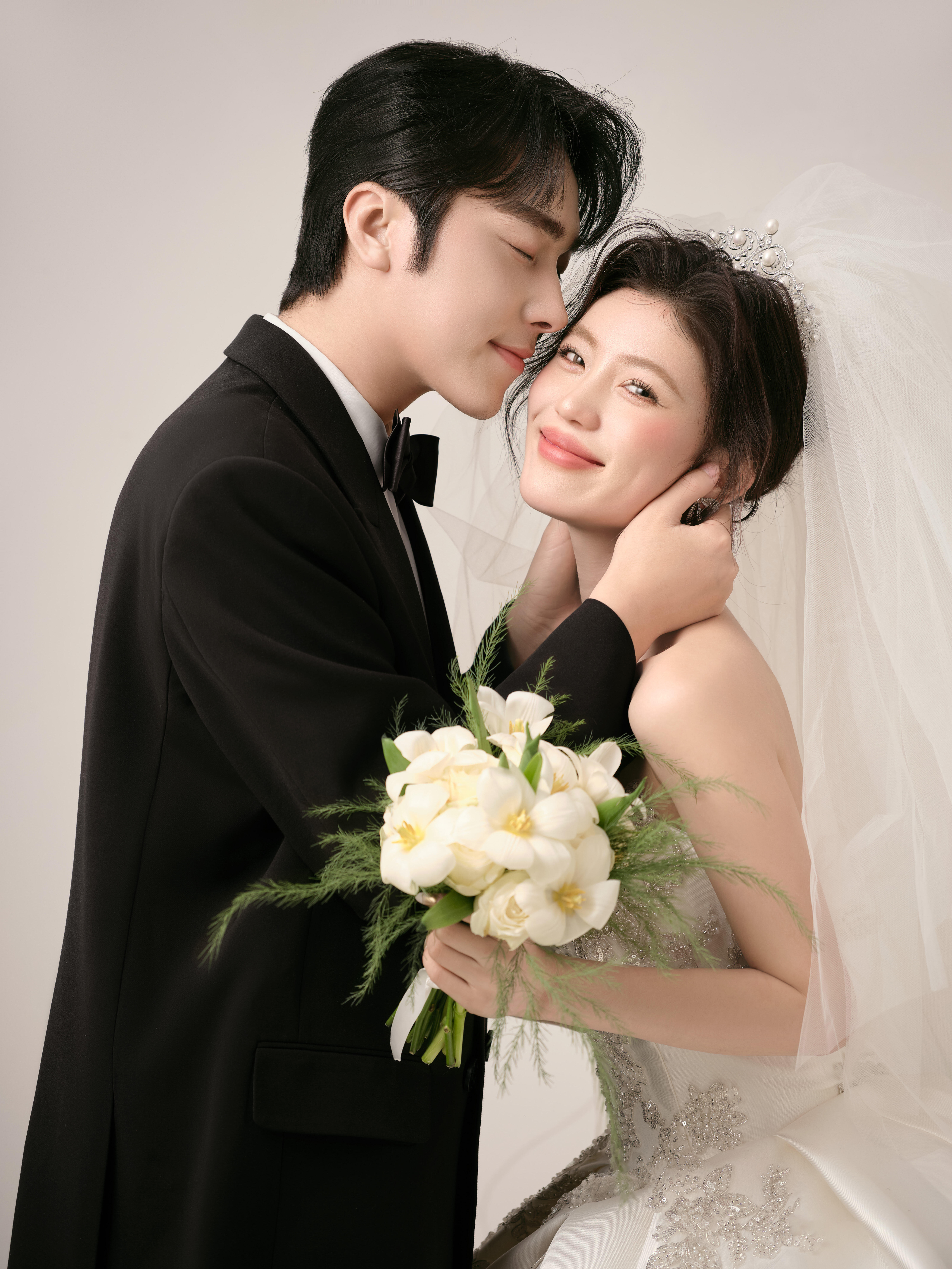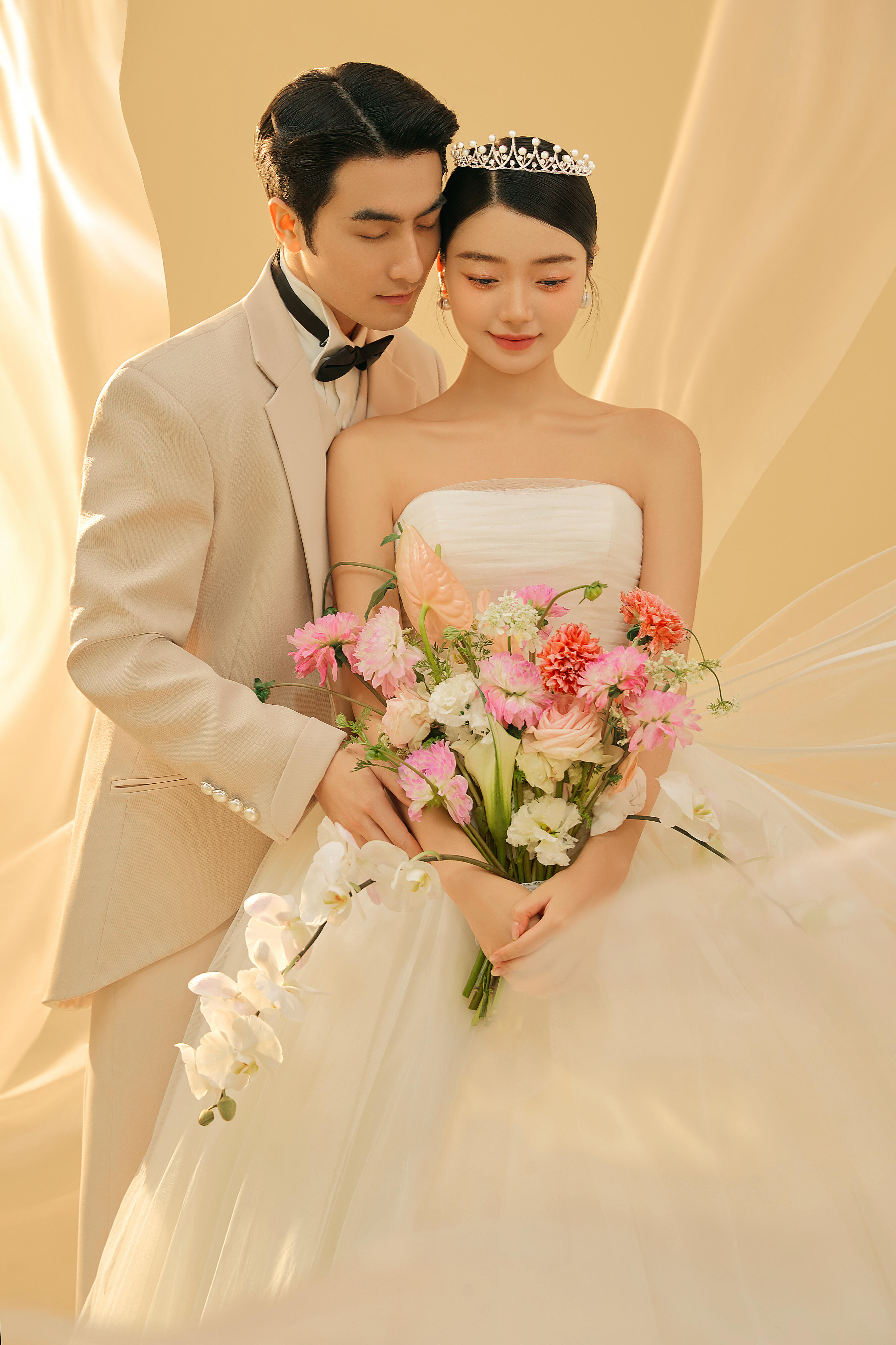 • #浪漫光影婚纱照室内 | 主纱 | 极简 - 经典的纯白缎面主纱 简约大气,质感满满 流畅的剪裁勾勒出优雅身姿 没有过多繁杂装饰却尽显高贵 - 干净的纯色背景 让焦点全部集中在新人身上 简单的场景✨ 却能拍出历久弥新的高级感