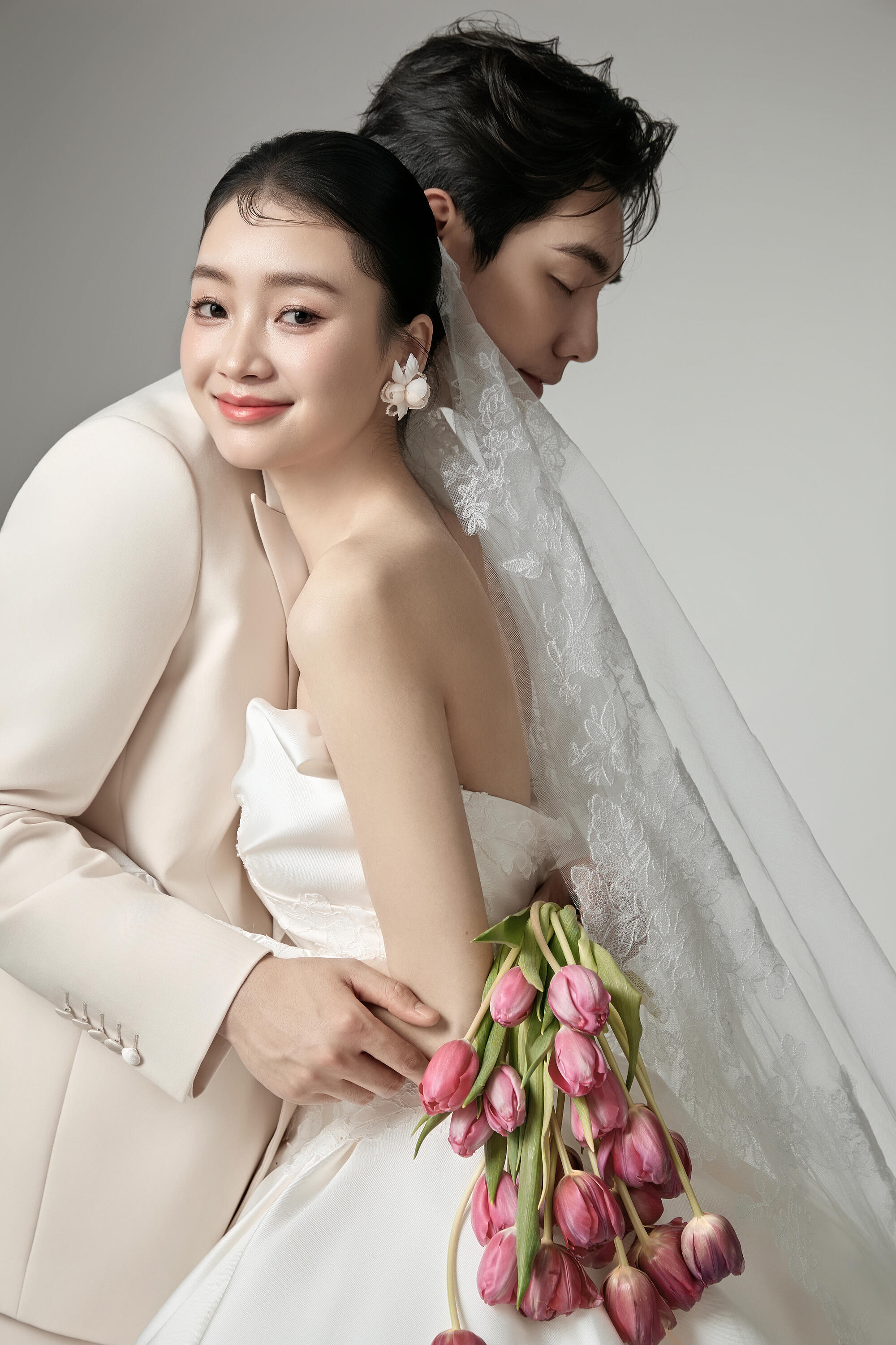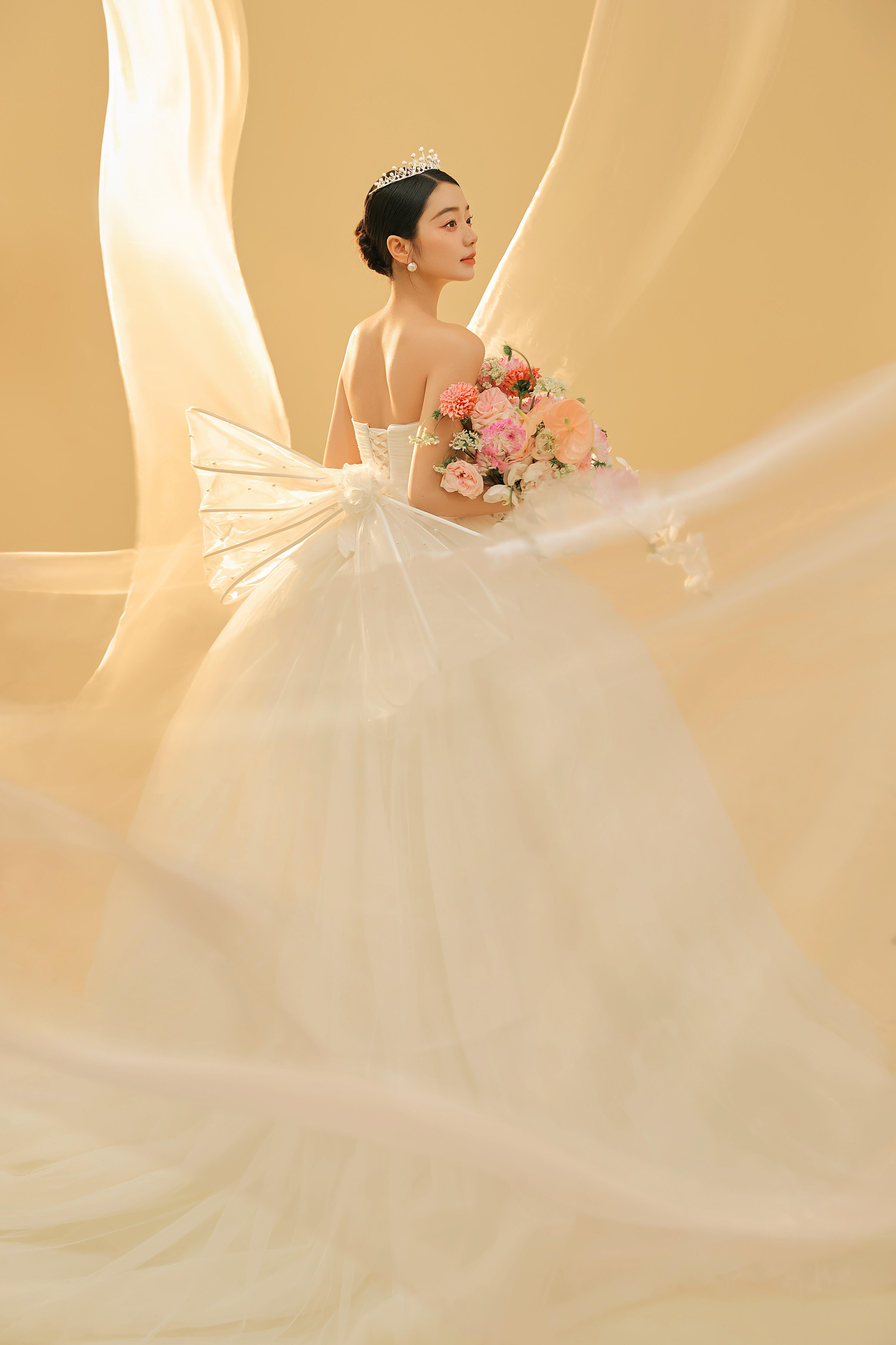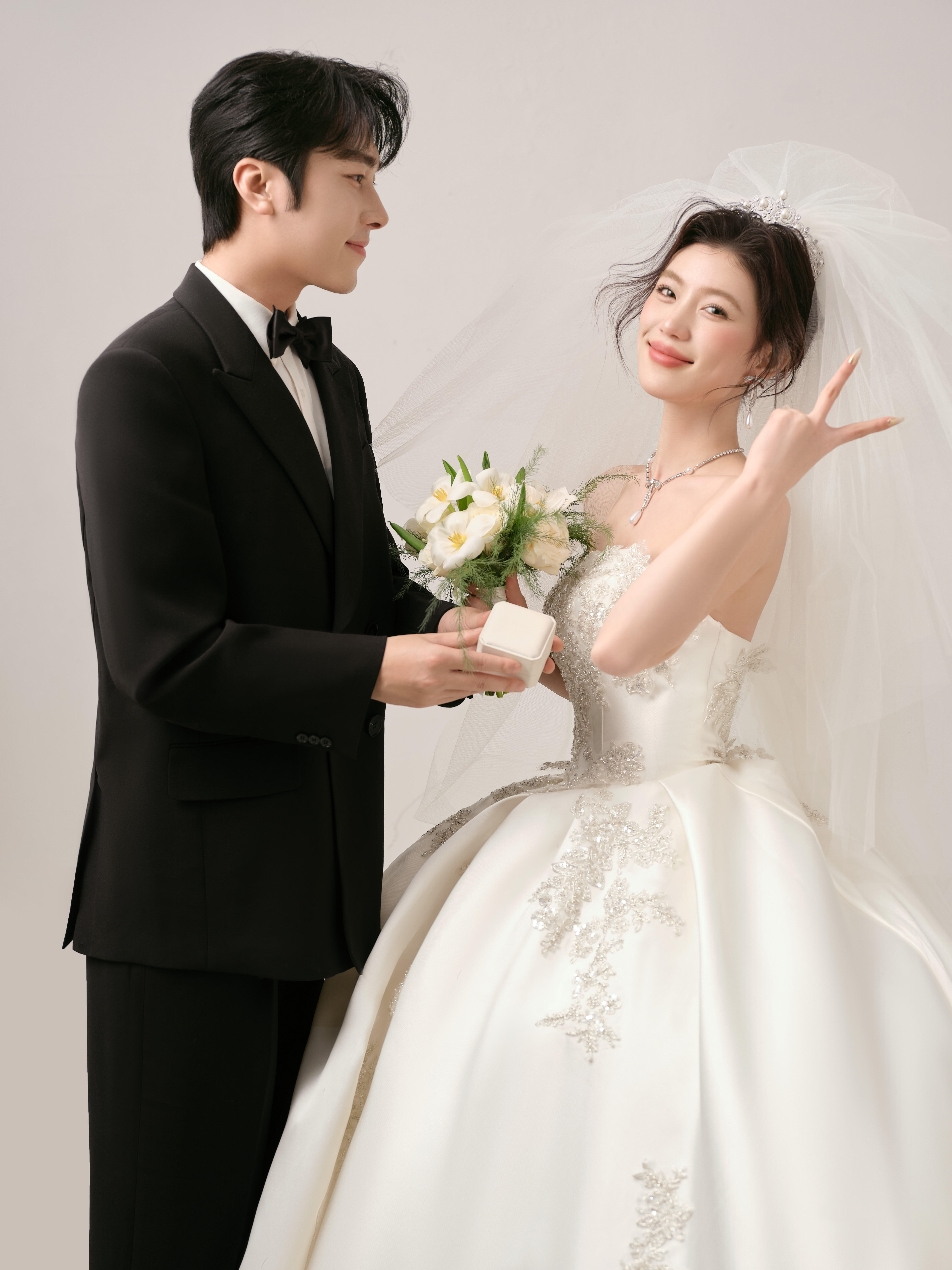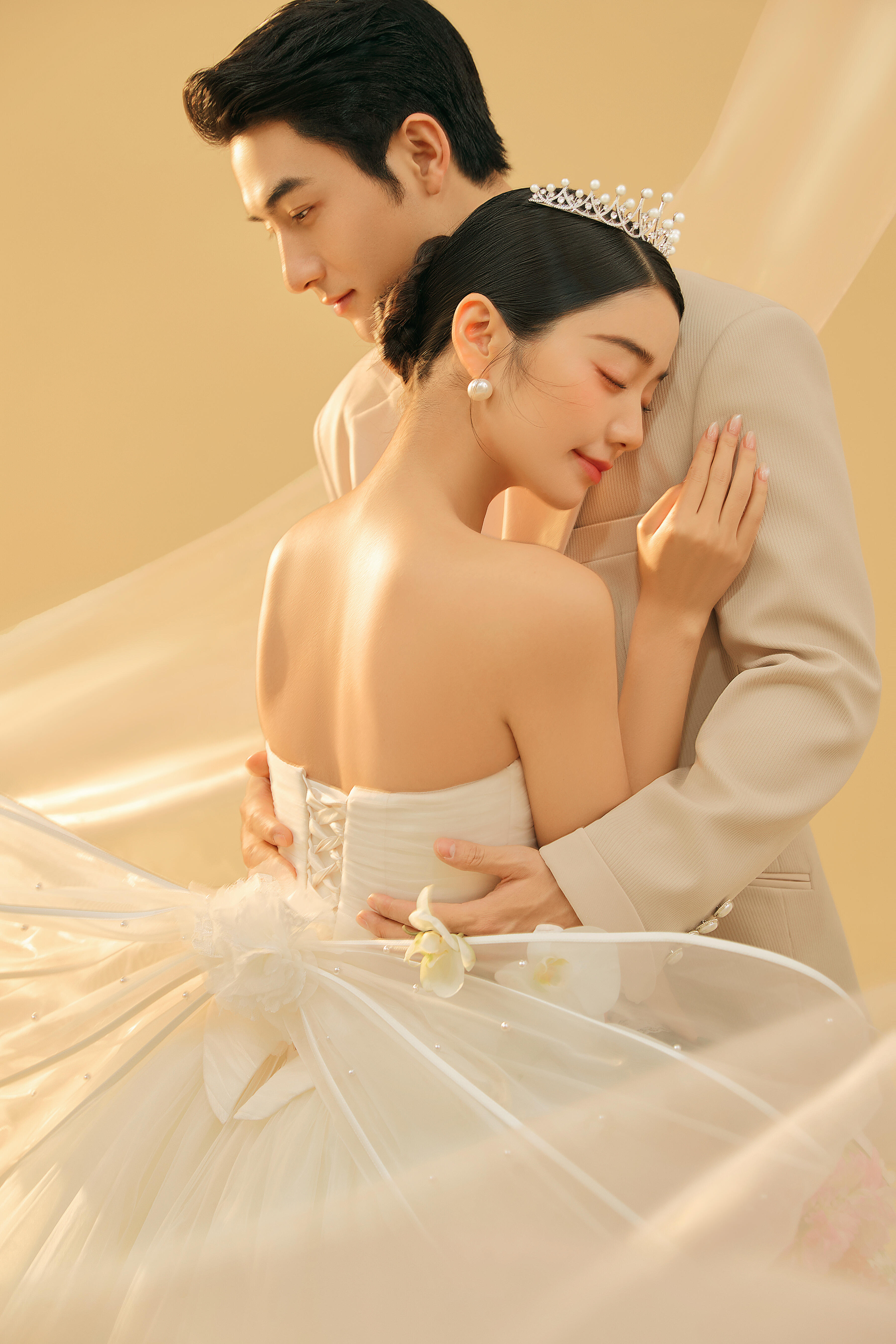 • #浪漫光影婚纱照室内 | 主纱 | 极简 - 经典的纯白缎面主纱 简约大气,质感满满 流畅的剪裁勾勒出优雅身姿 没有过多繁杂装饰却尽显高贵 - 干净的纯色背景 让焦点全部集中在新人身上 简单的场景✨ 却能拍出历久弥新的高级感