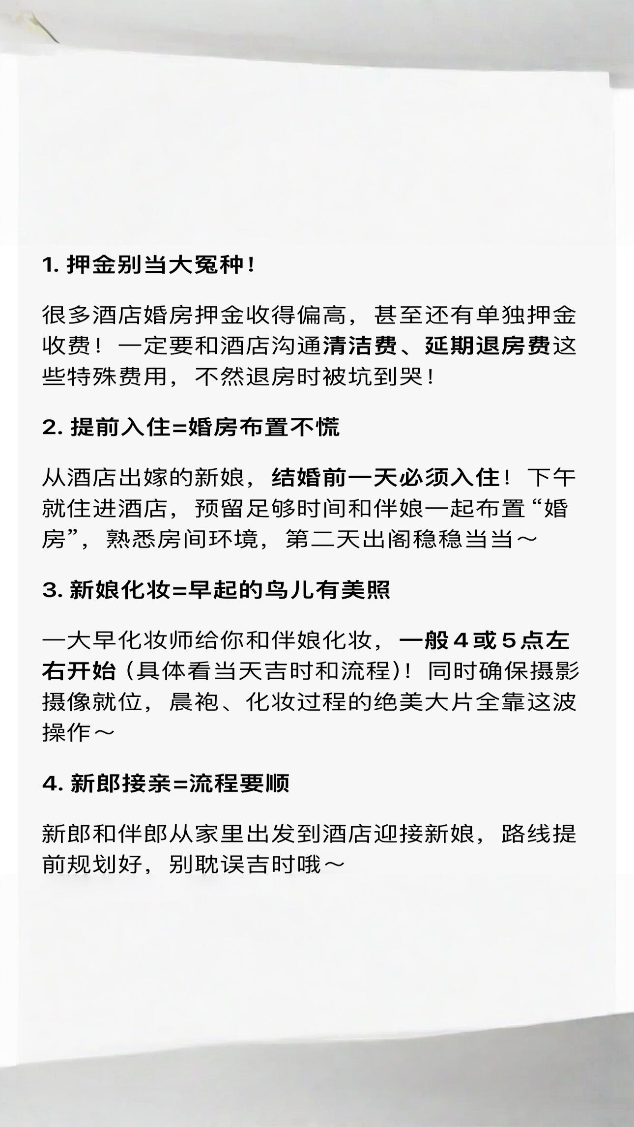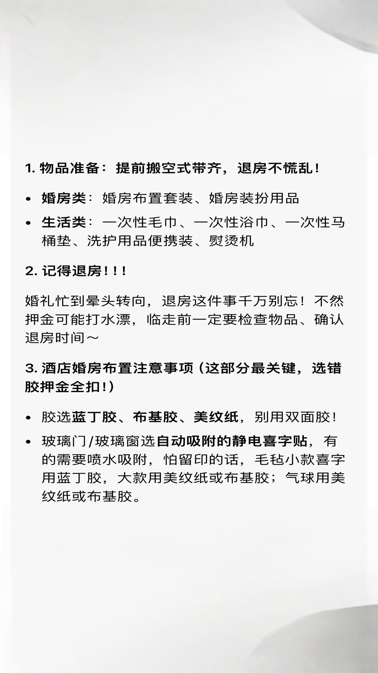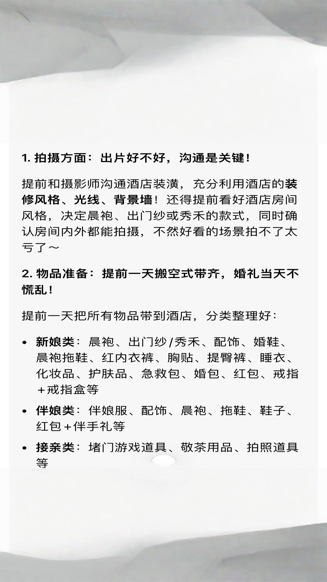 • #淮安备婚攻略 备婚攻略丨新娘酒店出嫁全流程教程,这样准备不慌不忙 从晨袍造型到接亲环节,从物品收纳到时间把控,酒店出嫁的每一步都藏着“不踩雷”的小细节。提前列好备婚清单,把婚纱、首饰、证件按类别分装,前一晚和伴娘一起确认流程,既能避免忙中出错,还能留下更多轻松拍晨拍的时间。