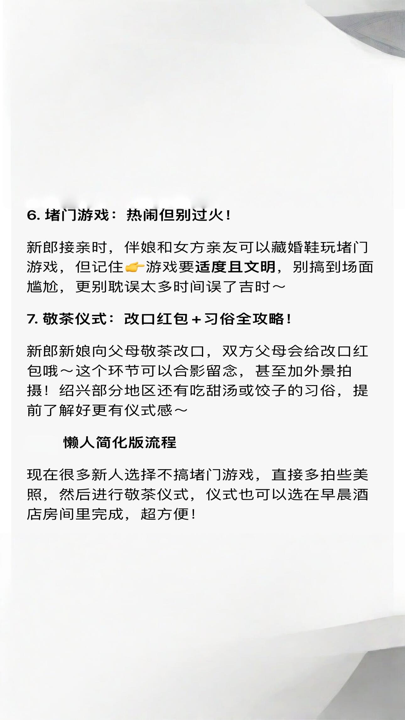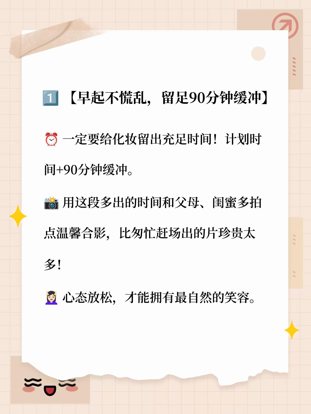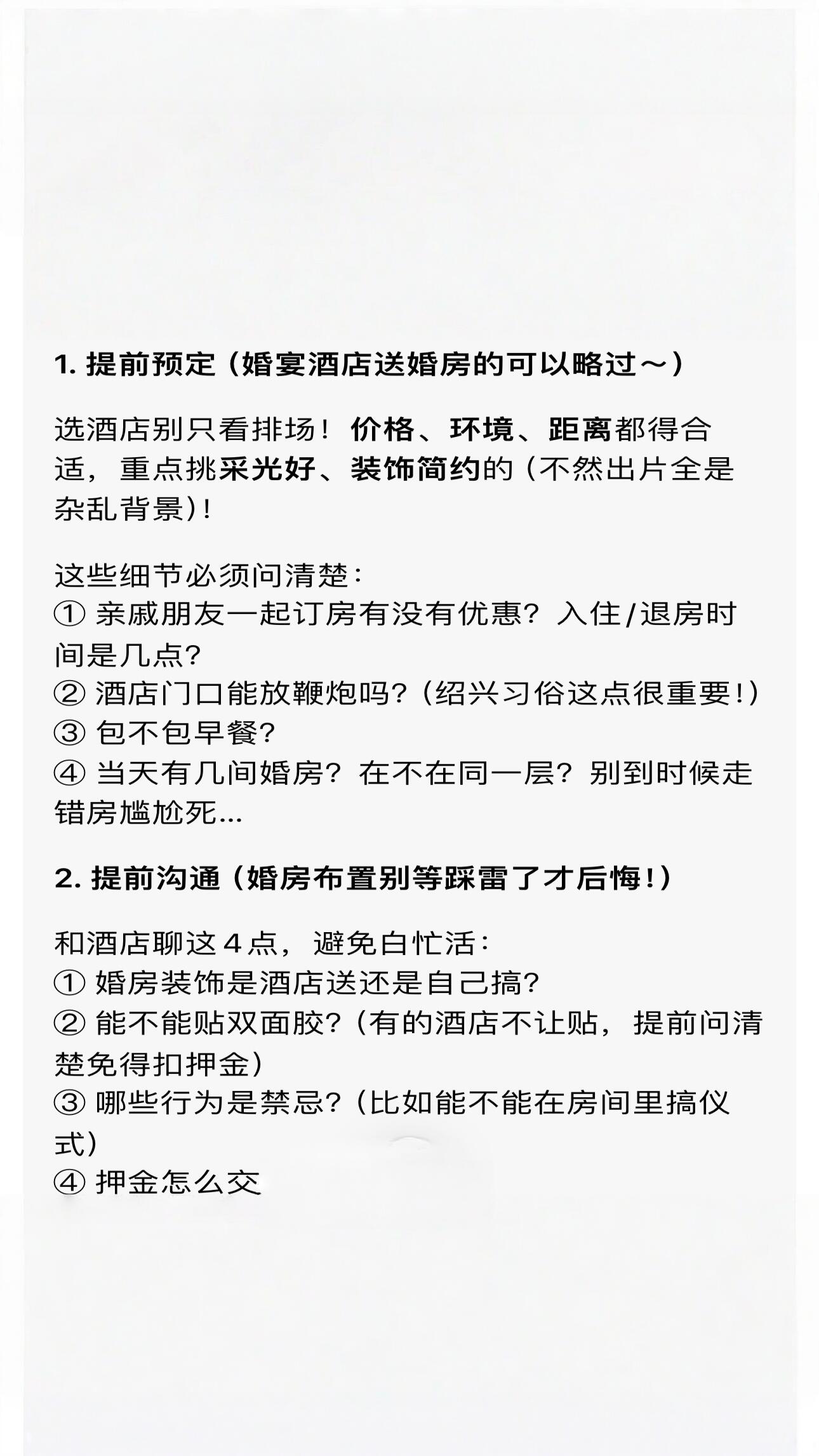 • #淮安备婚攻略 备婚攻略丨新娘酒店出嫁全流程教程,这样准备不慌不忙 从晨袍造型到接亲环节,从物品收纳到时间把控,酒店出嫁的每一步都藏着“不踩雷”的小细节。提前列好备婚清单,把婚纱、首饰、证件按类别分装,前一晚和伴娘一起确认流程,既能避免忙中出错,还能留下更多轻松拍晨拍的时间。