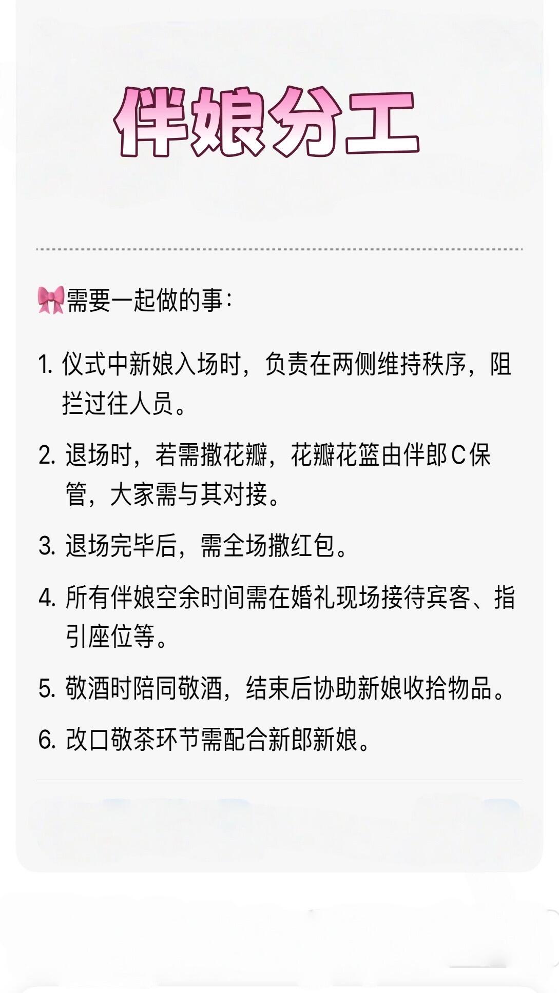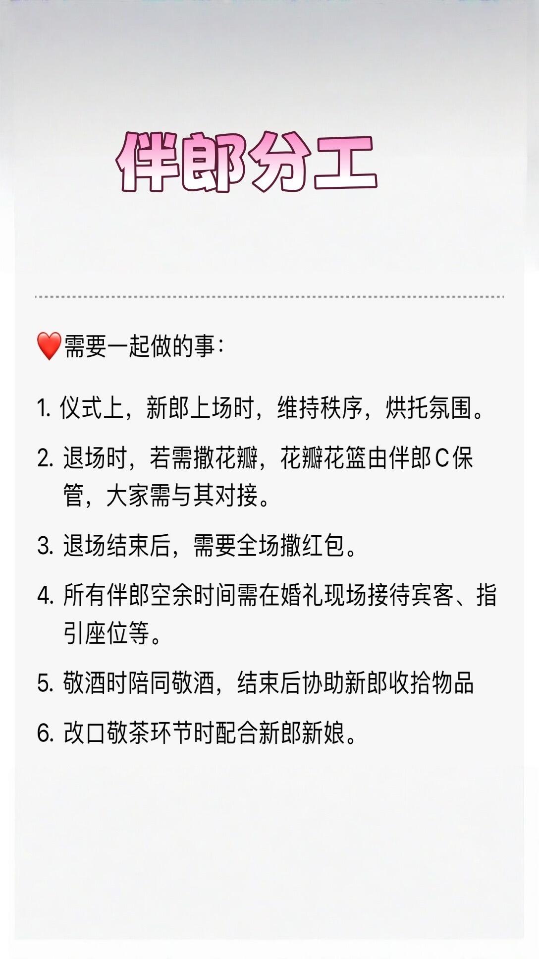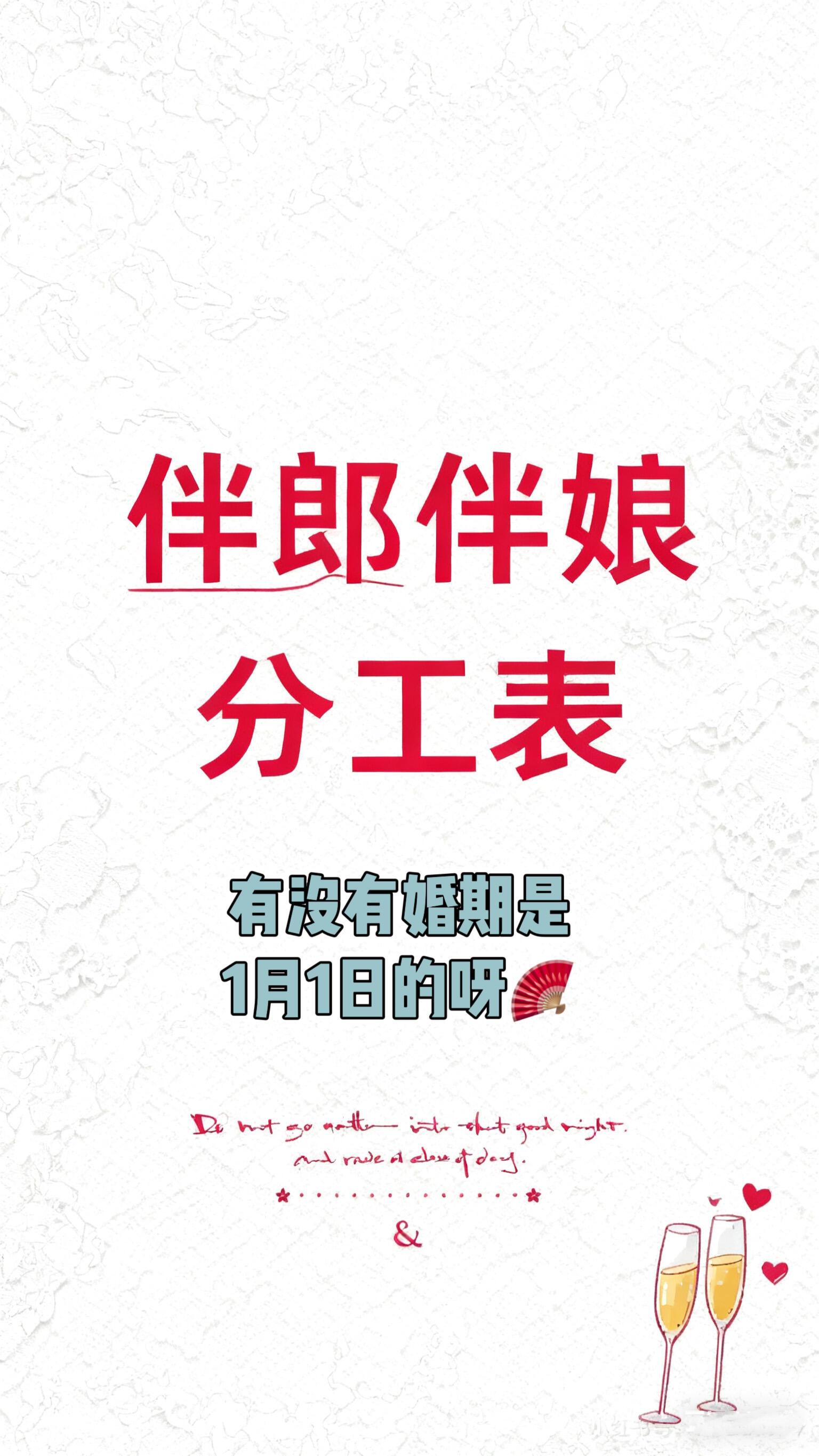 • #淮安备婚攻略 提前梳理好伴郎伴娘的分工明细,把任务落实到个人,婚礼当天有条不紊,新郎新娘只需负责美美登场,其他的都安心交给队友们~ 祝大家都能圆满完婚呀~ 有没有2026年1月1号结婚的姐妹呀