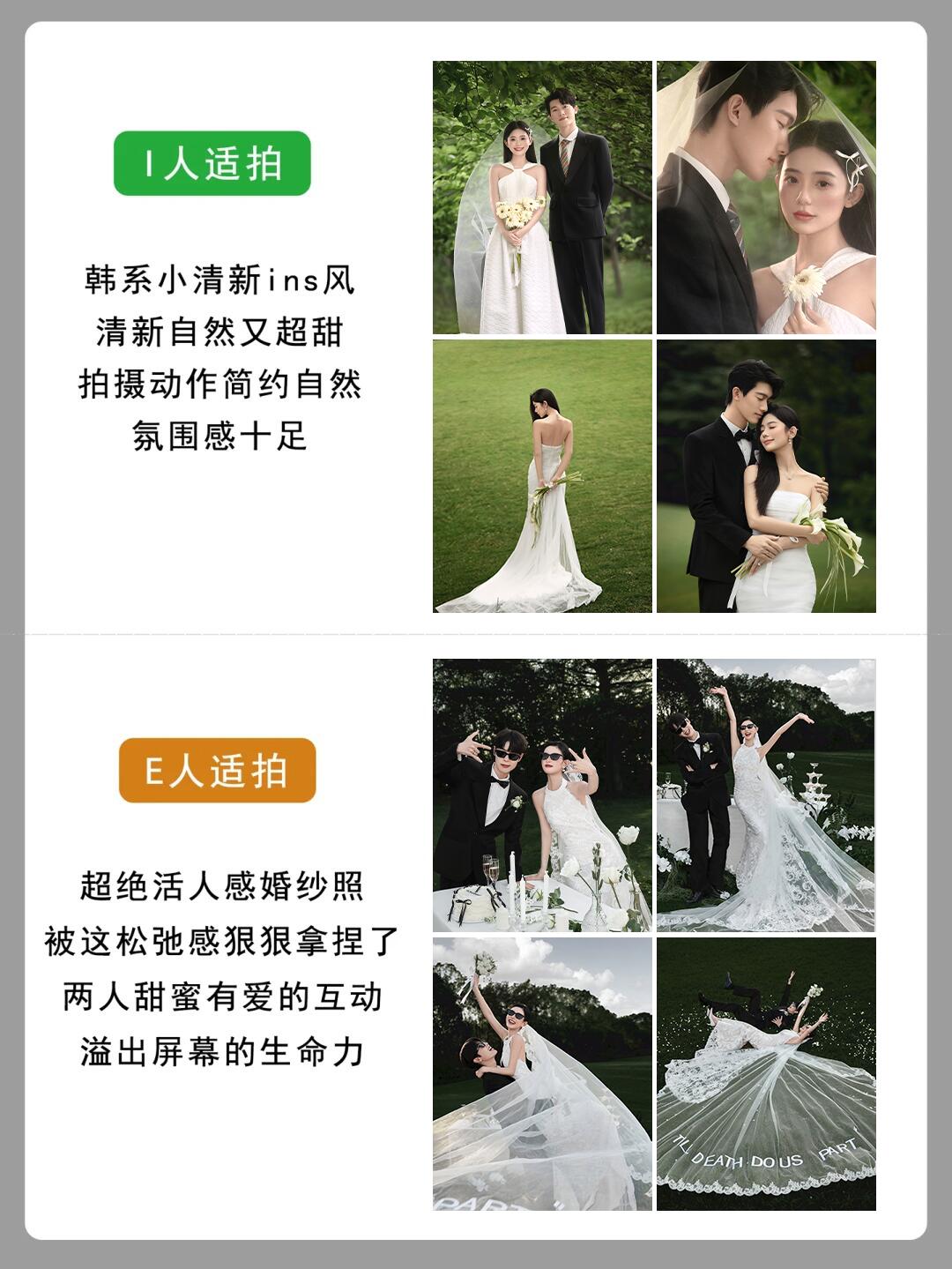 • #淮安备婚攻略 i人-内向社恐: 推荐动作自然的风格,尝试高冷端庄大气路线 E人-外向阳光: 适合活泼灵动的风格,推荐有表现力,俏皮可爱的拍摄方向 - 不论是i人还是E人 婚纱照都能拍得美美哒