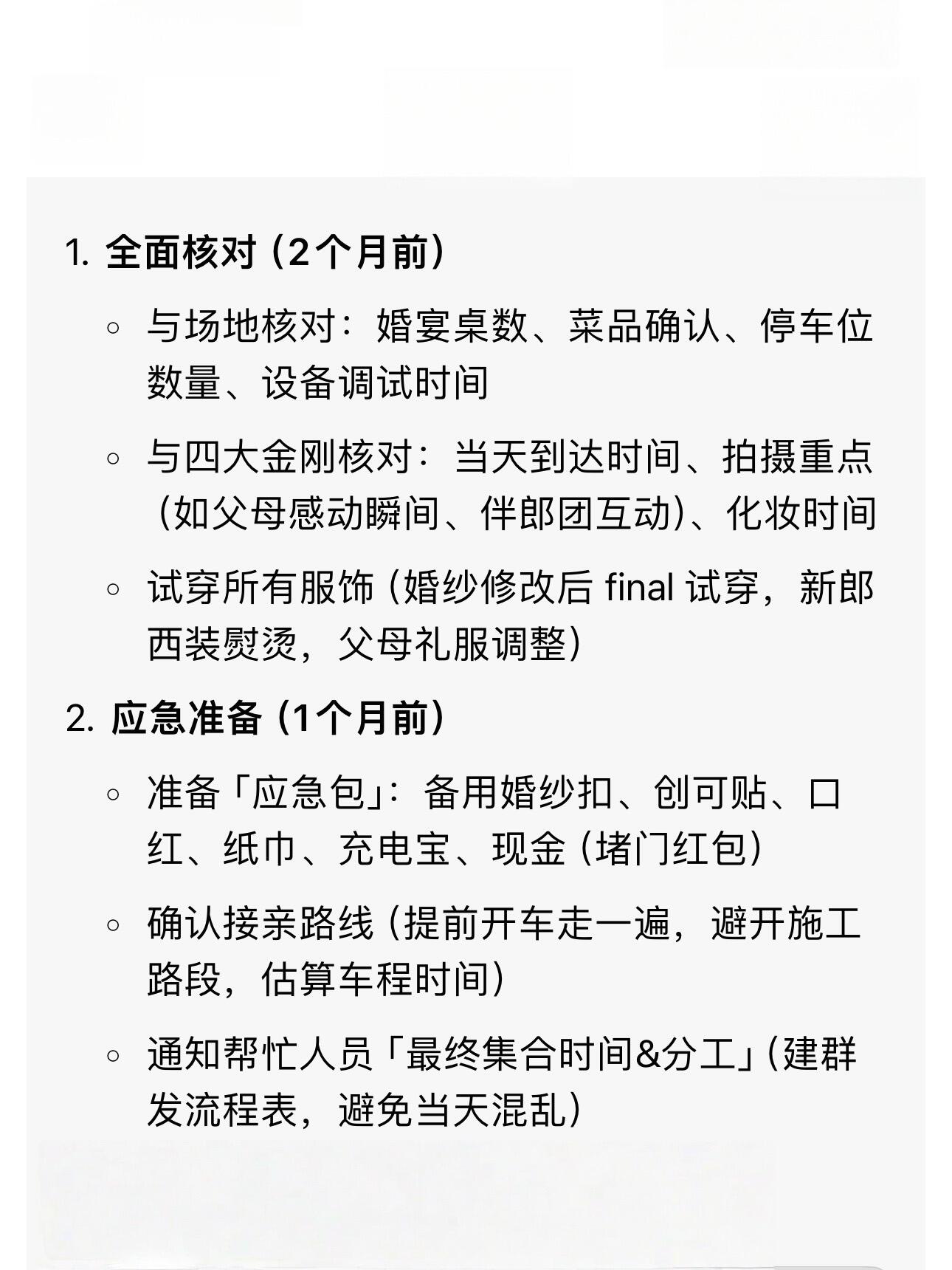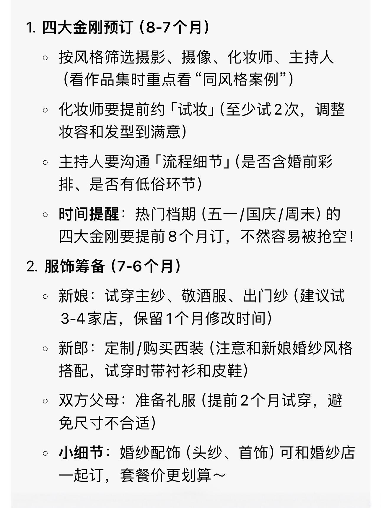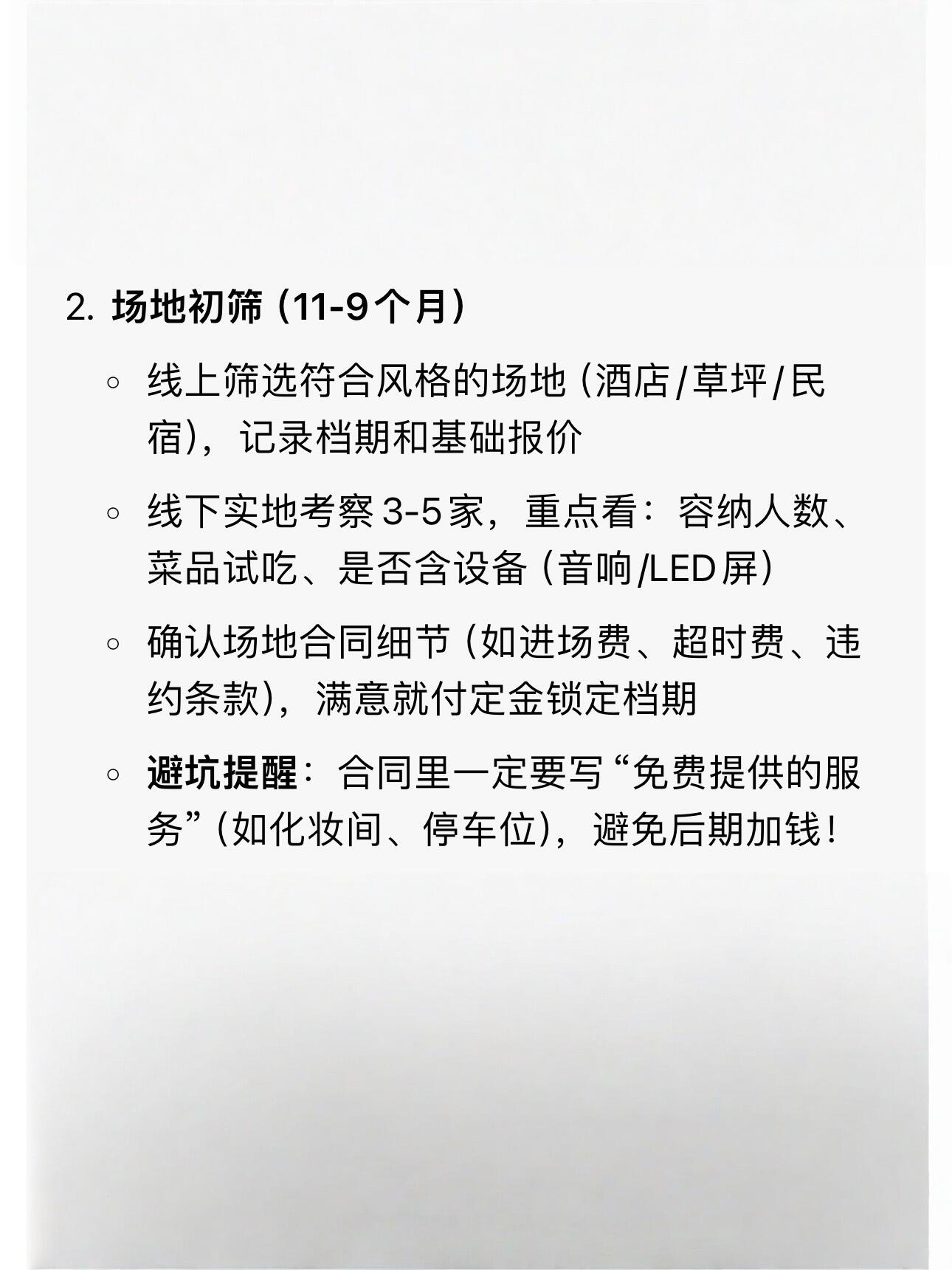 • #淮安备婚攻略 附避坑细节 谁懂啊!刚开始备婚时我像个无头苍蝇,今天忘订化妆师、明天漏算场地费,直到整理了这份「分阶段时间表」,才把节奏稳下来——从12个月到婚礼当天,每个节点该做啥都标得明明白白,抄作业就行