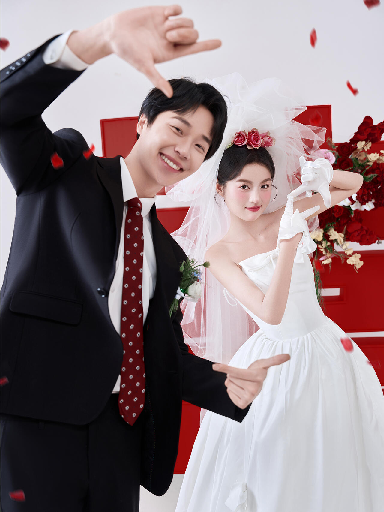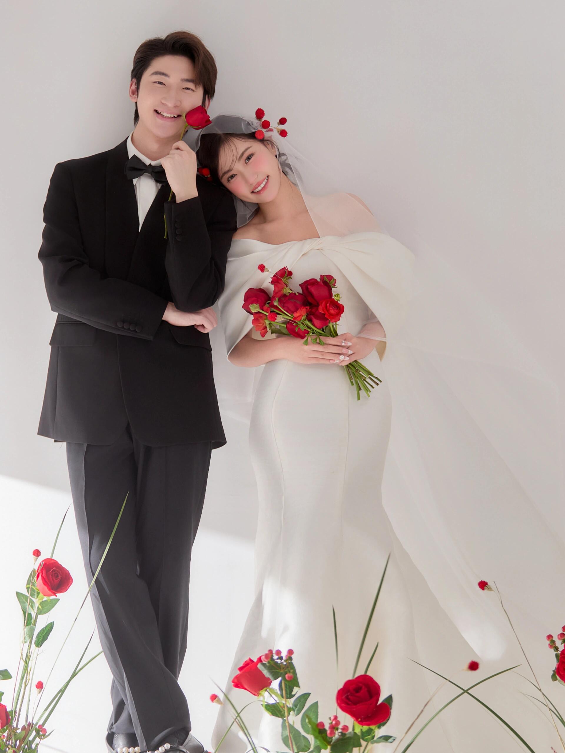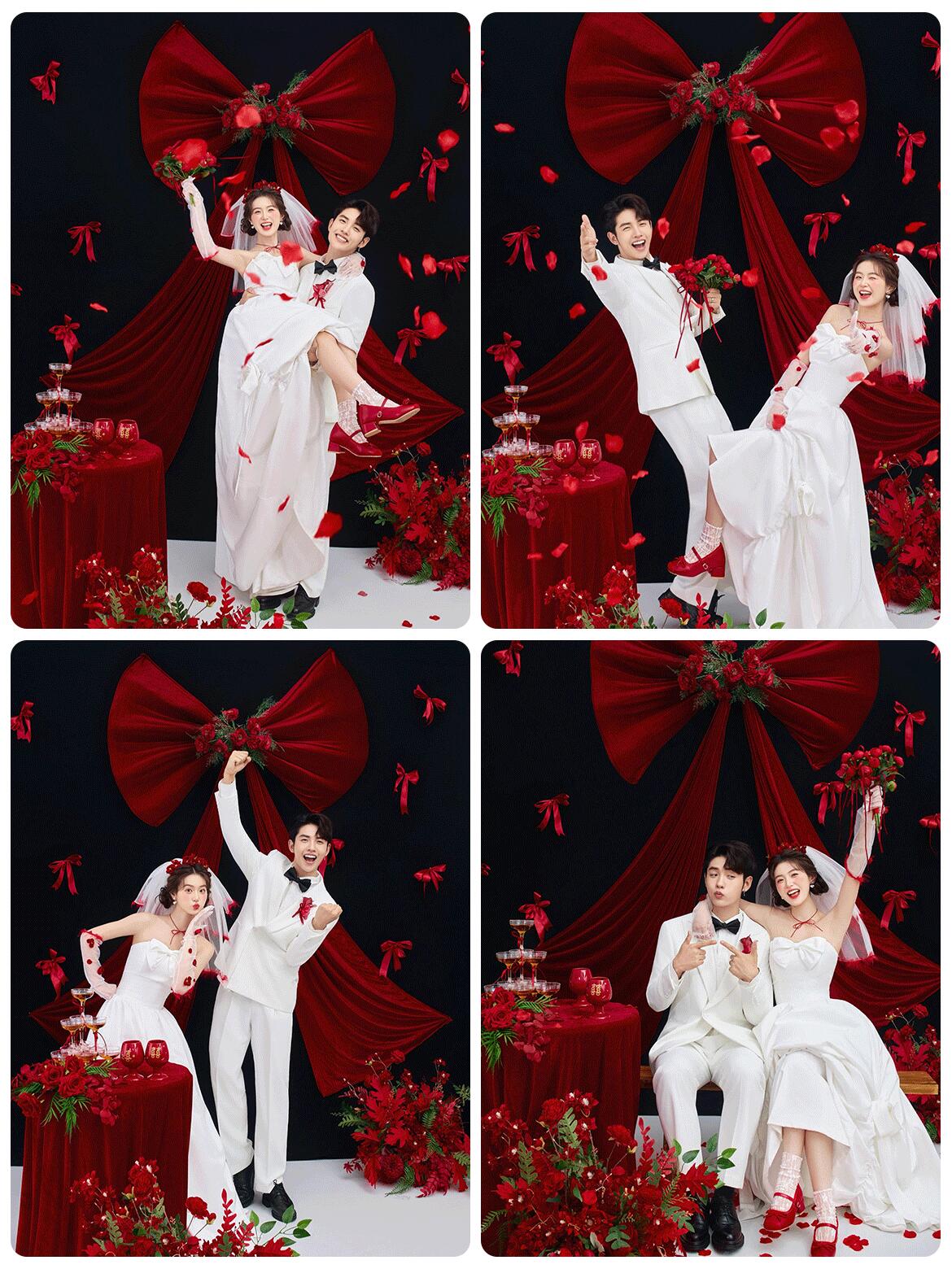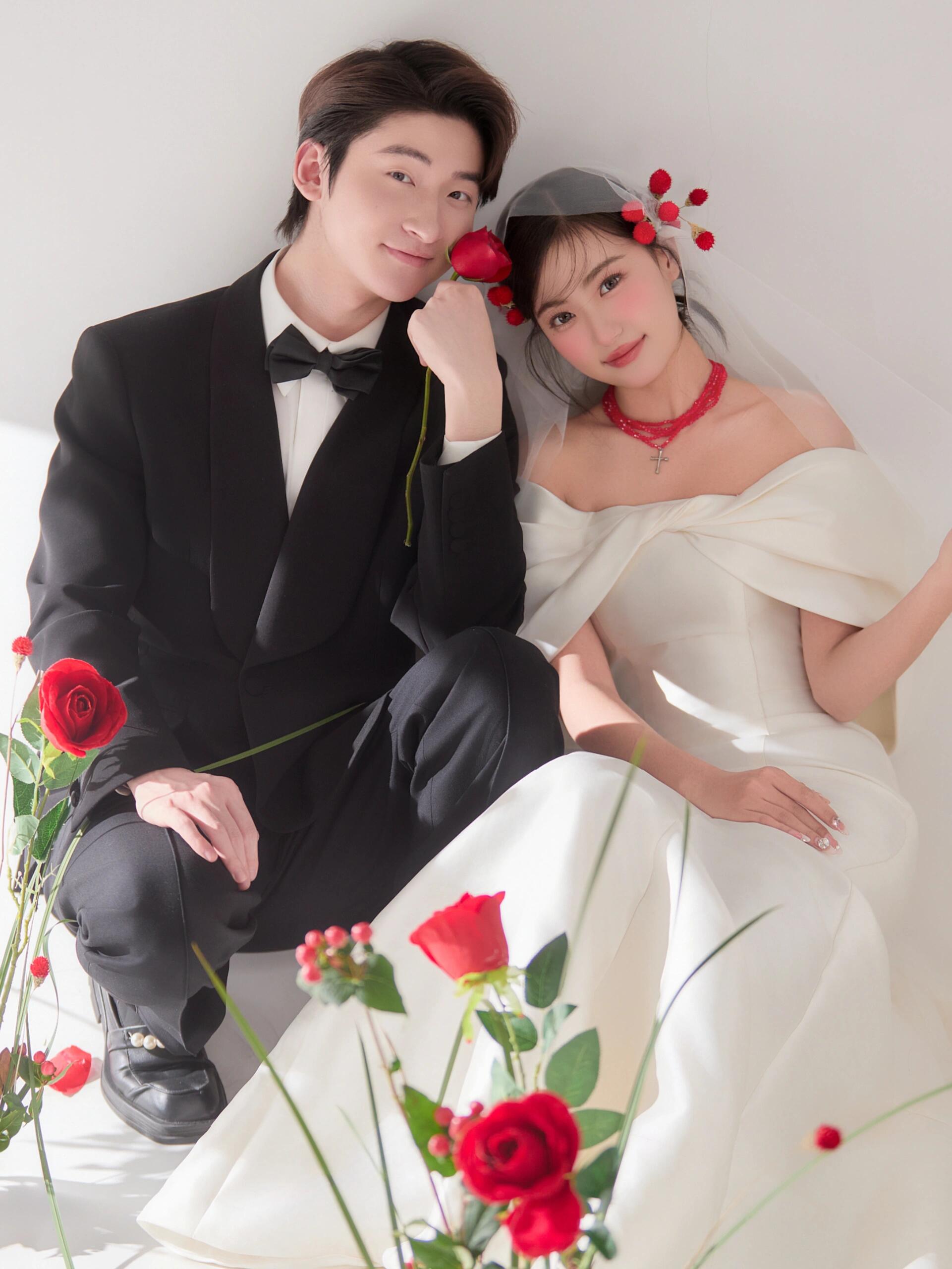 • #浪漫光影婚纱照纯白色背景和婚纱照作为主色调 用鲜艳的红玫瑰🌹点缀 韩里韩气又高级温柔 出片率💯 备婚的姐妹可以看下这组婚纱照哦~ -