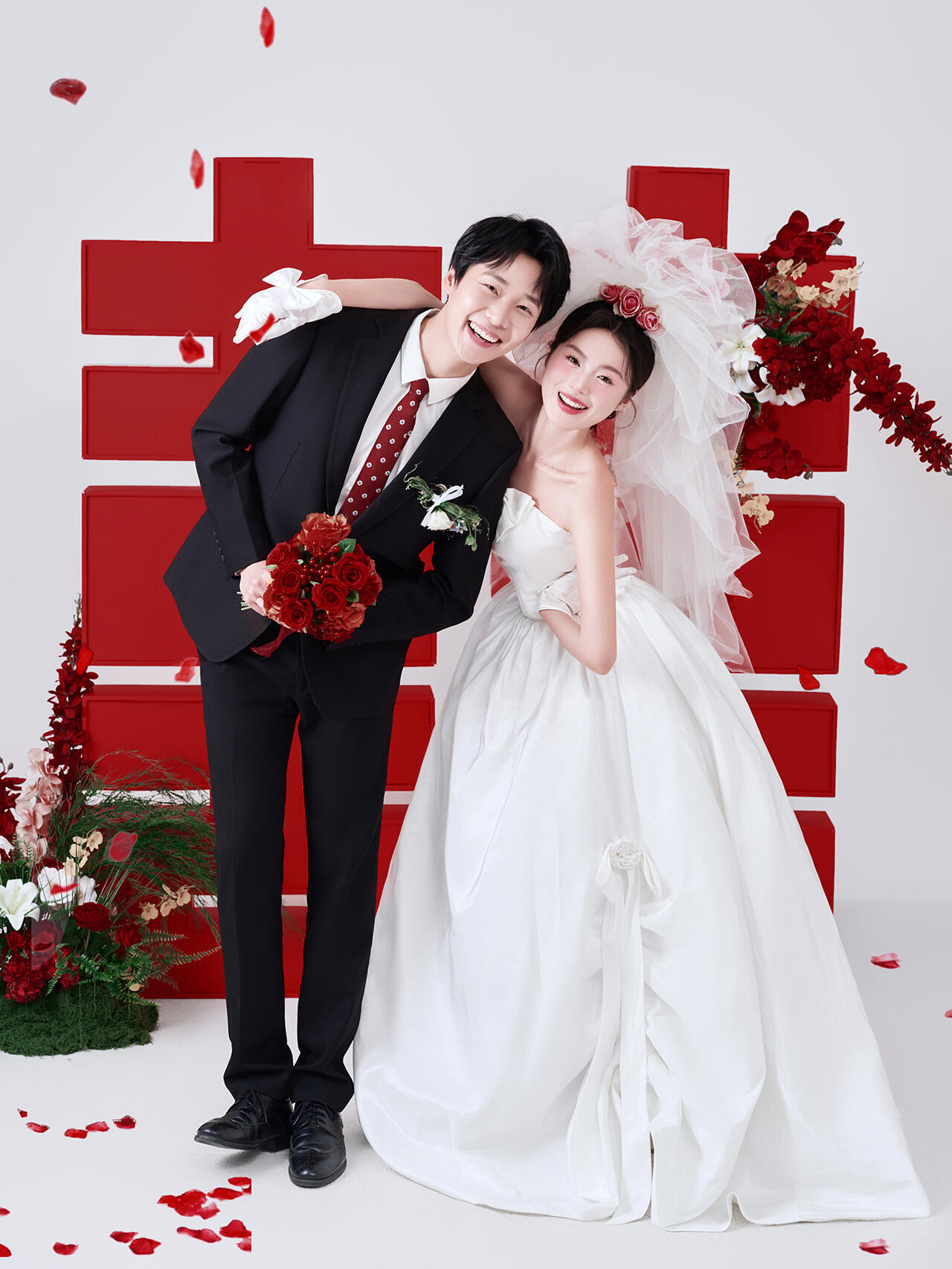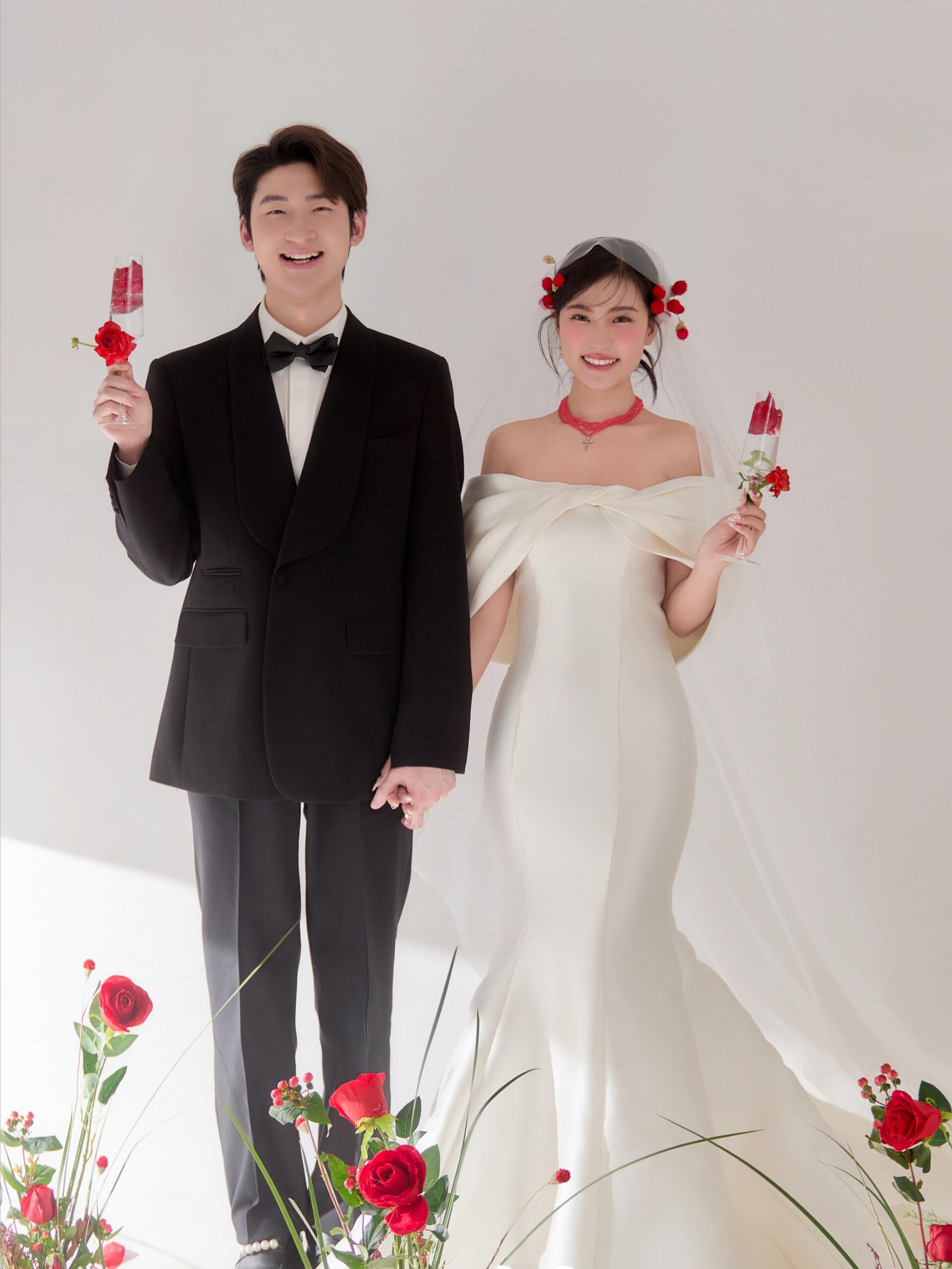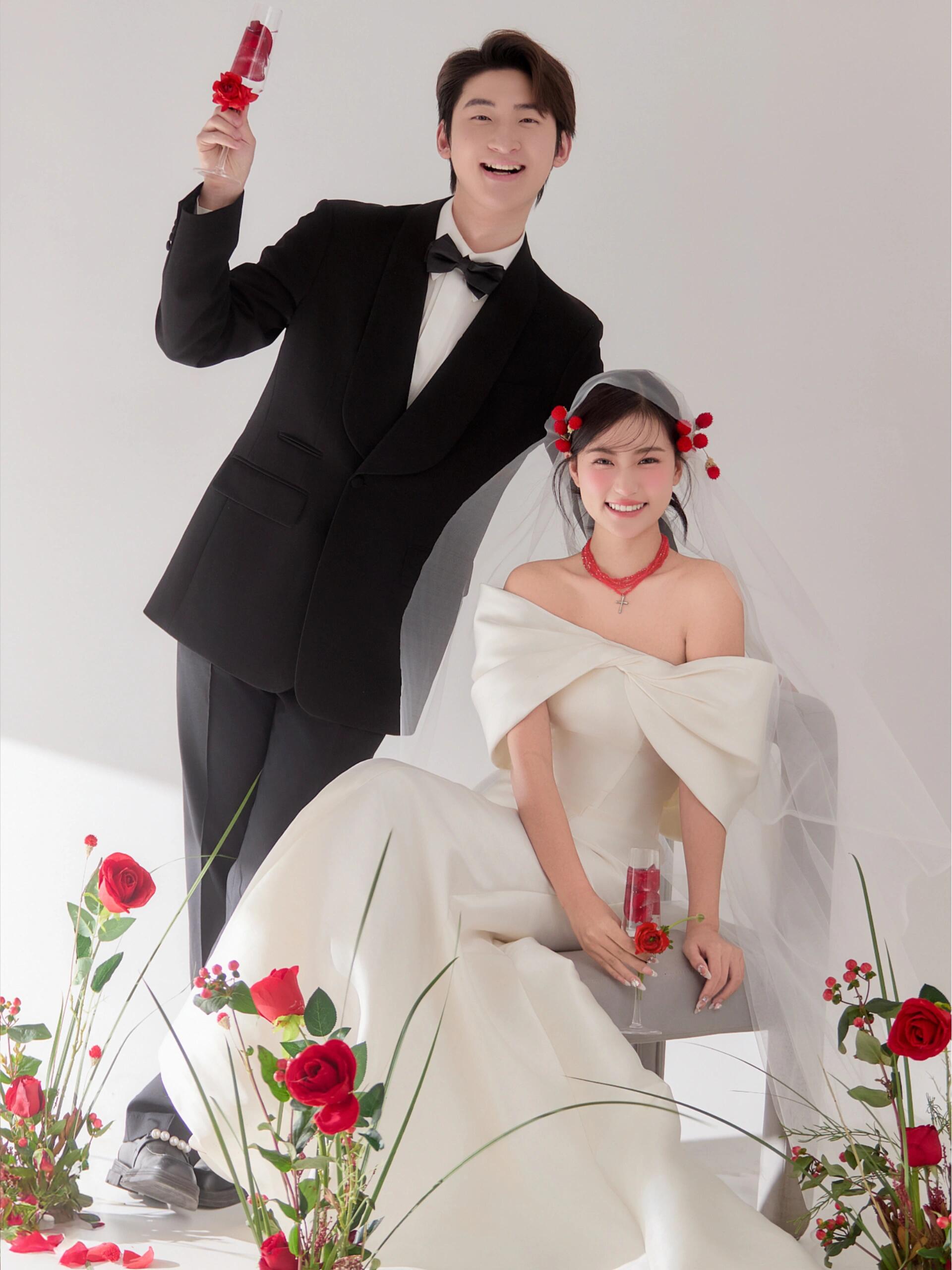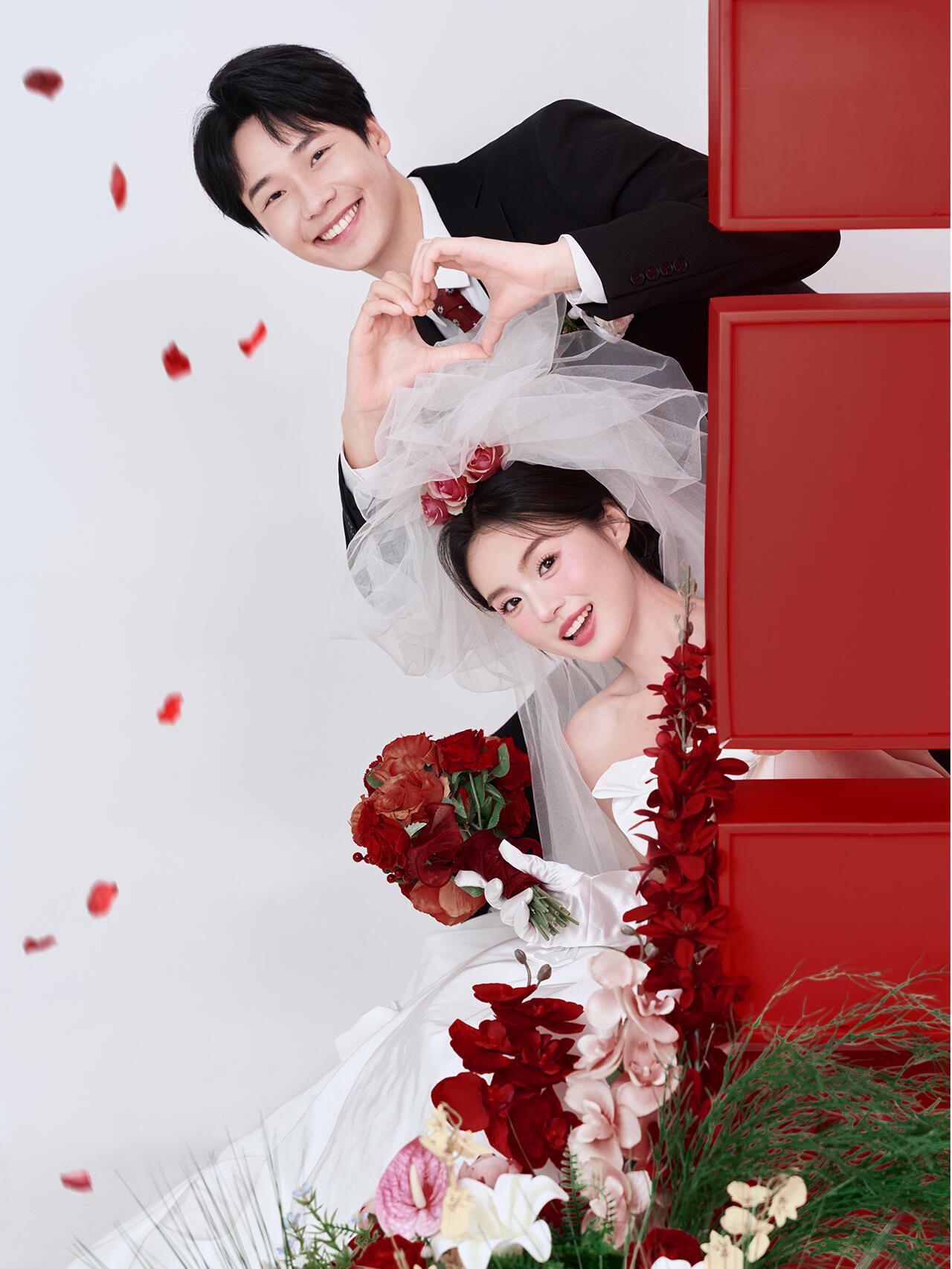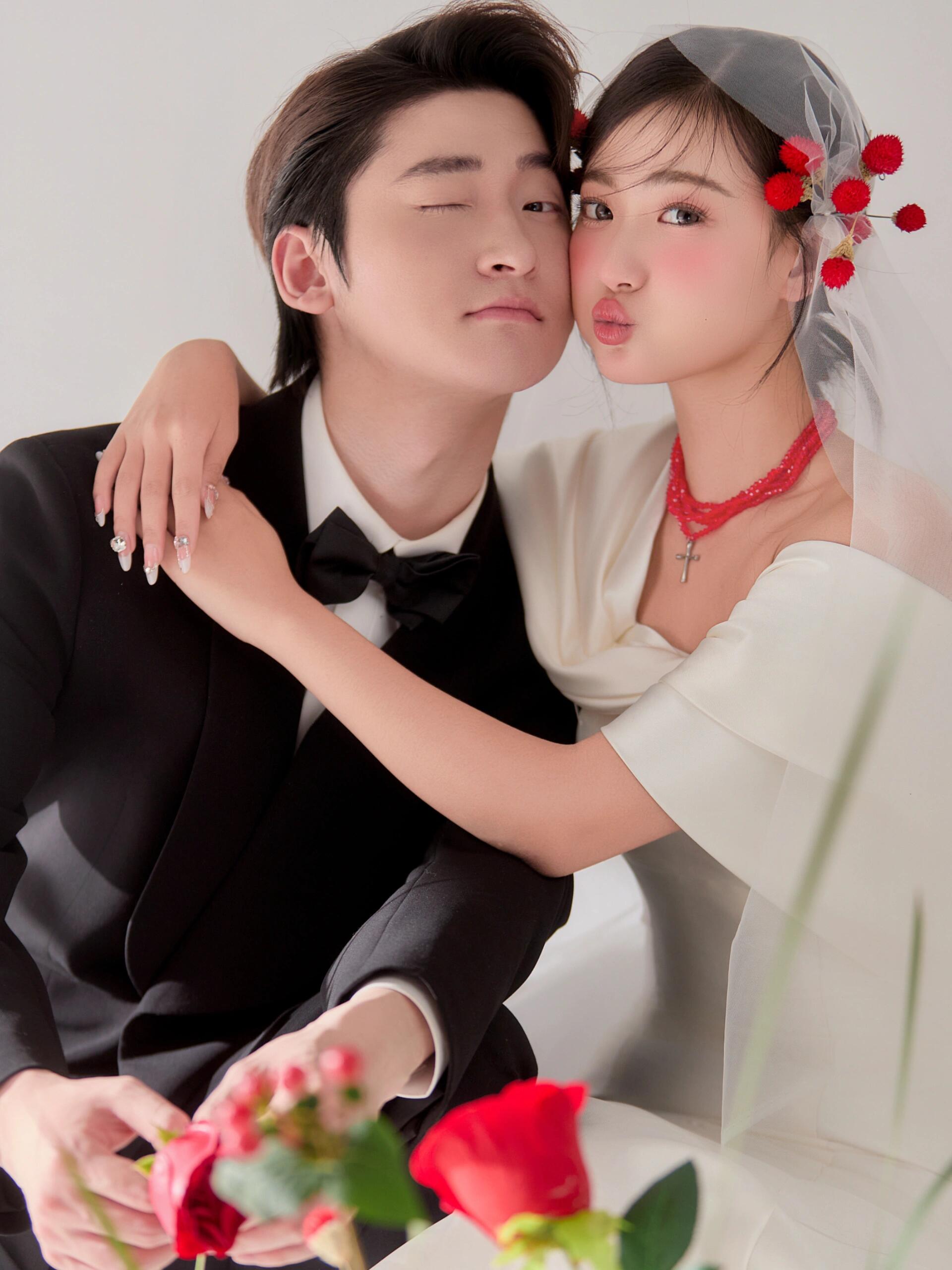 • #浪漫光影婚纱照纯白色背景和婚纱照作为主色调 用鲜艳的红玫瑰🌹点缀 韩里韩气又高级温柔 出片率💯 备婚的姐妹可以看下这组婚纱照哦~ -