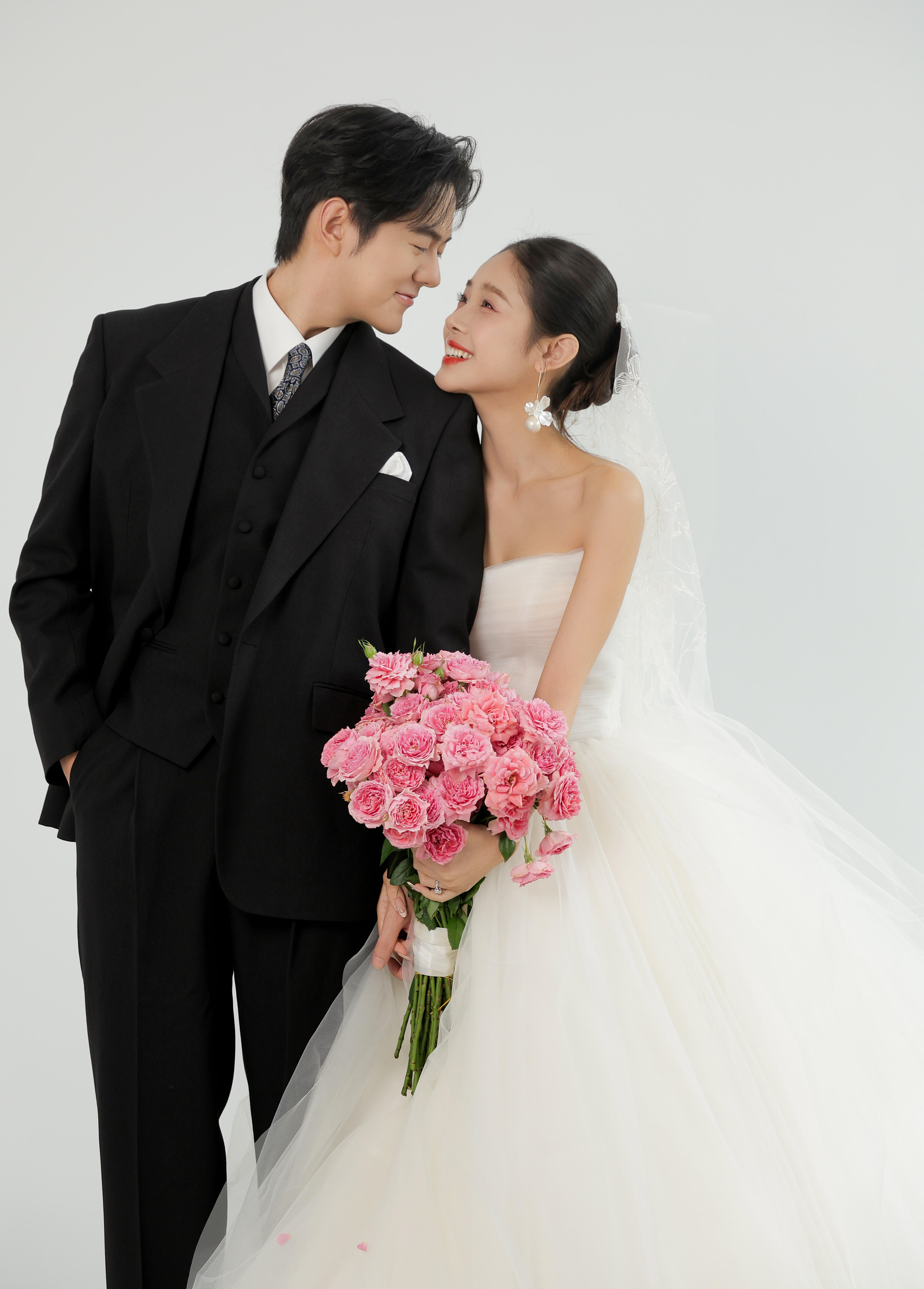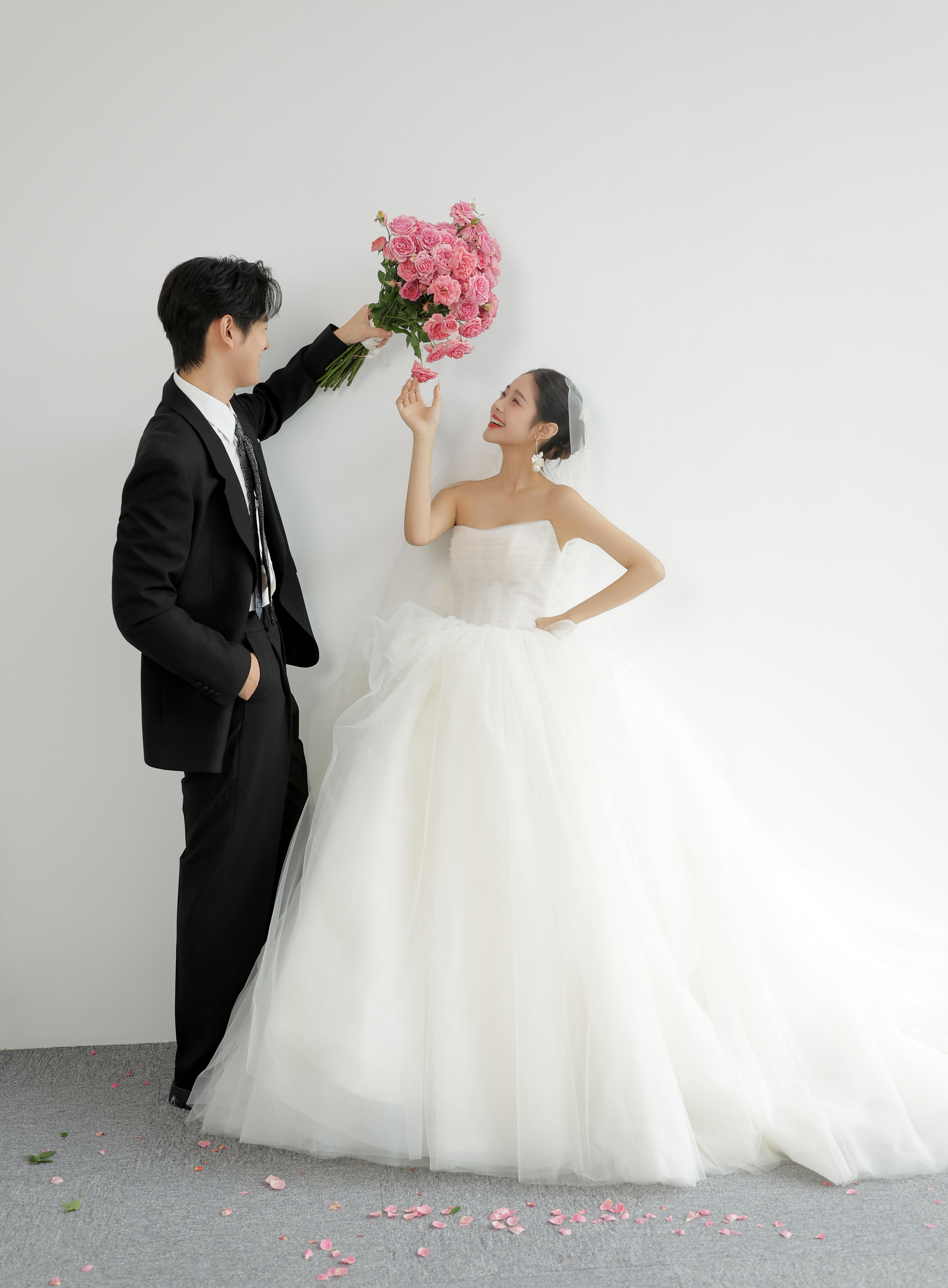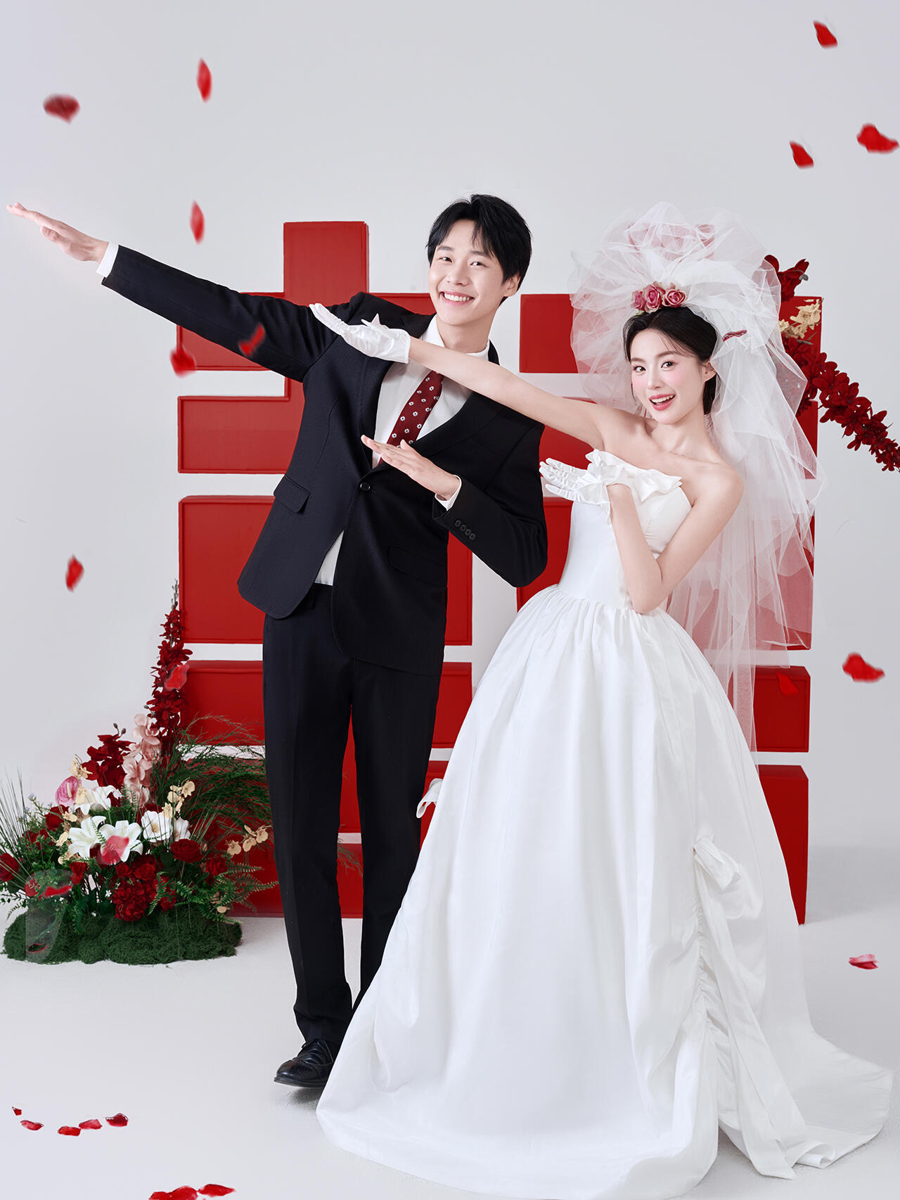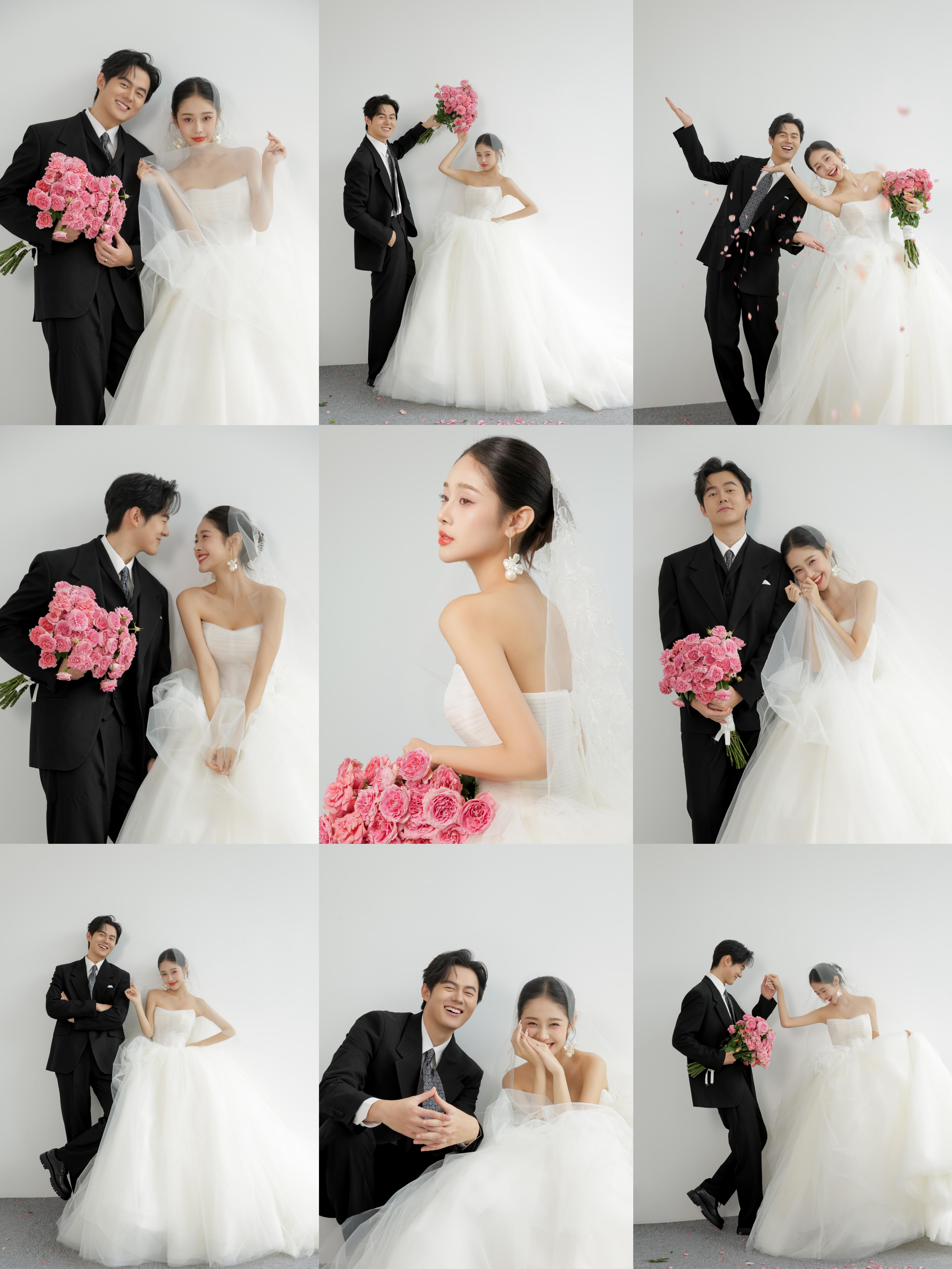 • #浪漫光影婚纱照纯白色背景和婚纱照作为主色调 用鲜艳的红玫瑰🌹点缀 韩里韩气又高级温柔 出片率💯 备婚的姐妹可以看下这组婚纱照哦~ -