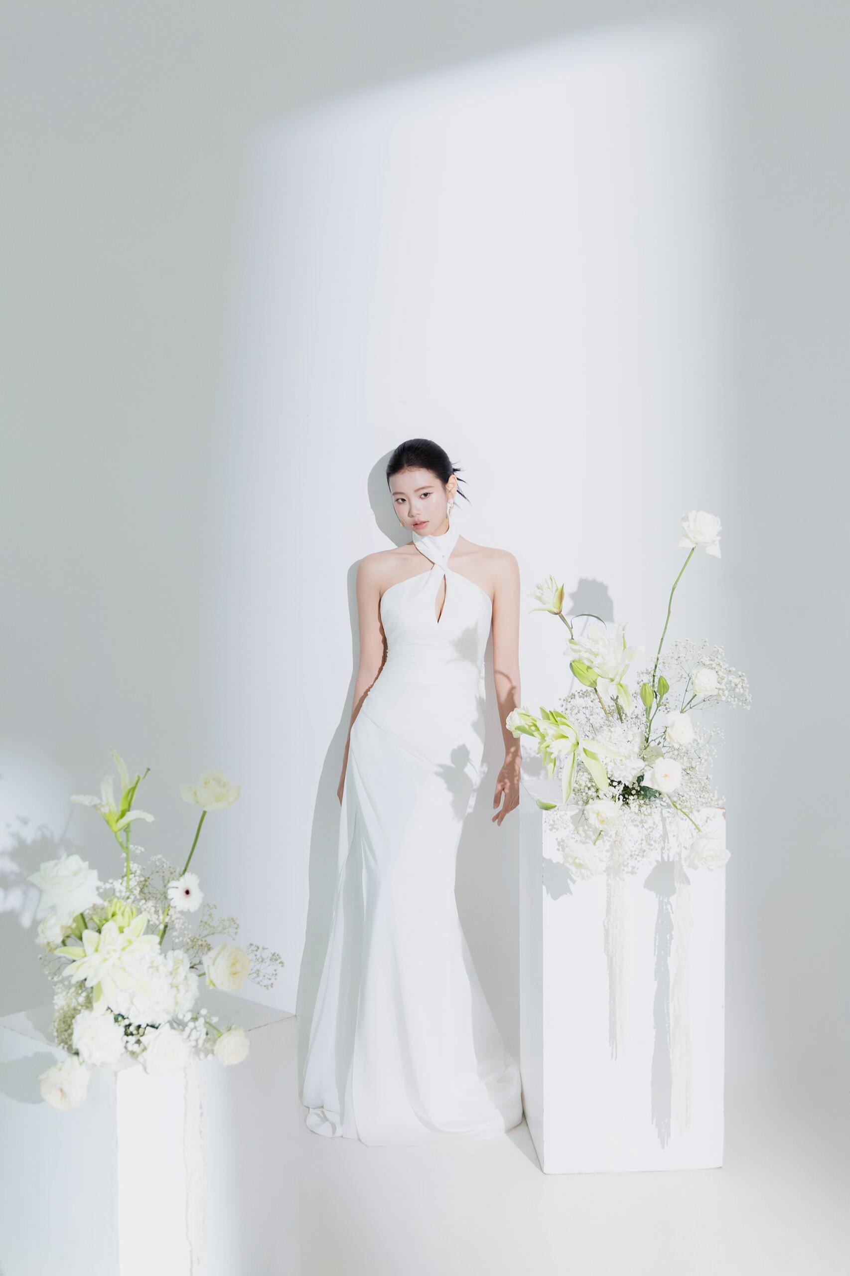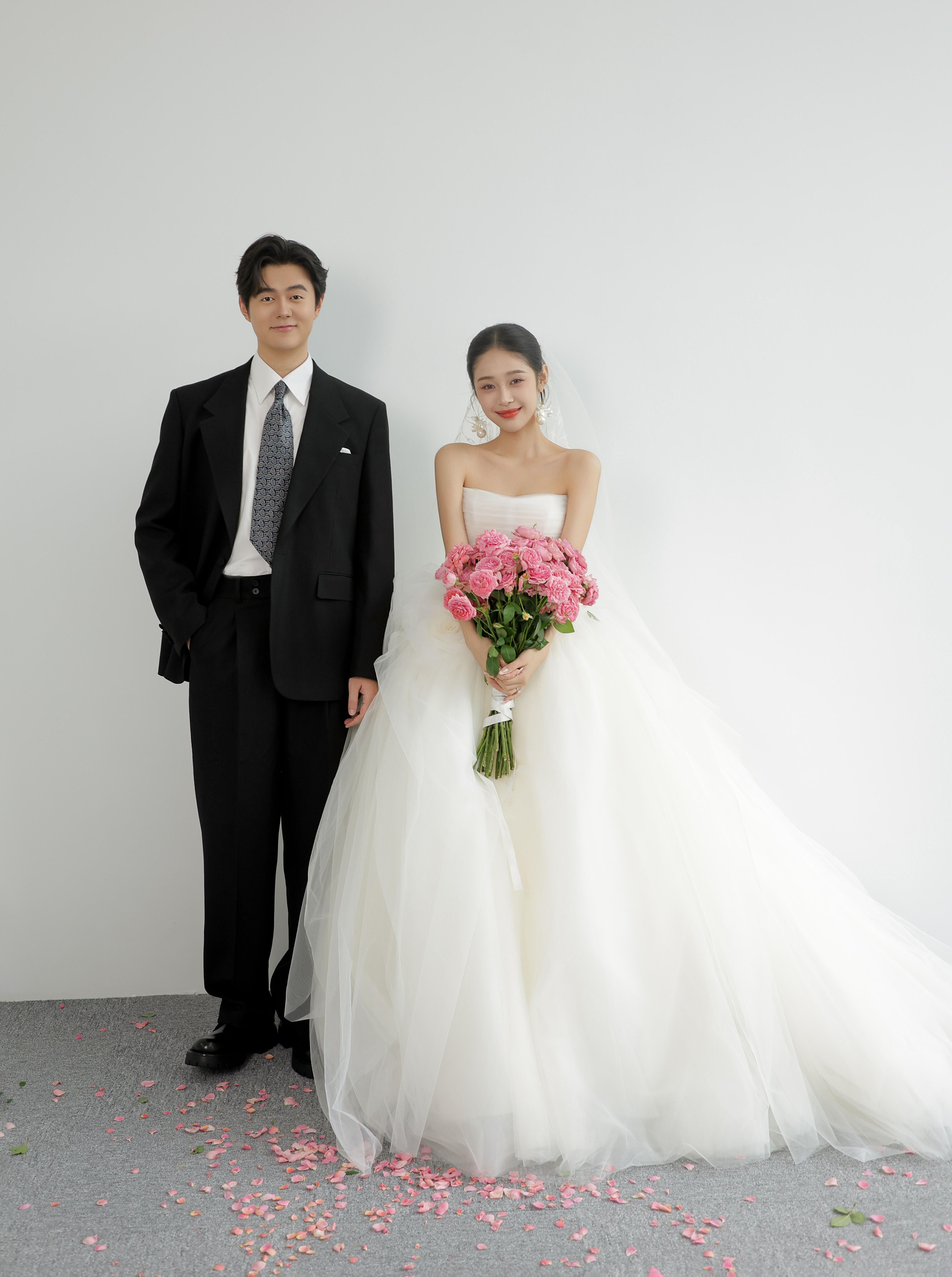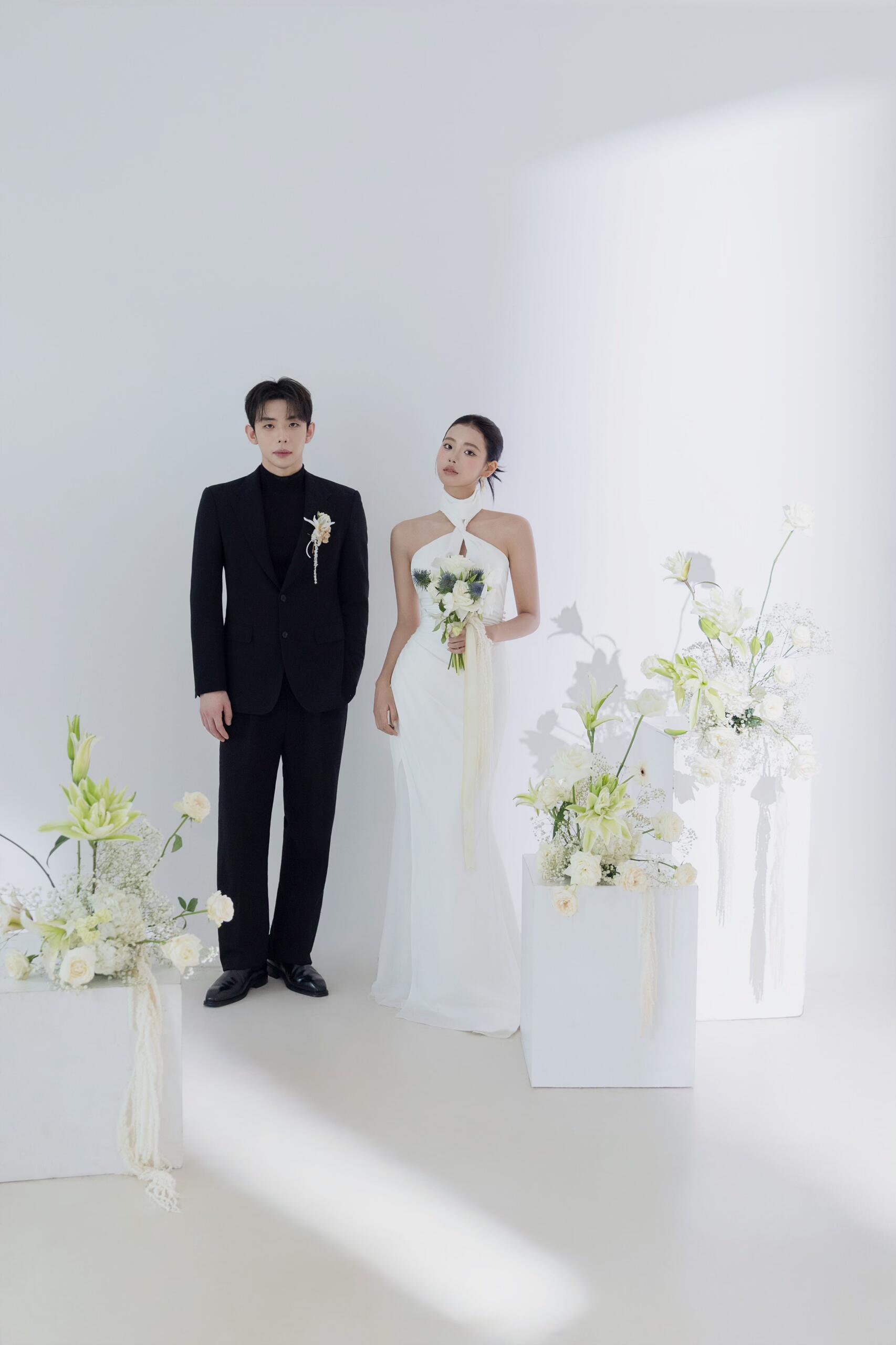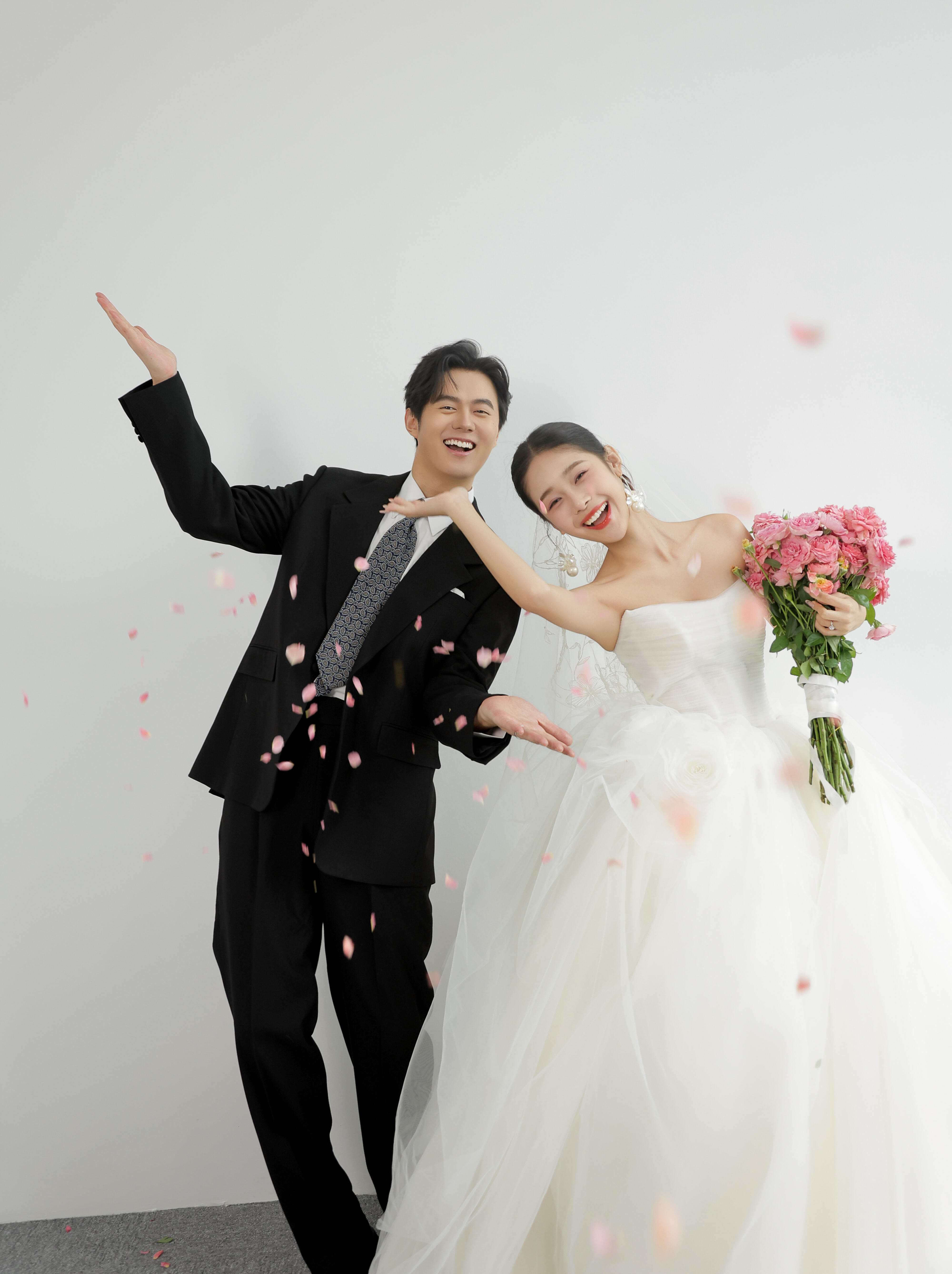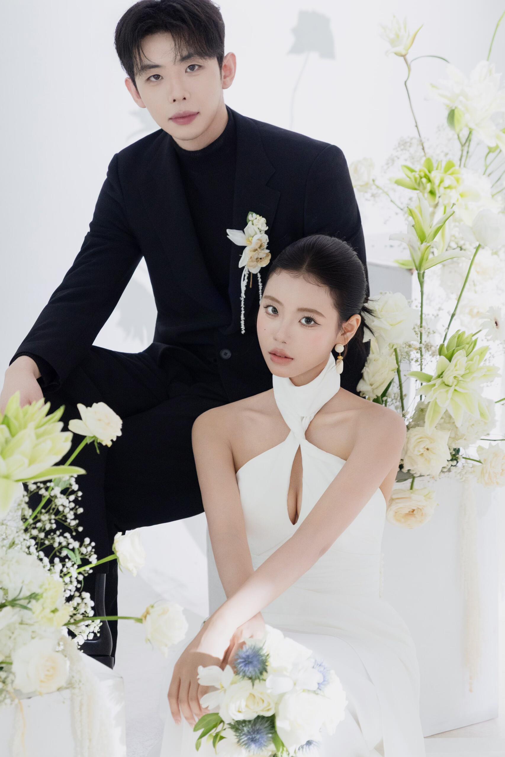 • #浪漫光影婚纱照纯白色背景和婚纱照作为主色调 用鲜艳的红玫瑰🌹点缀 韩里韩气又高级温柔 出片率💯 备婚的姐妹可以看下这组婚纱照哦~ -