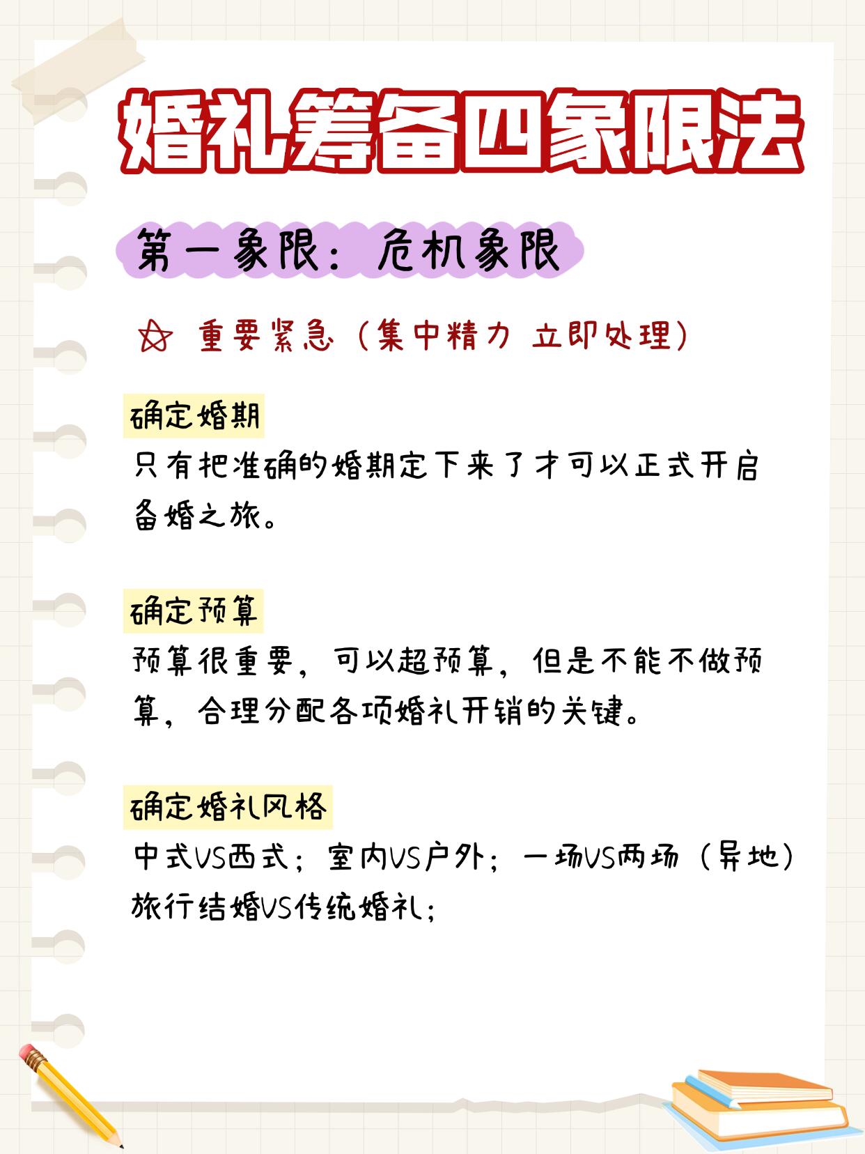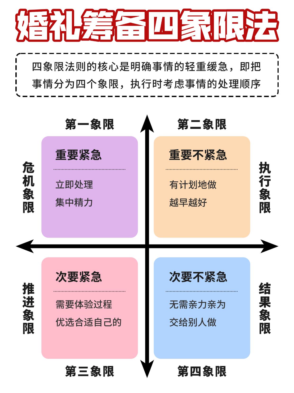 • #淮安备婚攻略 很多刚开始备婚的姐妹们会不会有这样的体验❓ 感觉要做的事情很多 但也不知道从哪里下手 偶然看到的四象限法则 有救了‼️姐妹们 给大家罗列了一下 希望有所帮助哦[心心眼R]