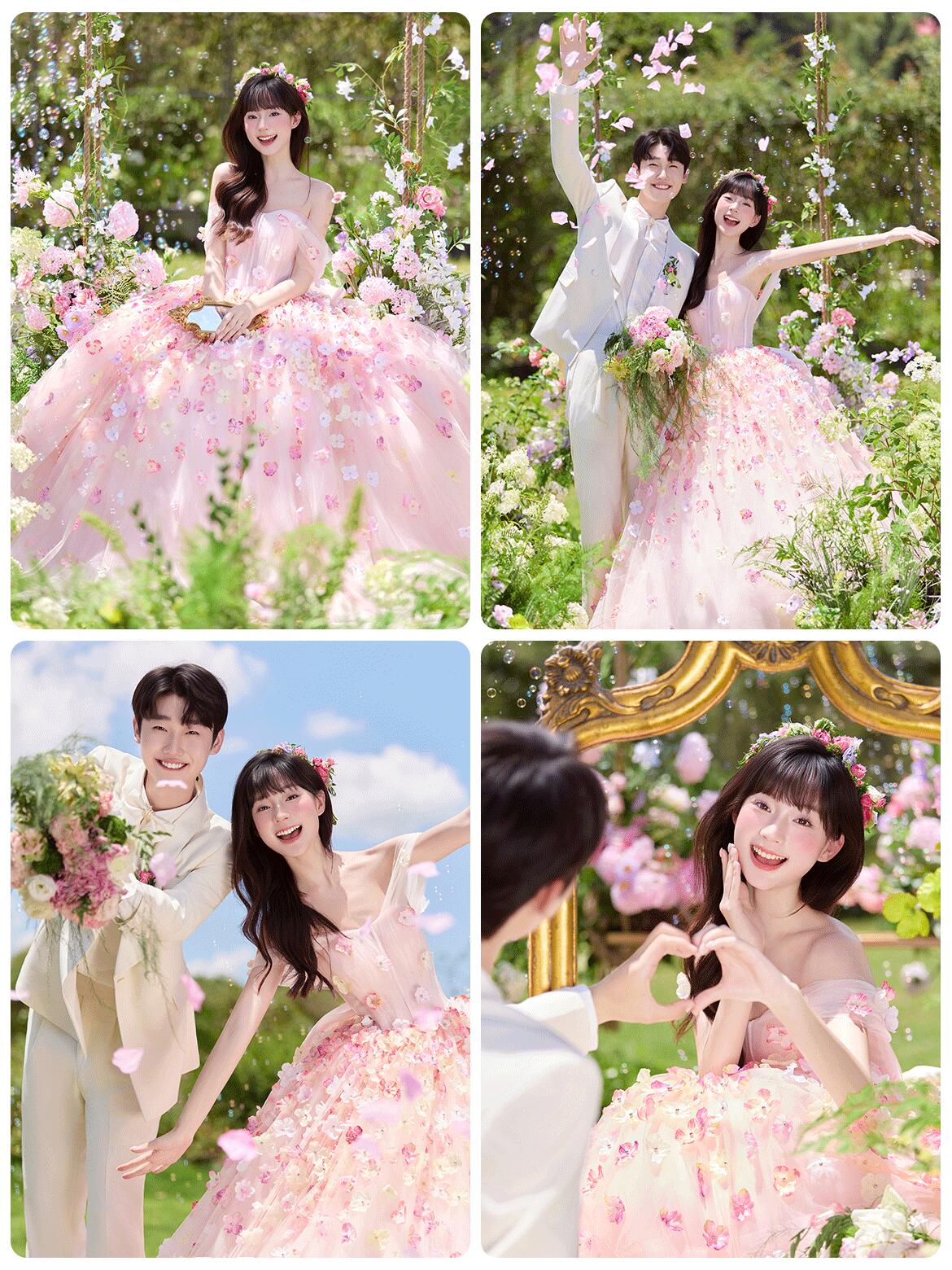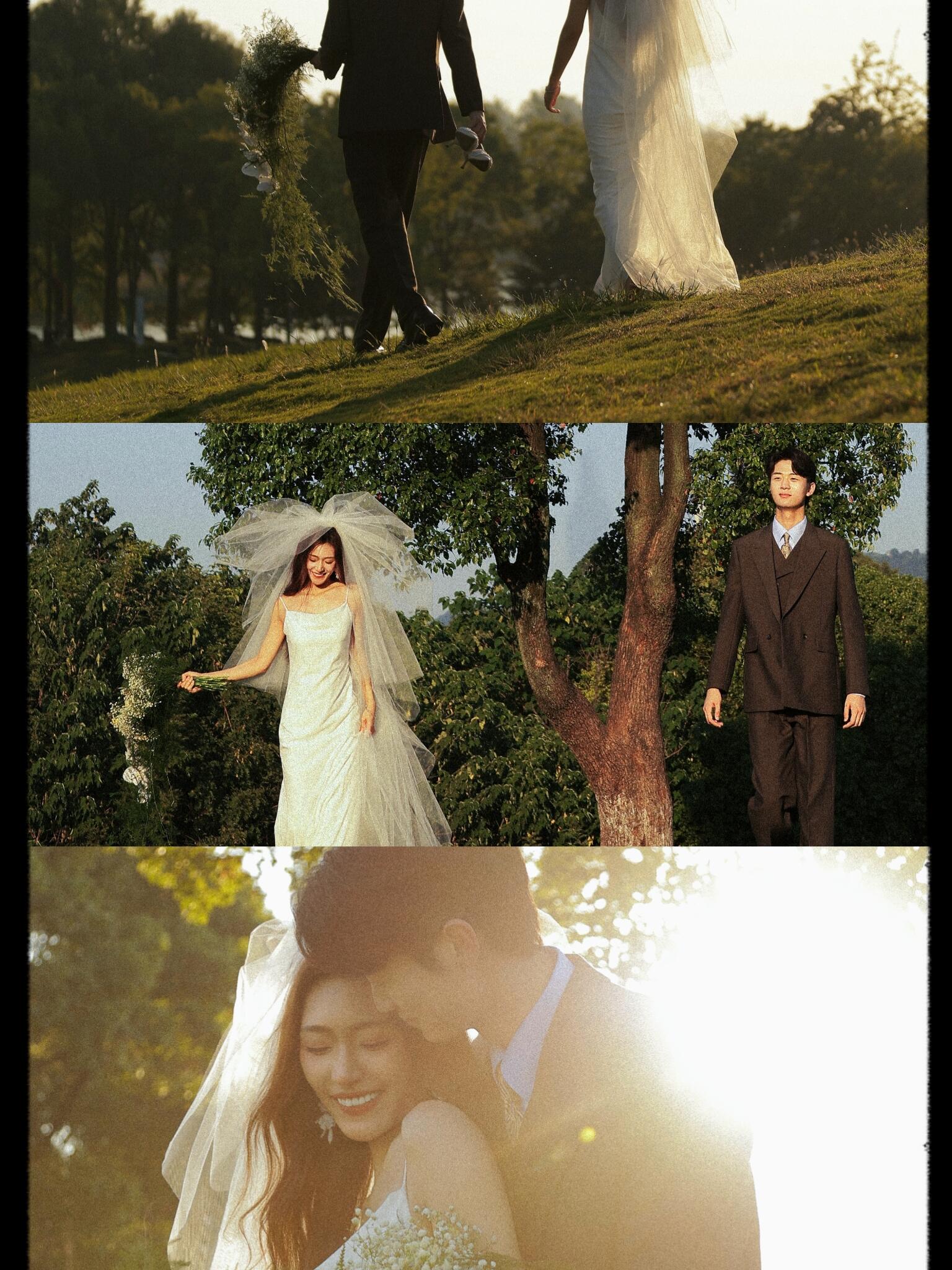 • #复古胶片婚纱照必拍大草坪中央 阳光晴好时,草坪像一块翠绿的绒毯,新人手牵手奔跑或静坐,让白纱在风里自然舒展,背景干净又清新,仿佛闯入童话里的秘密花园。 林荫步道 沿着树木错落的步道走,让摄影师从侧面抓拍,阳光透过树叶洒下斑驳光影,白纱与深棕树干形成色彩对比,氛围感直接拉满! 📸 拍摄小技巧 - 服装选轻盈的拖尾白纱,搭配简约头纱,在草坪上跑动时更有动态美感; ​ - 时间选上午 9 - 10 点或下午 3 - 5 点,光线柔和不刺眼,出片更有质感; ​ - 可以带一束简约花束当道具,蹲在草坪上互动时,花束能让画面更生动~