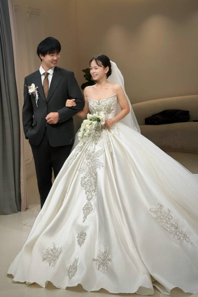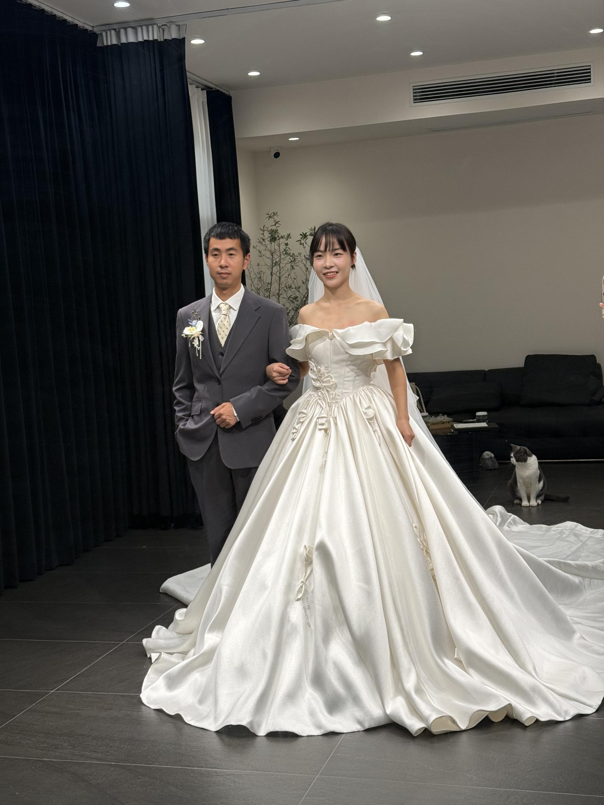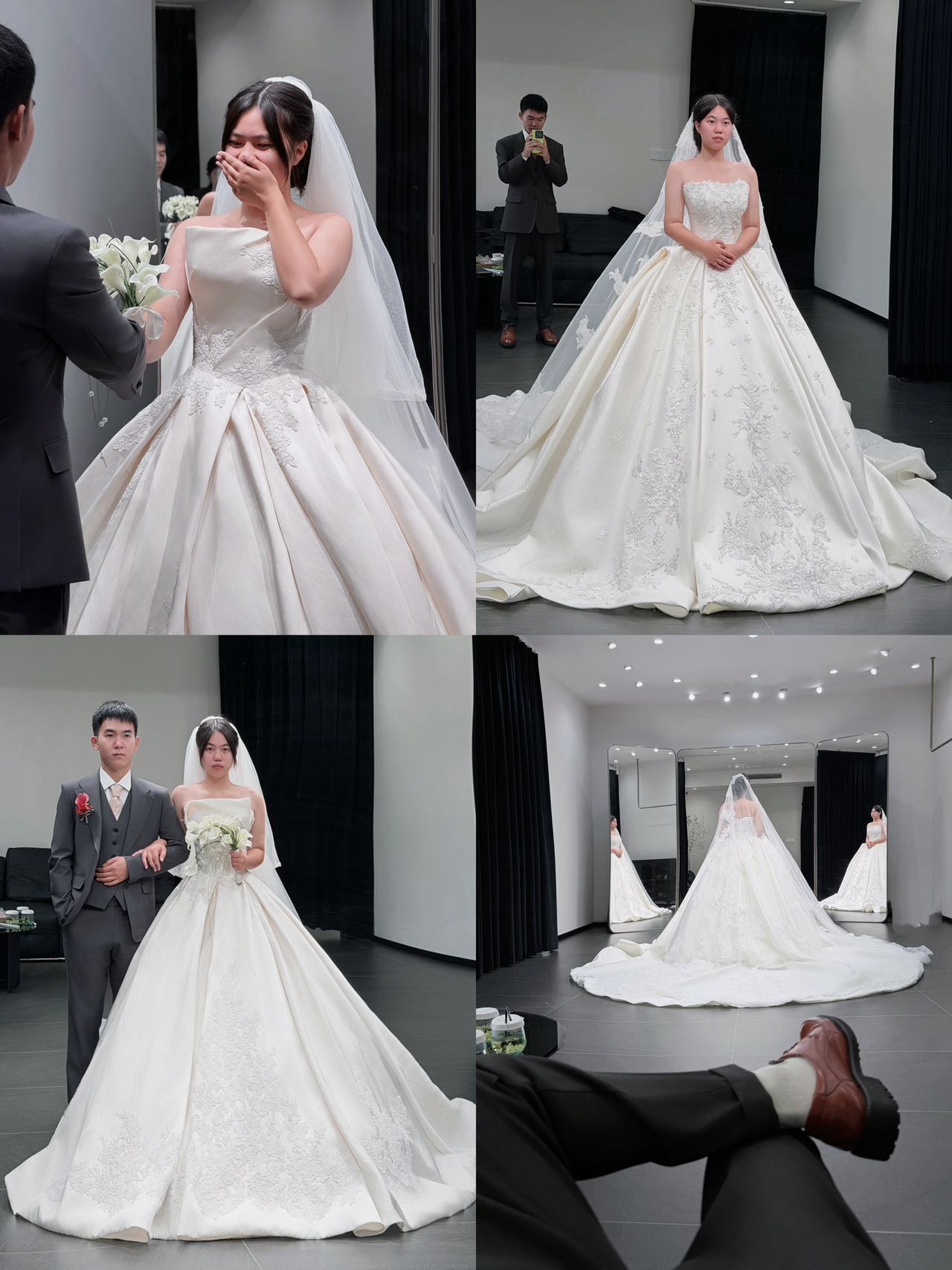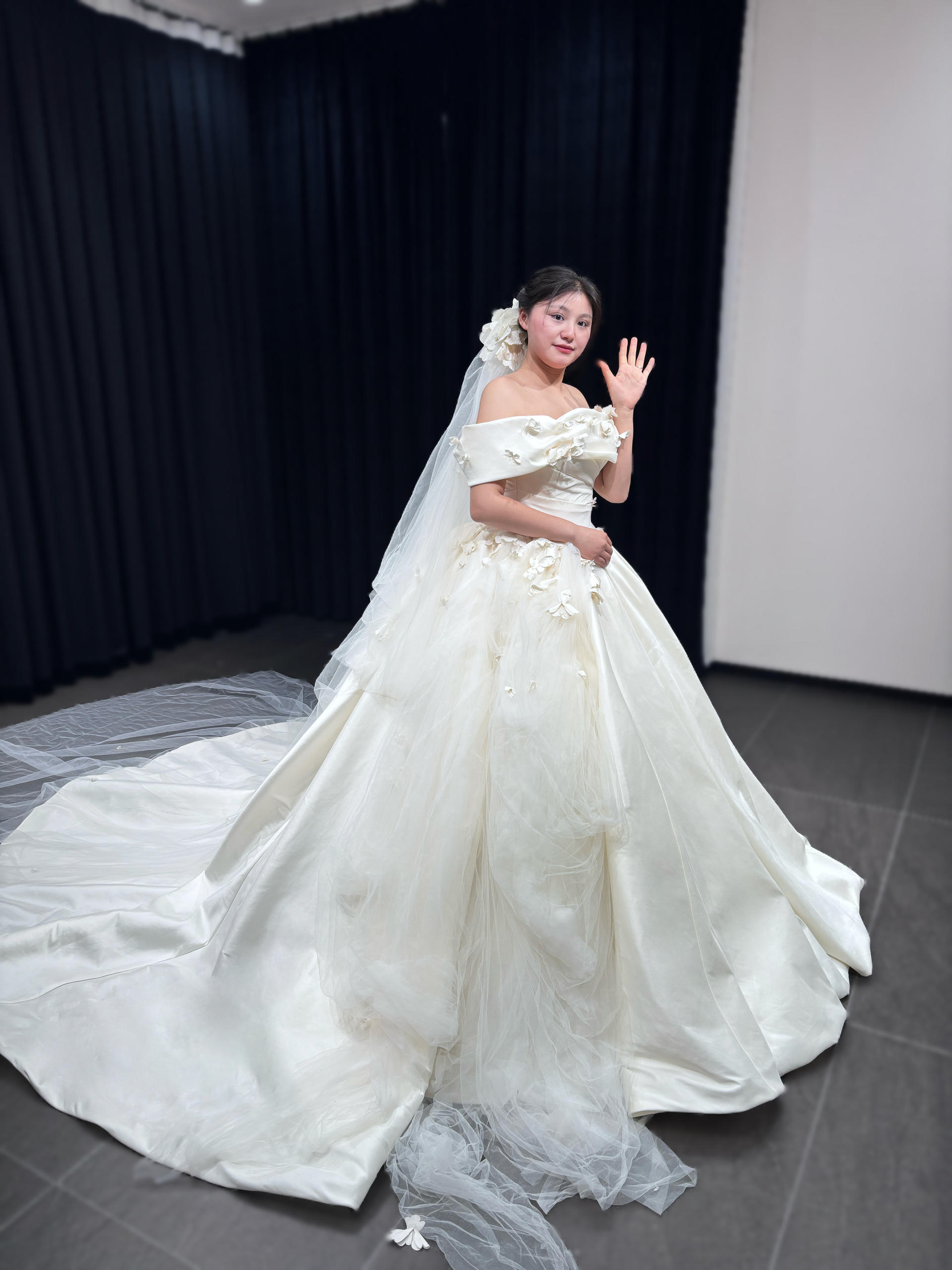 • 在洛·高定婚纱礼服馆里找到属于我的婚礼模样👰‍♀️ 在这家婚纱造型馆的试纱试妆体验,完全超出了我的期待! 关于婚纱:这款抹胸主纱太绝了!缎面的质感高级又细腻,上身的褶皱设计很显气质,大裙摆蓬度刚好,行走间自带公主气场,而且版型特别显瘦,把身材曲线衬得恰到好处。礼服师很有耐心,帮我搭配了头纱和手捧花,整个造型一出来,我瞬间就有了要结婚的实感。 关于妆容:化妆师的技术真的很在线!妆容是那种清透又精致的感觉,放大了我的优点,又很自然,不会有厚重的妆感。发型搭配的白色花饰和头纱,和婚纱风格特别搭,温柔又浪漫。 从进店的贴心接待,到试纱时的专业建议,再到试妆时的细致服务,强烈推荐给正在备婚的姐妹们,来这里试一次,你会和我一样,对自己的婚礼充满期待!