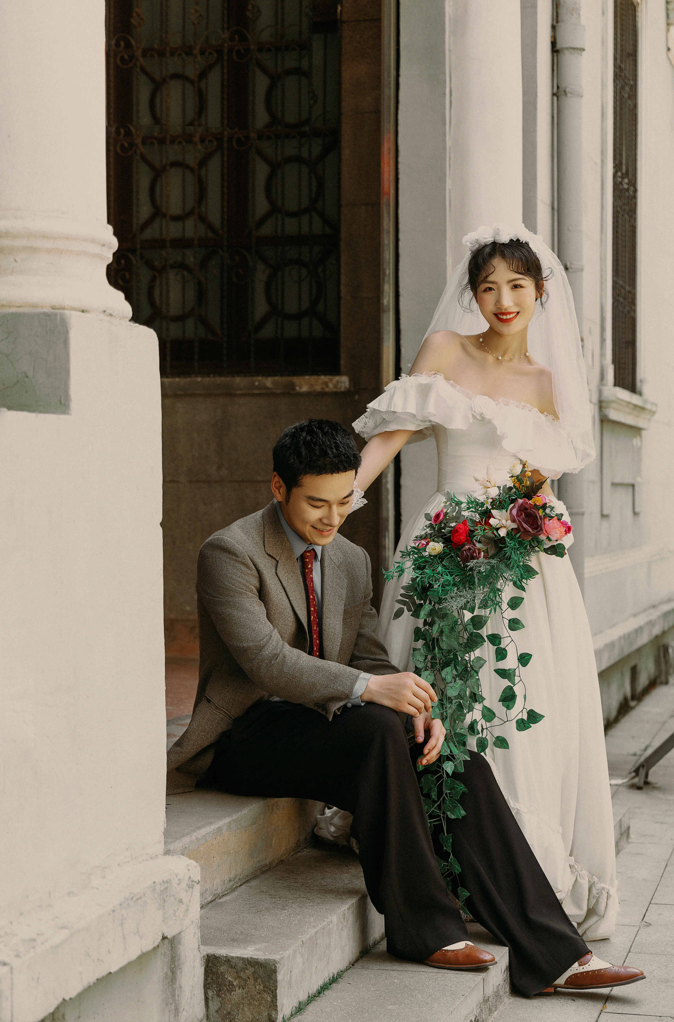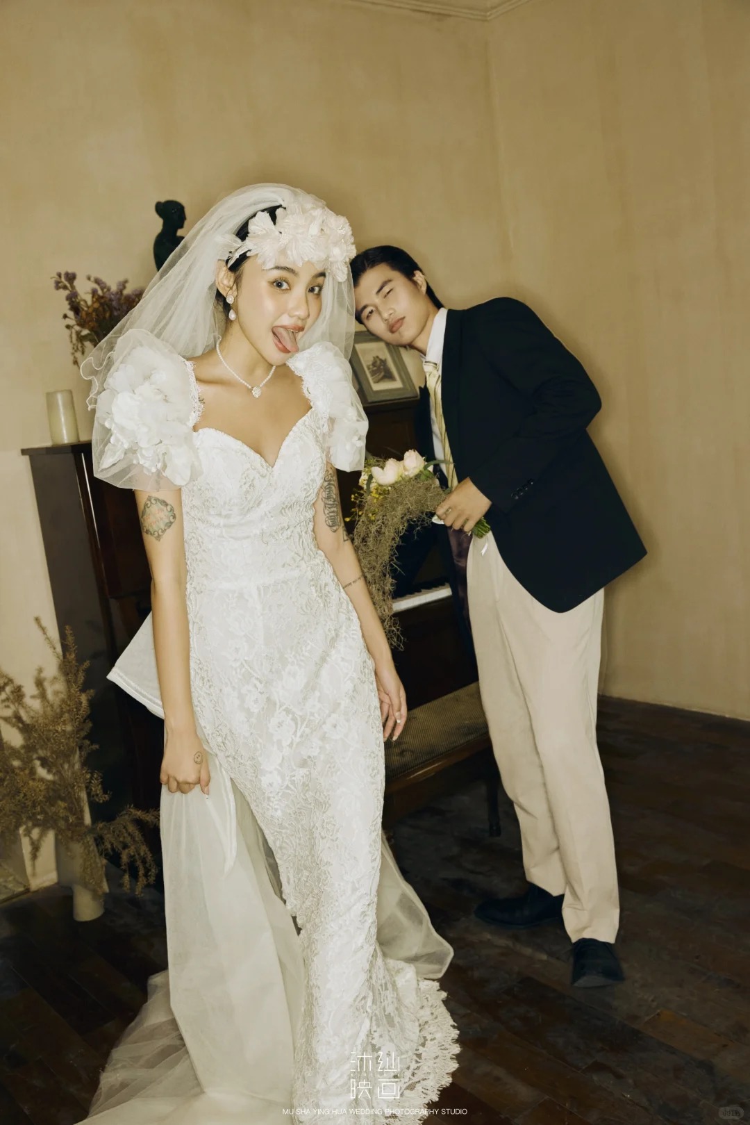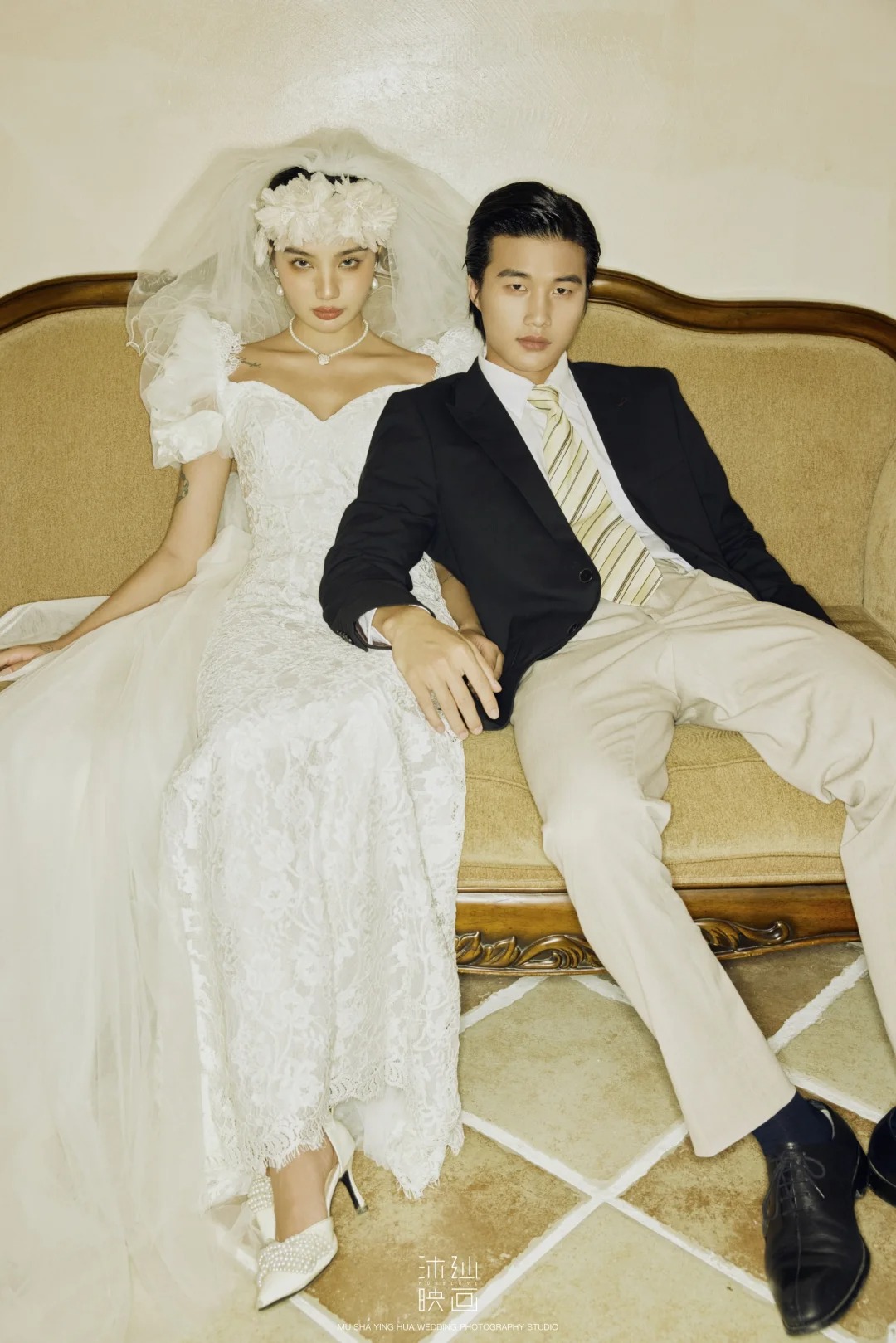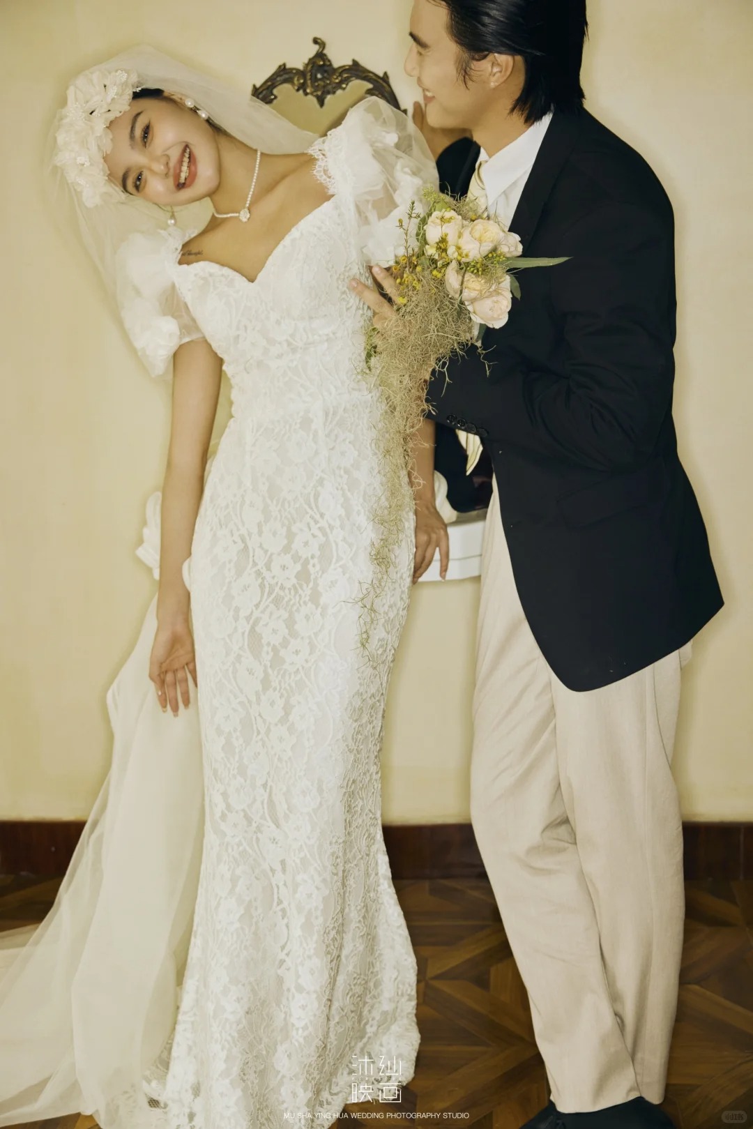 • -- 婚纱选了蕾丝鱼尾裙 立体花饰泡泡袖 复古又带点小性感💃 搭配花朵头纱 珍珠项链 氛围感直接拉满法式慵懒 ­-- 新郎黑西装 浅卡其裤 条纹领带 松弛感和复古感都拿捏了~ 暖黄光线裹着旧时光滤镜 每一帧都像翻旧相册📜#复古胶片婚纱照
