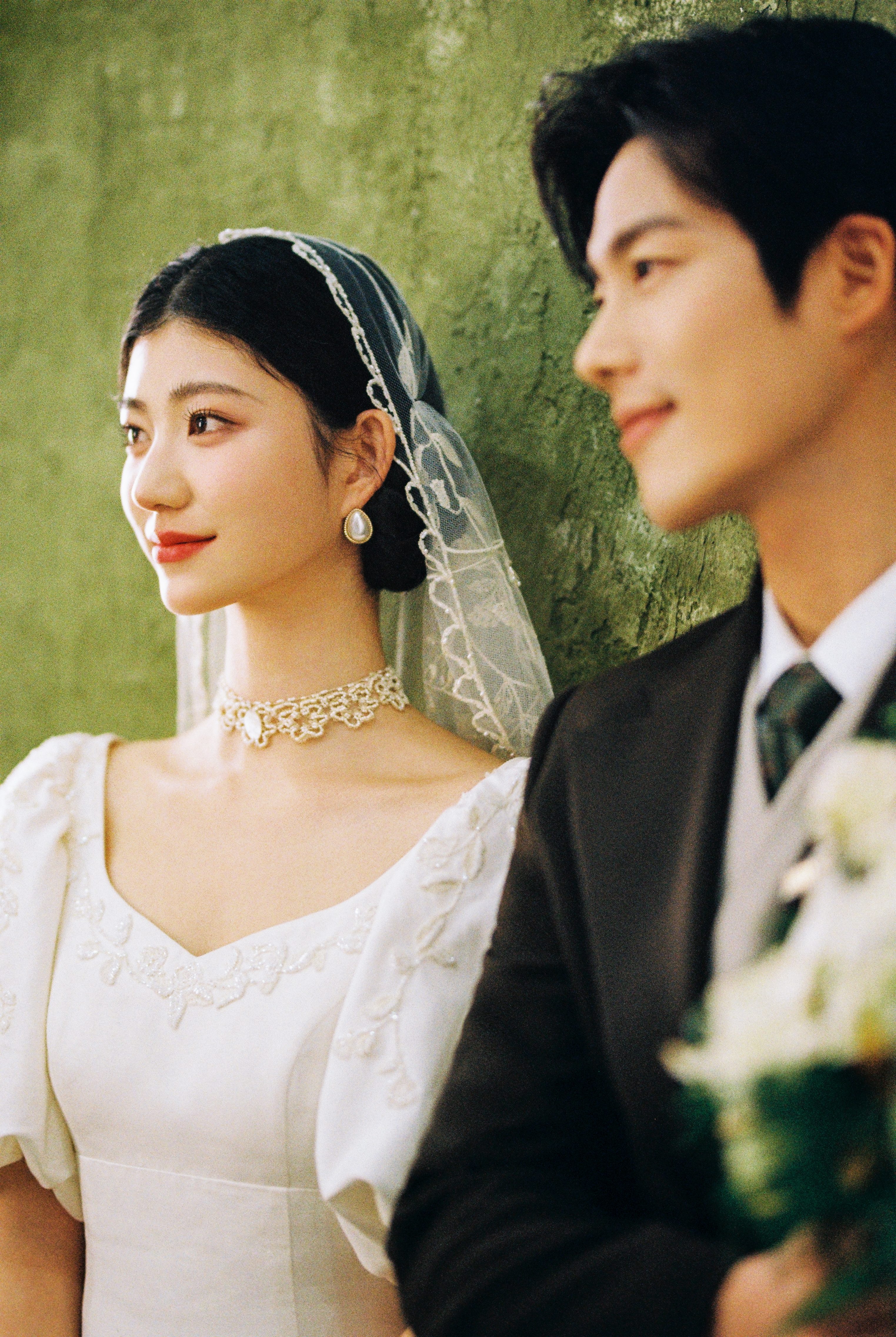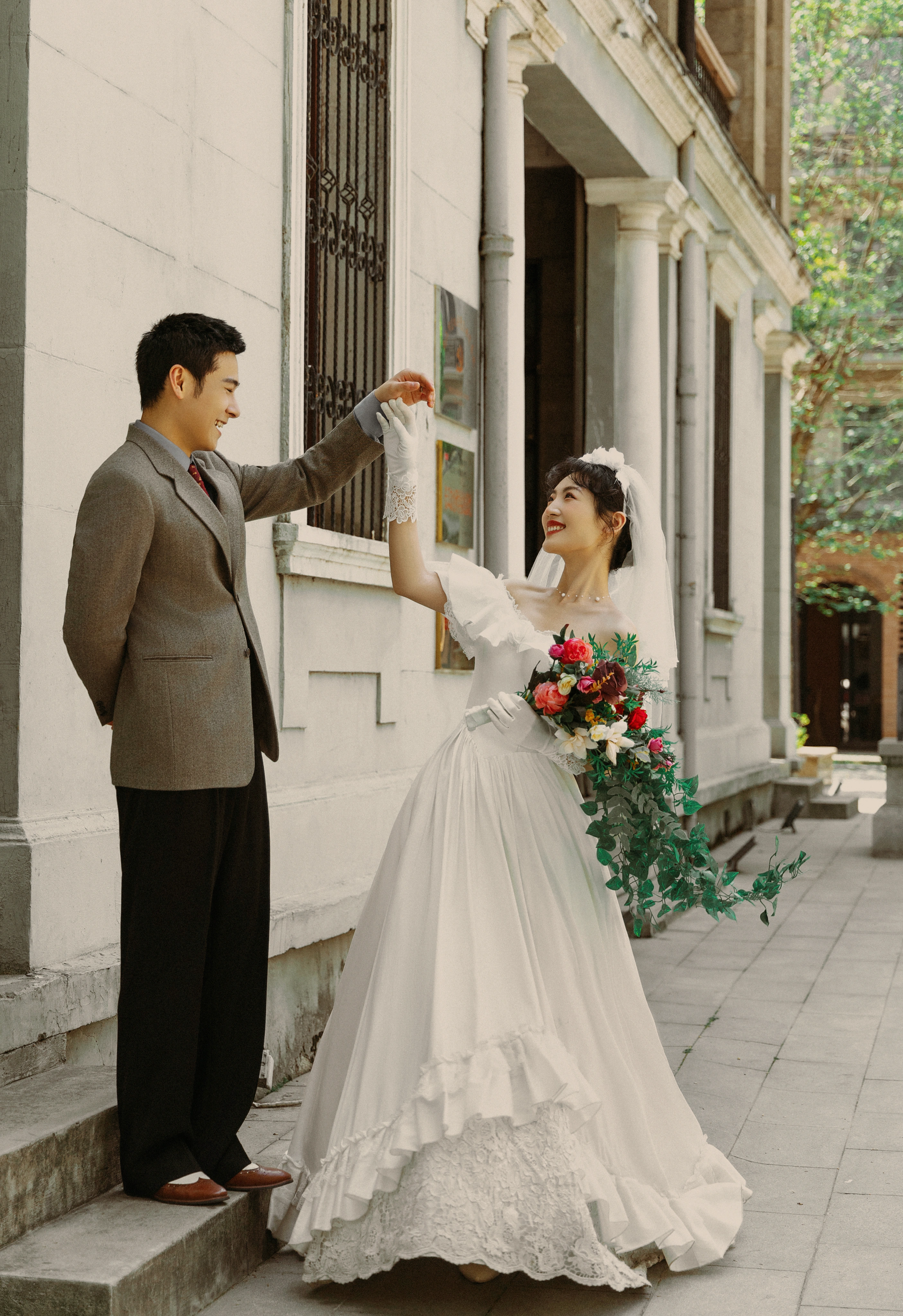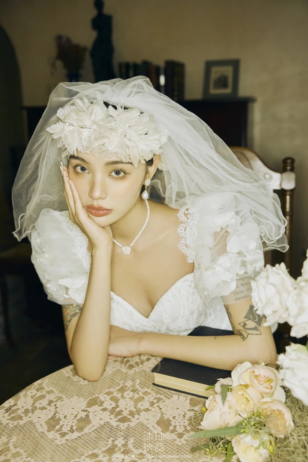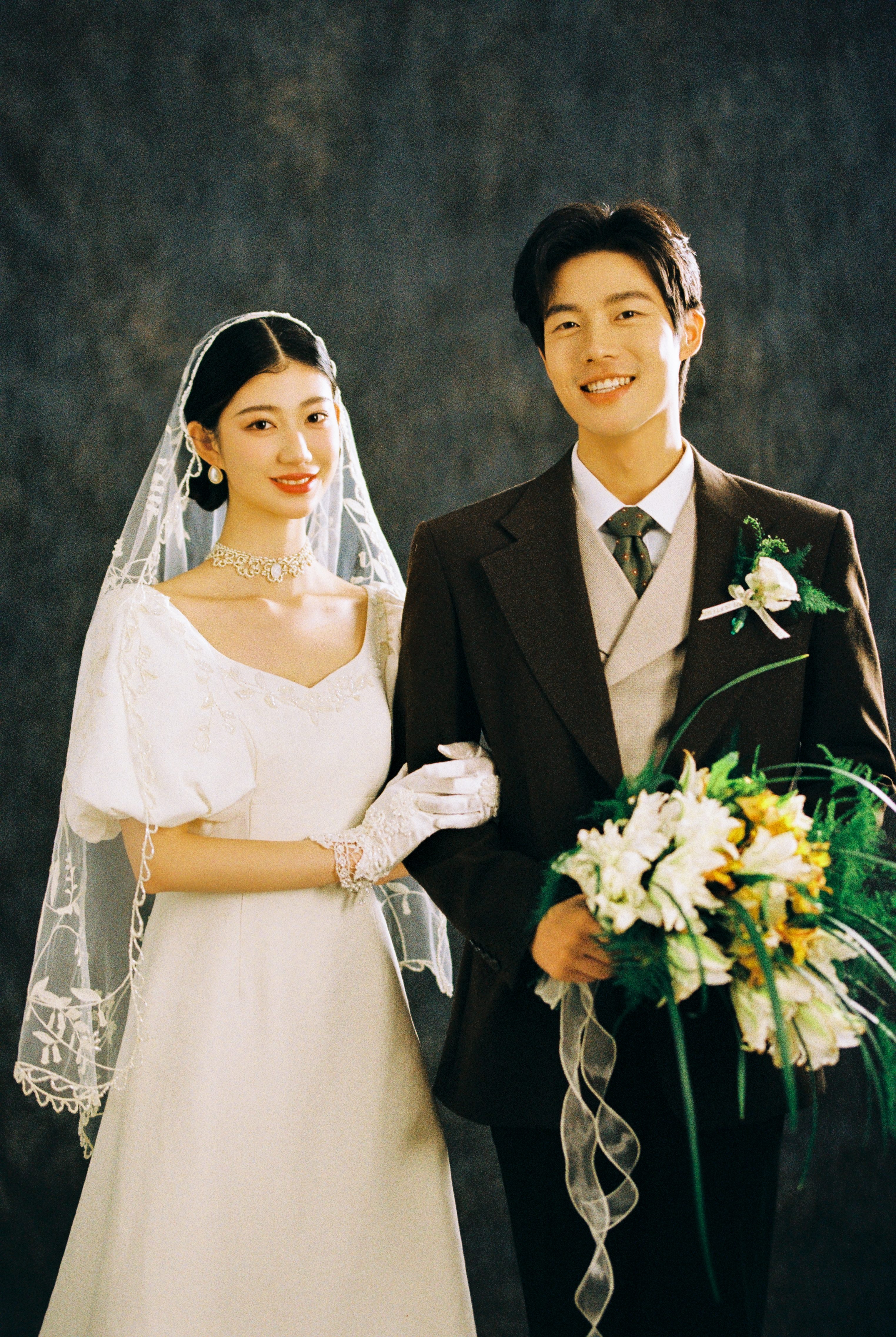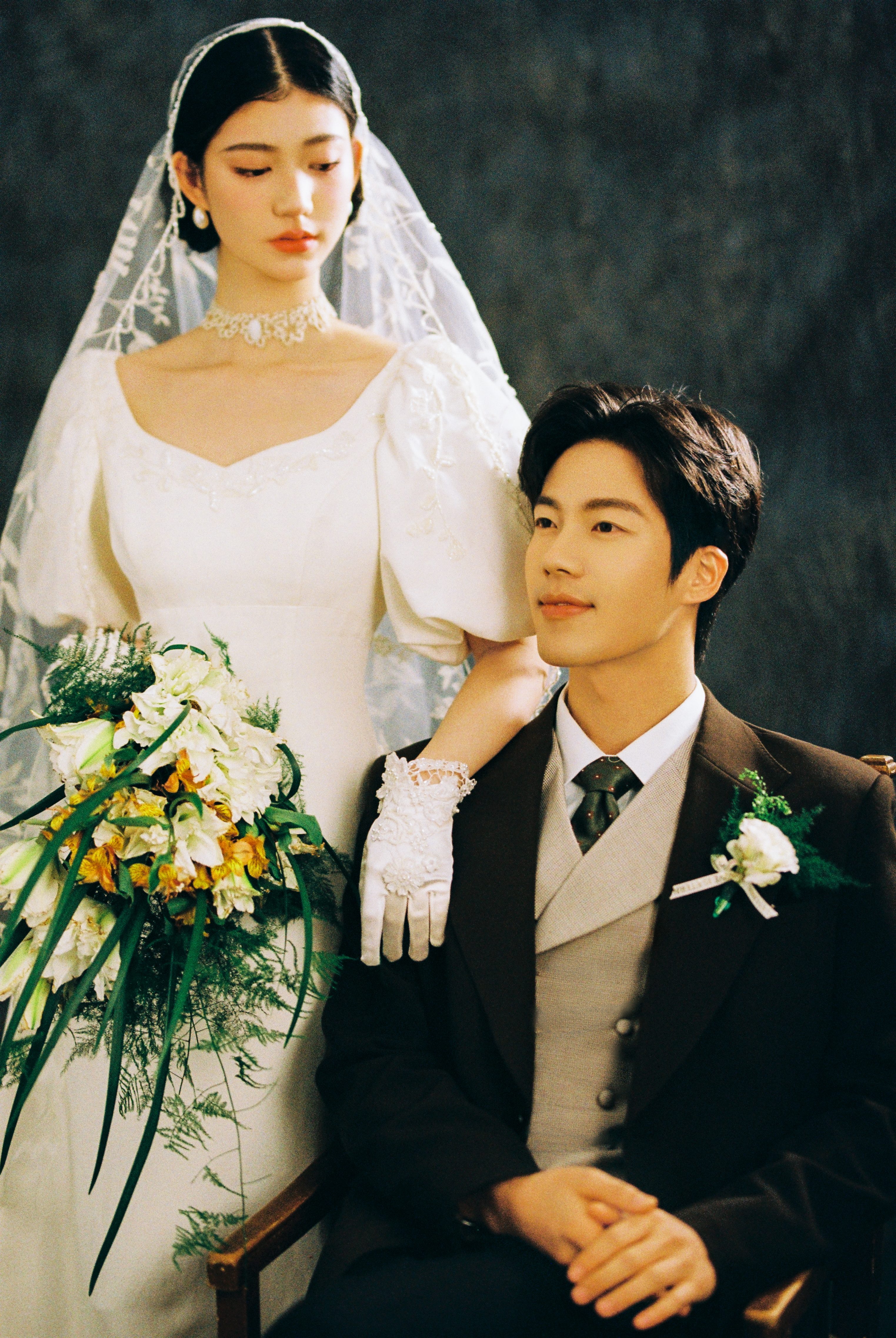 • -- 婚纱选了蕾丝鱼尾裙 立体花饰泡泡袖 复古又带点小性感💃 搭配花朵头纱 珍珠项链 氛围感直接拉满法式慵懒 ­-- 新郎黑西装 浅卡其裤 条纹领带 松弛感和复古感都拿捏了~ 暖黄光线裹着旧时光滤镜 每一帧都像翻旧相册📜#复古胶片婚纱照
