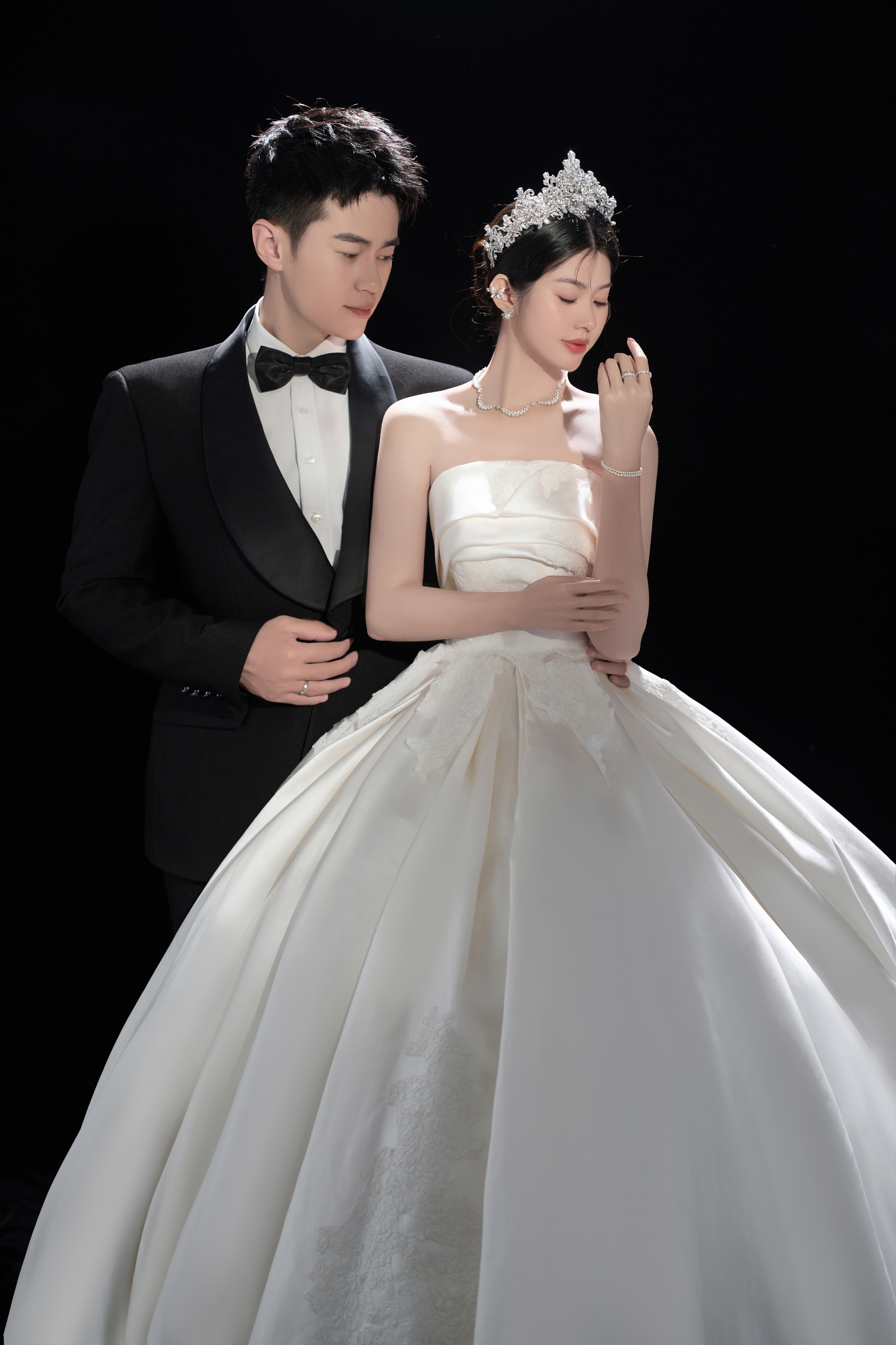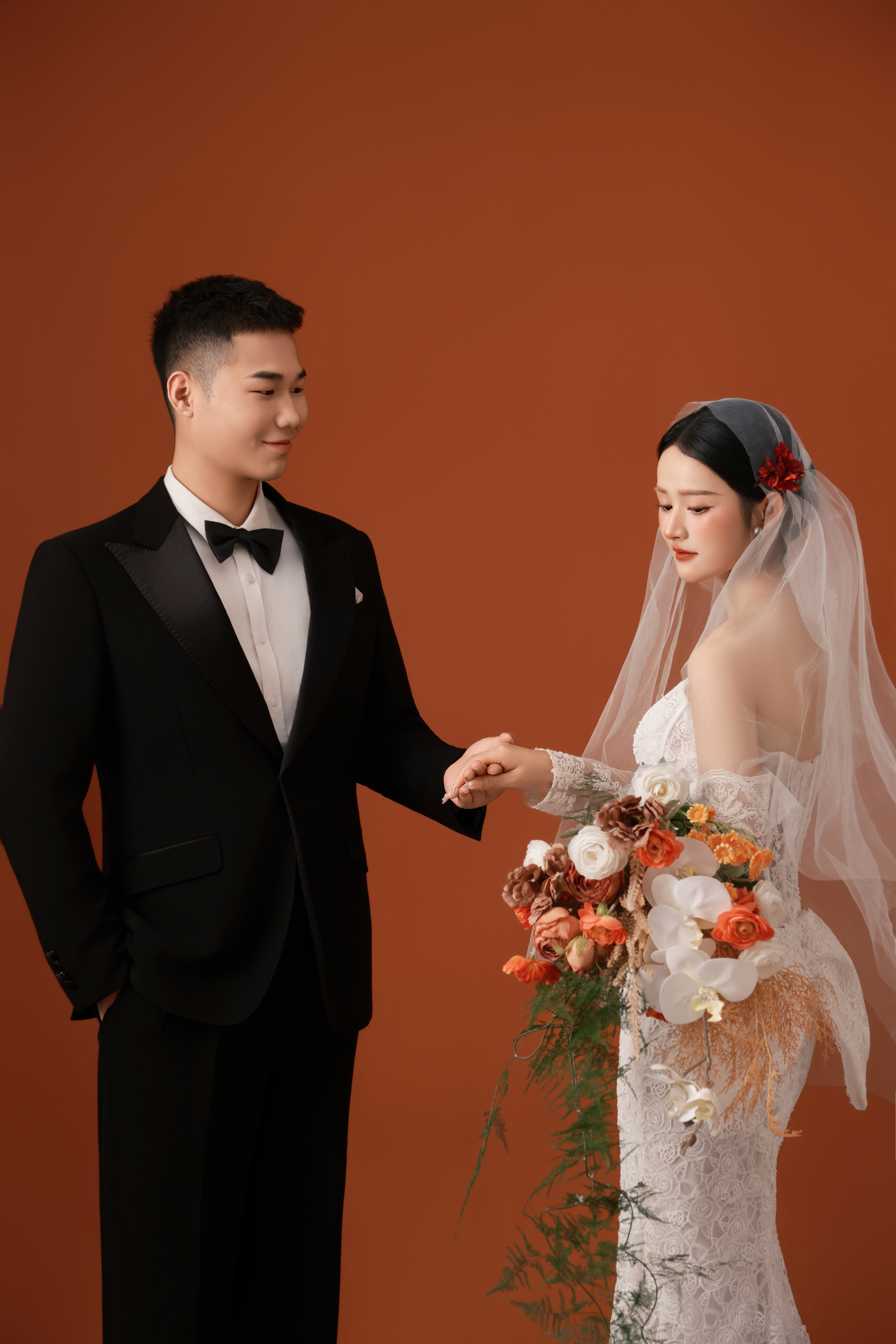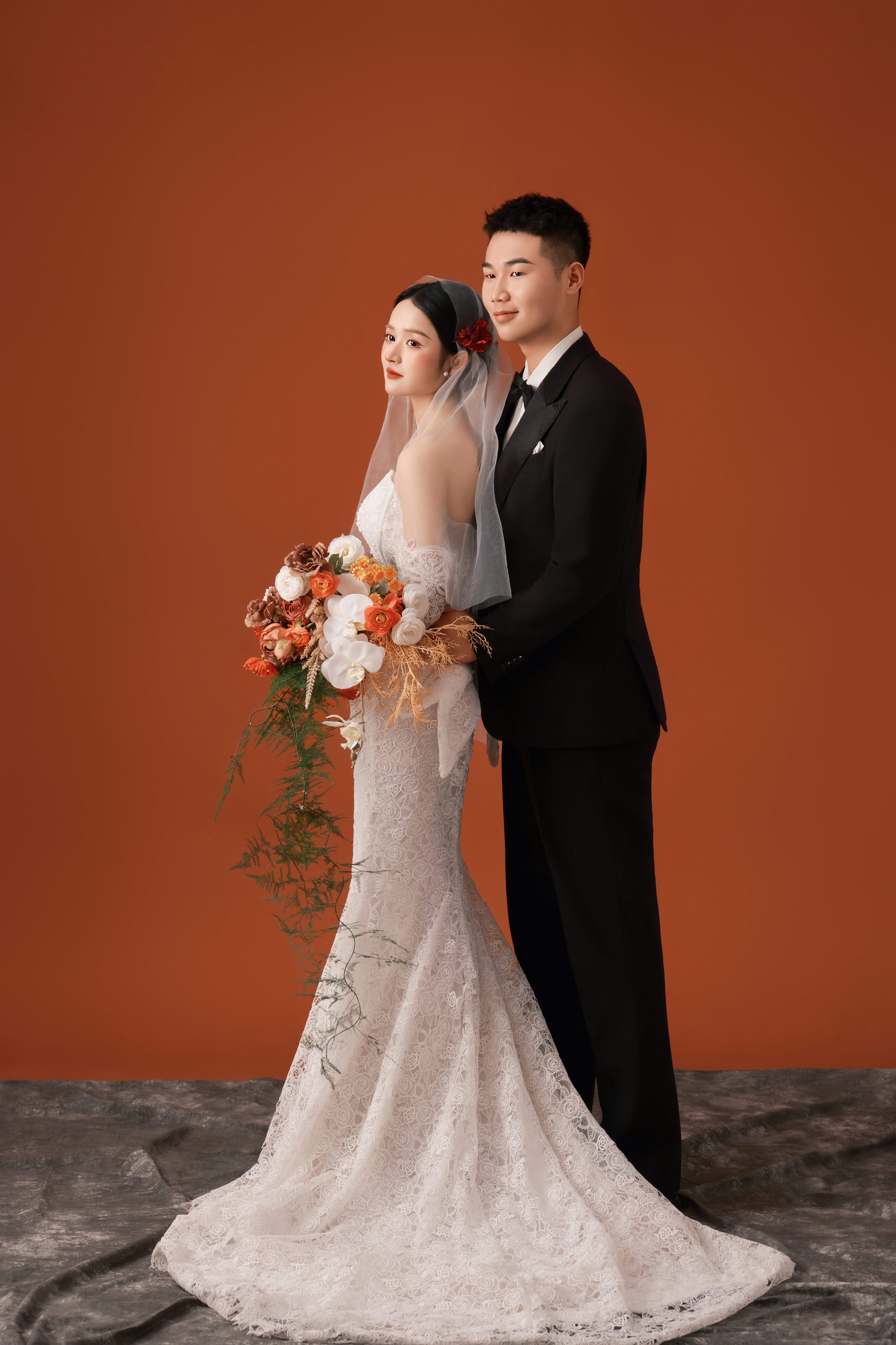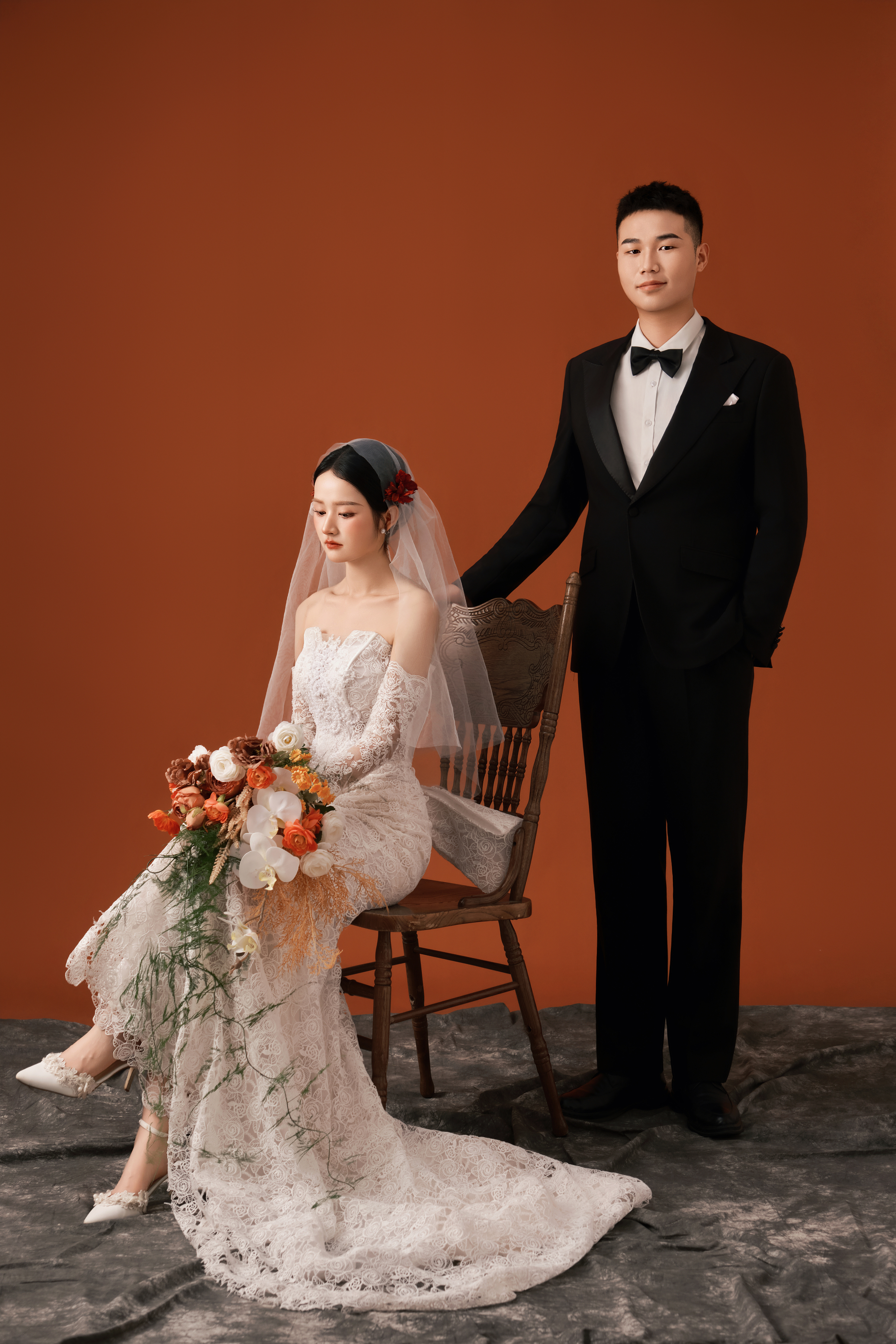 • -- 婚纱选了蕾丝鱼尾裙 立体花饰泡泡袖 复古又带点小性感💃 搭配花朵头纱 珍珠项链 氛围感直接拉满法式慵懒 ­-- 新郎黑西装 浅卡其裤 条纹领带 松弛感和复古感都拿捏了~ 暖黄光线裹着旧时光滤镜 每一帧都像翻旧相册📜#复古胶片婚纱照