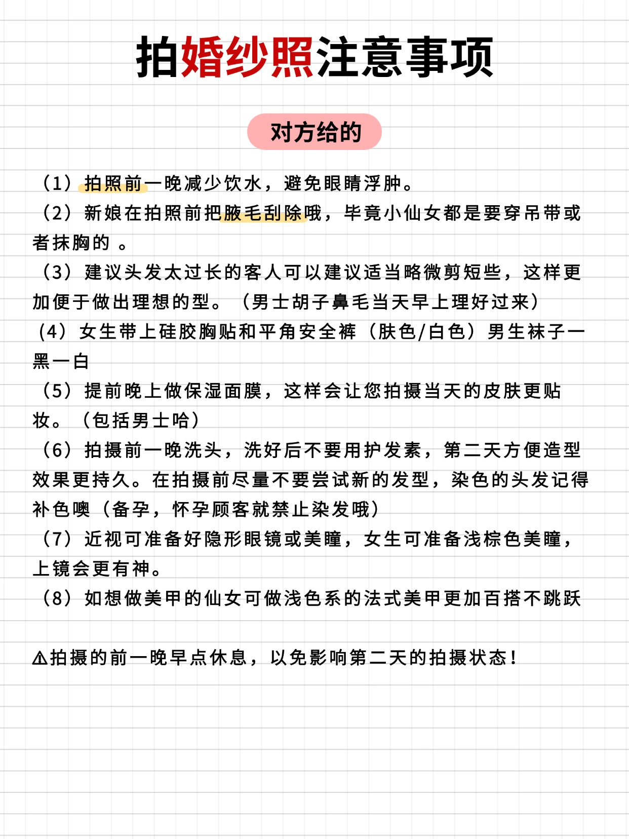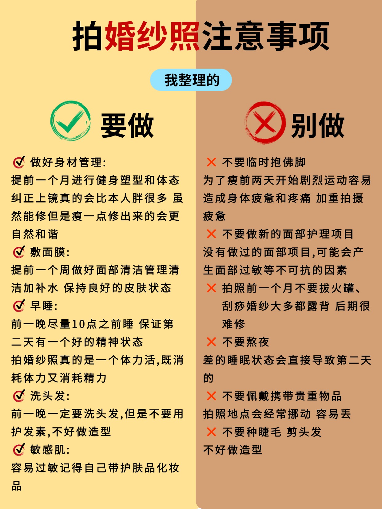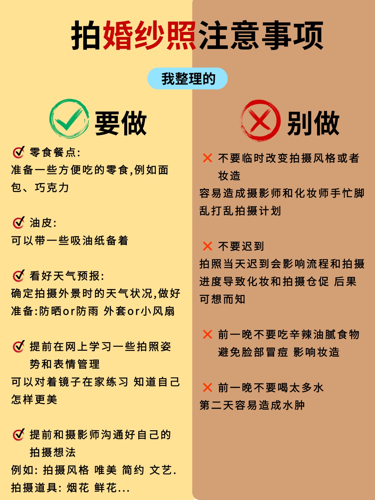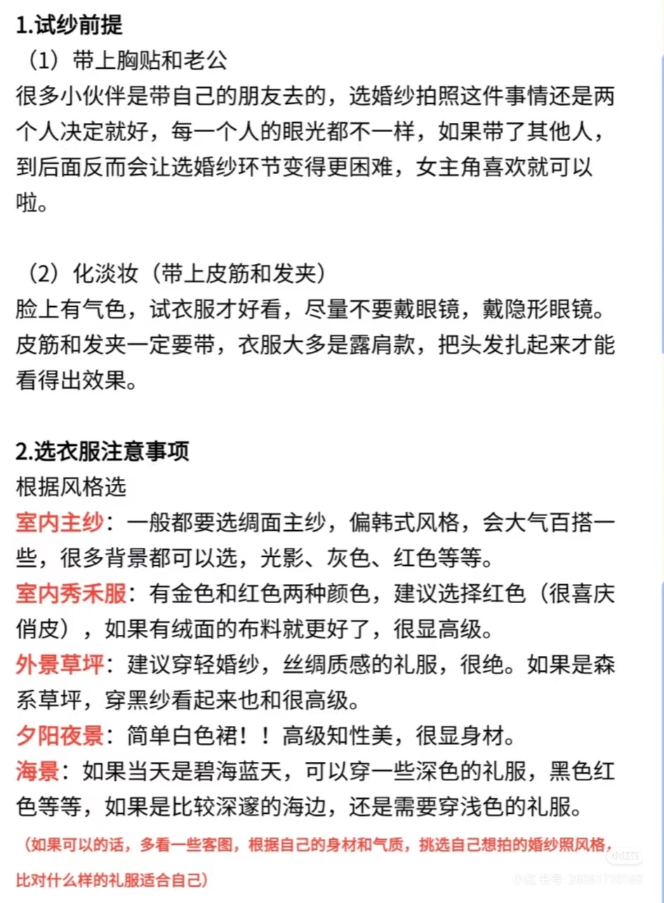 • 第一次拍婚纱照的姐妹收藏备用✨ 婚纱照对新人来说都是必要经历的事情,是美好的定格幸福的记录💗小编为大家整理了一些拍婚纱照的注意事项,希望照片都拍得美美哒✨ 👰🏻‍♀️女生专属准备清单: ✅ 形象管理:提前 1-2 周染统一发色(避免断层尴尬)、做简约美甲(裸色 / 法式最出片)、全身脱毛(穿吊带 / 鱼尾裙不社死) ✅ 上镜加分:自然款美瞳(放大双眼不突兀)、提前 3 天连续敷面膜(皮肤水当当卡粉不存在) ✅ 实用好物:隐形胸贴(比内衣更服帖)、肉色打底裤(防走光)、高倍防晒霜(户外拍摄不晒黑)、充电宝(补妆 + 拍照续命)、舒适拖鞋 + 磨脚贴(高跟鞋救星) 🤵🏻男生精致细节不能少: ✅ 形象打理:提前 1 周剪头发(避免过短显生硬)、刮胡子 + 修鼻毛(特写镜头无死角)、剪短指甲(牵手拍照不抢镜) ✅ 穿搭必备:黑白船袜(适配不同鞋子)、同色系皮带(避免裤腰松动)、自带水杯(拍摄累了及时补水) ✅ 皮肤护理:简单做个面部清洁(上妆更服帖,告别大油田) 🙆🏻‍♀️拍前必做的加分项: ✔️ 提前 2 周身材管理(清淡饮食 + 轻度运动,线条更上镜) ✔️ 拍摄前 1 晚:洗干净头发(不打护发素方便做造型)、敷补水面膜、早睡不熬夜(告别黑眼圈眼袋) ✔️ 准备小零食(巧克力 / 能量棒,拍摄间隙补充体力) ✔️ 提前看天气预报(避开雨天,户外拍摄更顺利) ✔️ 学拍照姿势(收藏 3-5 组喜欢的风格,跟摄影师高效沟通) ✔️ 跟对象一起练习微笑 + 眼神互动(避免拍摄时表情僵硬) 🙅🏻‍♀️这些坑千万别踩! ❌ 临时抱佛脚:别等到前 1 天再减肥 / 护肤,效果甚微还焦虑 ❌ 错误操作:拍摄前别拔火罐(留印子遮不住)、别种过长睫毛(容易压眼显凶)、别乱换护肤品(避免过敏爆痘) ❌ 行程混乱:别临时改拍摄时间 / 妆造(团队衔接容易出错)、千万别迟到(影响拍摄进度还慌神) ❌ 饮食禁忌:拍摄前 1 天别吃辛辣 / 过咸食物(避免水肿 + 长痘) 备婚的姐妹赶紧收藏起来📩 转发给对象一起准备!祝大家都能拍出甜度超标的婚纱照,定格最美的幸福瞬间呀💕#婚纱照拍摄注意事项