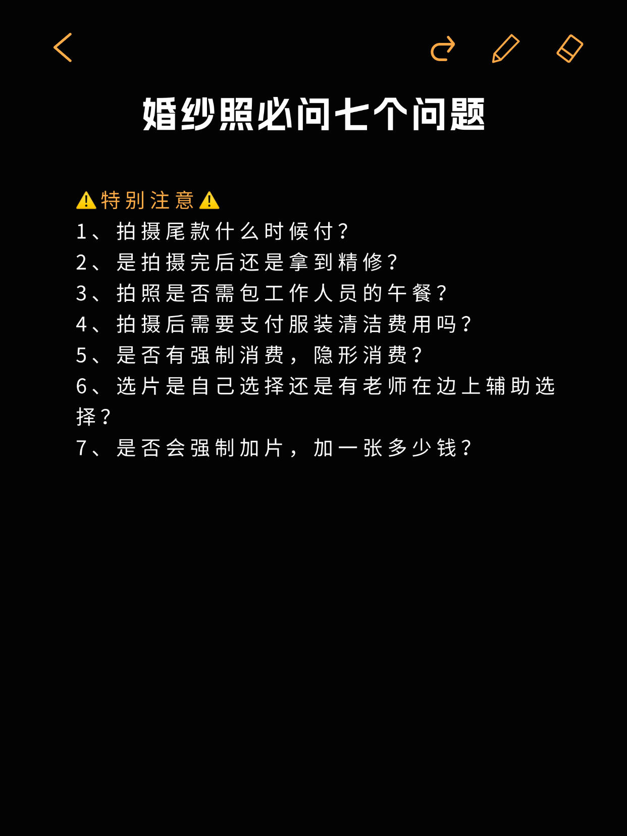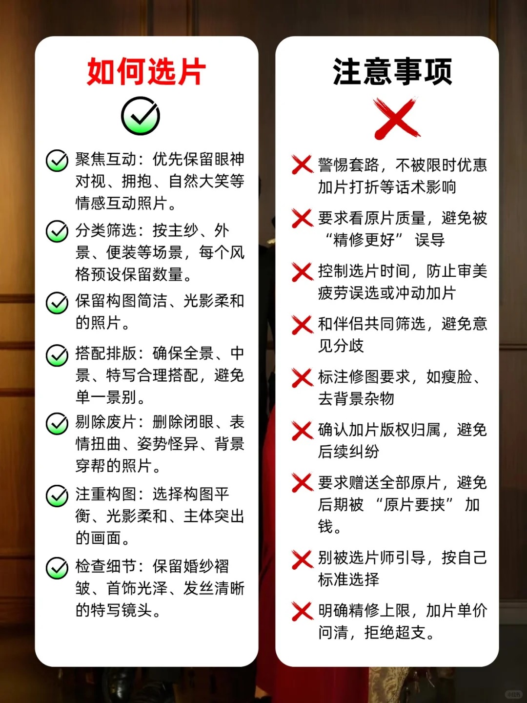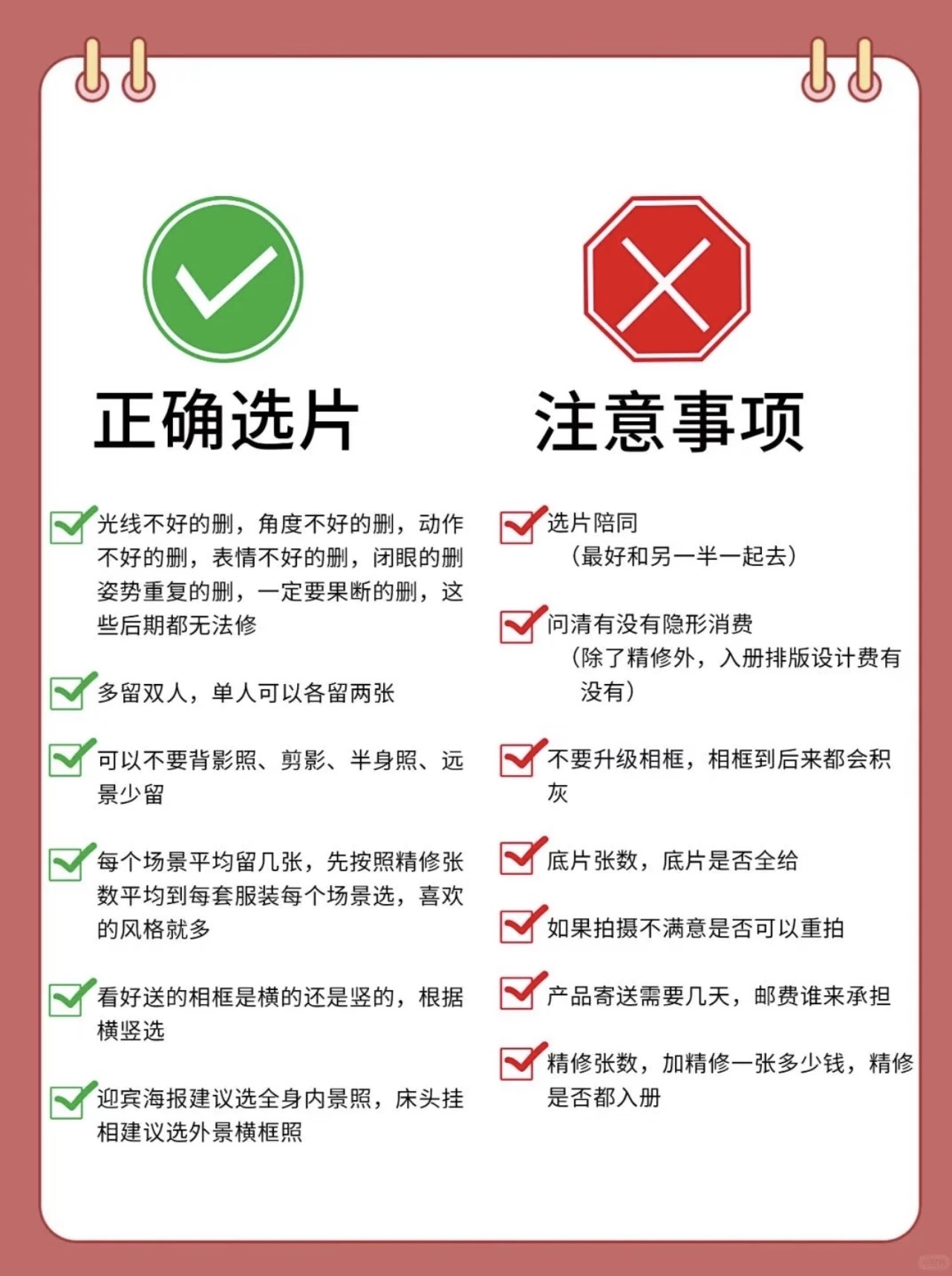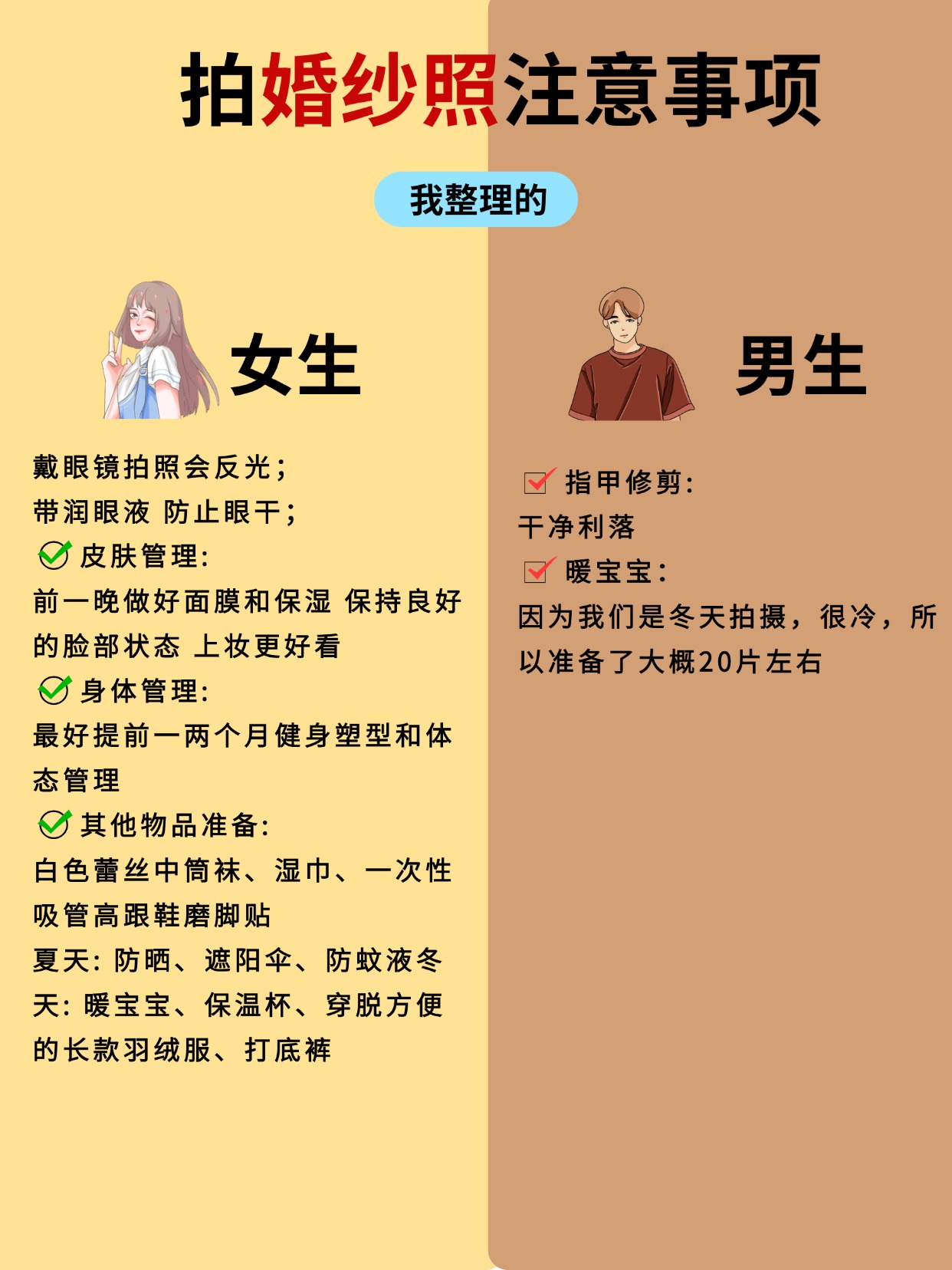 • 第一次拍婚纱照的姐妹收藏备用✨ 婚纱照对新人来说都是必要经历的事情,是美好的定格幸福的记录💗小编为大家整理了一些拍婚纱照的注意事项,希望照片都拍得美美哒✨ 👰🏻‍♀️女生专属准备清单: ✅ 形象管理:提前 1-2 周染统一发色(避免断层尴尬)、做简约美甲(裸色 / 法式最出片)、全身脱毛(穿吊带 / 鱼尾裙不社死) ✅ 上镜加分:自然款美瞳(放大双眼不突兀)、提前 3 天连续敷面膜(皮肤水当当卡粉不存在) ✅ 实用好物:隐形胸贴(比内衣更服帖)、肉色打底裤(防走光)、高倍防晒霜(户外拍摄不晒黑)、充电宝(补妆 + 拍照续命)、舒适拖鞋 + 磨脚贴(高跟鞋救星) 🤵🏻男生精致细节不能少: ✅ 形象打理:提前 1 周剪头发(避免过短显生硬)、刮胡子 + 修鼻毛(特写镜头无死角)、剪短指甲(牵手拍照不抢镜) ✅ 穿搭必备:黑白船袜(适配不同鞋子)、同色系皮带(避免裤腰松动)、自带水杯(拍摄累了及时补水) ✅ 皮肤护理:简单做个面部清洁(上妆更服帖,告别大油田) 🙆🏻‍♀️拍前必做的加分项: ✔️ 提前 2 周身材管理(清淡饮食 + 轻度运动,线条更上镜) ✔️ 拍摄前 1 晚:洗干净头发(不打护发素方便做造型)、敷补水面膜、早睡不熬夜(告别黑眼圈眼袋) ✔️ 准备小零食(巧克力 / 能量棒,拍摄间隙补充体力) ✔️ 提前看天气预报(避开雨天,户外拍摄更顺利) ✔️ 学拍照姿势(收藏 3-5 组喜欢的风格,跟摄影师高效沟通) ✔️ 跟对象一起练习微笑 + 眼神互动(避免拍摄时表情僵硬) 🙅🏻‍♀️这些坑千万别踩! ❌ 临时抱佛脚:别等到前 1 天再减肥 / 护肤,效果甚微还焦虑 ❌ 错误操作:拍摄前别拔火罐(留印子遮不住)、别种过长睫毛(容易压眼显凶)、别乱换护肤品(避免过敏爆痘) ❌ 行程混乱:别临时改拍摄时间 / 妆造(团队衔接容易出错)、千万别迟到(影响拍摄进度还慌神) ❌ 饮食禁忌:拍摄前 1 天别吃辛辣 / 过咸食物(避免水肿 + 长痘) 备婚的姐妹赶紧收藏起来📩 转发给对象一起准备!祝大家都能拍出甜度超标的婚纱照,定格最美的幸福瞬间呀💕#婚纱照拍摄注意事项