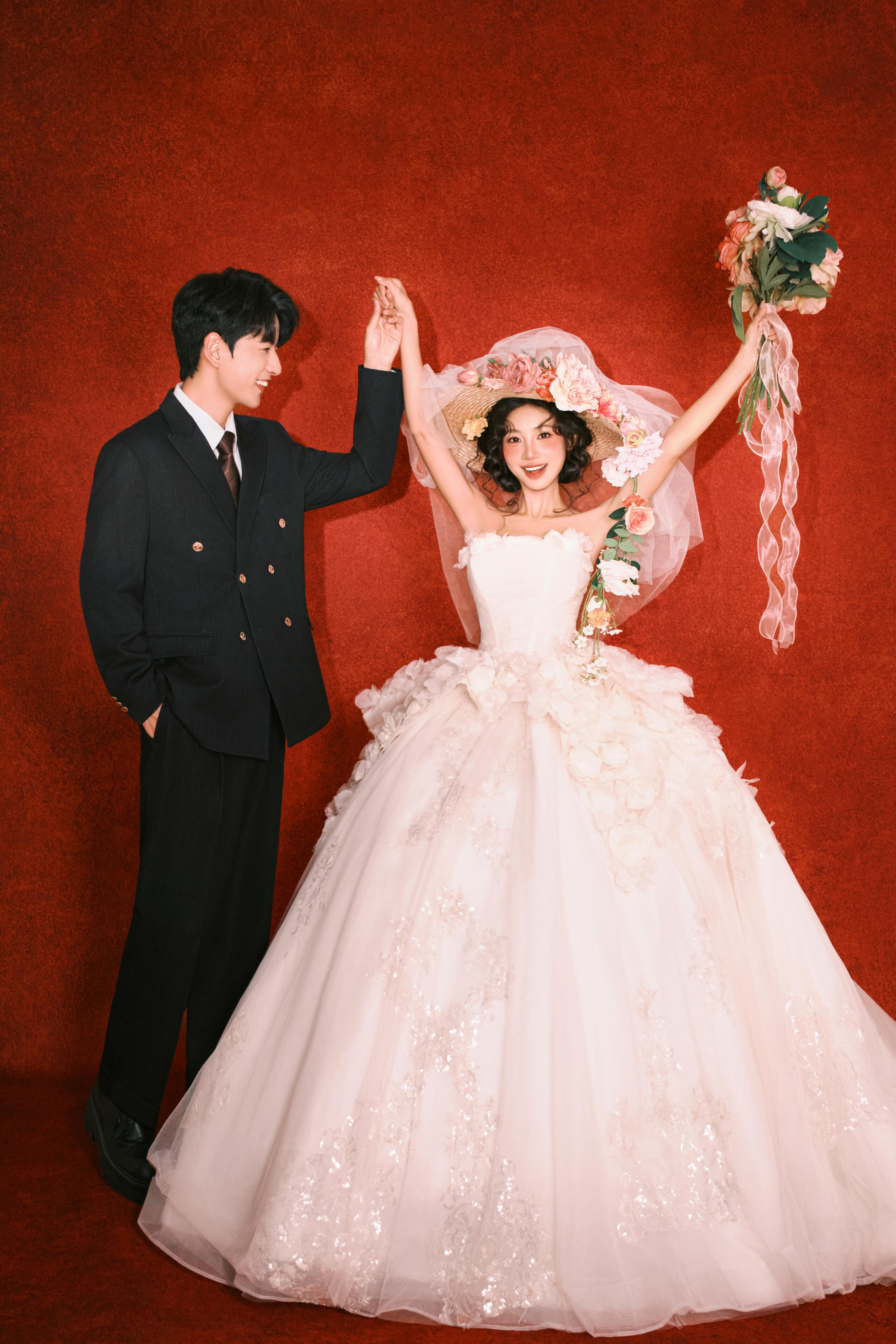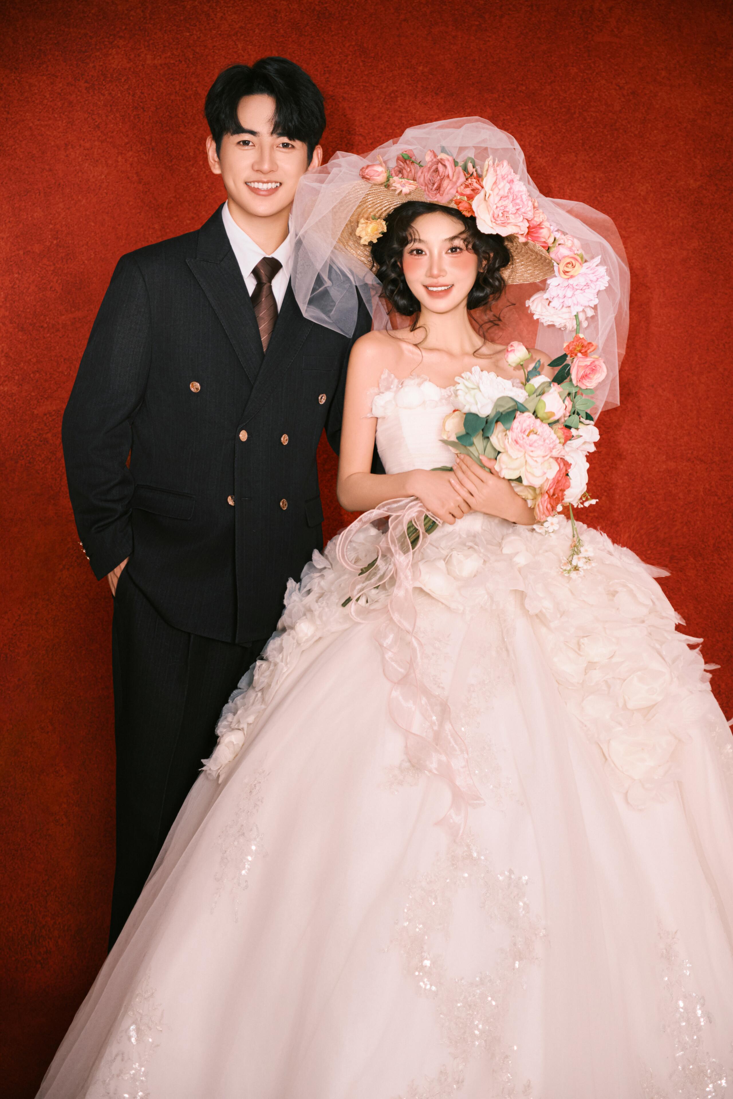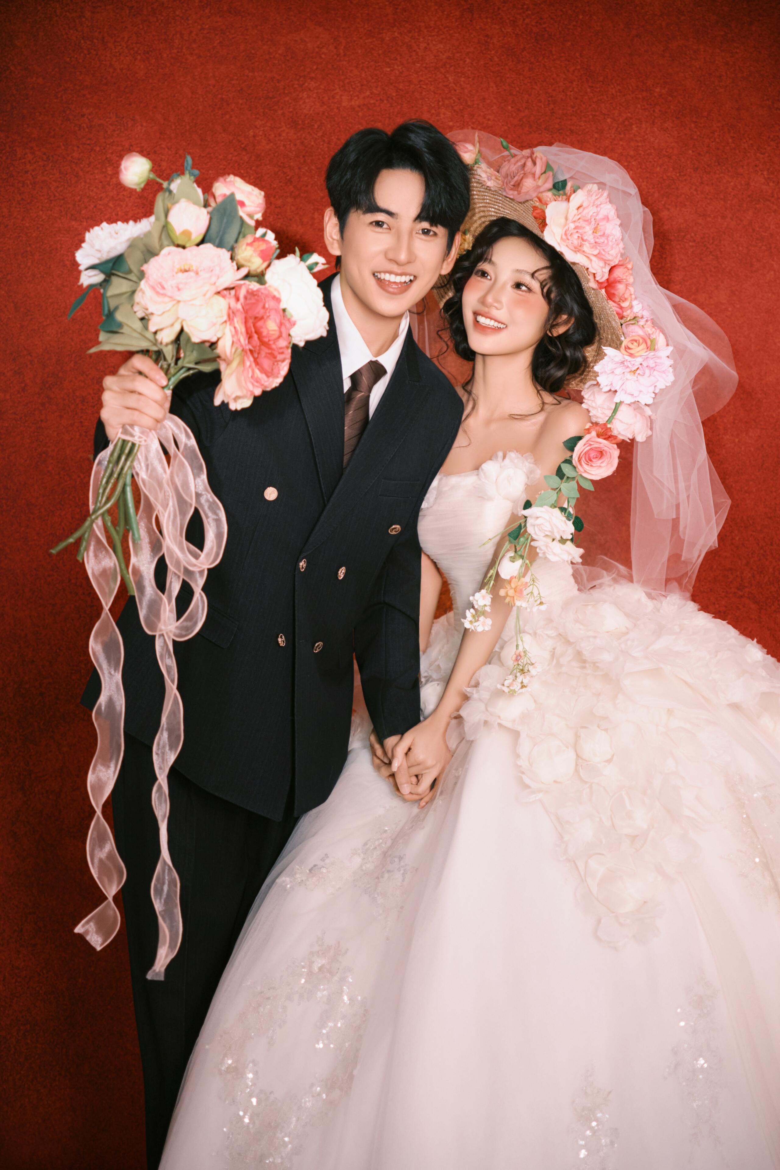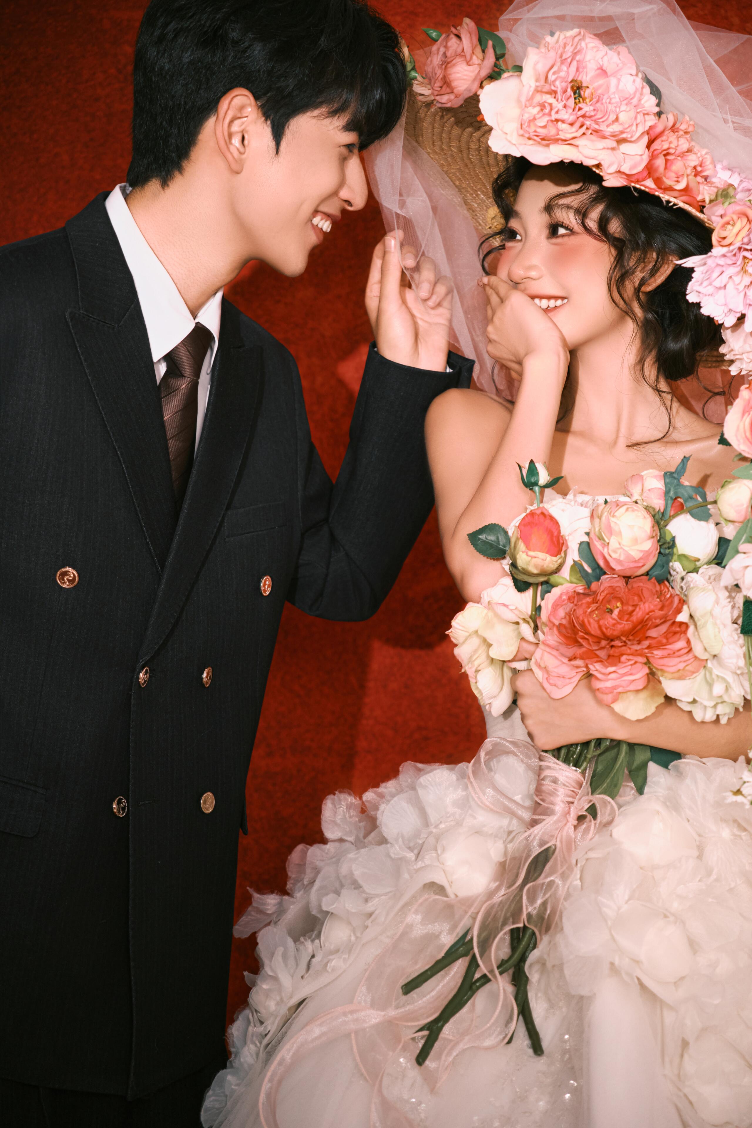 • #韩式花房婚纱照 轻氧森系婚纱照谁拍谁好看👀 花艺混了红玫与白瓣,暗调布景里更显柔媚; 互动是轻靠、浅笑的松弛瞬间,每帧都裹着朦胧柔光 甜得刚好