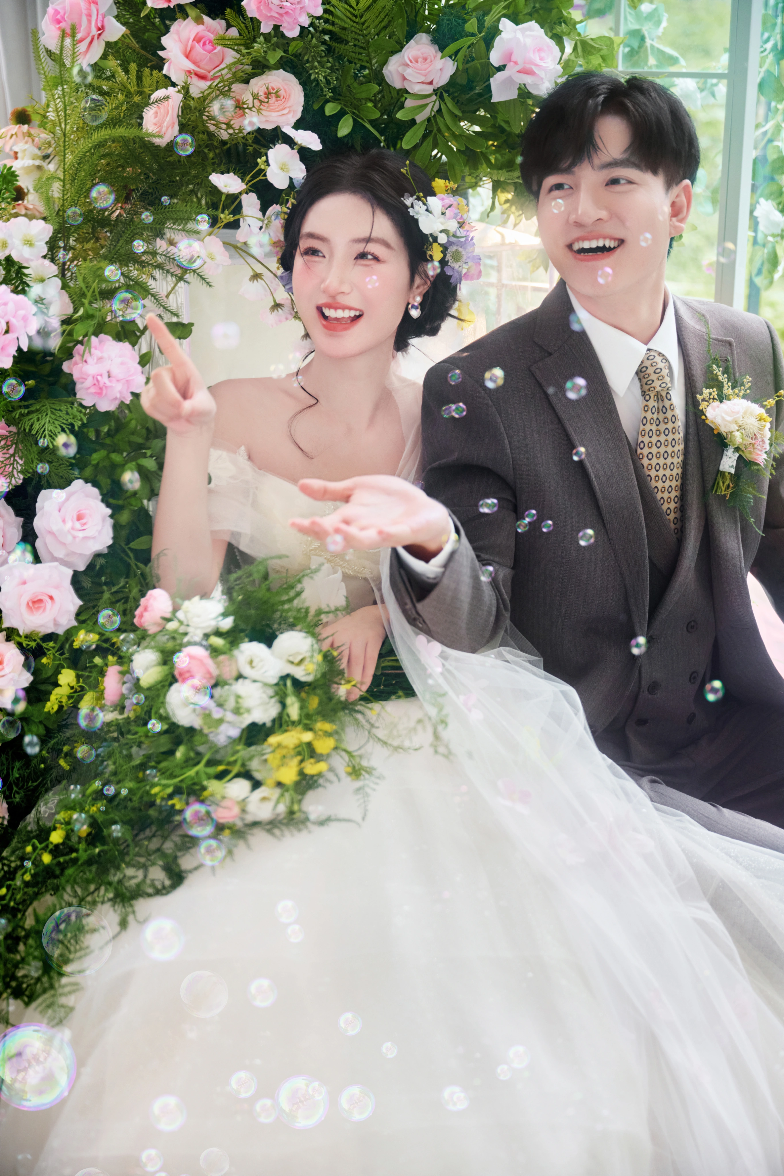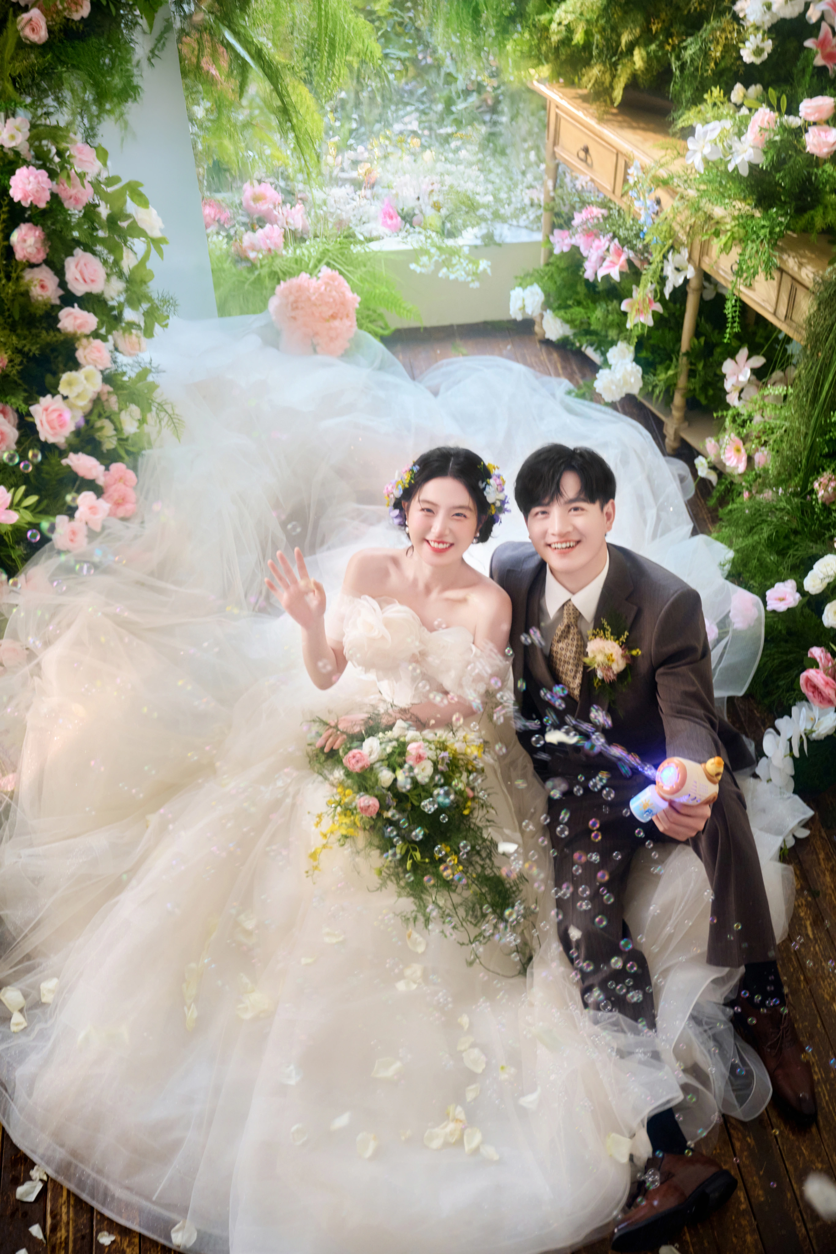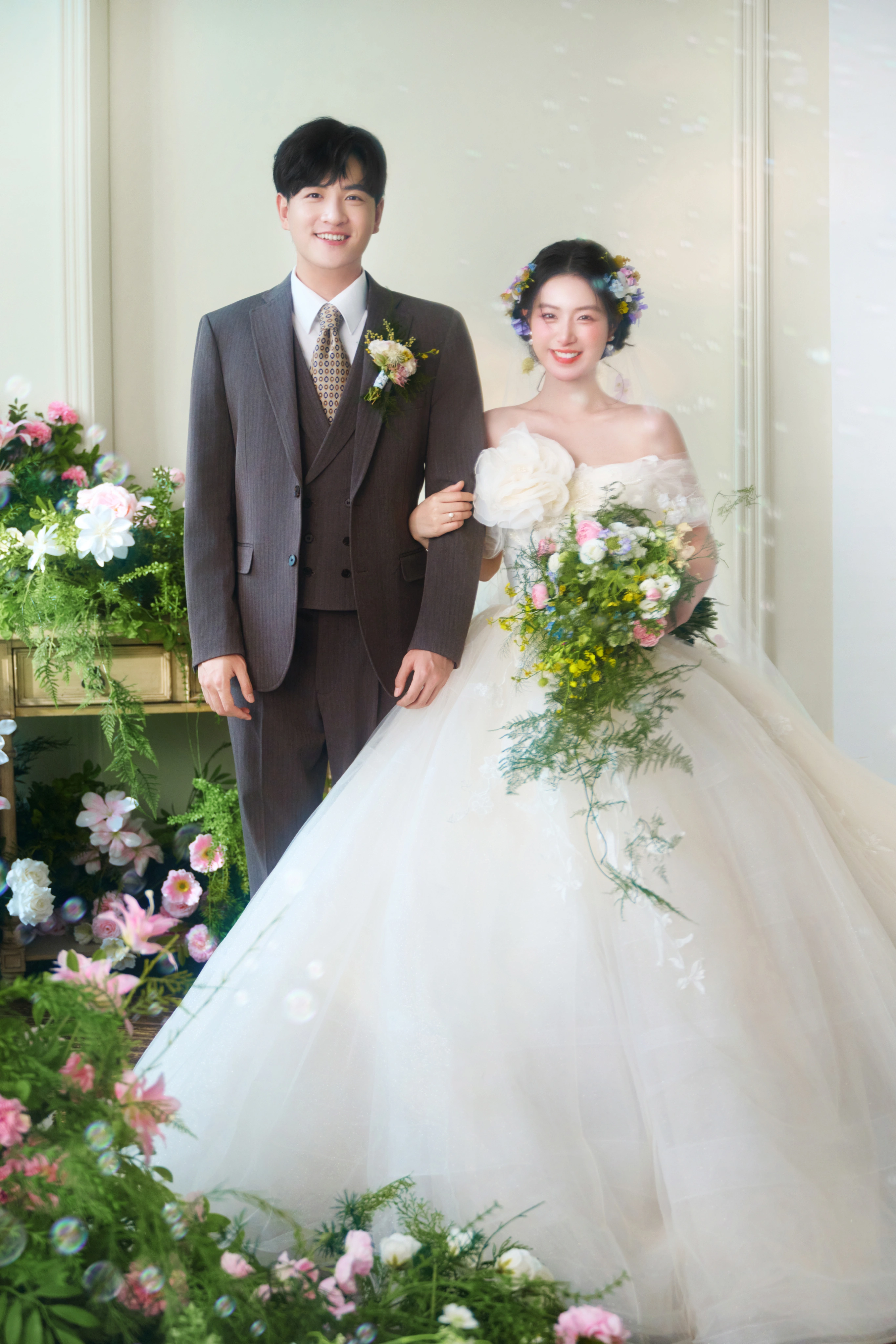 • 谁能拒绝满是鲜花和泡泡的婚纱照啊! - 奶白色花苞裙+碎花发饰🌿 像从春日花房里跑出来的甜妹✨ 他穿灰西装举着泡泡机 互动时的笑直接把“热恋感”焊在镜头里~ 满屏的粉花+透明泡泡🌸 每一帧都像《青春爱情剧》的剧照!#韩式花房婚纱照