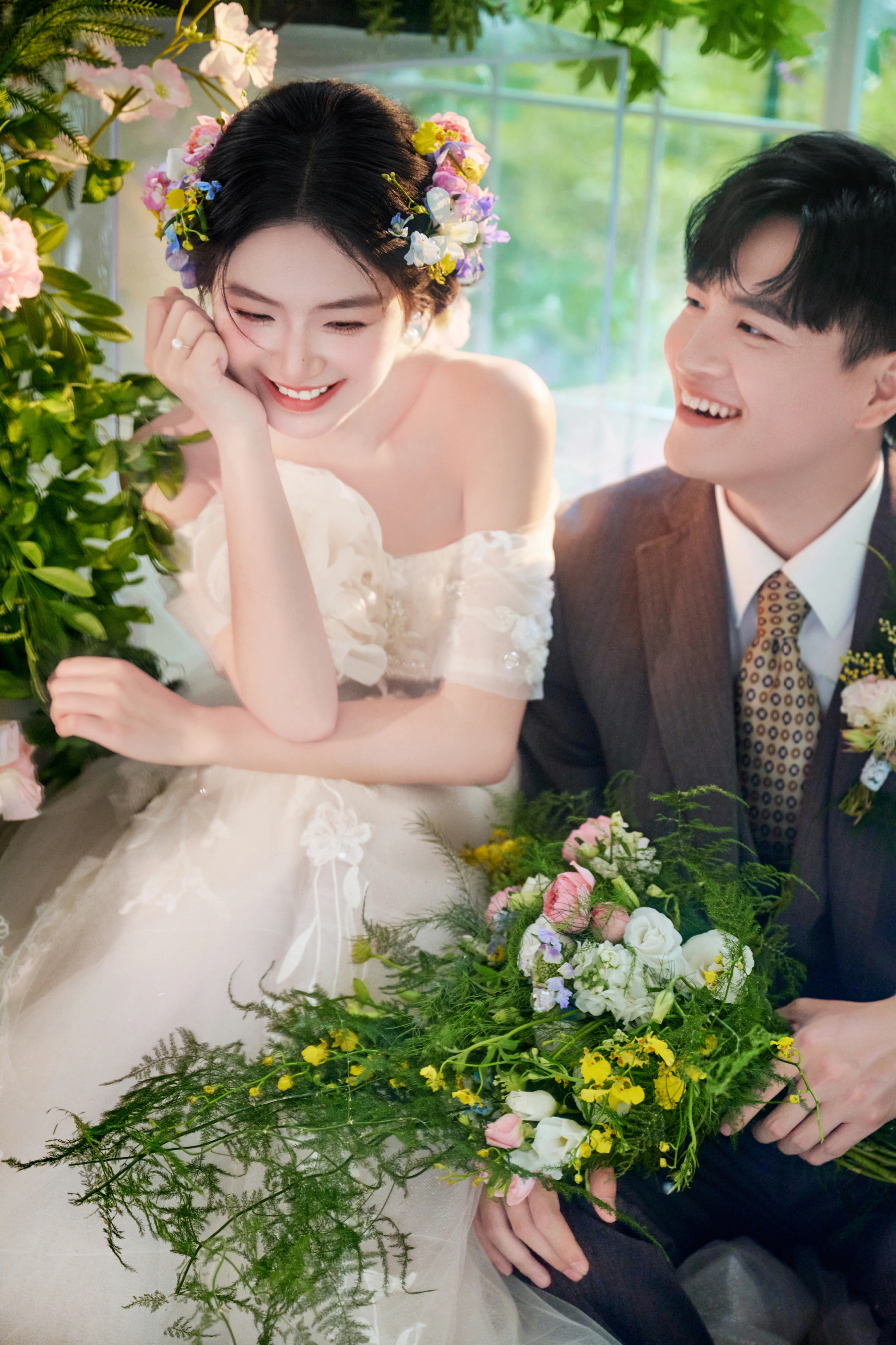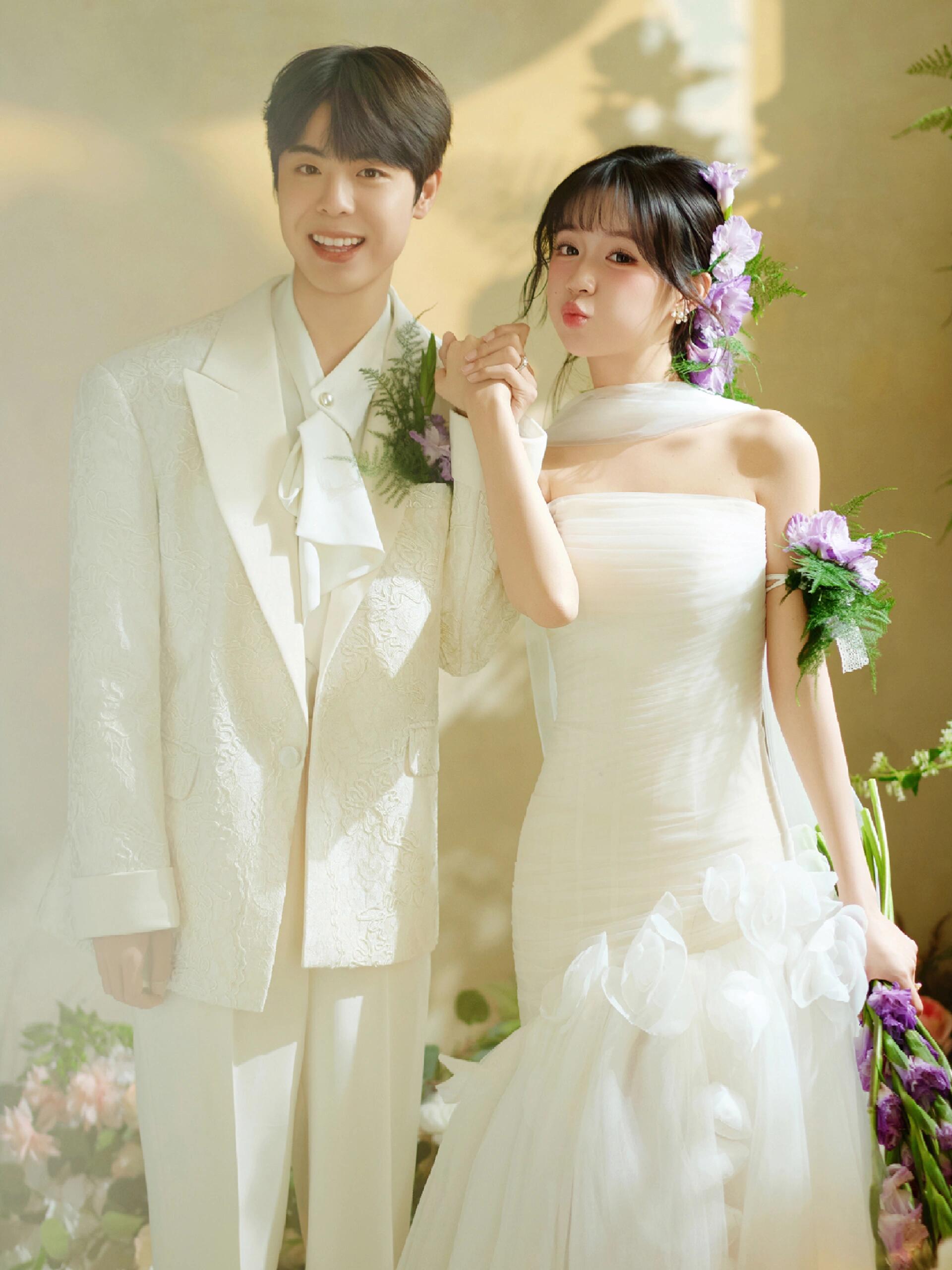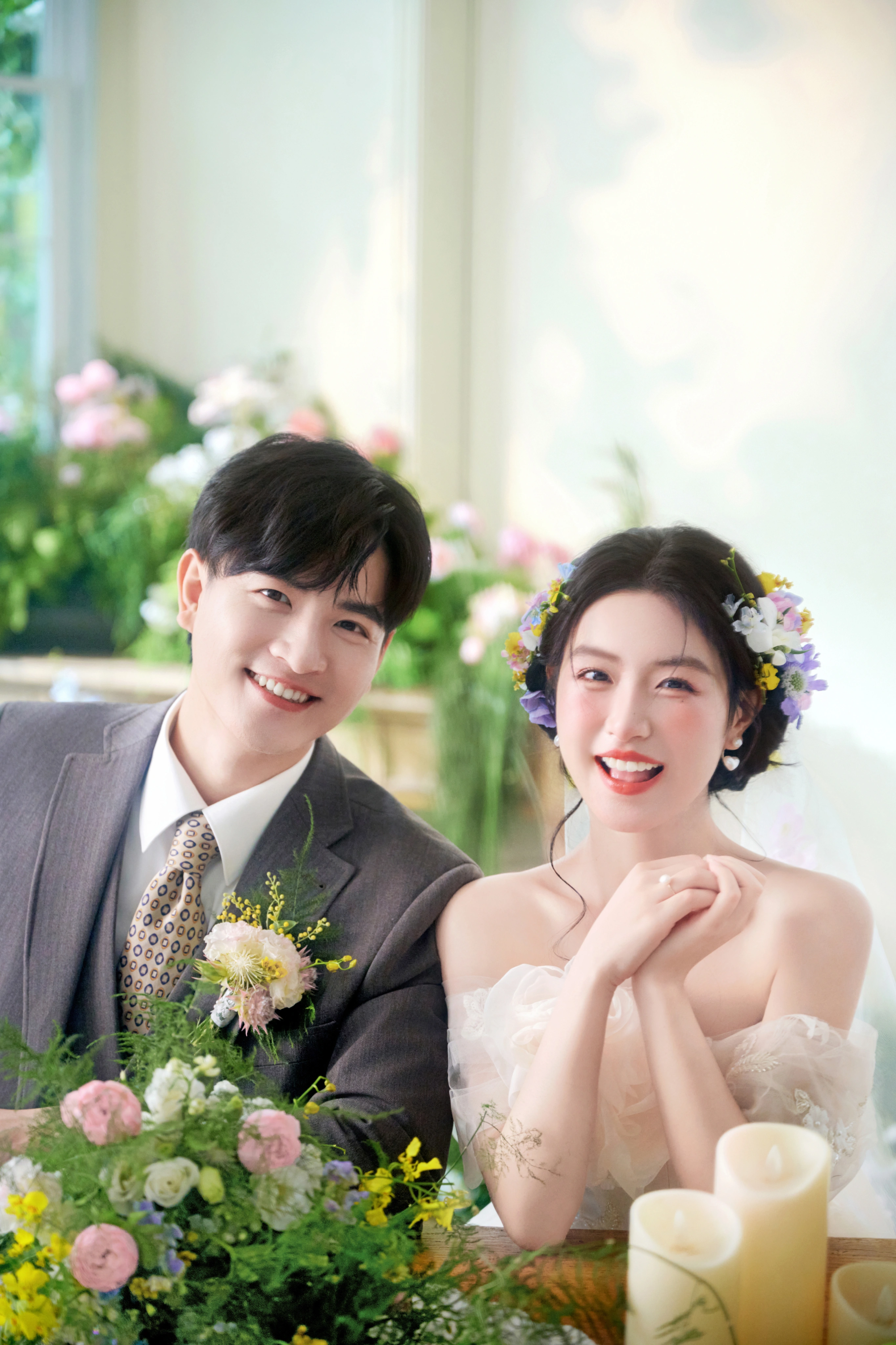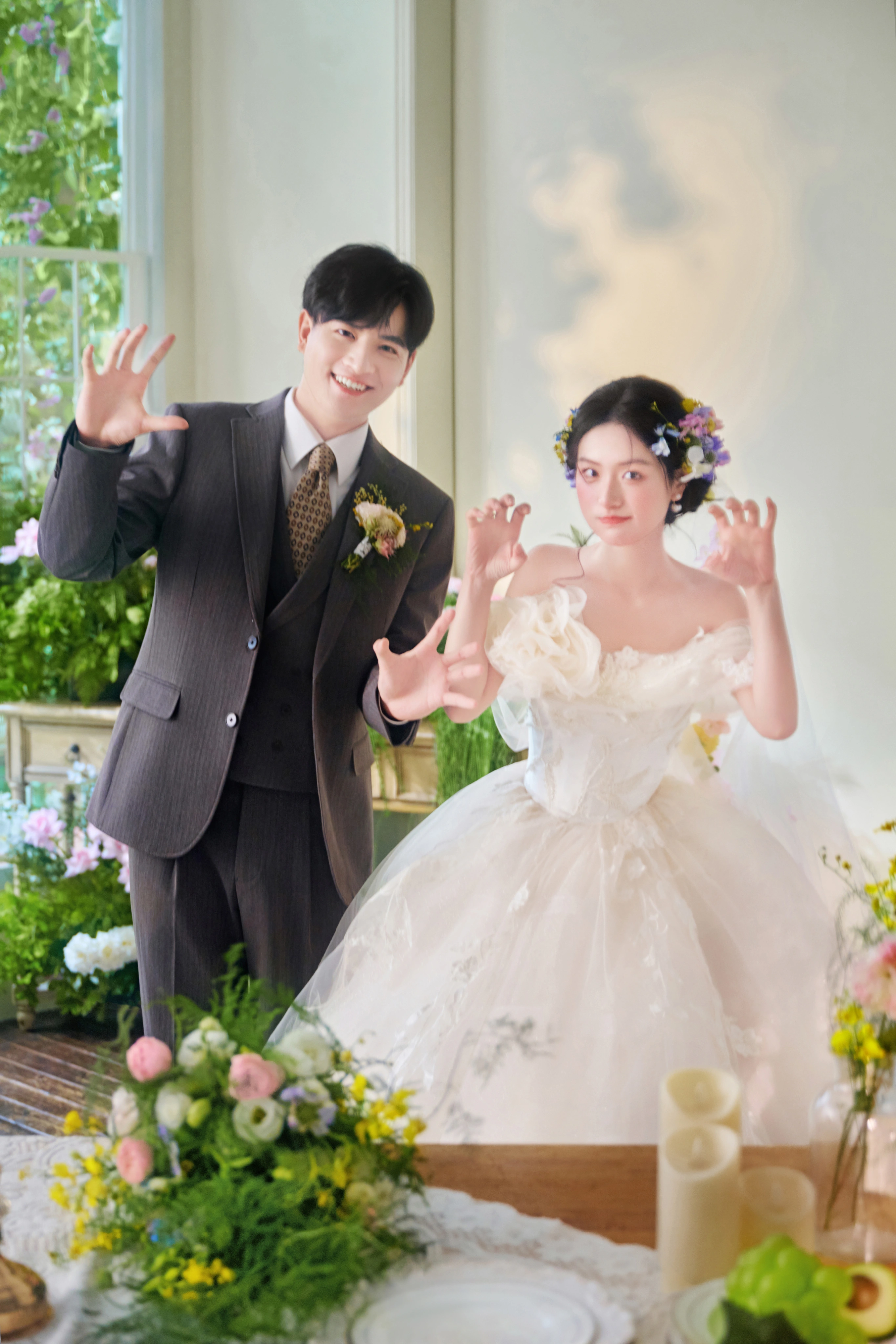 • 谁能拒绝满是鲜花和泡泡的婚纱照啊! - 奶白色花苞裙+碎花发饰🌿 像从春日花房里跑出来的甜妹✨ 他穿灰西装举着泡泡机 互动时的笑直接把“热恋感”焊在镜头里~ 满屏的粉花+透明泡泡🌸 每一帧都像《青春爱情剧》的剧照!#韩式花房婚纱照