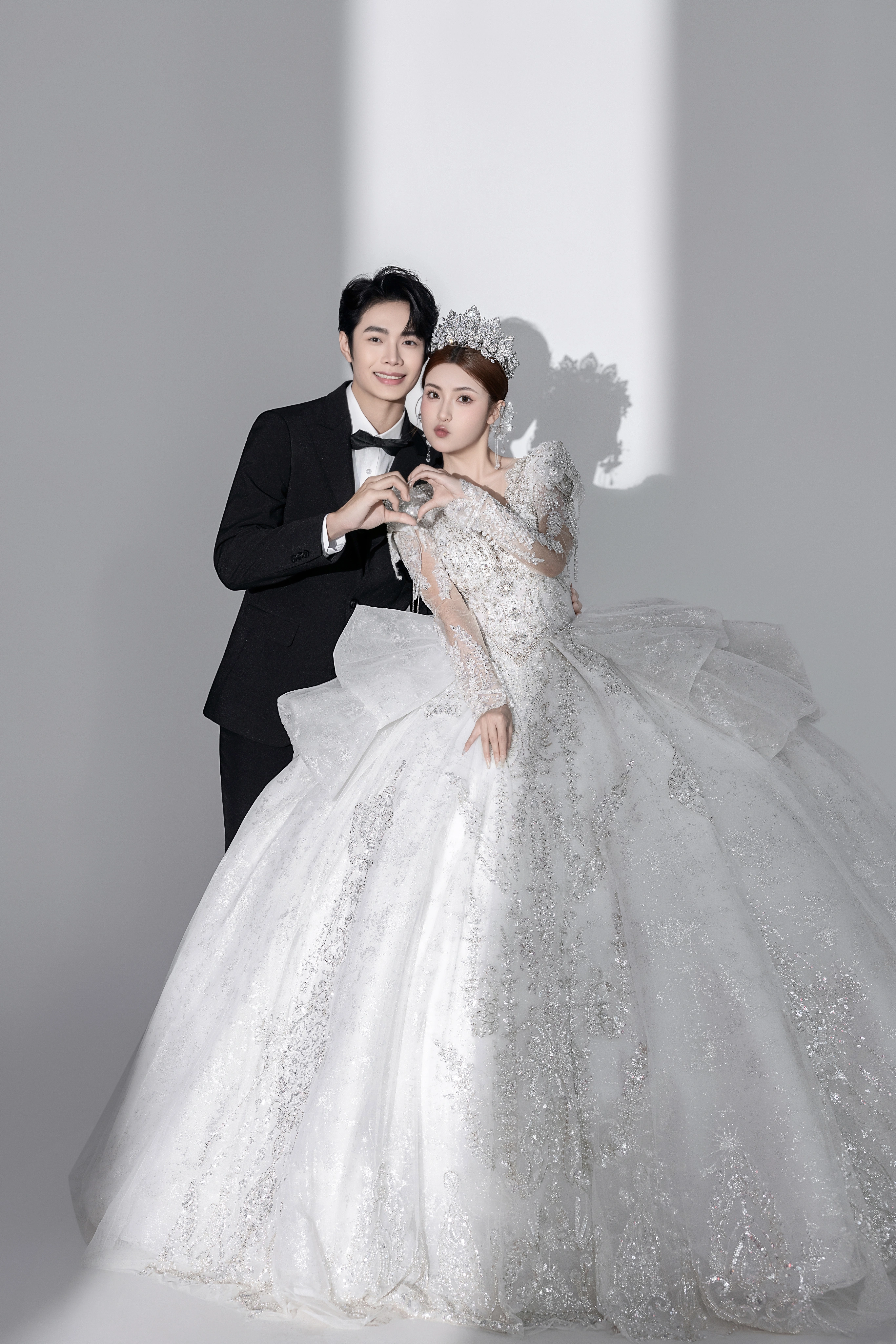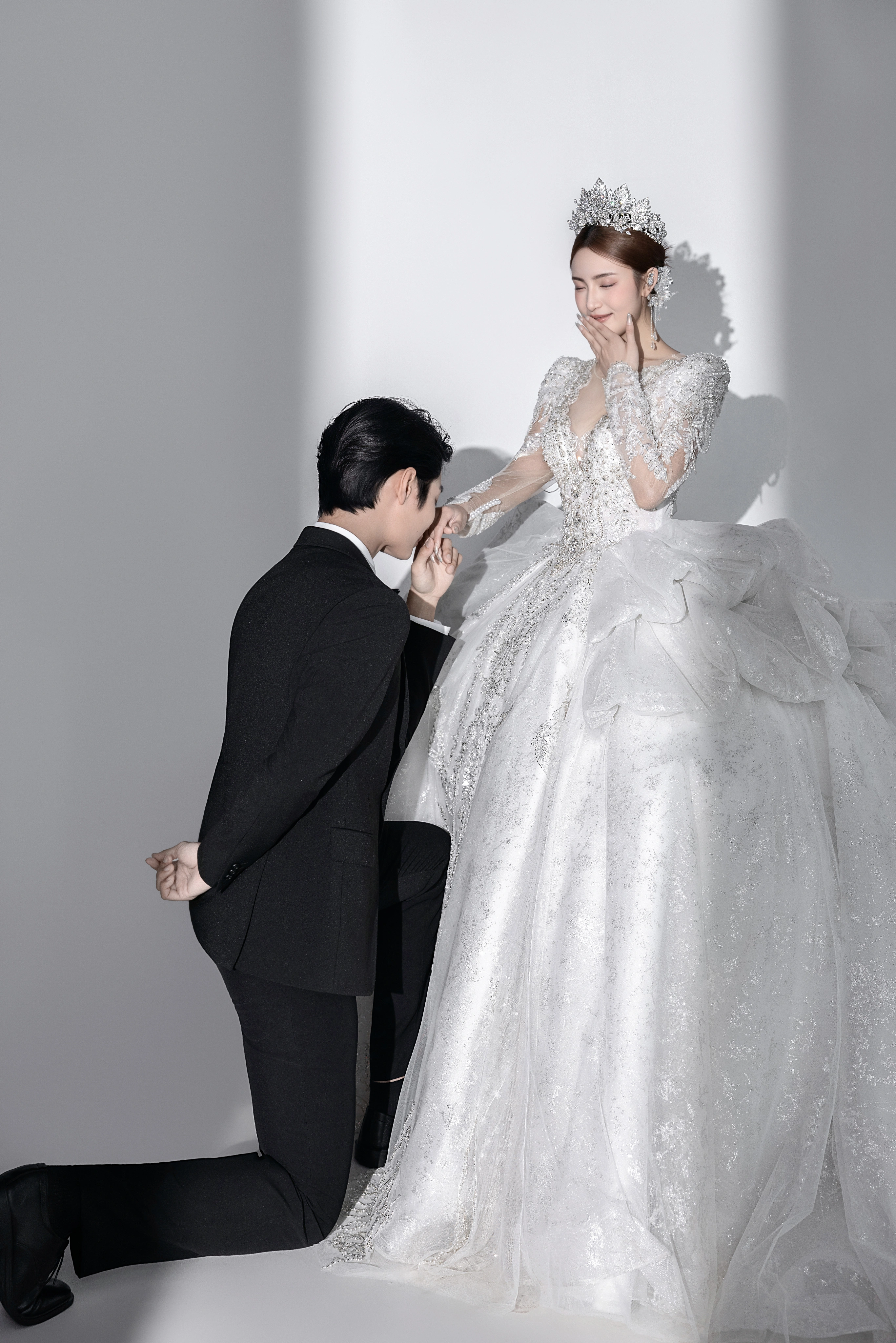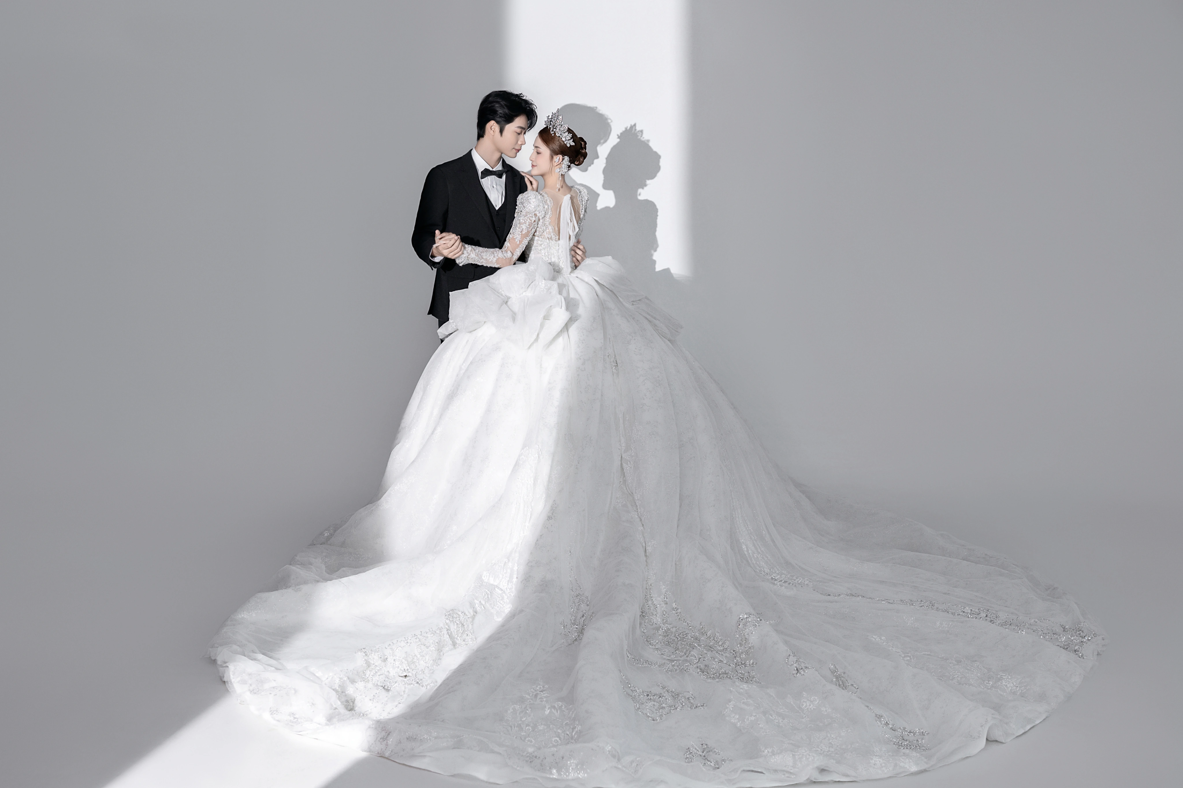 • 干净纯色的背景更加能凸显人物 洁白的婚纱为一生 把浪漫藏匿在镜头里 将美好定格在婚纱照中 ✨ 在极简的空间背景下 两人的情感流露更显细腻 镜头定格下来的每一张照片 都足够纯粹高级且耐看💛#浪漫光影婚纱照
