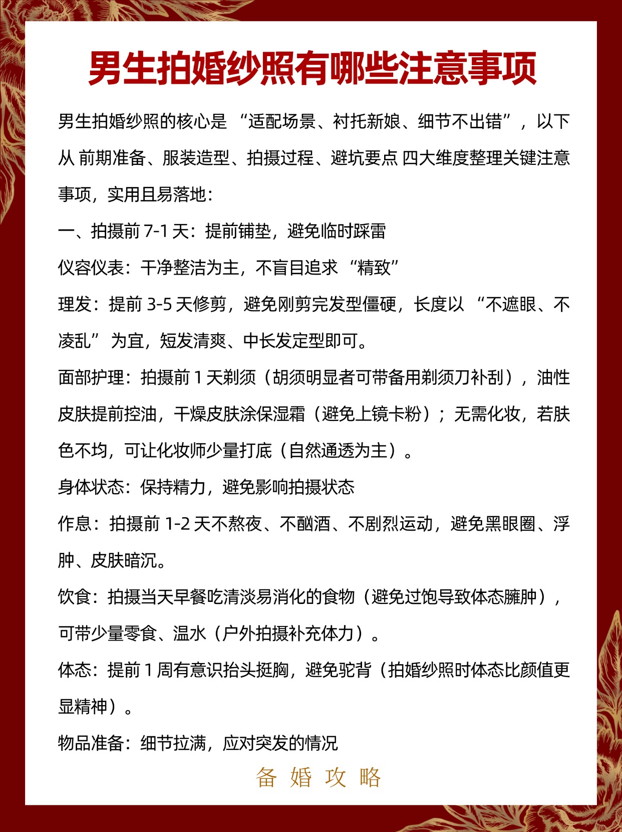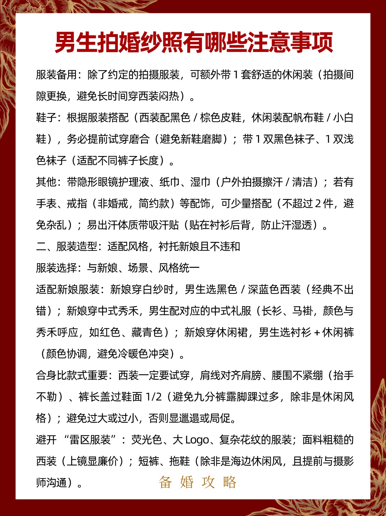 • 男生拍婚纱照的核心是 “适配场景、衬托新娘、细节不出错”,以下从 前期准备、服装造型、拍摄过程、避坑要点 四大维度整理关键注意事项,实用且易落地:#婚纱照拍摄注意事项