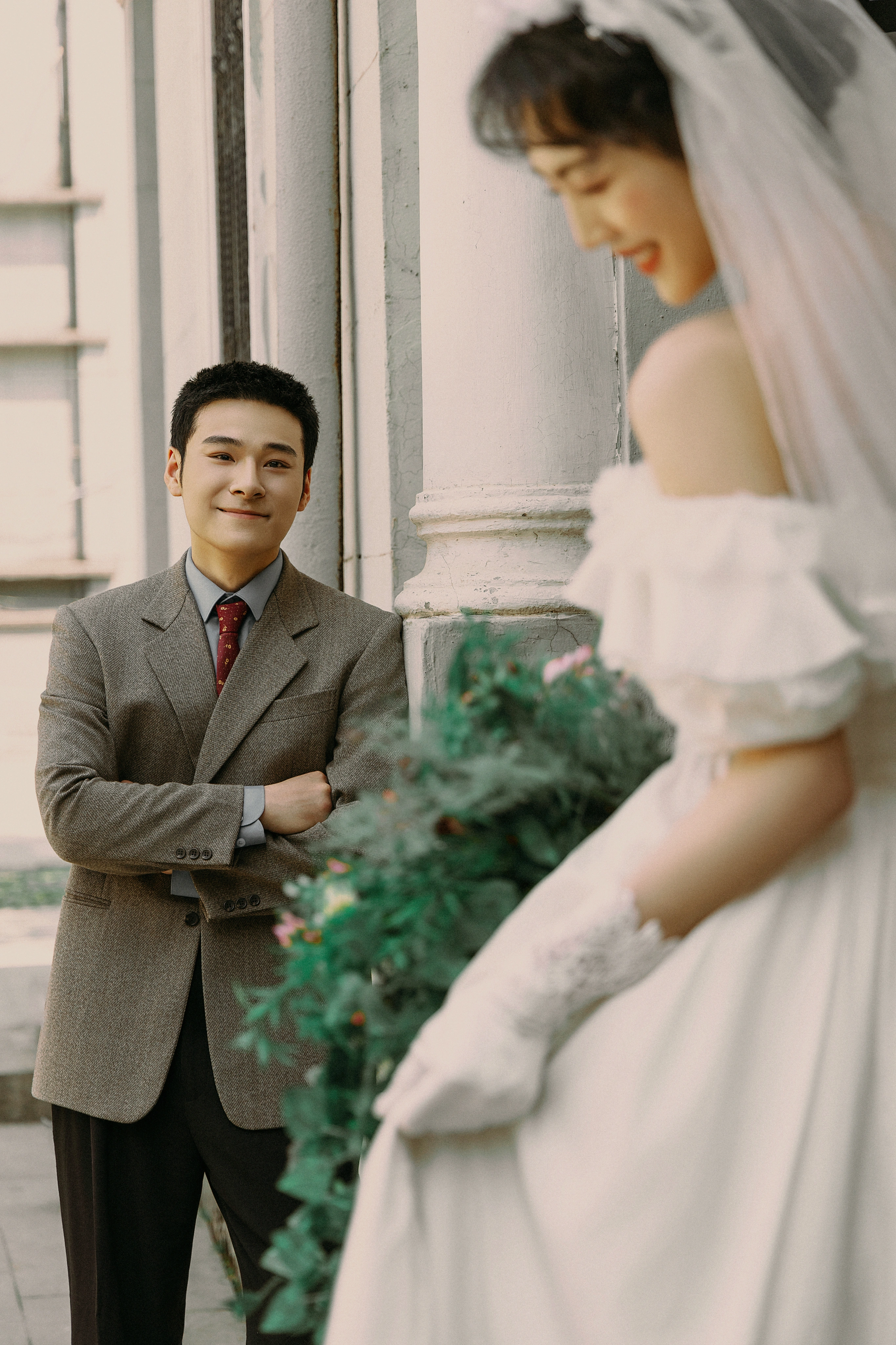 • 复古红底背景,把法式的优雅浪漫拉满 这几张胶片感的抓拍,眼神和笑意都恰到好处 没有过度修饰的真实感,才是经久不衰的经典呀 📸 摄影老师超会引导 原片直出就已经很有氛围感 强烈建议备婚姐妹试试这个风格!#复古胶片婚纱照