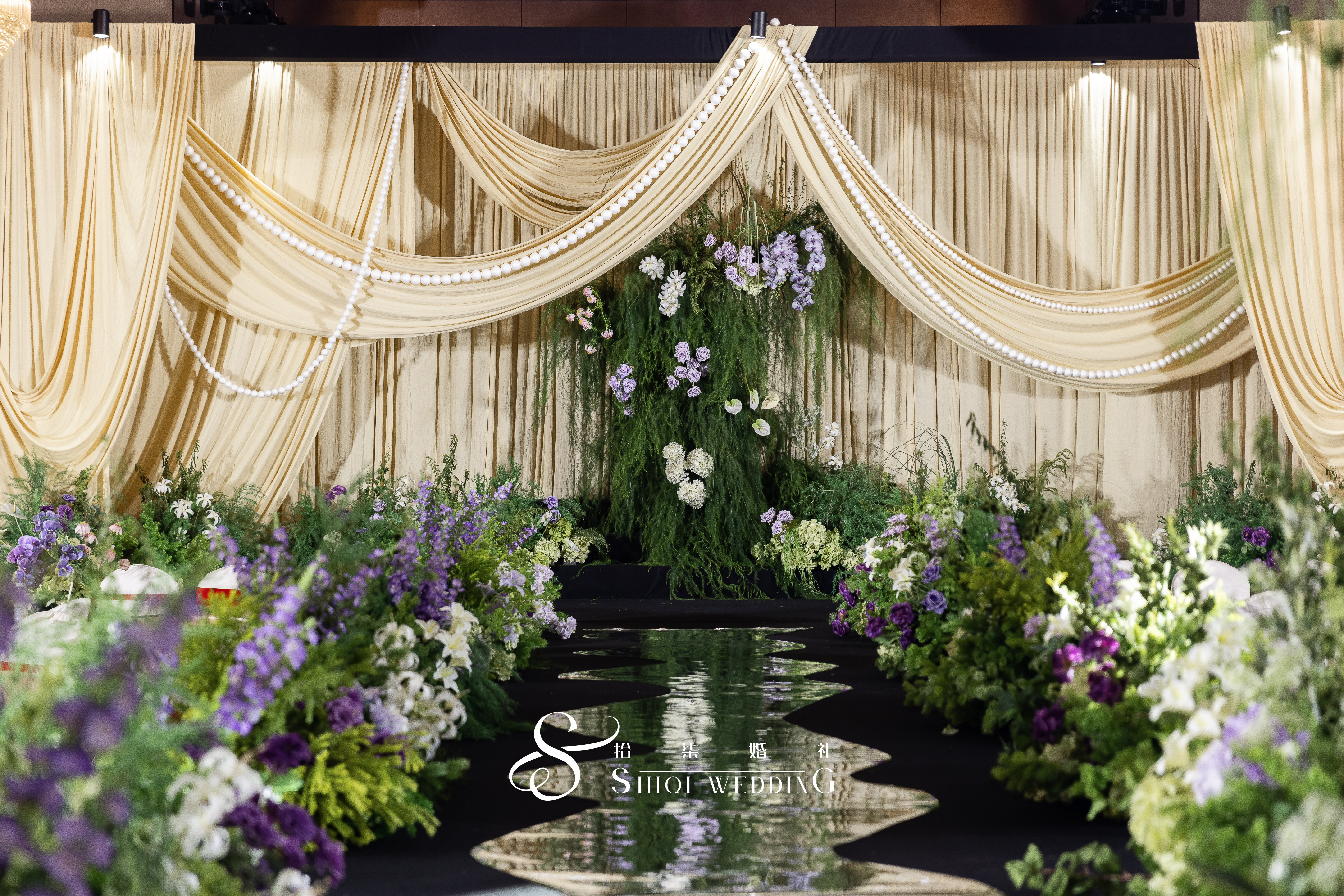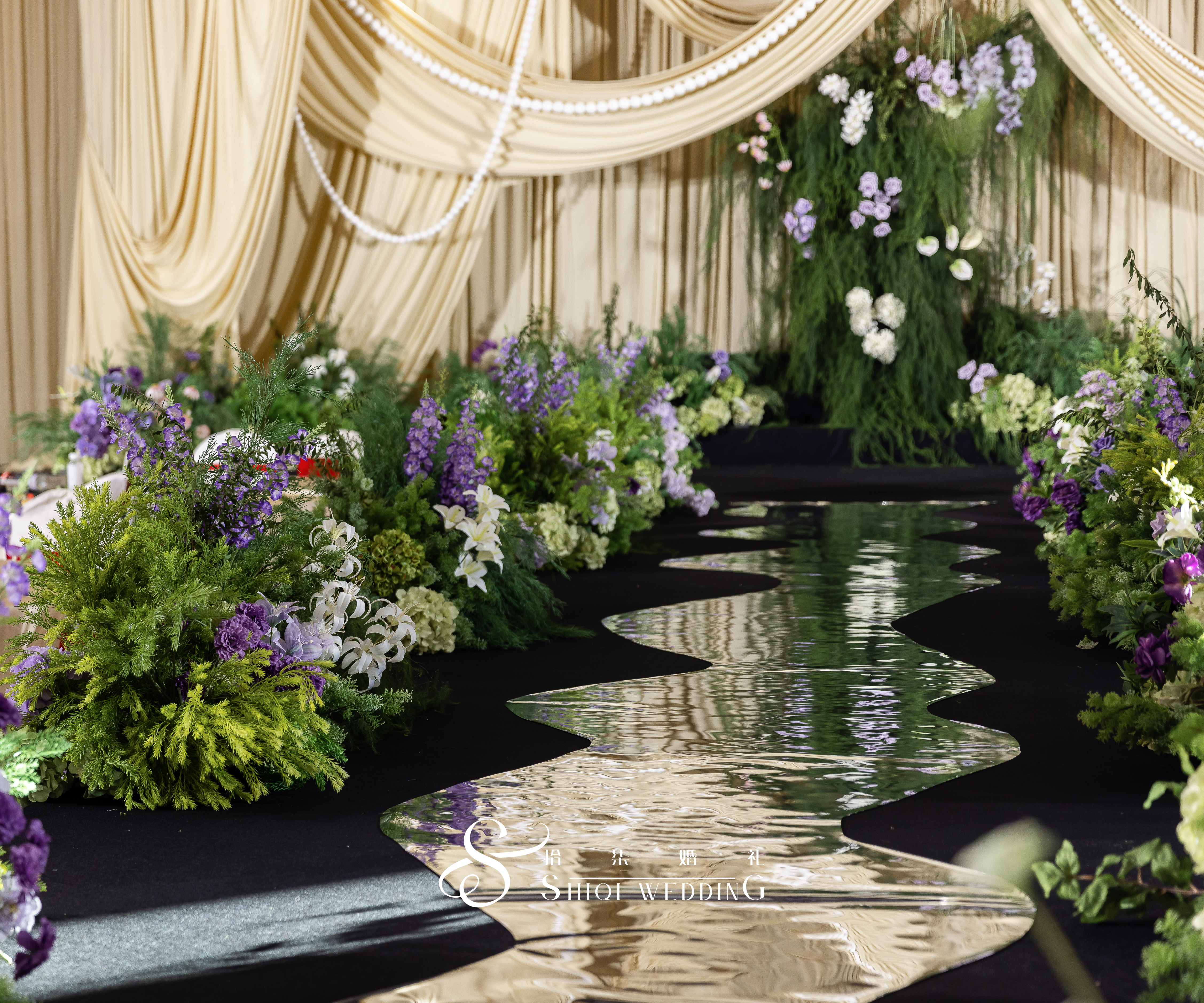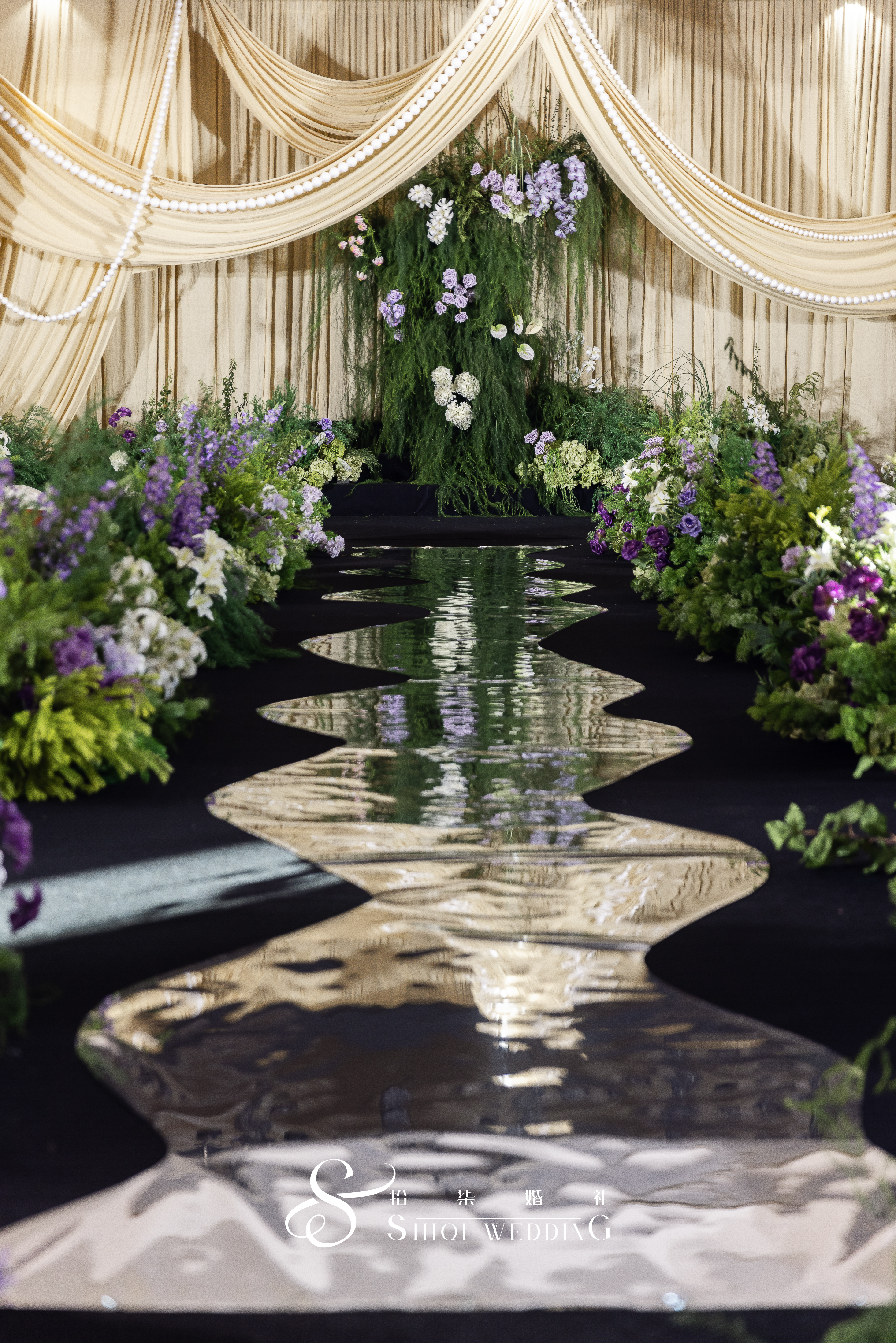• #布幔婚礼 谁懂啊!这场香槟色布幔 + 自然系花艺的婚礼,直接戳中我的心巴💘 香槟色布幔软乎乎的像云朵☁️ 珍珠链条一挂,温柔里又带了点贵气;两边的花艺是那种 “野蛮生长” 的自然感,紫 + 绿 + 白的配色像把春天的森林搬进来了🌿 中间的镜面 T 台像银河一样,走上去自带 blingbling 的光泽感~ 氛围感直接拉满,这大概就是公主婚礼的样子吧👸