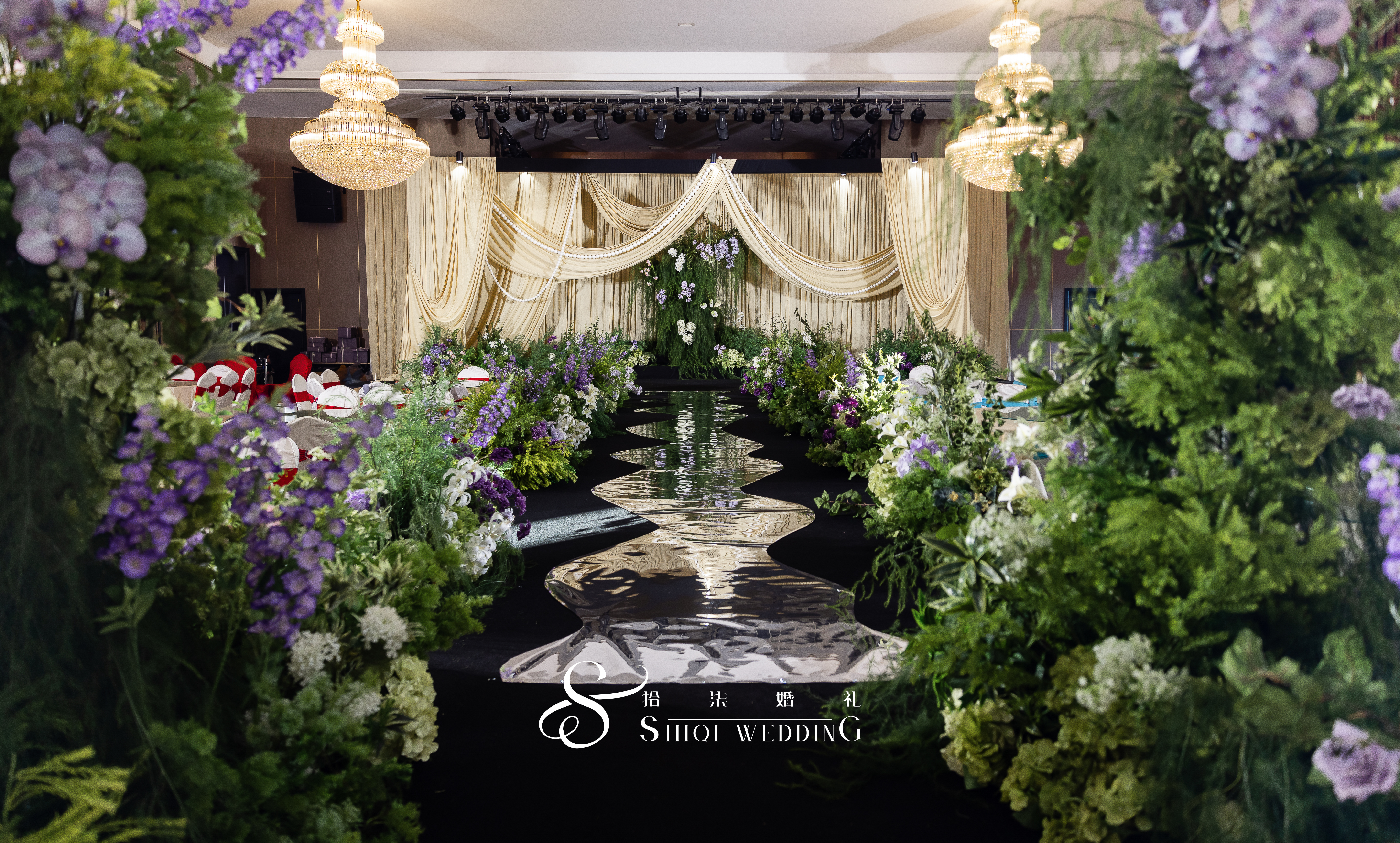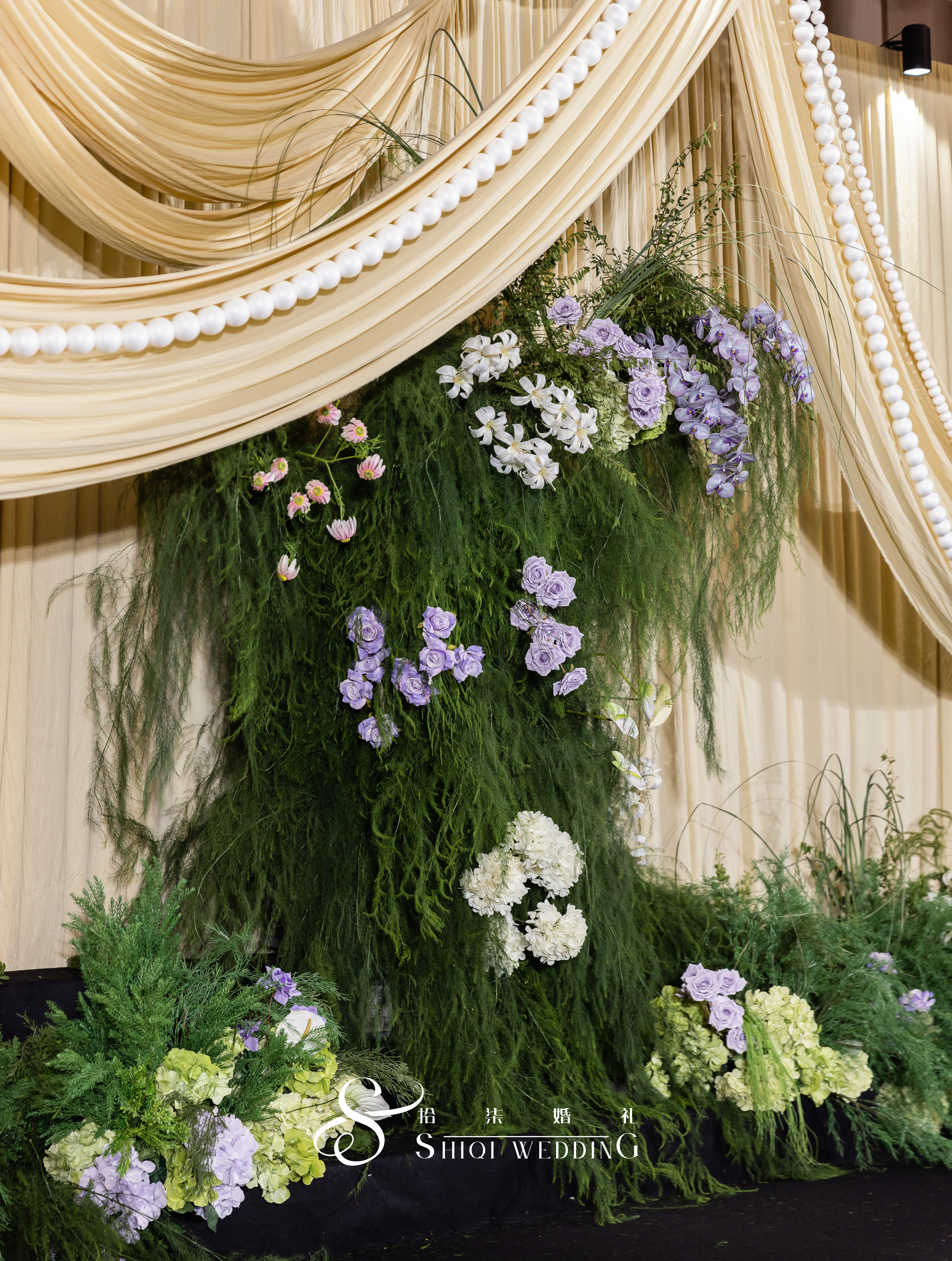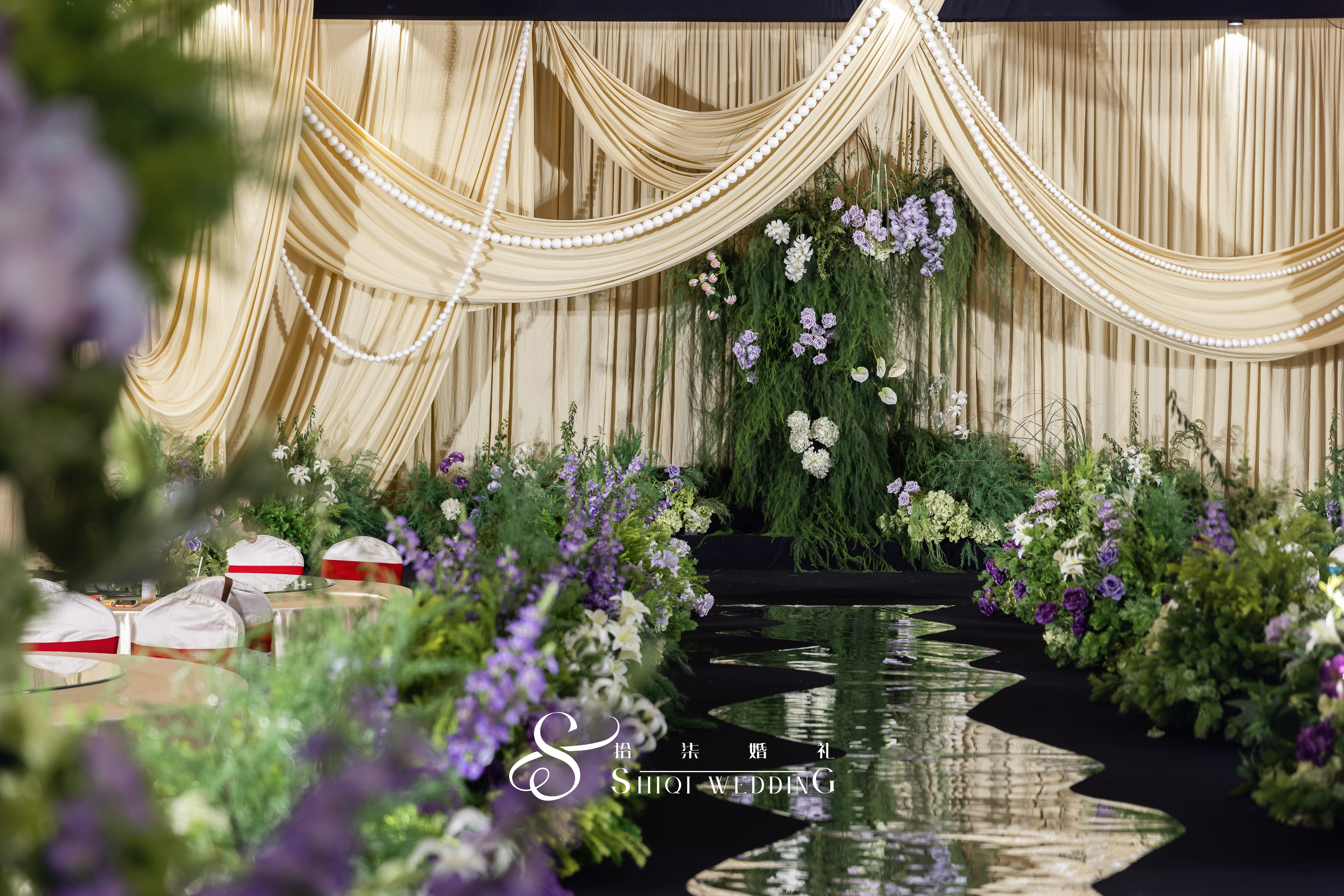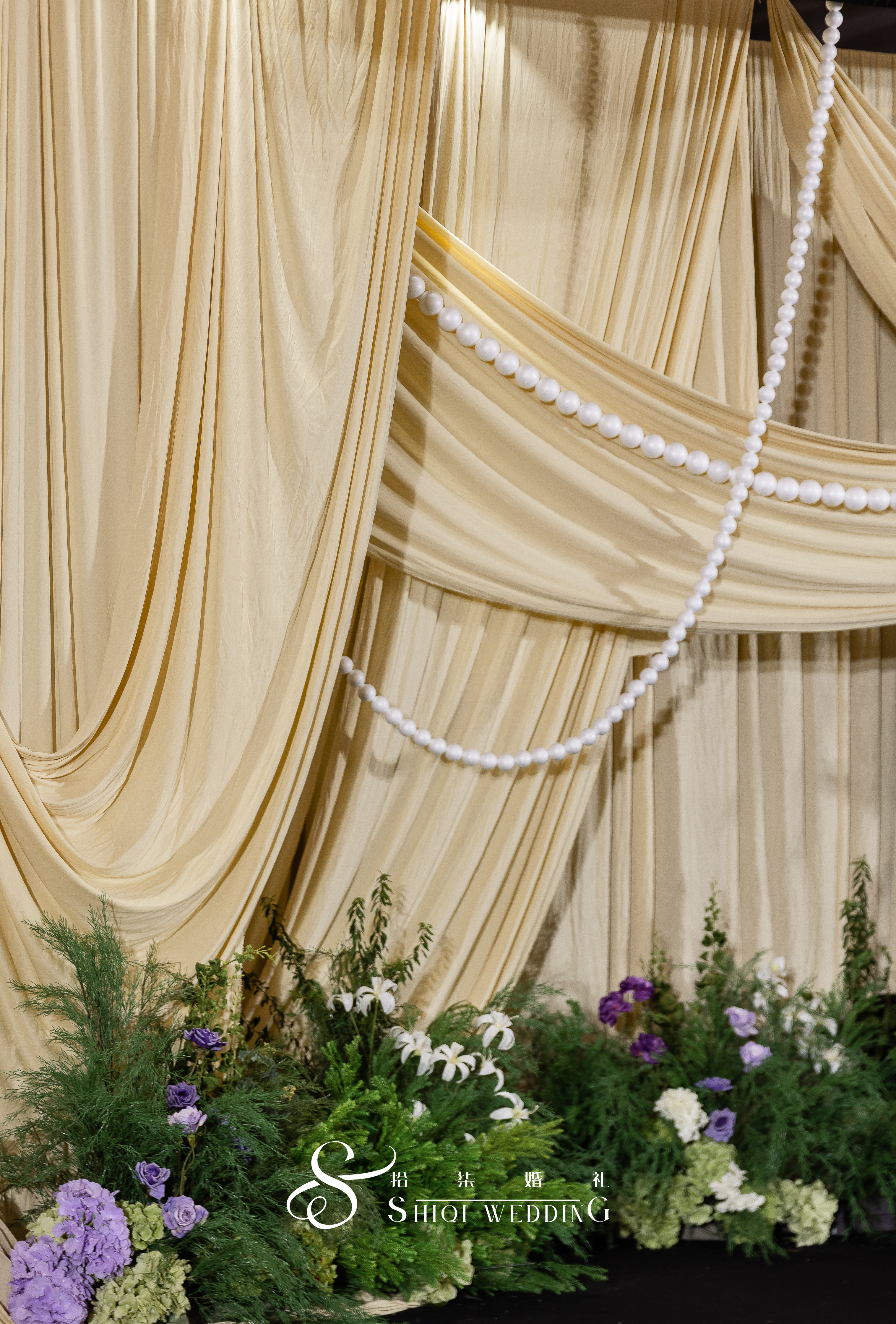 • #布幔婚礼 谁懂啊!这场香槟色布幔 + 自然系花艺的婚礼,直接戳中我的心巴💘 香槟色布幔软乎乎的像云朵☁️ 珍珠链条一挂,温柔里又带了点贵气;两边的花艺是那种 “野蛮生长” 的自然感,紫 + 绿 + 白的配色像把春天的森林搬进来了🌿 中间的镜面 T 台像银河一样,走上去自带 blingbling 的光泽感~ 氛围感直接拉满,这大概就是公主婚礼的样子吧👸
