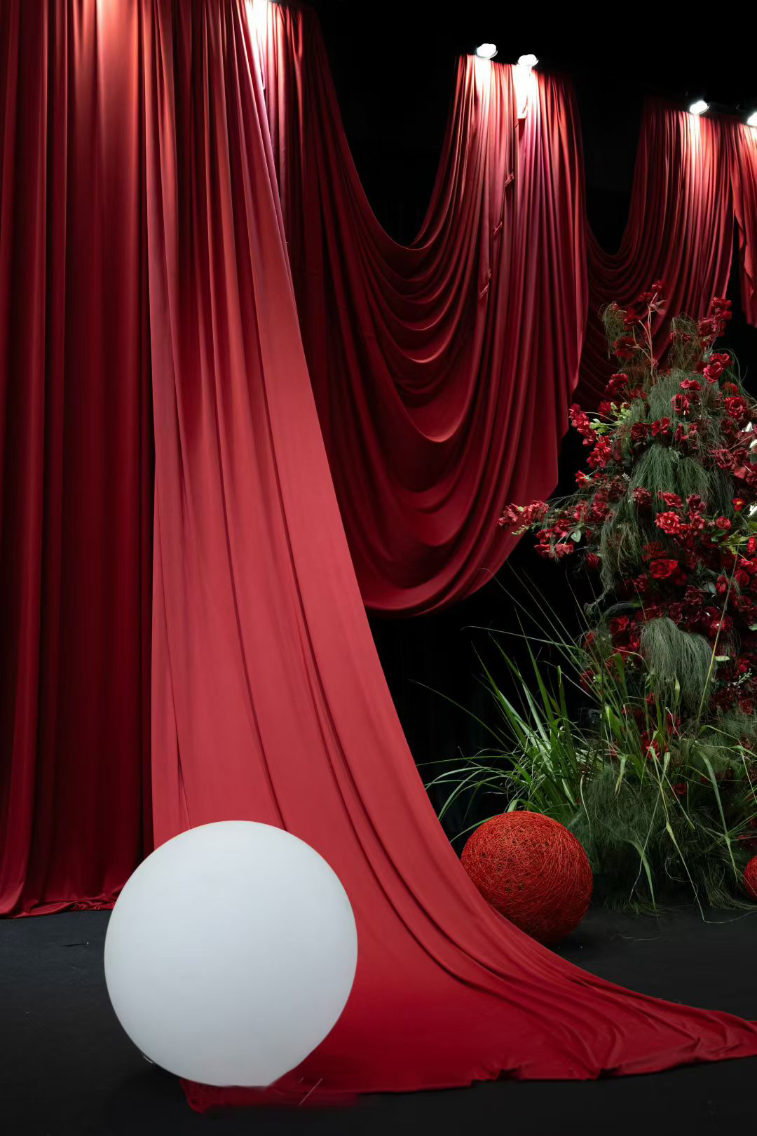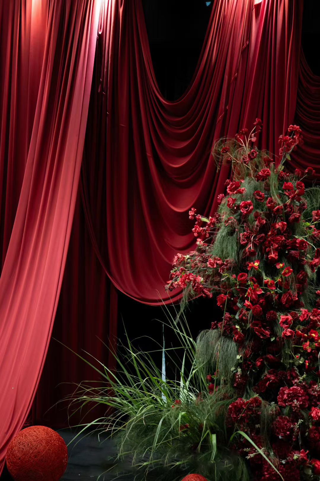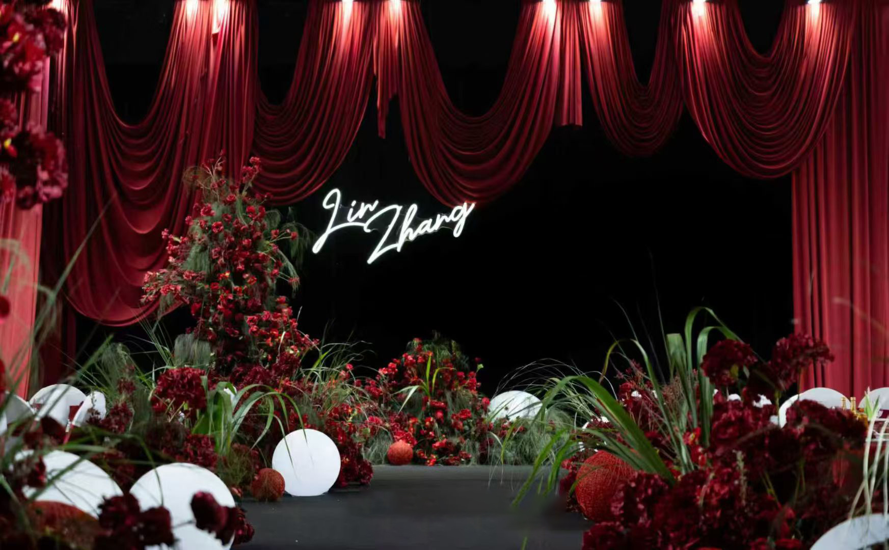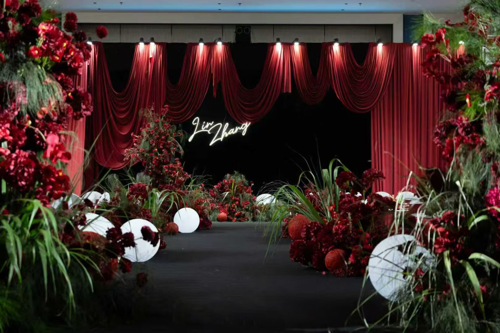 • #氛围感婚礼布置 小预算大棚婚礼也能封神!万元搞定红色系高级感 大棚婚礼不要怕没质感! 红色调的婚礼现场,水晶背景+酒红布幔,再配上花艺和灯光,大棚里直接有了晚宴那味儿✨ 现场效果比预期还惊艳,小众又出片! 小预算也能把大棚婚礼搞出仪式感~ 策划:杭州拾柒婚礼