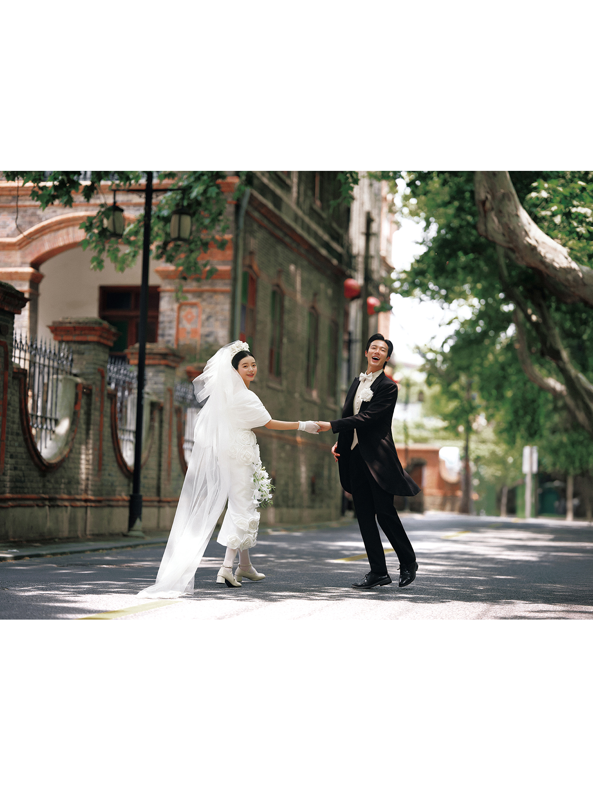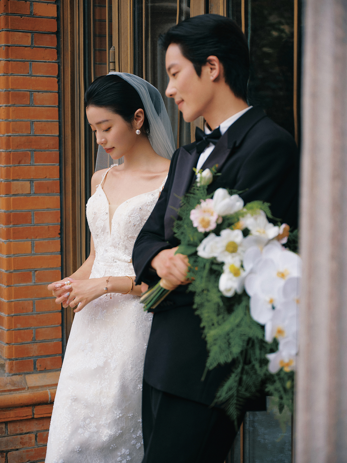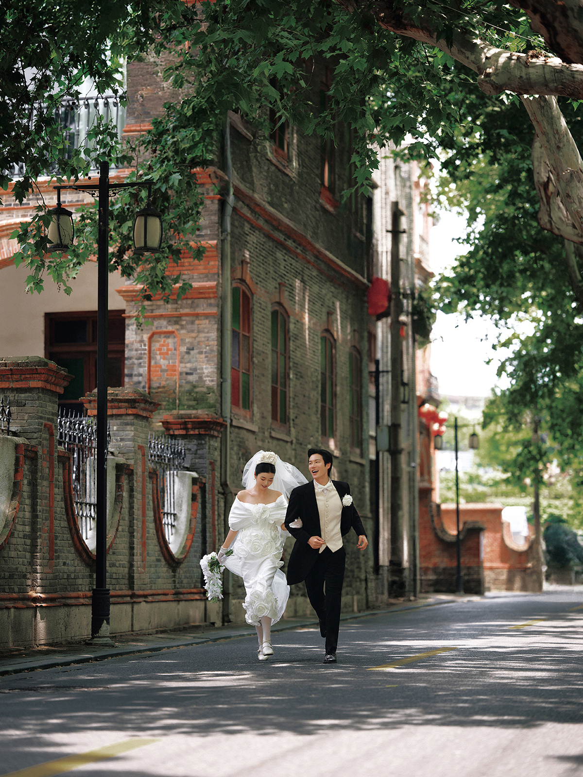 • 风格:复古|电影感|街拍|纪实|民国 - 与爱的人漫步在城市街头 自带一种浪漫主义的色彩和氛围 在民国复古的建筑旁 拍到了理想的街拍婚纱照 白纱上的立体花和手上的花束 风把裙摆吹成蓬松的云 这一刻比任何电影镜头都更让人心动#韩式街拍婚纱照