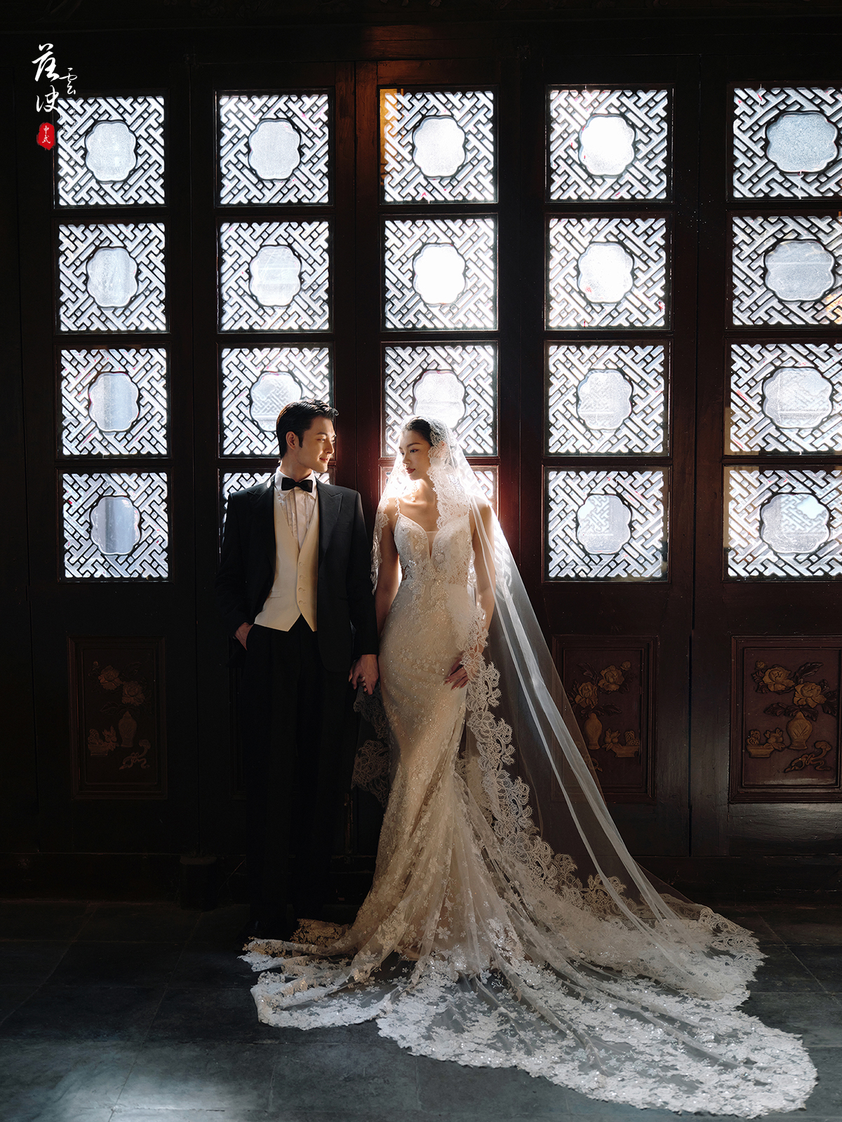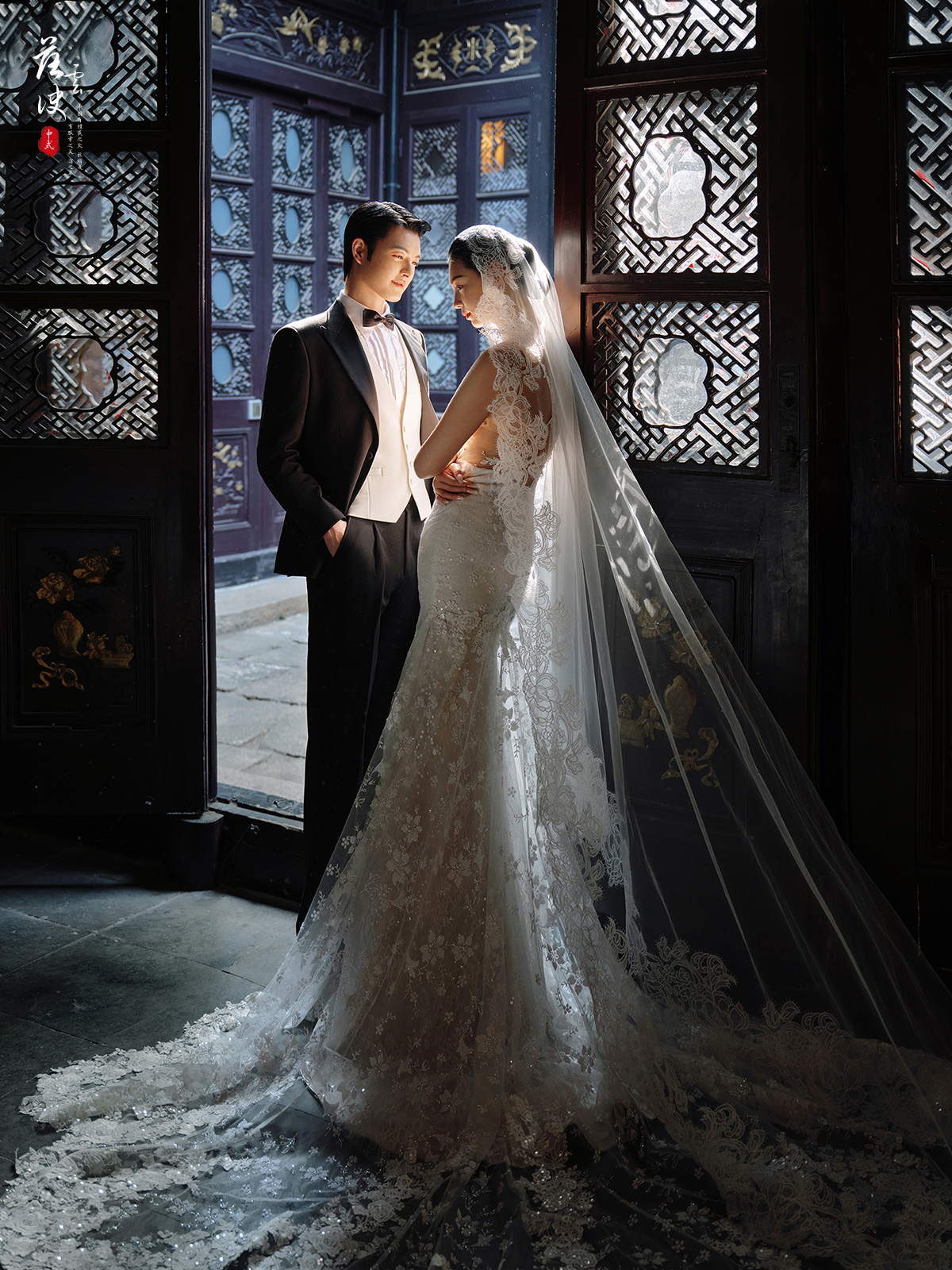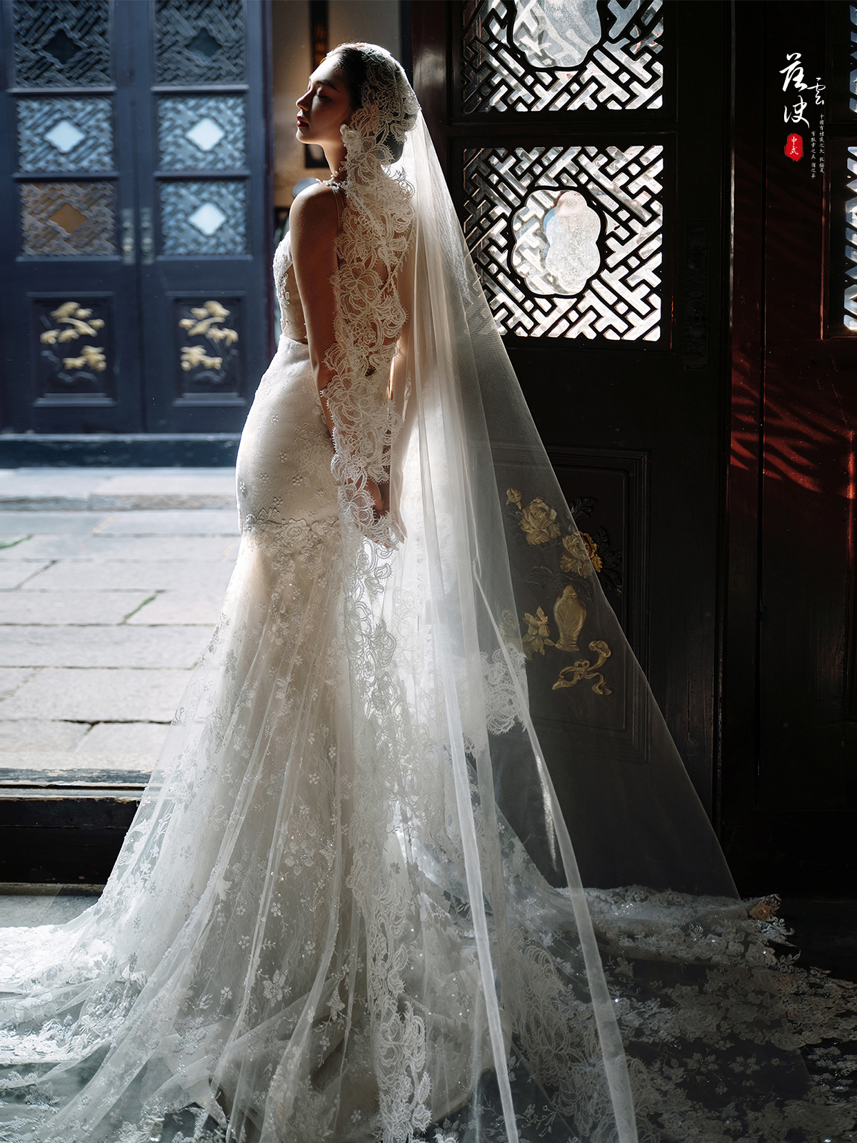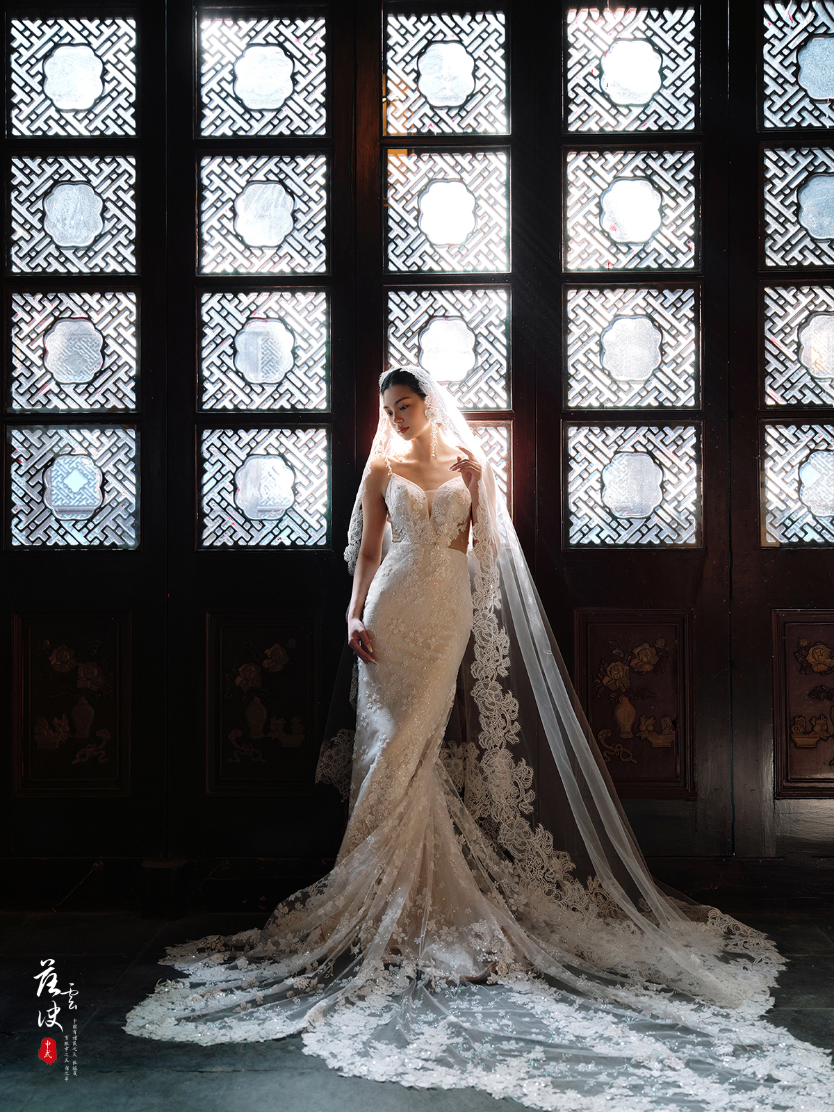 • 风格:中式|复古|园林|电影感|光影 - 中式窗棂的光影,落在鱼尾裙摆上✨ 是旧时光里的温柔,撞上了我们的爱情故事💌 木质雕花的纹路里,藏着岁月的回响 刺绣鱼尾搭配落地长纱 生动摇曳婀娜多姿 中式美学的浪漫在园林里盛开 宛如古典画卷般浪漫
