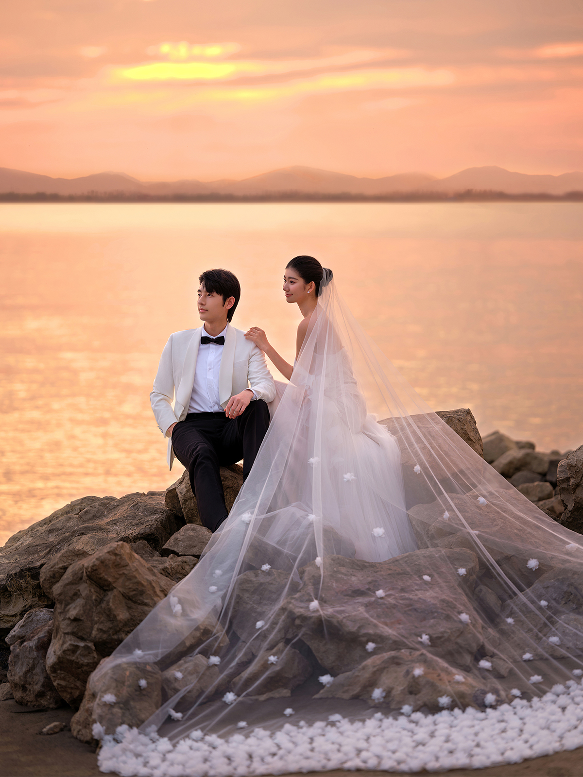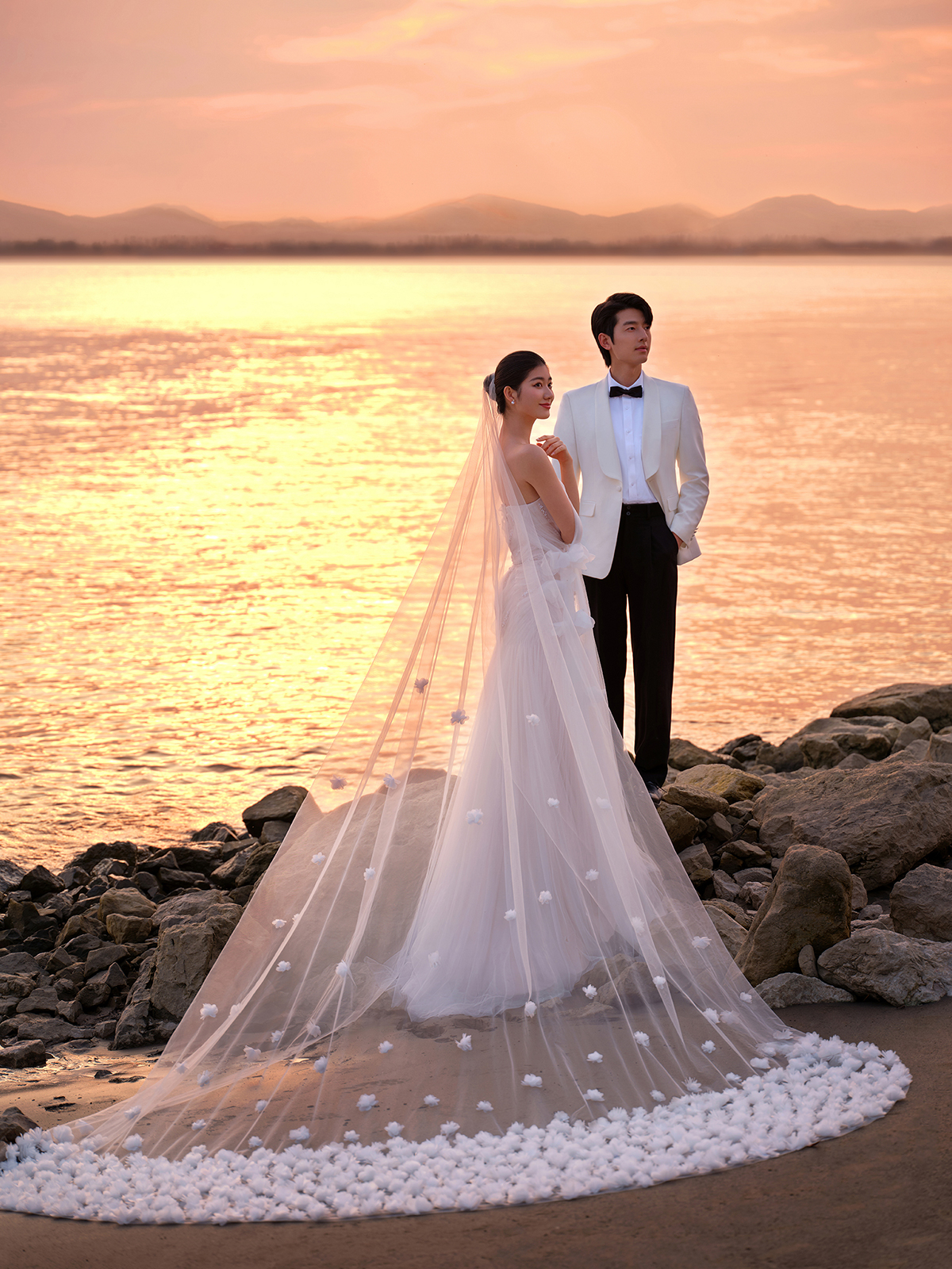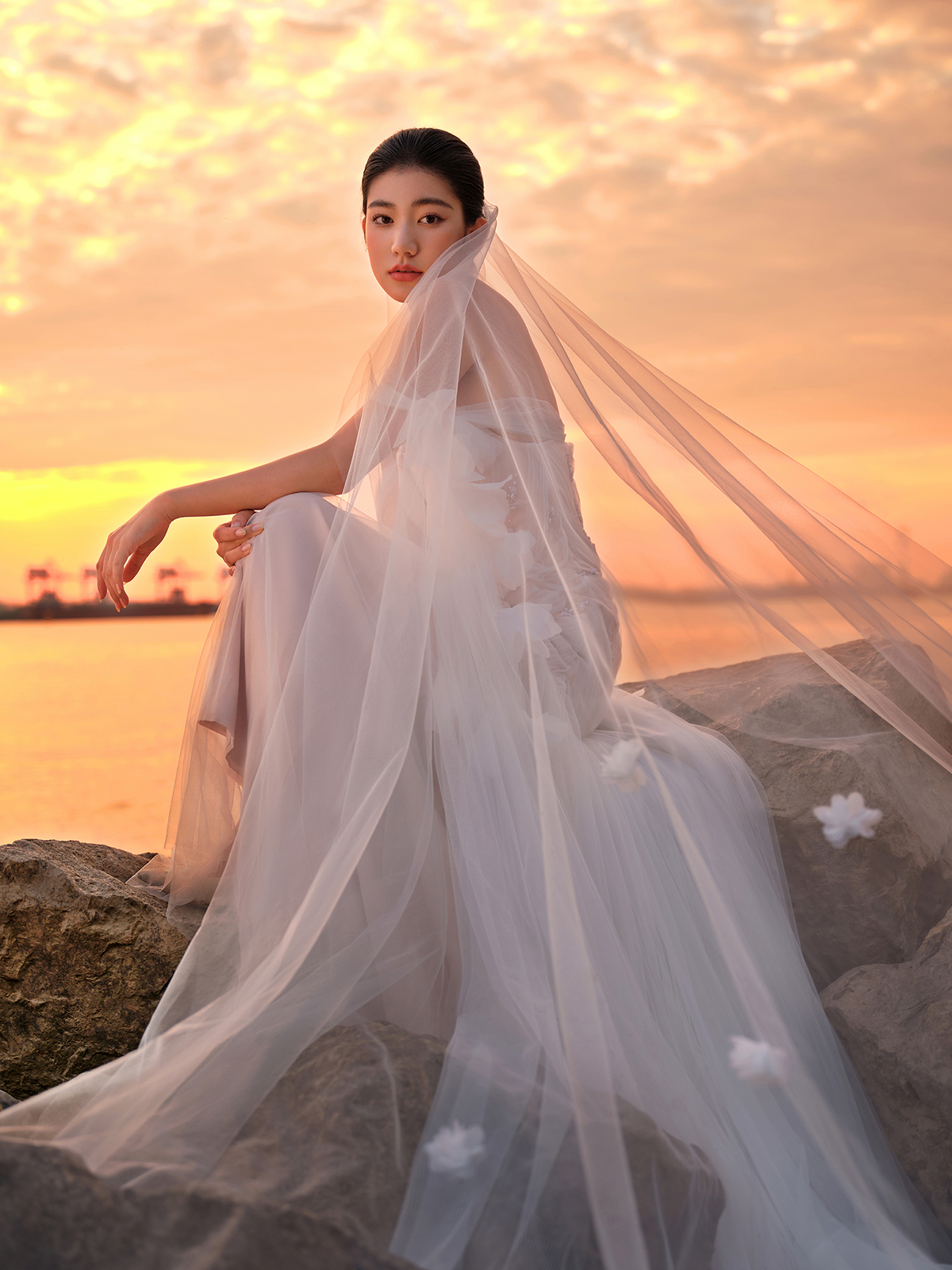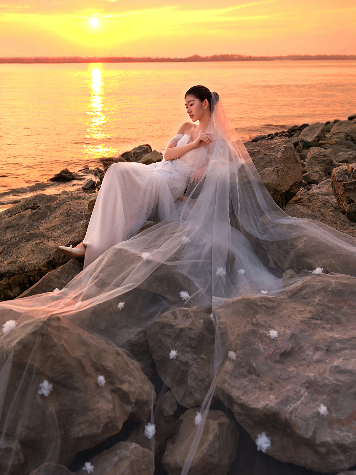 • 风格:江景|夕阳|电影感|纪实|外景 - 这大概就是“把浪漫穿在身上”的具象化吧! 落日把海面染成橘子汽水色 裹着一层轻纱朦胧且浪漫 裙摆上的立体小花随着海风轻轻晃 连头纱都在闪闪发光✨ 站在礁石上的时候 铺在石头上纱裙像洒落了月光 每一帧都如电影截图般唯美