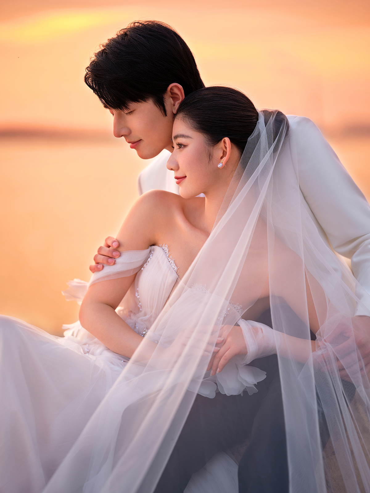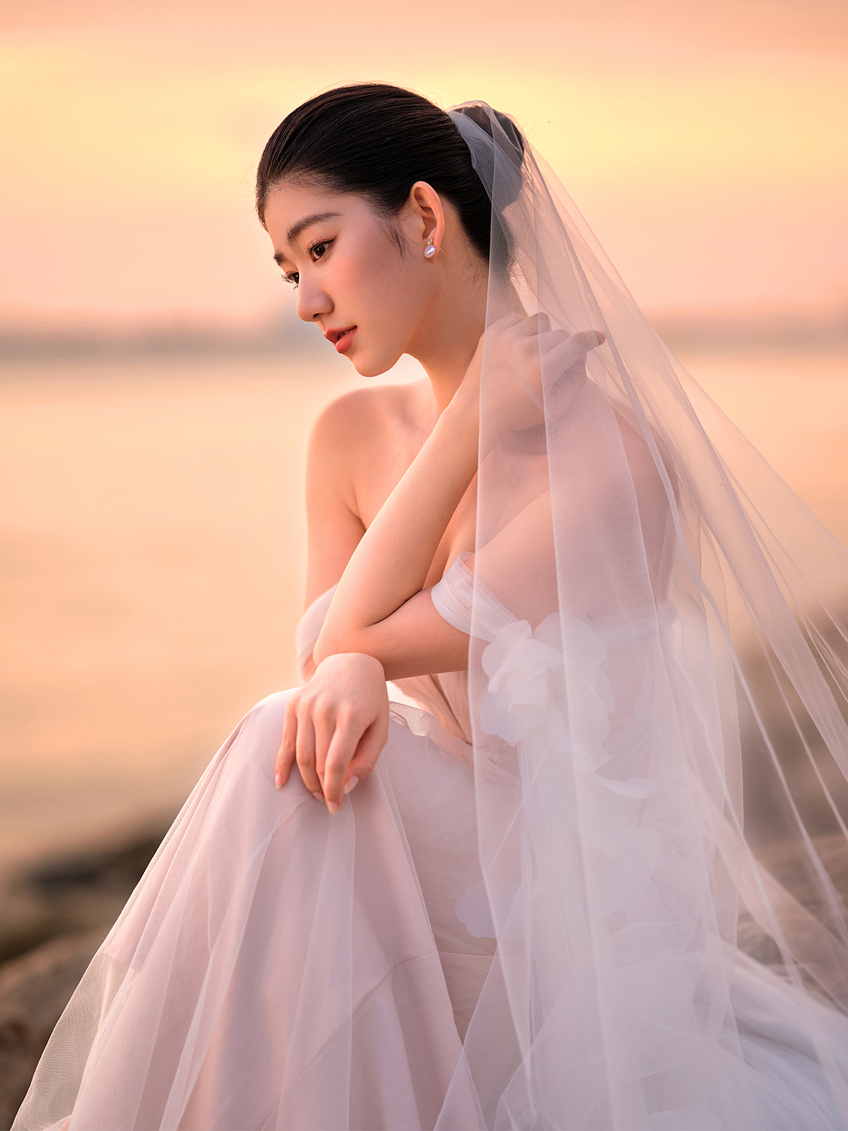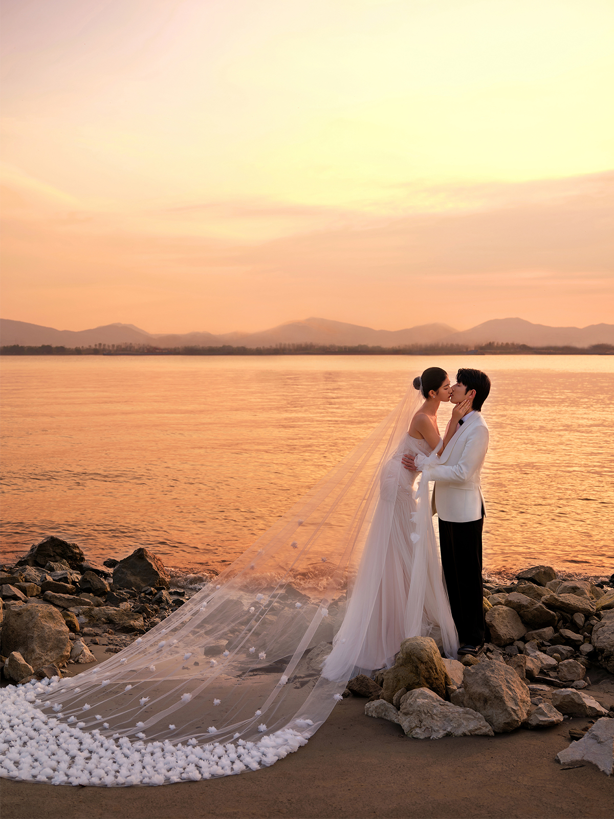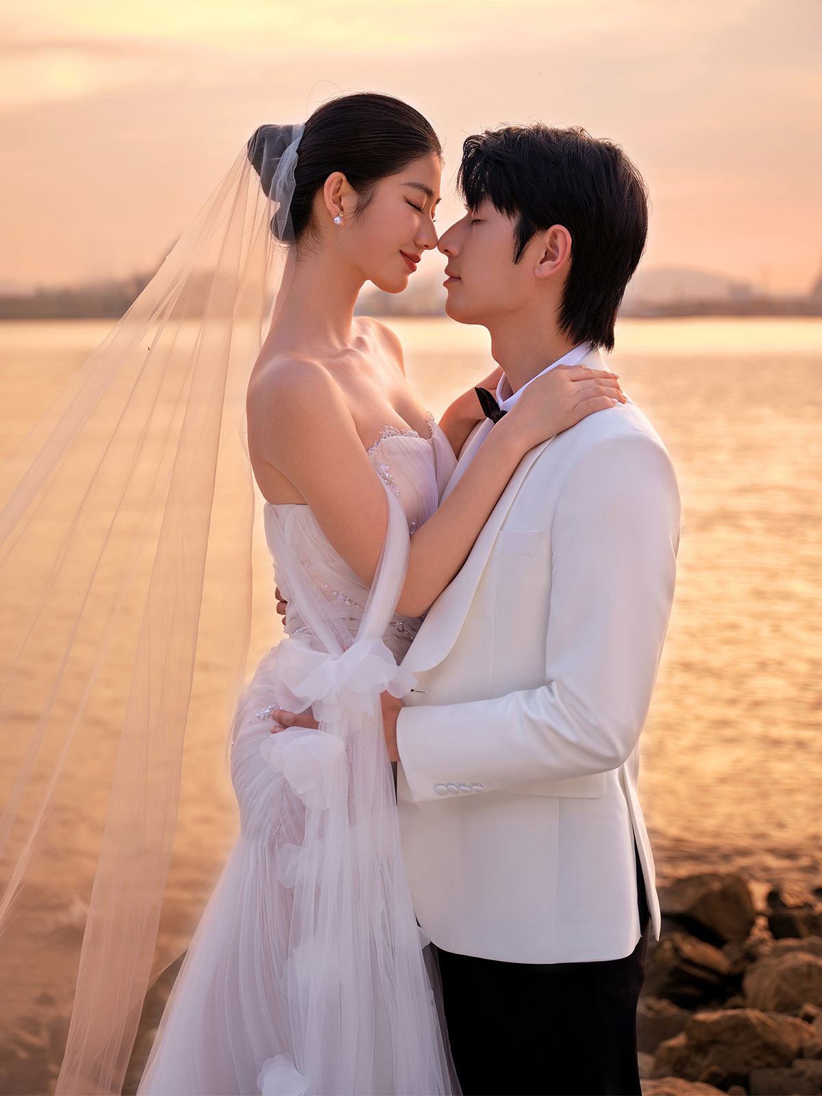 • 风格:江景|夕阳|电影感|纪实|外景 - 这大概就是“把浪漫穿在身上”的具象化吧! 落日把海面染成橘子汽水色 裹着一层轻纱朦胧且浪漫 裙摆上的立体小花随着海风轻轻晃 连头纱都在闪闪发光✨ 站在礁石上的时候 铺在石头上纱裙像洒落了月光 每一帧都如电影截图般唯美