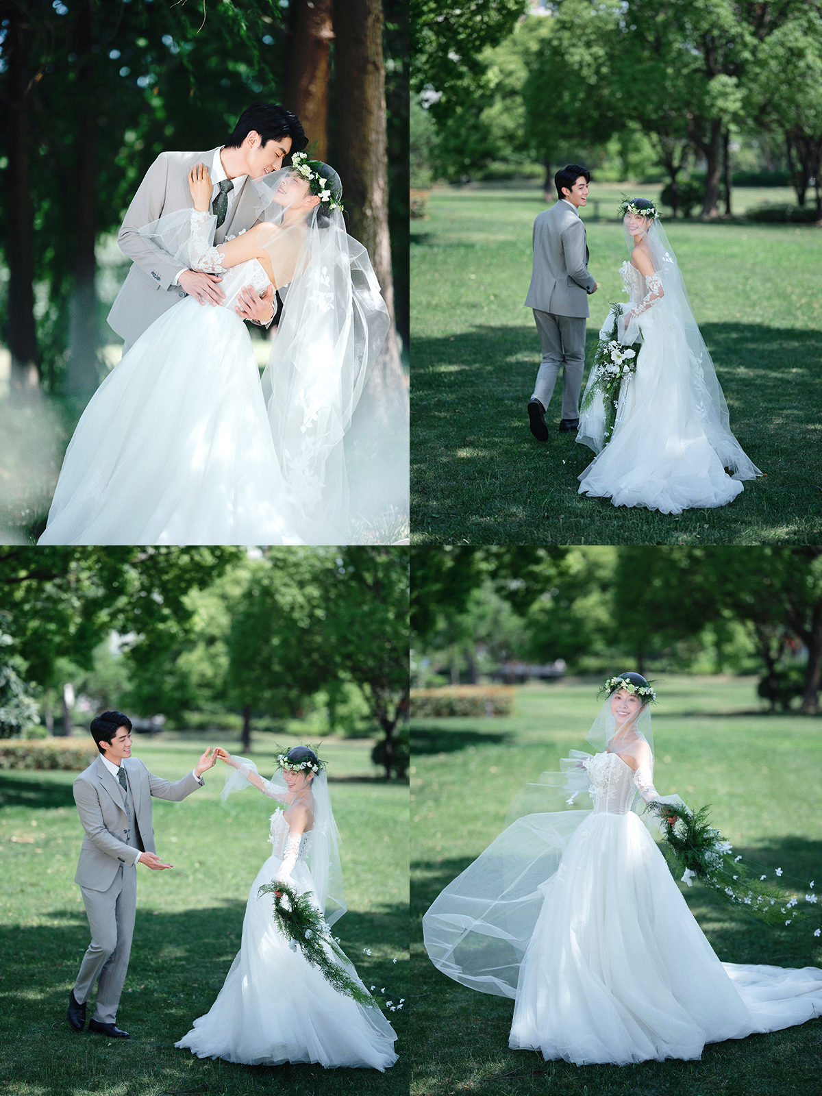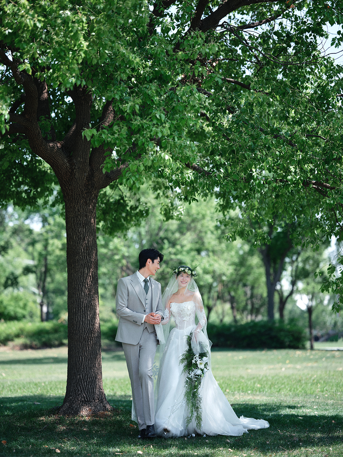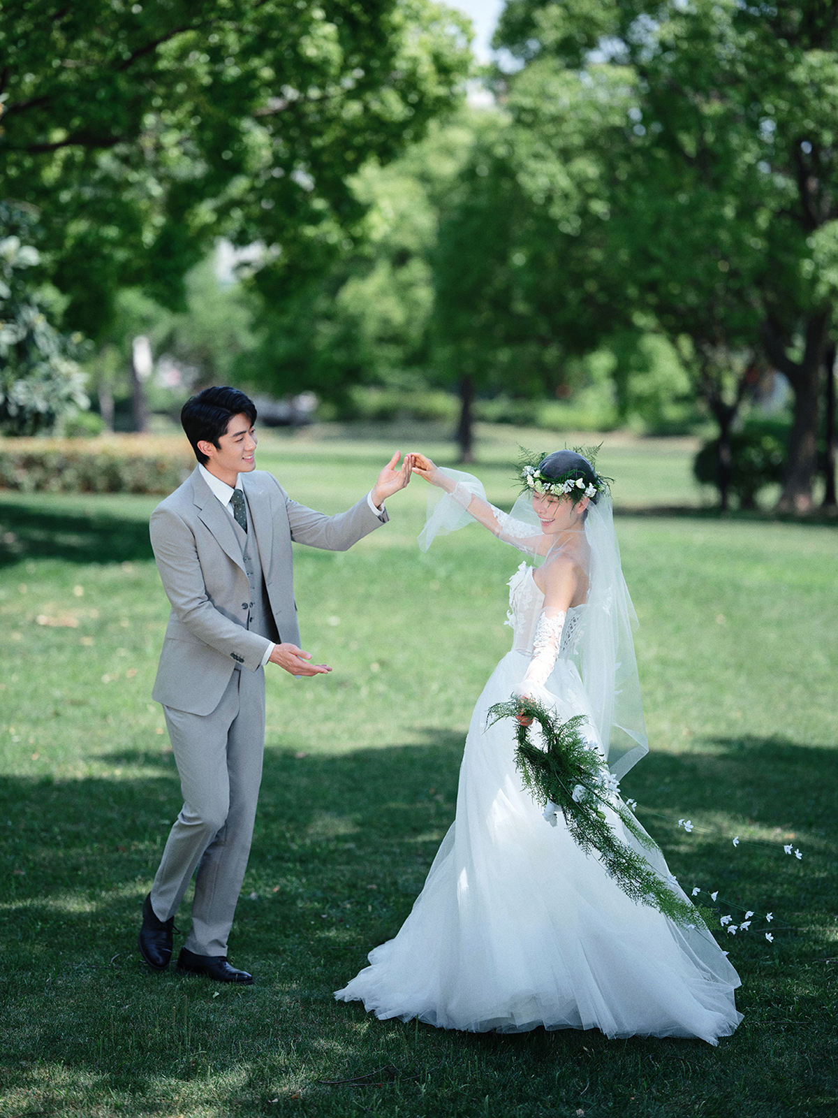 • 风格:森系|草坪|小清新|电影感|纪实 - 白纱裹着阳光,发间别着刚摘的小花 他笑着朝我走过来的时候 像把整个春天的温柔都带来了。 与清新草坪搭配出片率满满 氧气感又充满了少女的轻盈感 牵手转圈圈时,树影在身上晃成碎光的欢喜。 每一帧都是超浪漫的仪式感