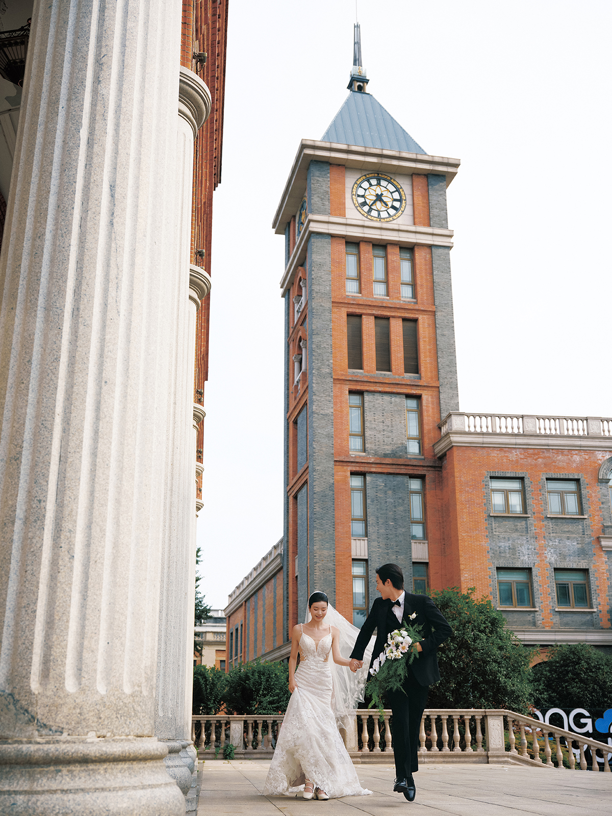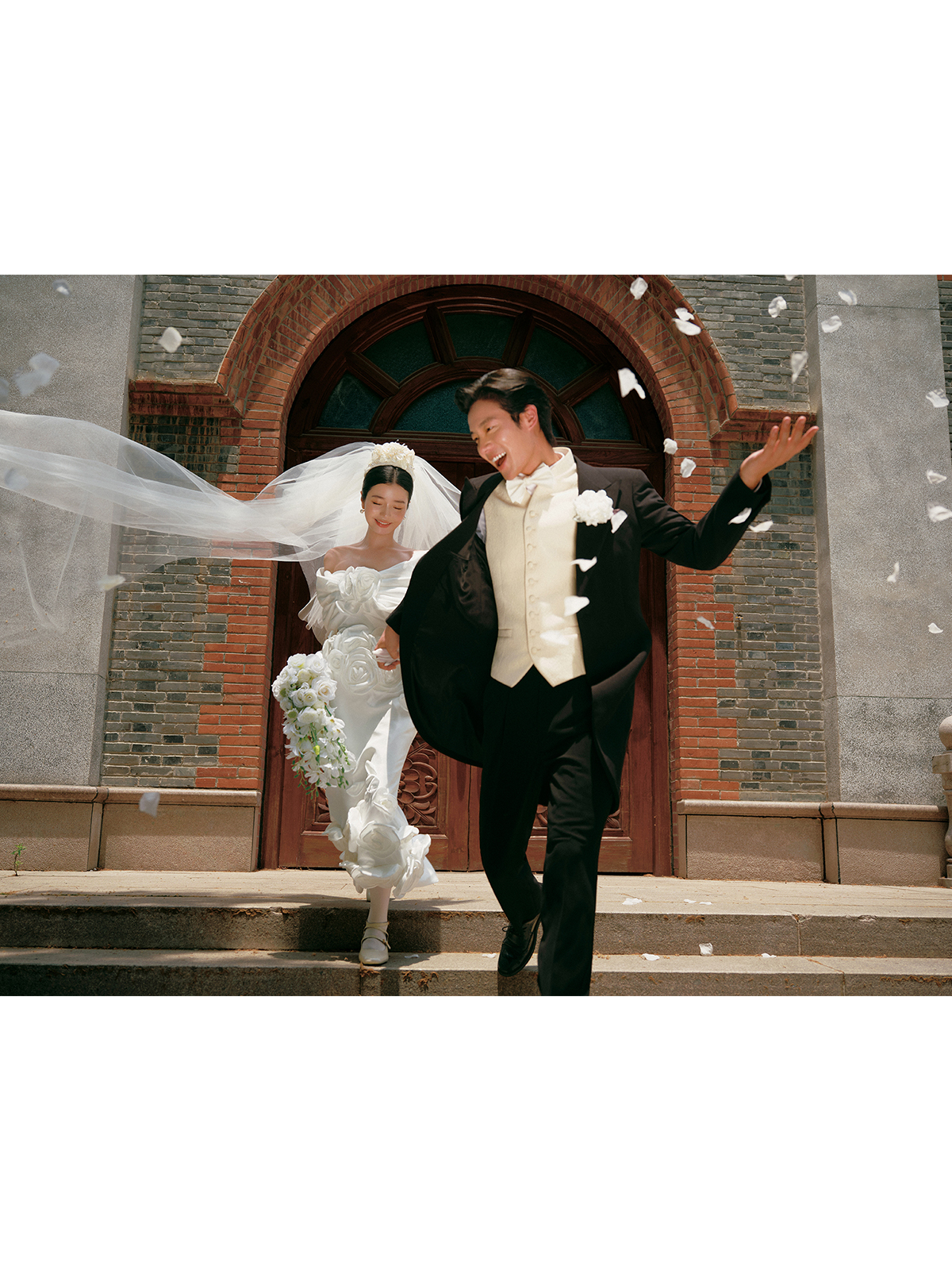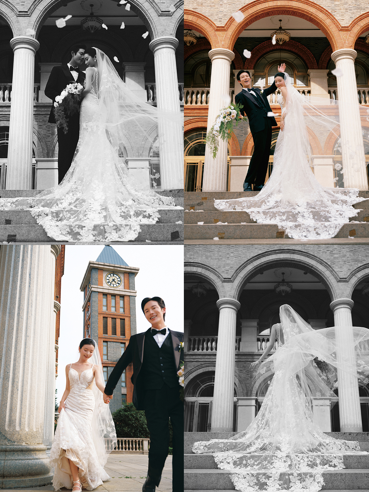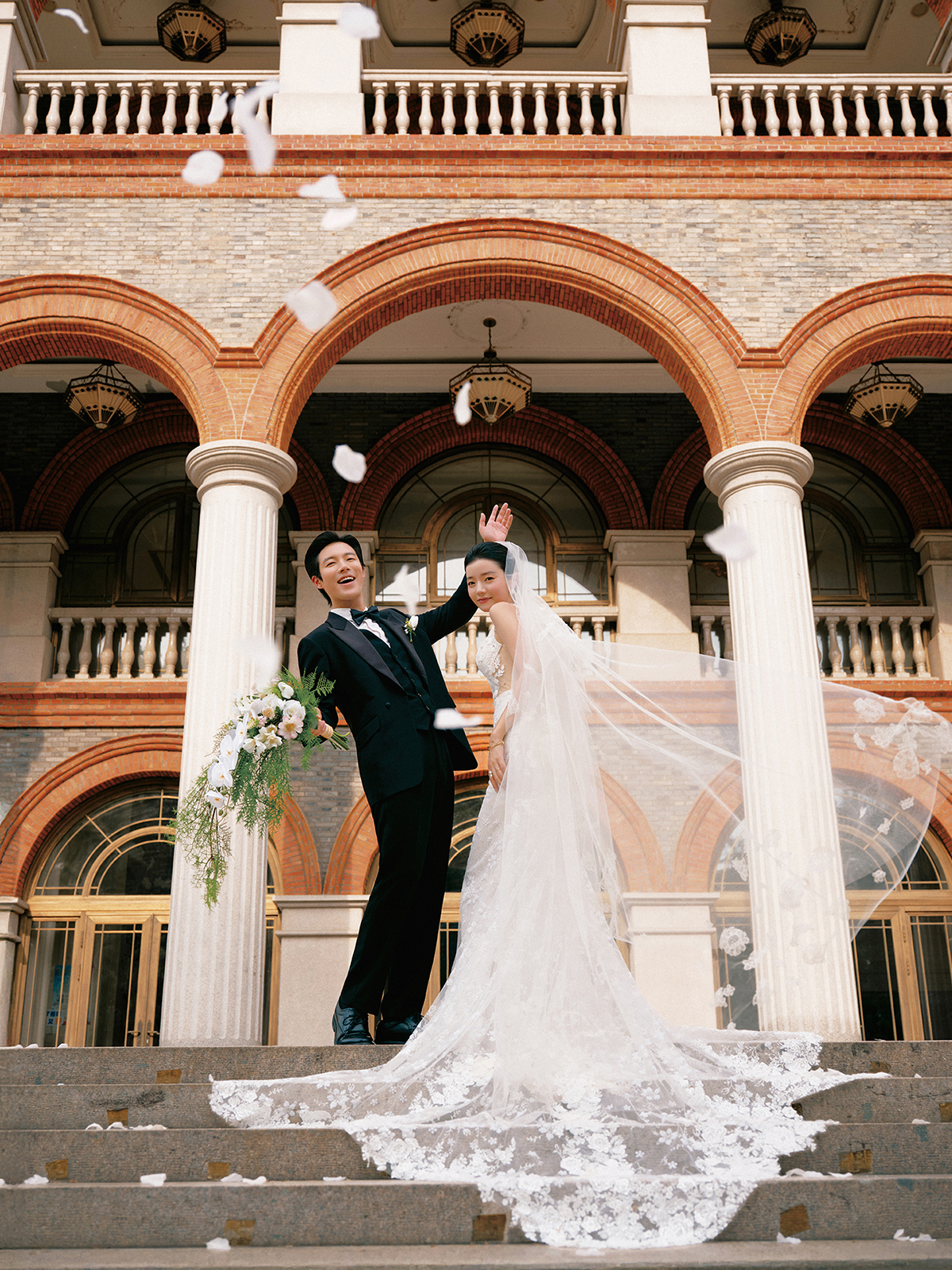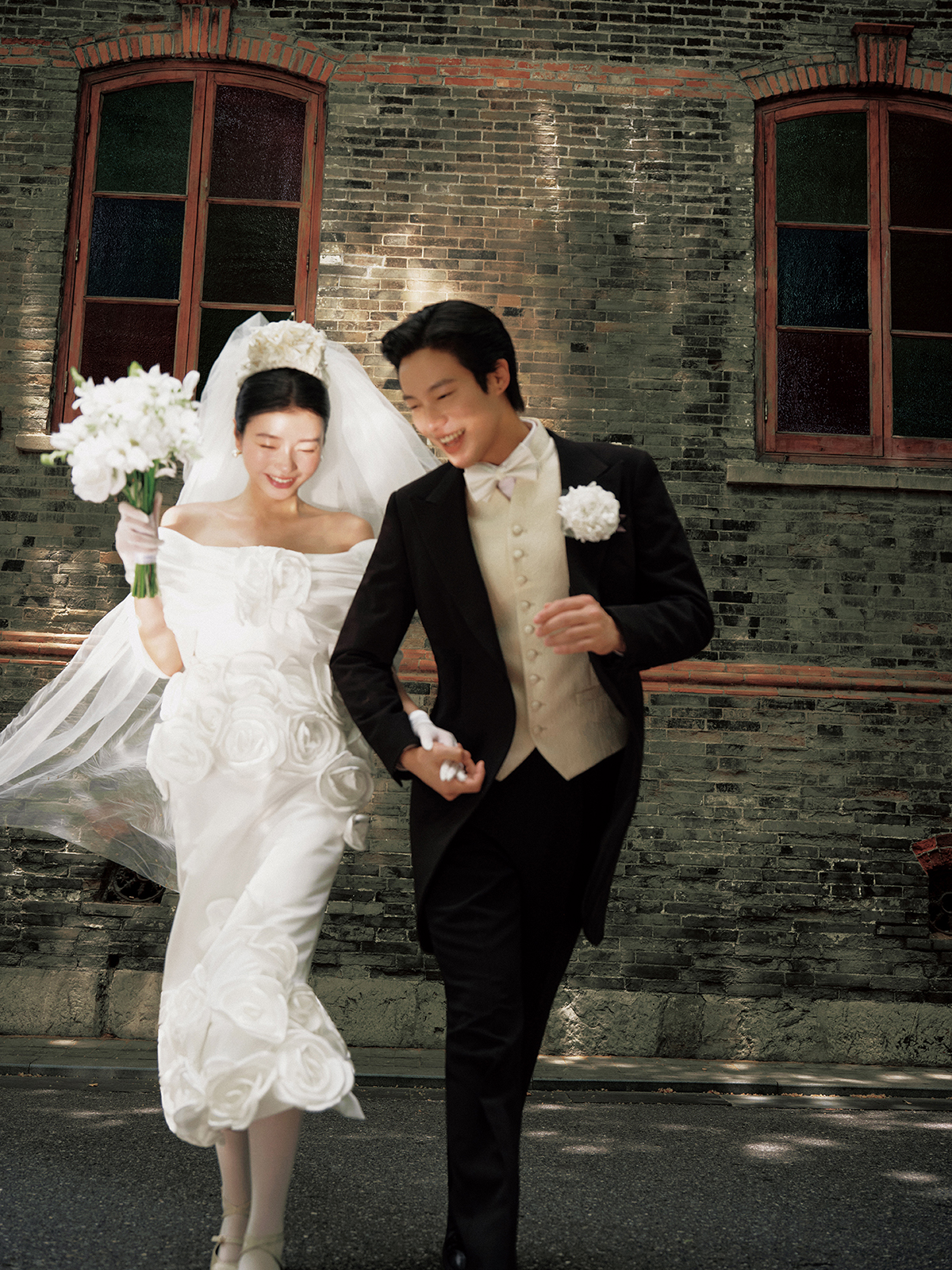 • 风格:街拍|文艺|复古|纪实|电影感 - 白纱被风掀起的瞬间,像把时光都写成了情书 一起在钟楼下奔跑 拱门把阳光剪成温柔的形状 花瓣落在发梢,连空气里都飘着“我愿意”的回音 喜欢这种不刻意的松弛感 每一帧都像老电影里没说出口的心动#韩式街拍婚纱照