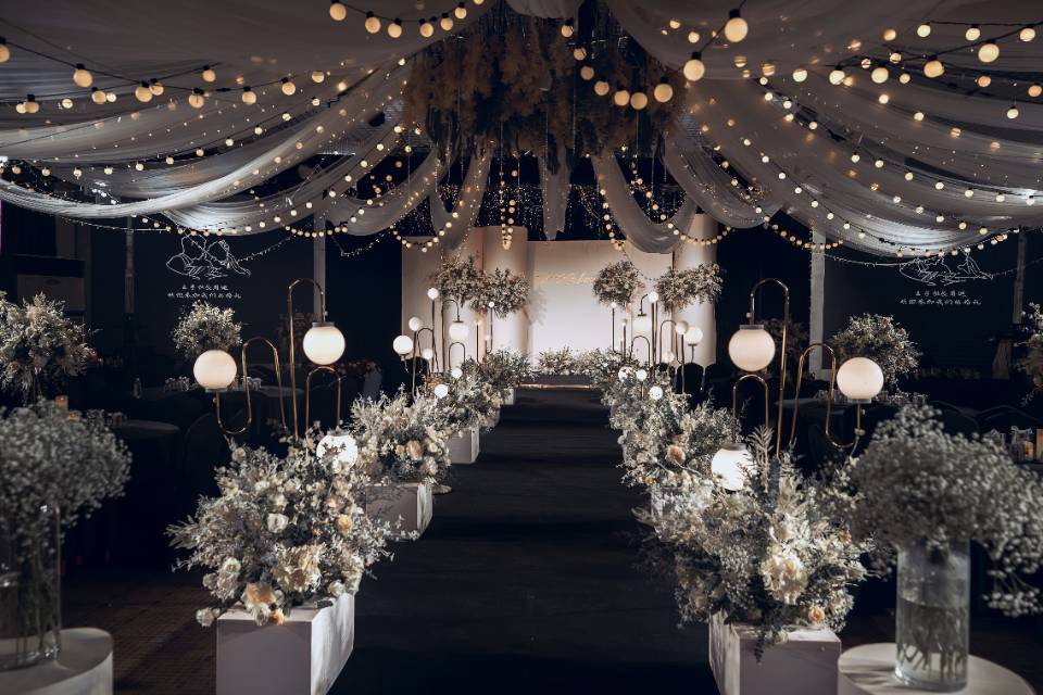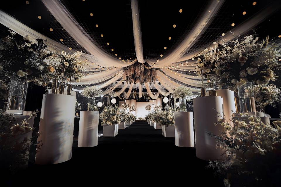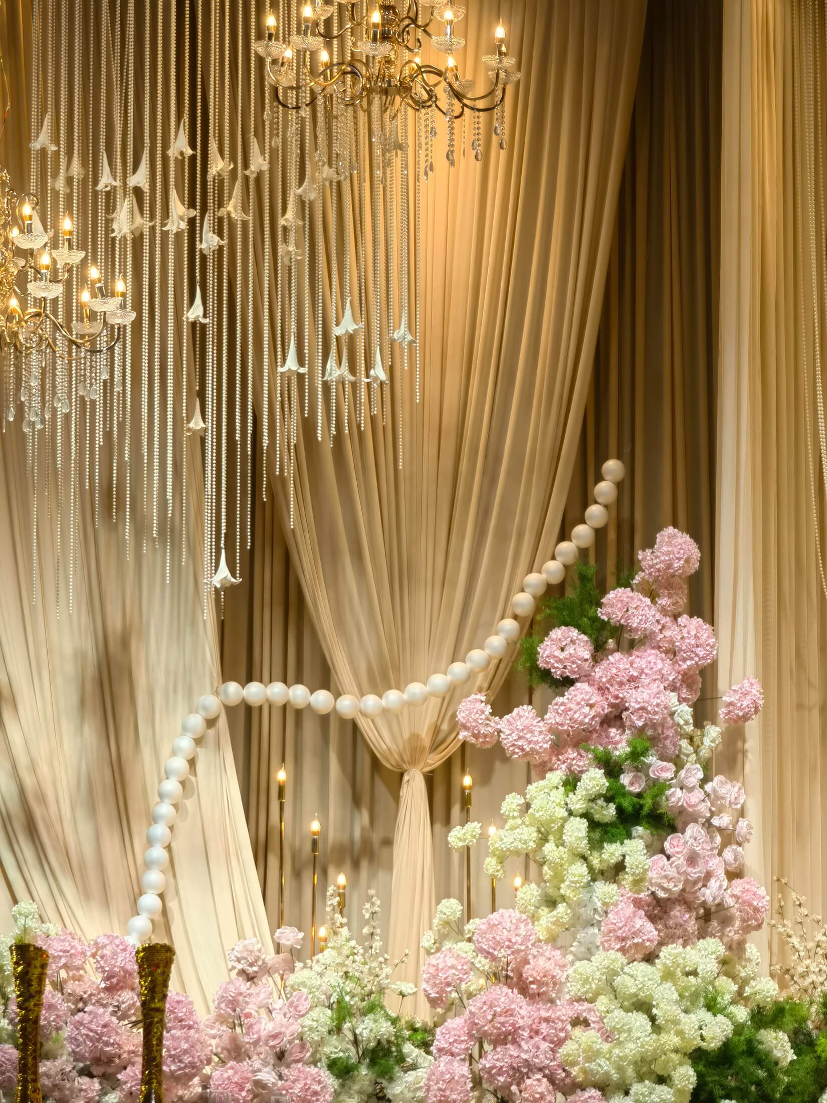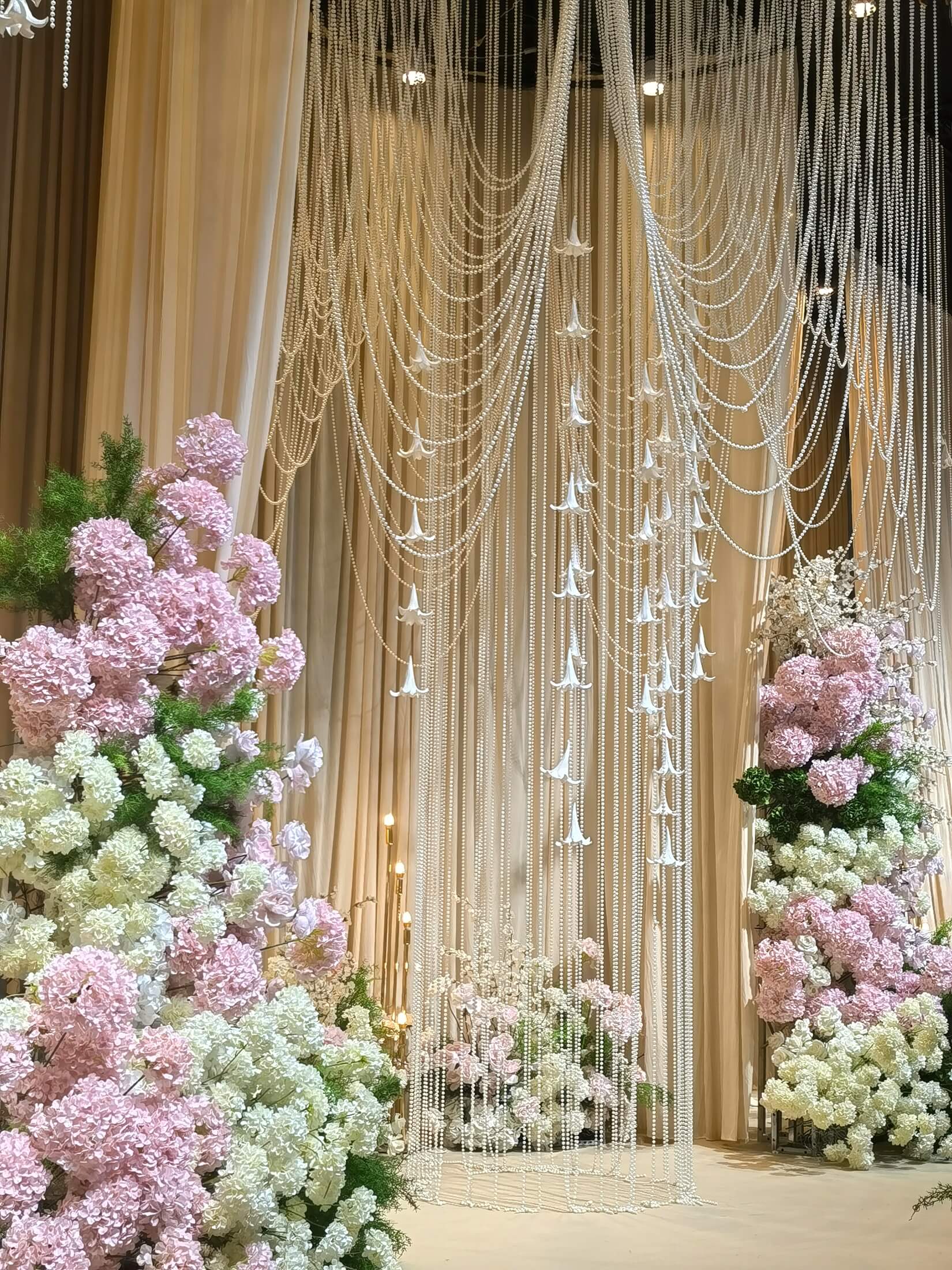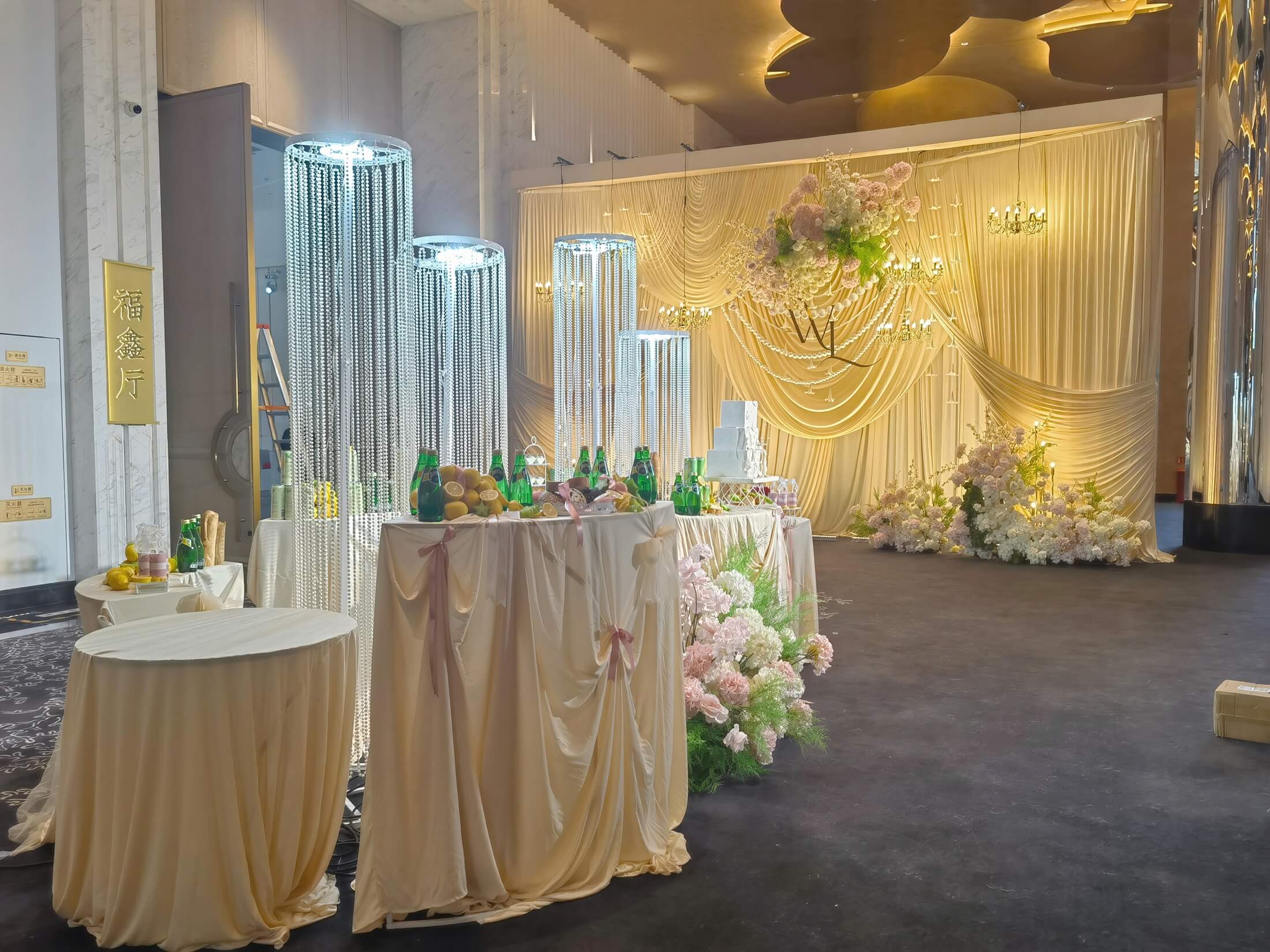 • 布幔与光影的主场 韩式温柔感都凝聚在此刻 🥂 水晶线帘与层叠的琉璃 塑造闪耀的视觉动态美感 在香槟色温柔包裹下 布幔垂挂出自然的纹理 💫 空气中弥漫着优雅的气息 那一道质感镜面舞台 映衬出流光溢彩的故事 当爱款款而来光之指引 亦是心之所向 🤍#氛围感婚礼