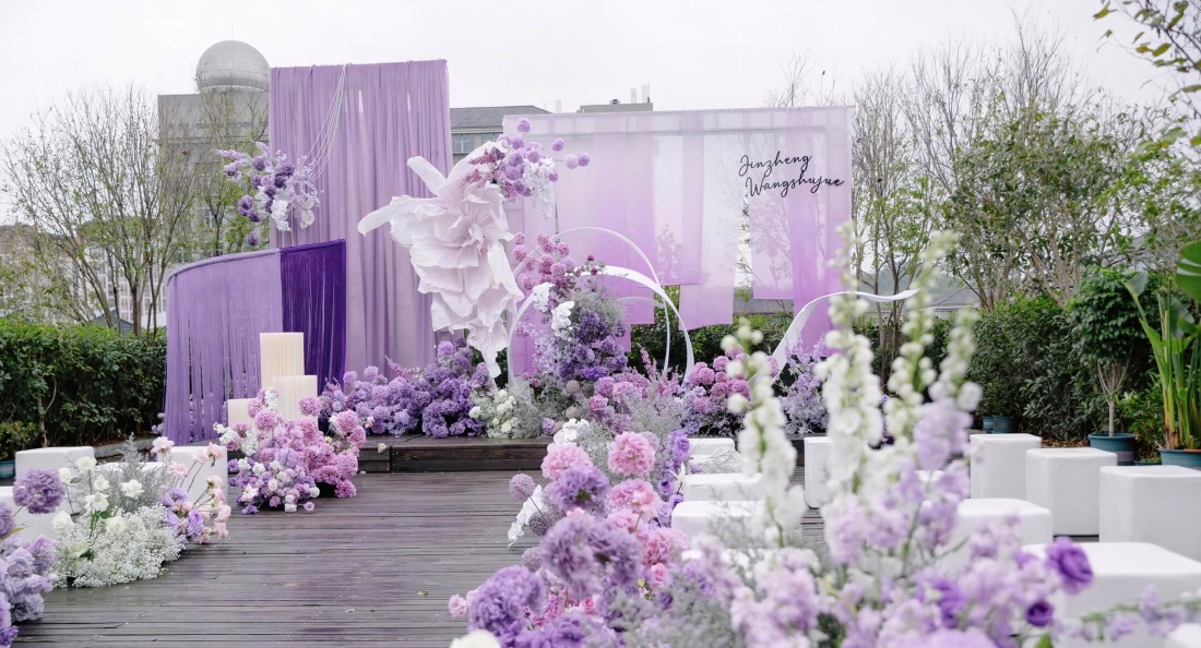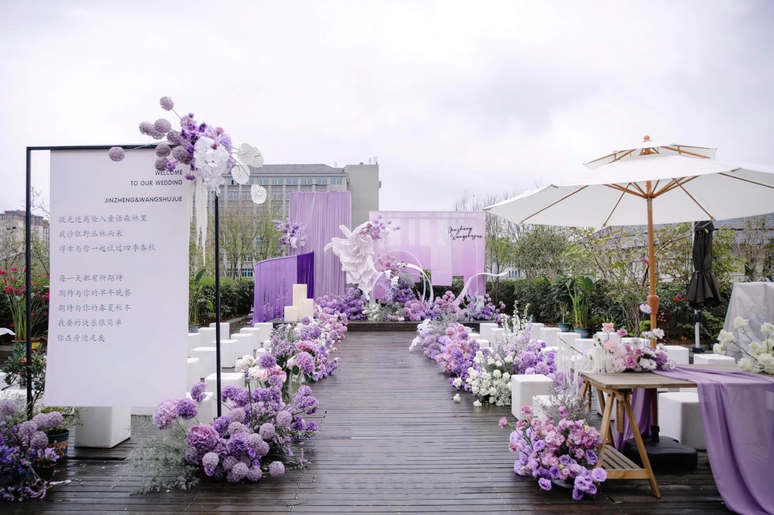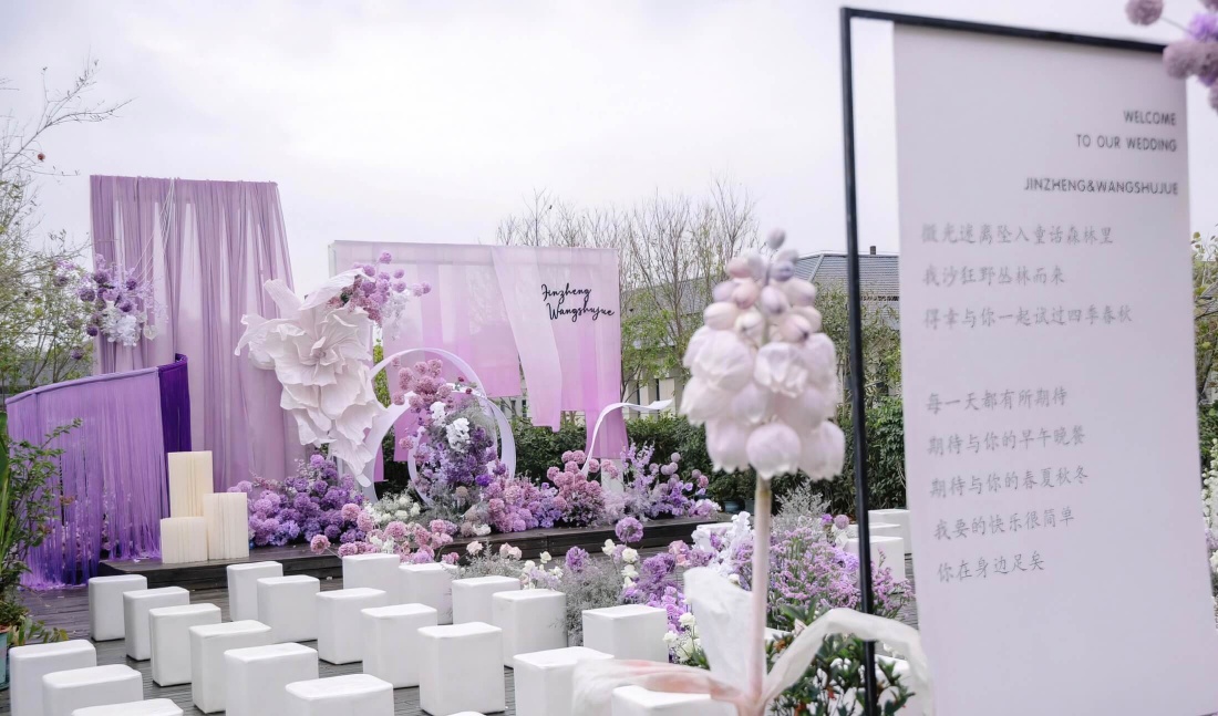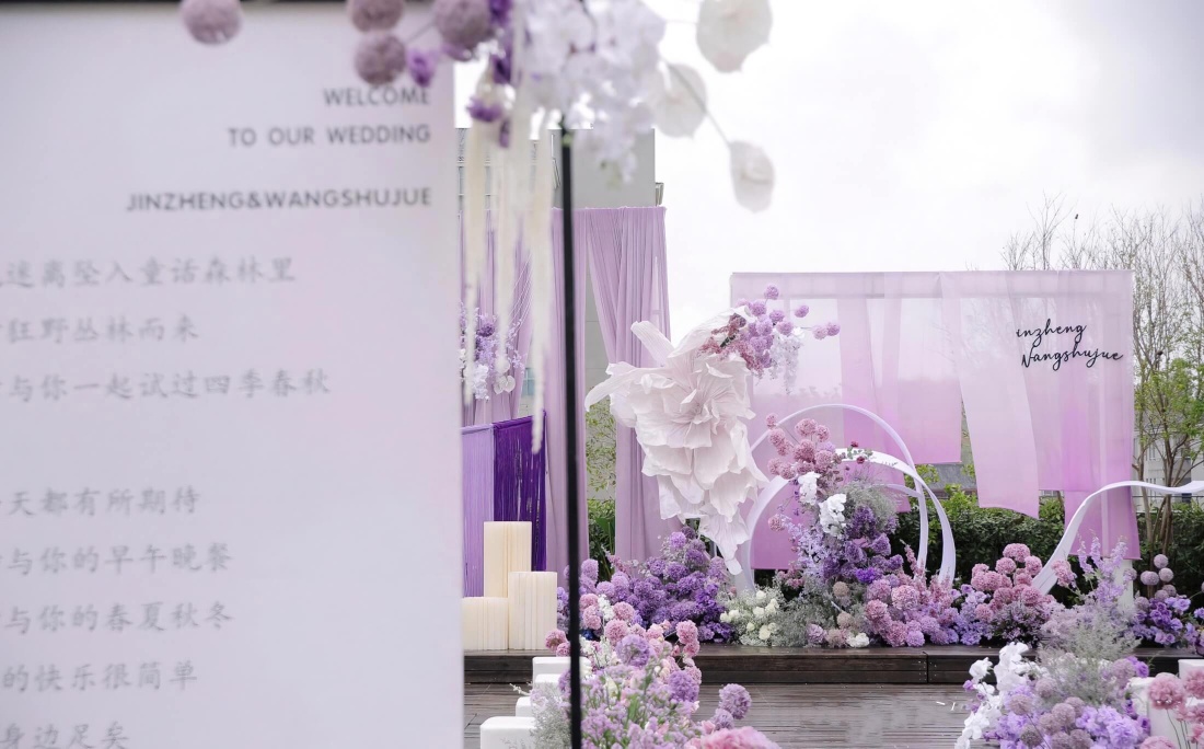 • ​南充绝绝紫💜户外婚礼 真是嘎嘎出片~ 梦幻🫧的紫色系花艺 偶尔点缀了一朵渐变紫纸艺花🌸 搭配白色凳子 小众又高级 ​ ‼️关键小预算噢,小预算🉐#南充户外婚礼##南充小预算婚礼#