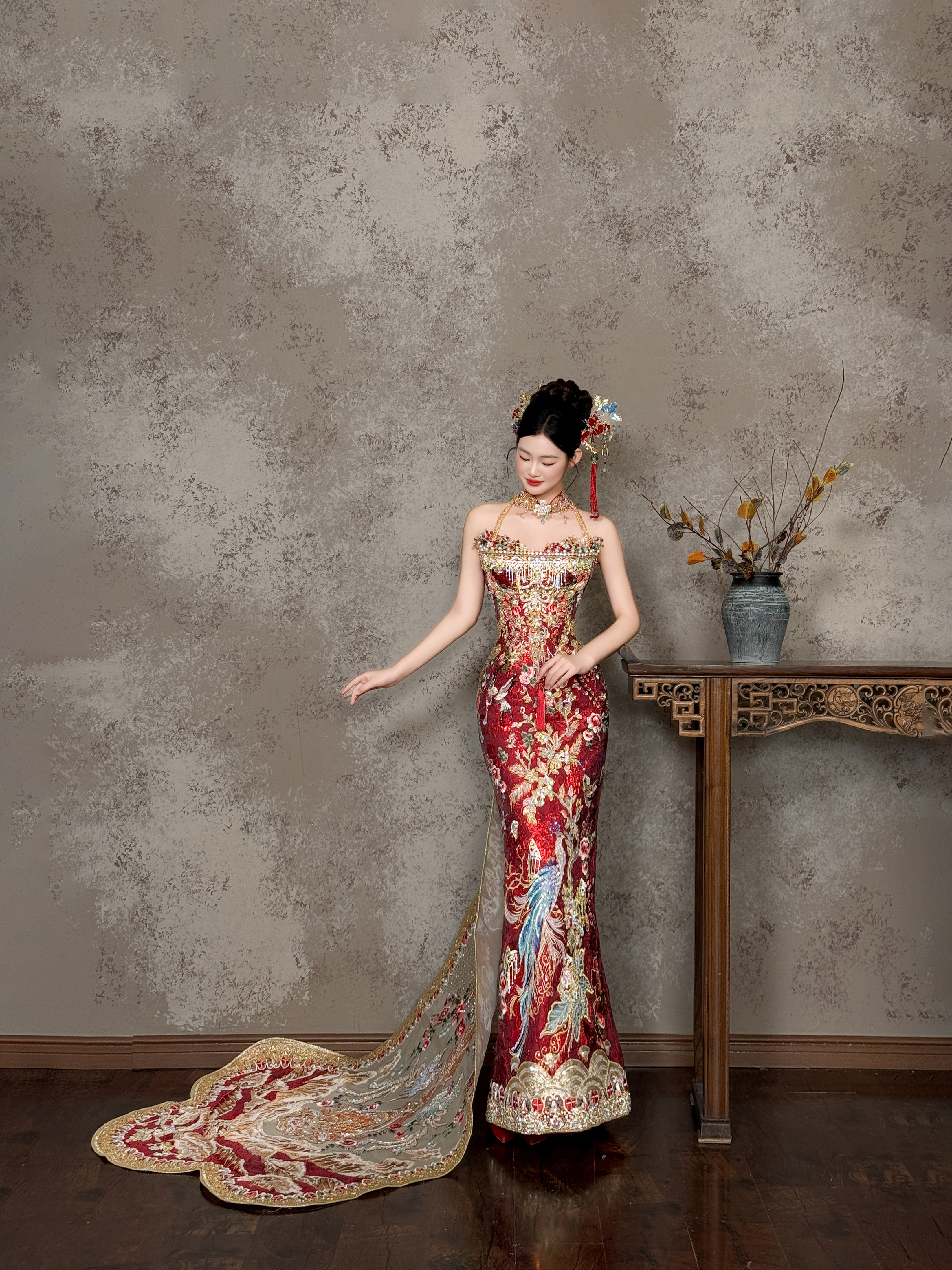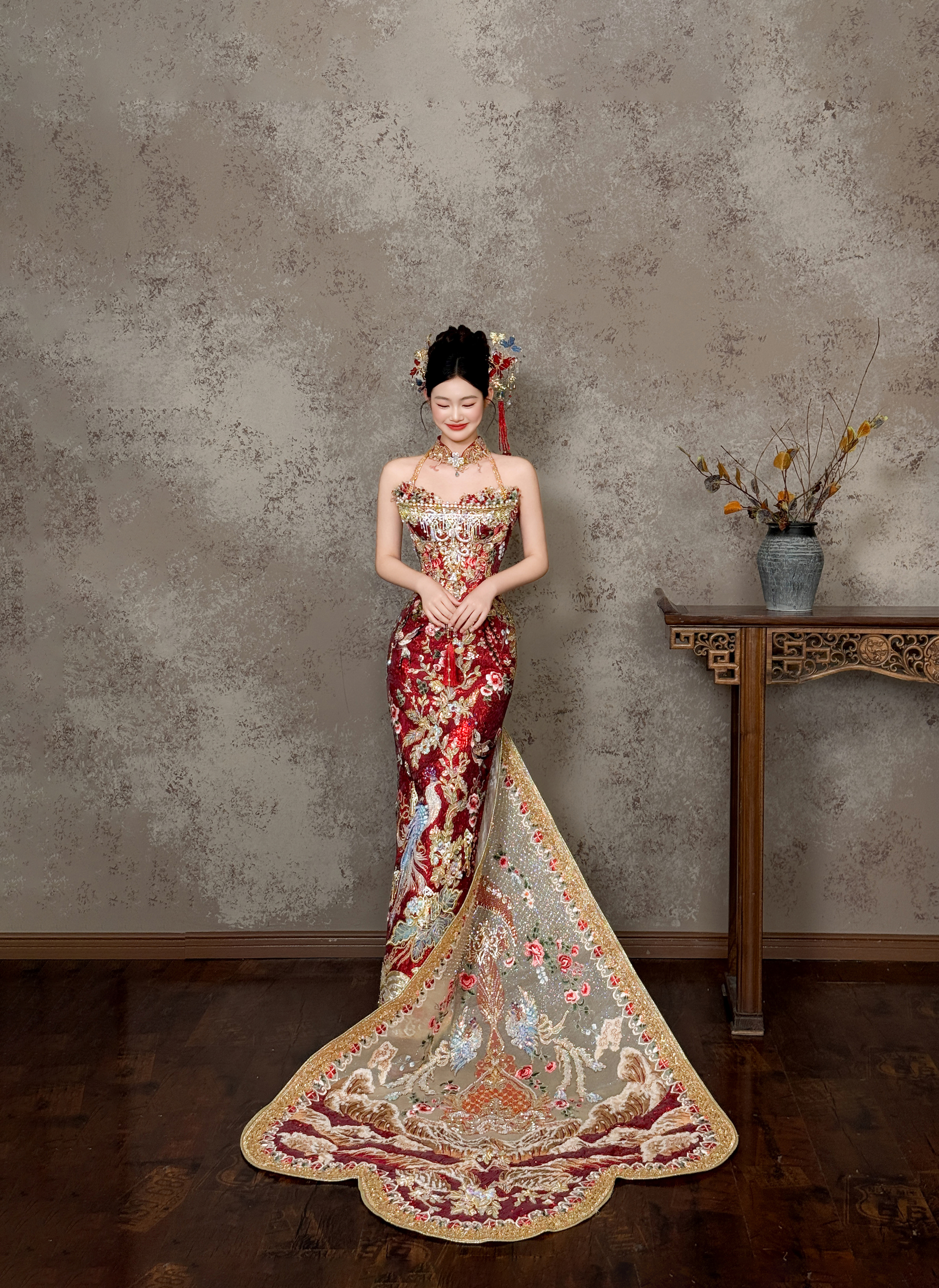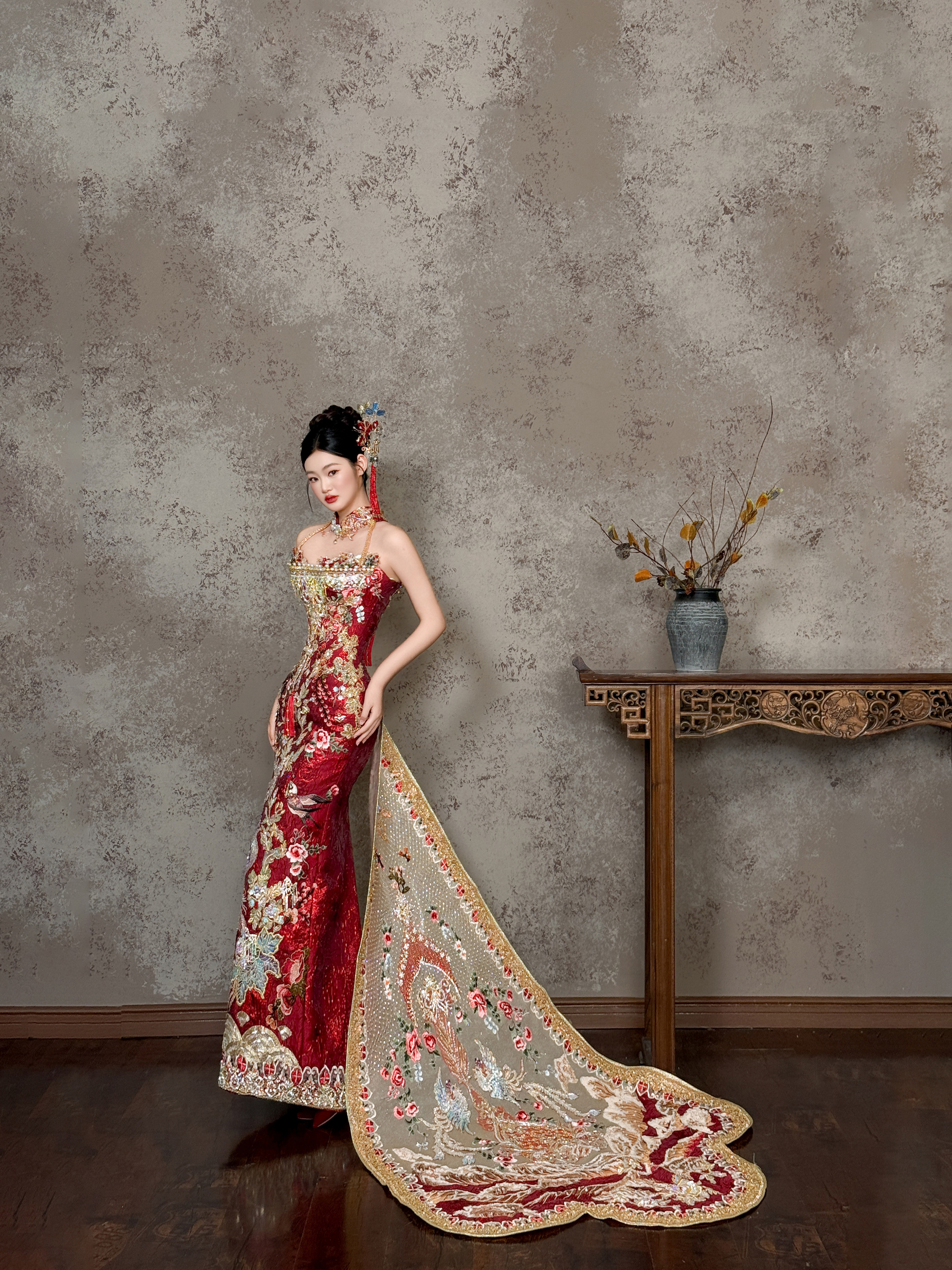 • 古绣|夕颜 这一抹朱砂红绸鱼尾裙 热烈与华贵交织 拿捏东方骨相美 红金配色演绎高级东方韵味 西式鱼尾遇上中式秀禾 为这场视觉盛宴增添了一抹异域风情 裙身勾勒精美古典画卷 东方繁华融入南洋风情 立体刺绣自带荣华气质 拖尾披肩自带国风大女主气场#2025国潮婚典进行时