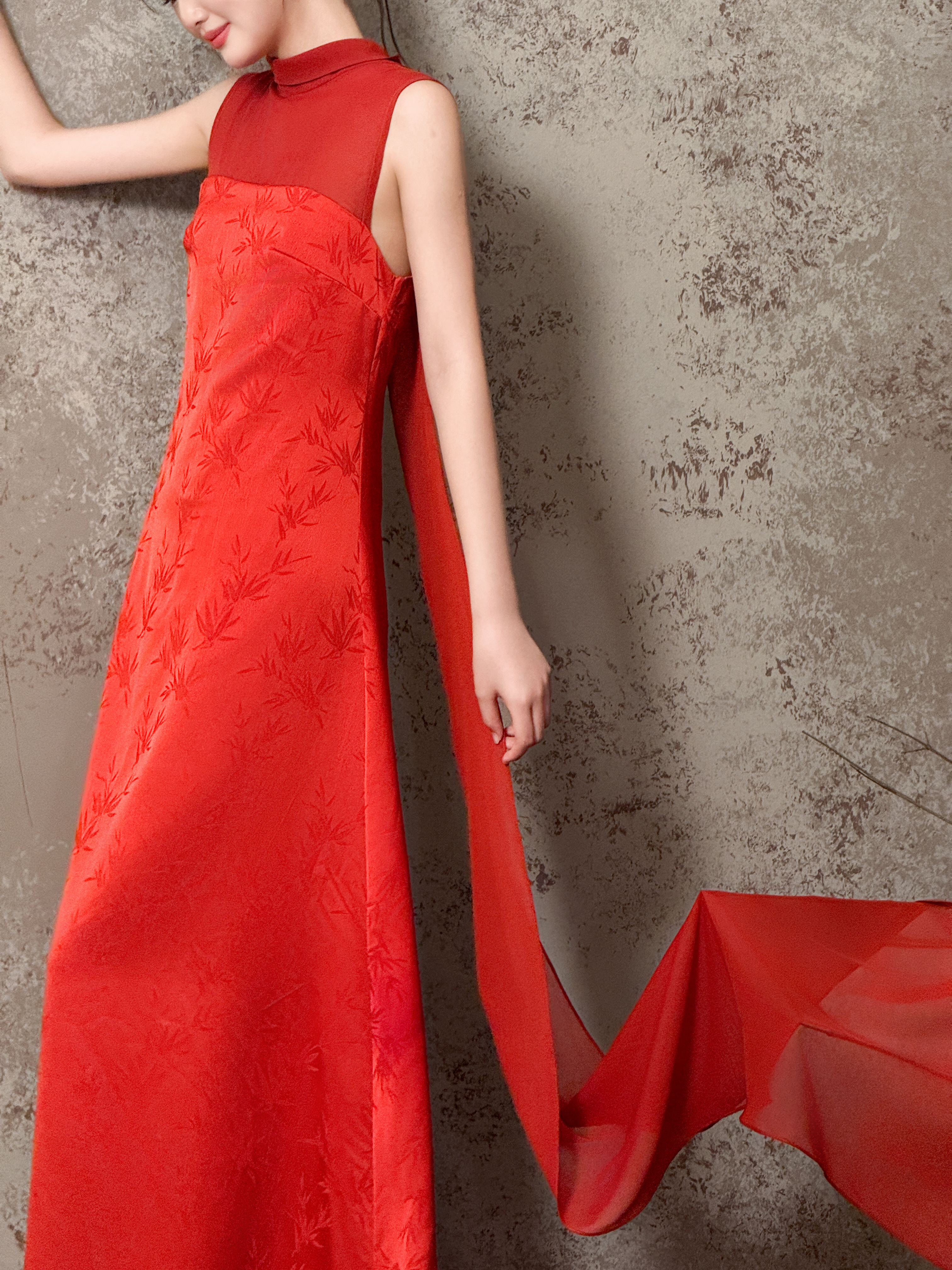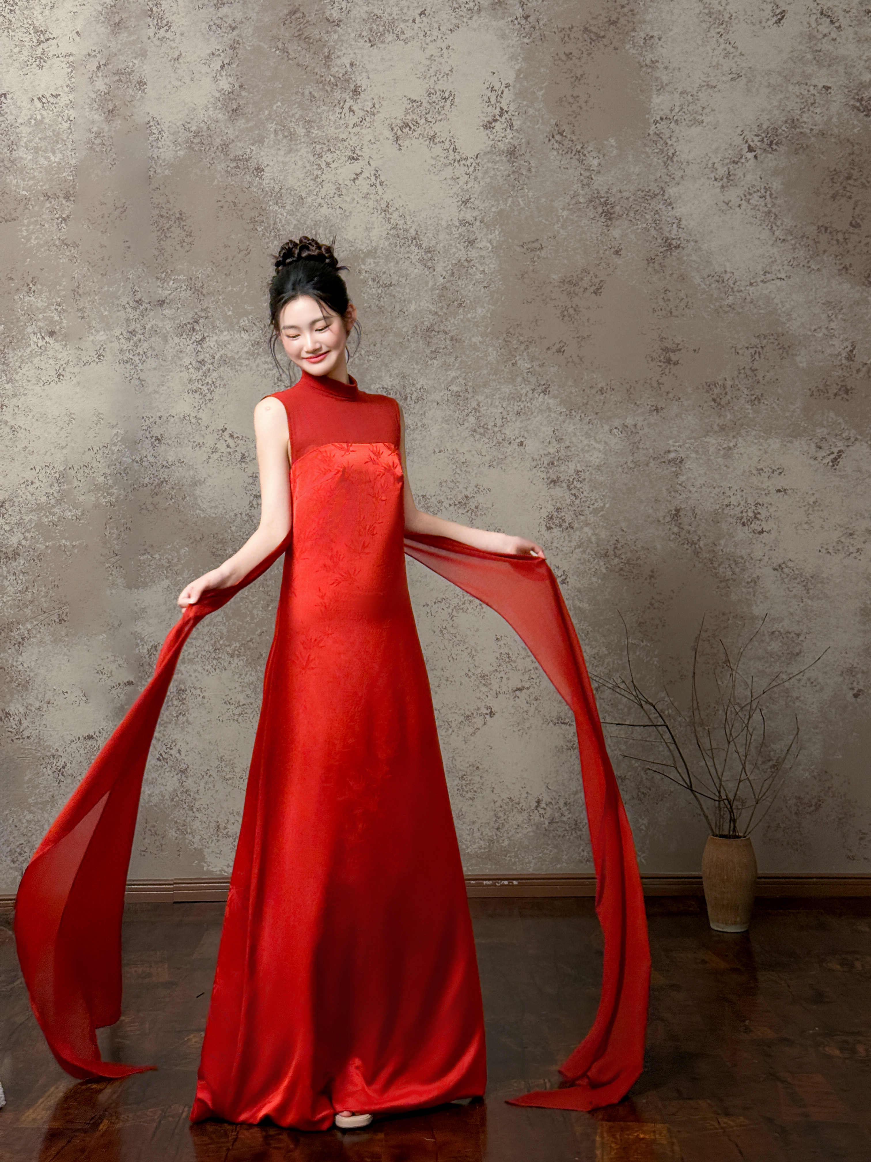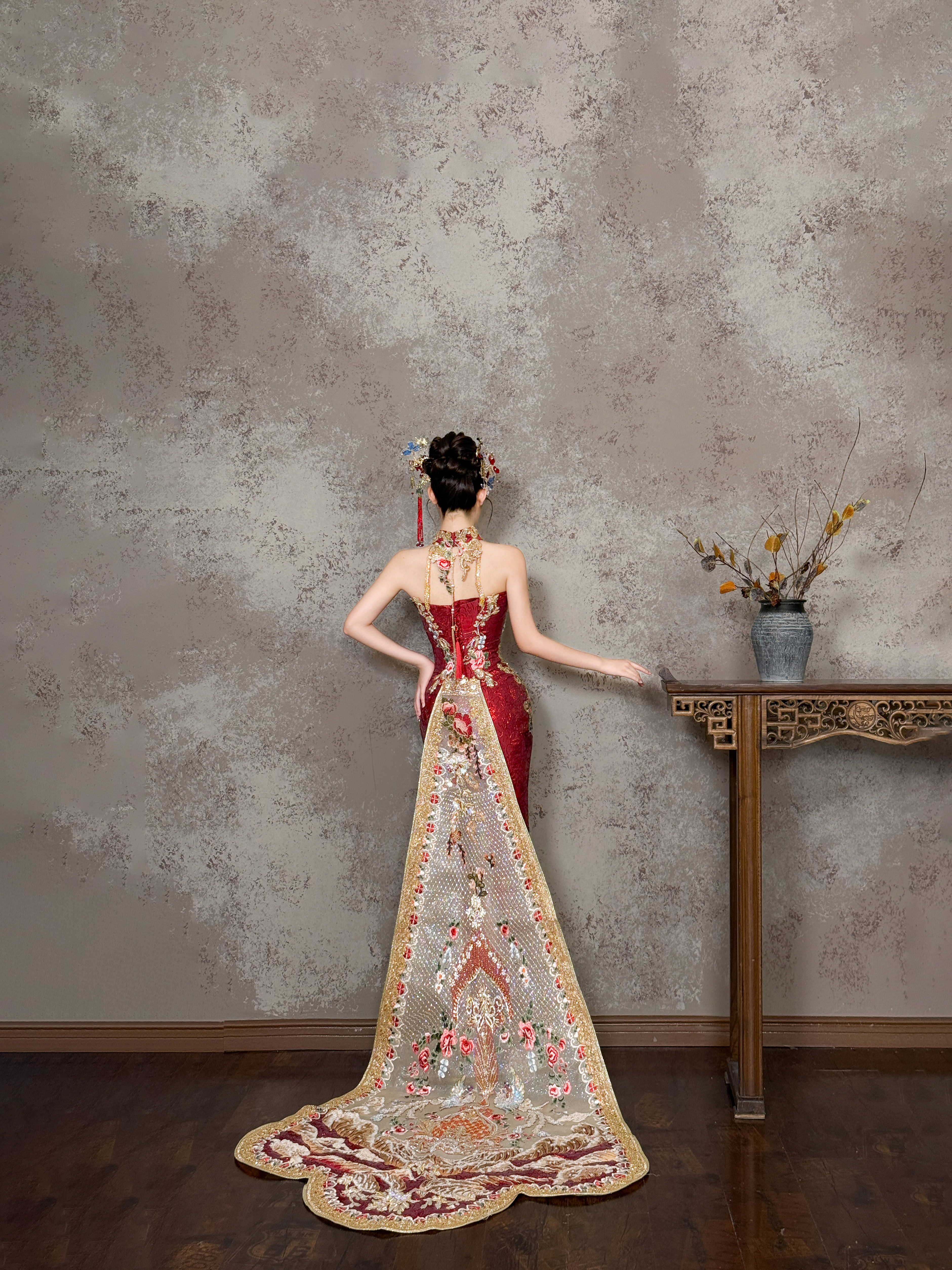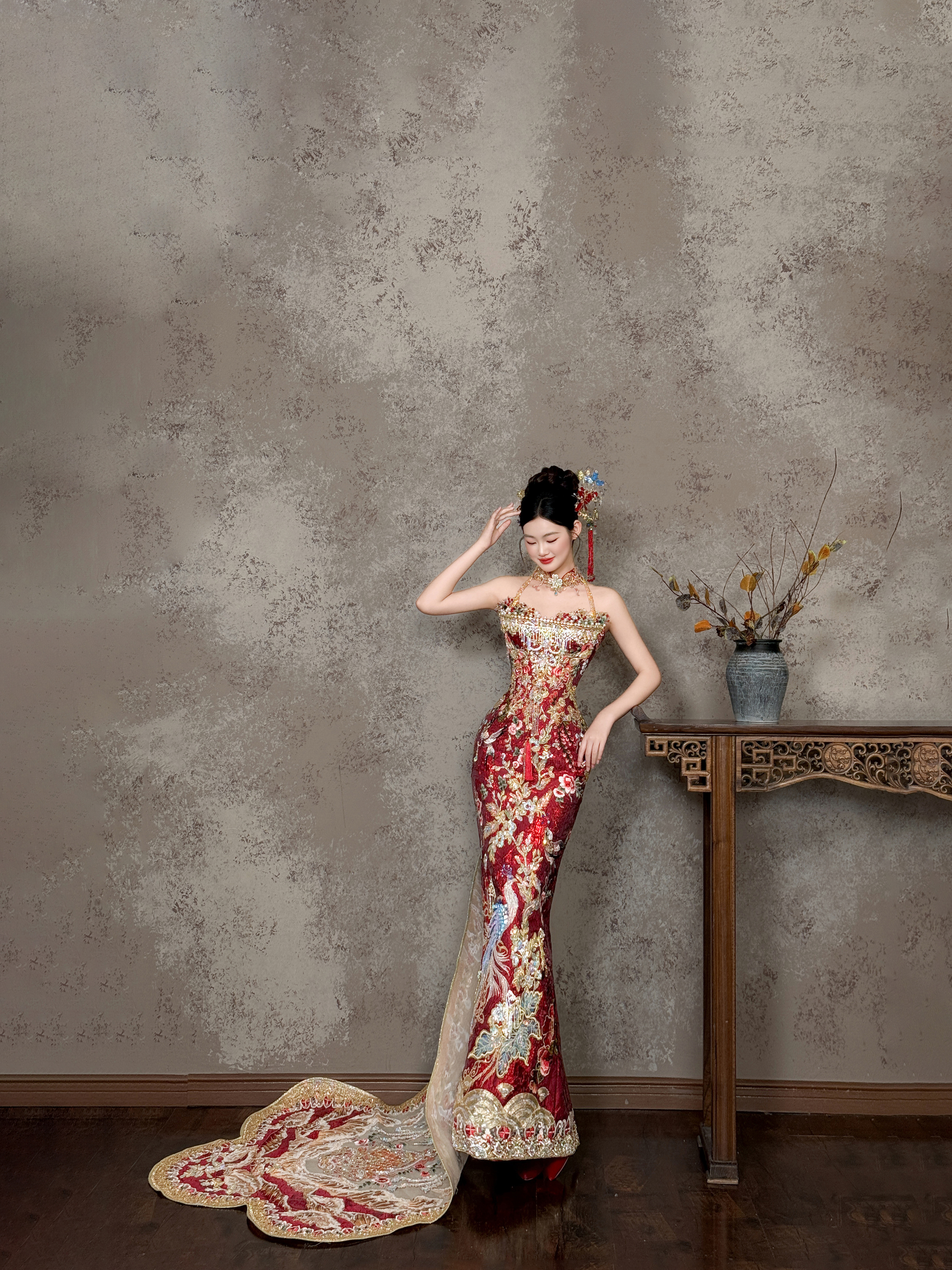 • 古绣|夕颜 这一抹朱砂红绸鱼尾裙 热烈与华贵交织 拿捏东方骨相美 红金配色演绎高级东方韵味 西式鱼尾遇上中式秀禾 为这场视觉盛宴增添了一抹异域风情 裙身勾勒精美古典画卷 东方繁华融入南洋风情 立体刺绣自带荣华气质 拖尾披肩自带国风大女主气场#2025国潮婚典进行时
