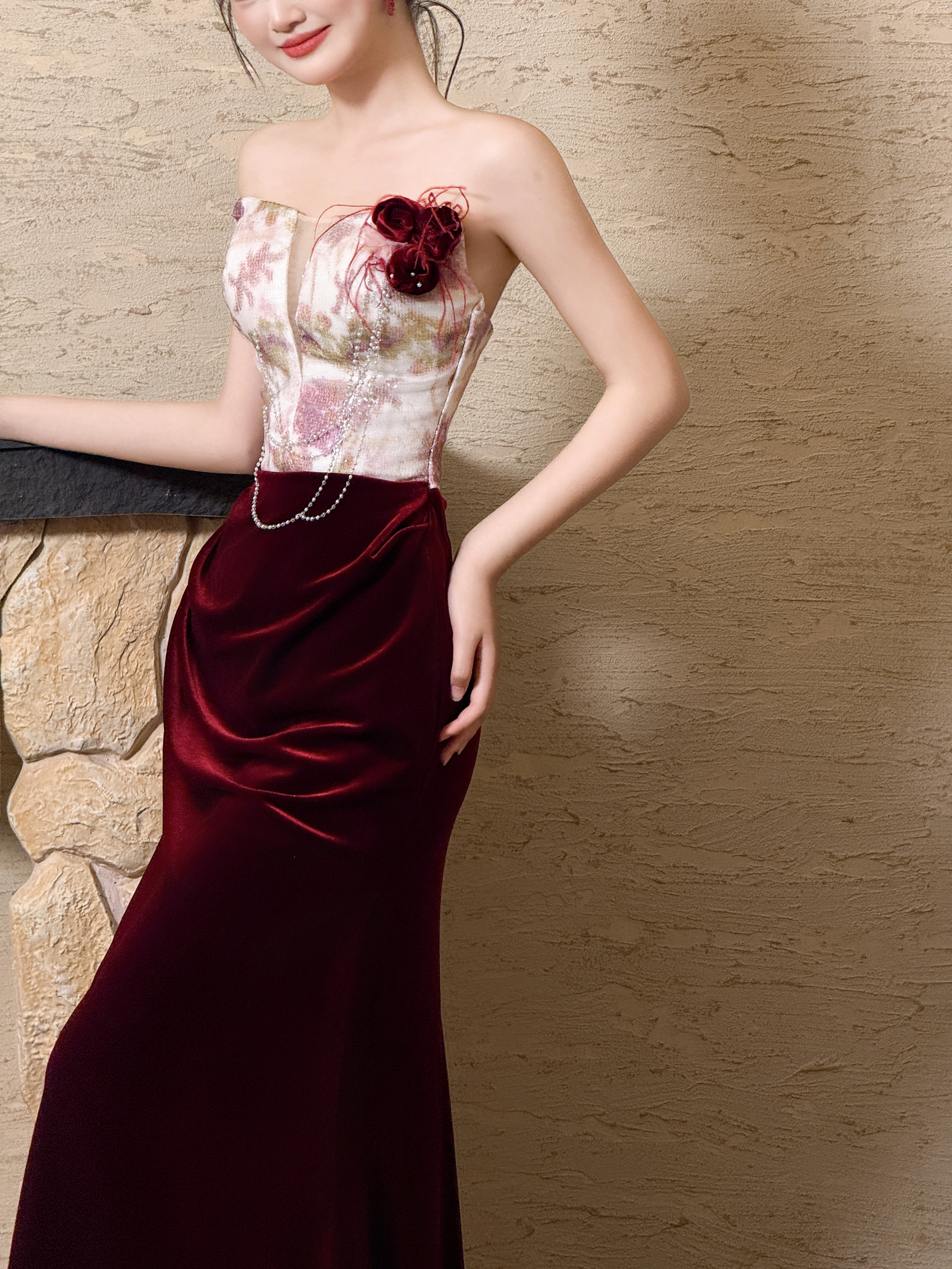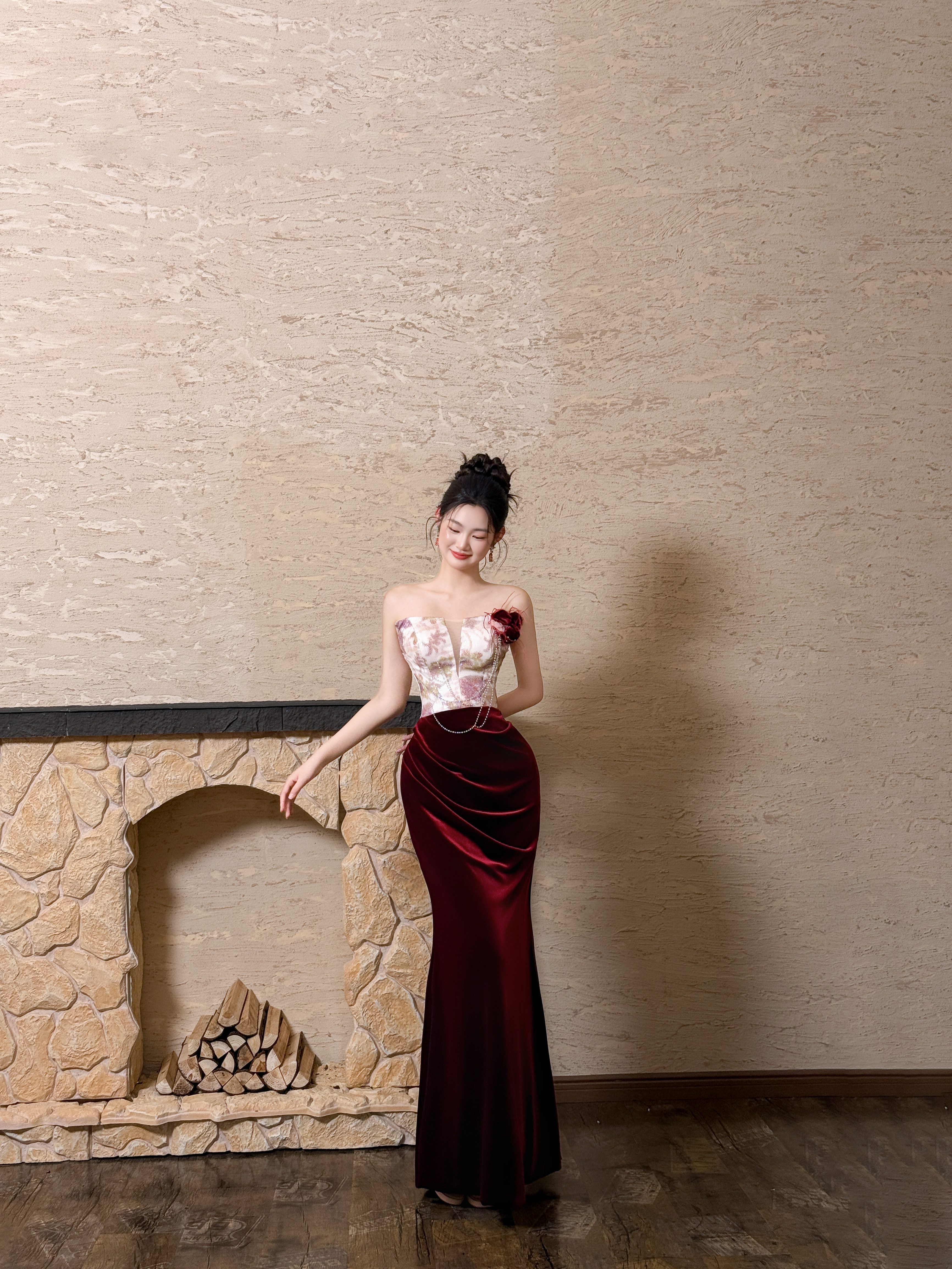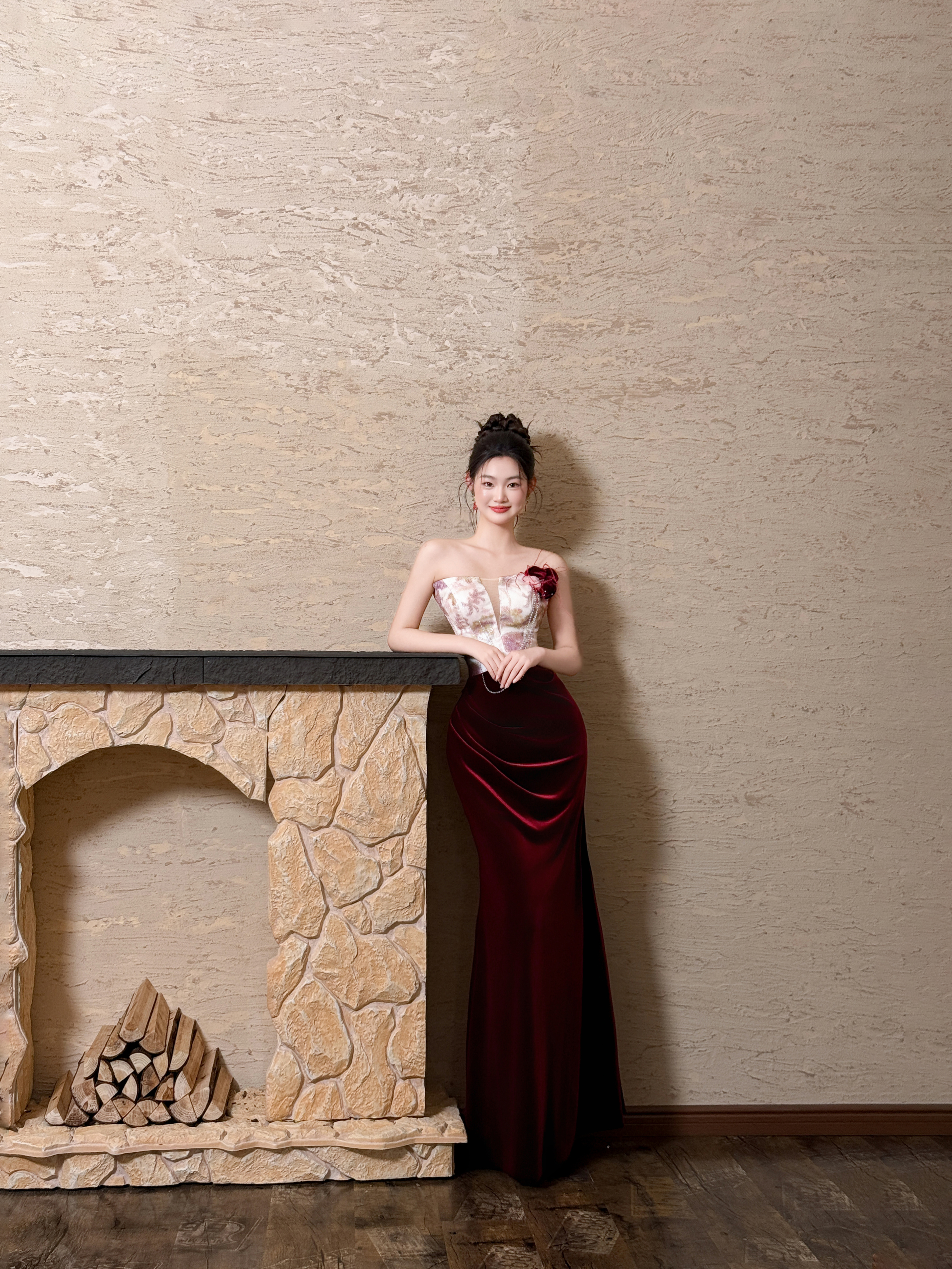 • 红色代表热情似乎的爱情 丝绒的面料高级又落落大方 鱼尾的款式凸显女性柔美优雅的气质 抹胸的设计凸显天鹅颈 酒红色衬的新娘肤色显白 既高级又复古#永远心动的绝美敬酒服