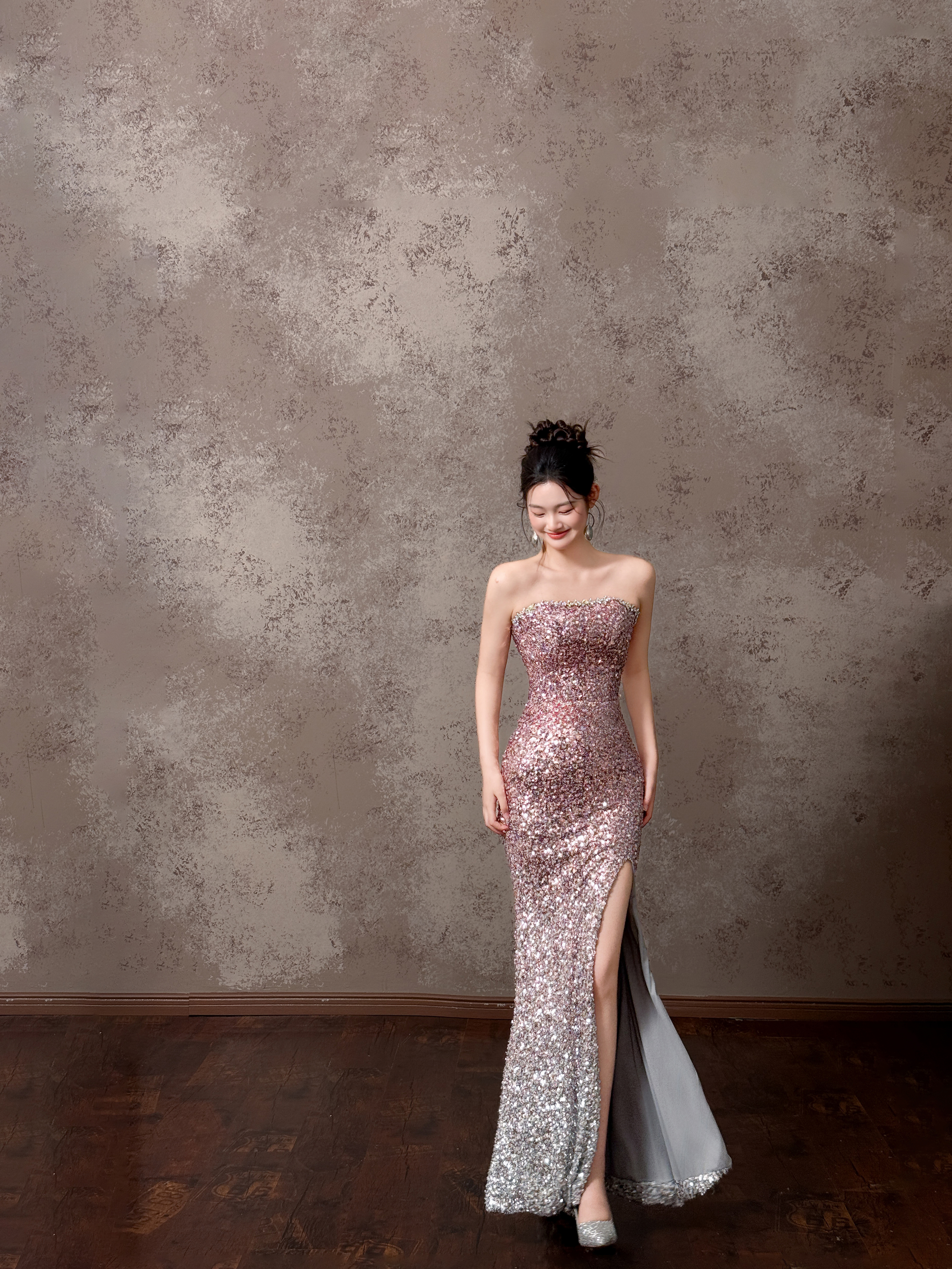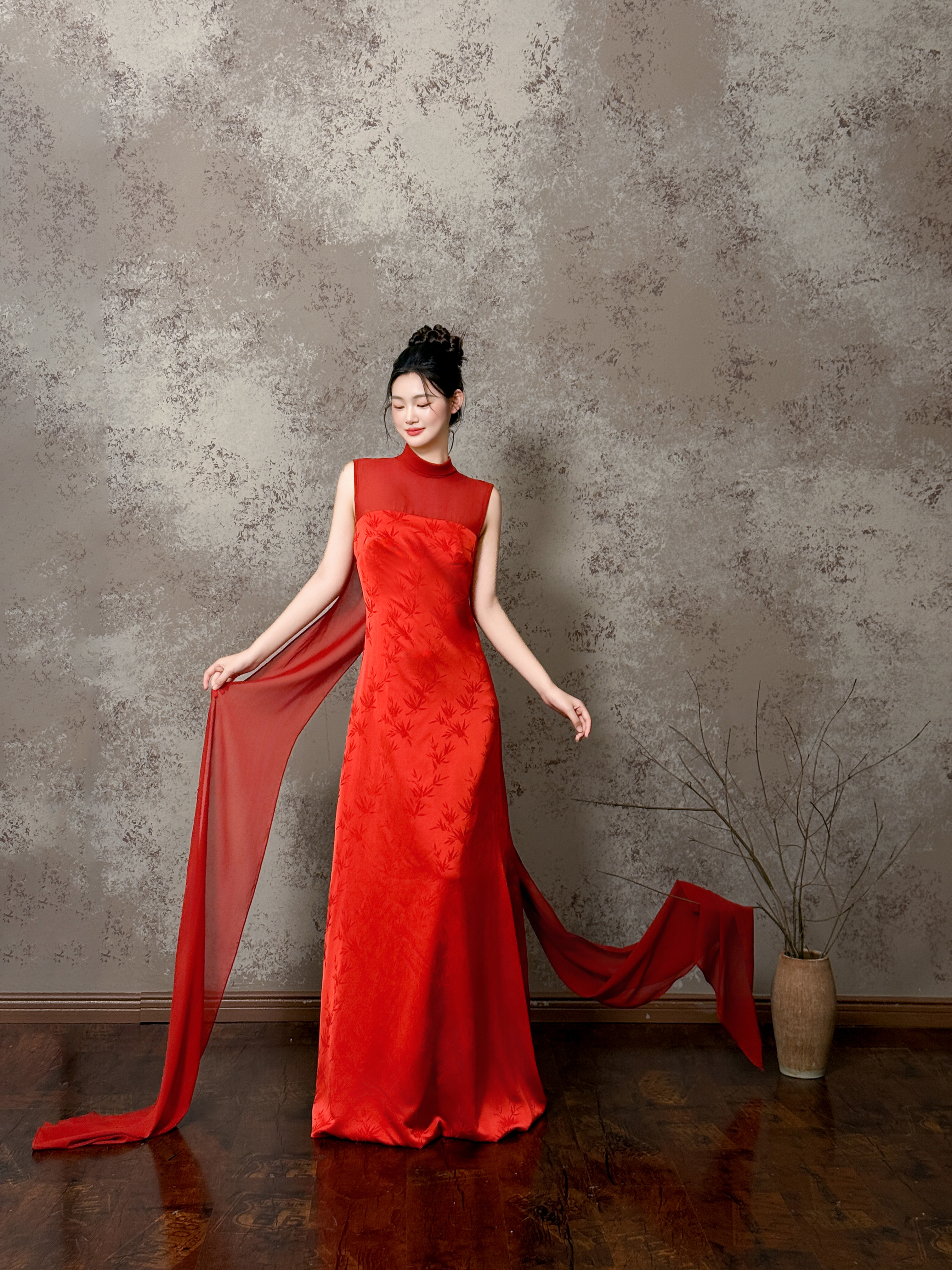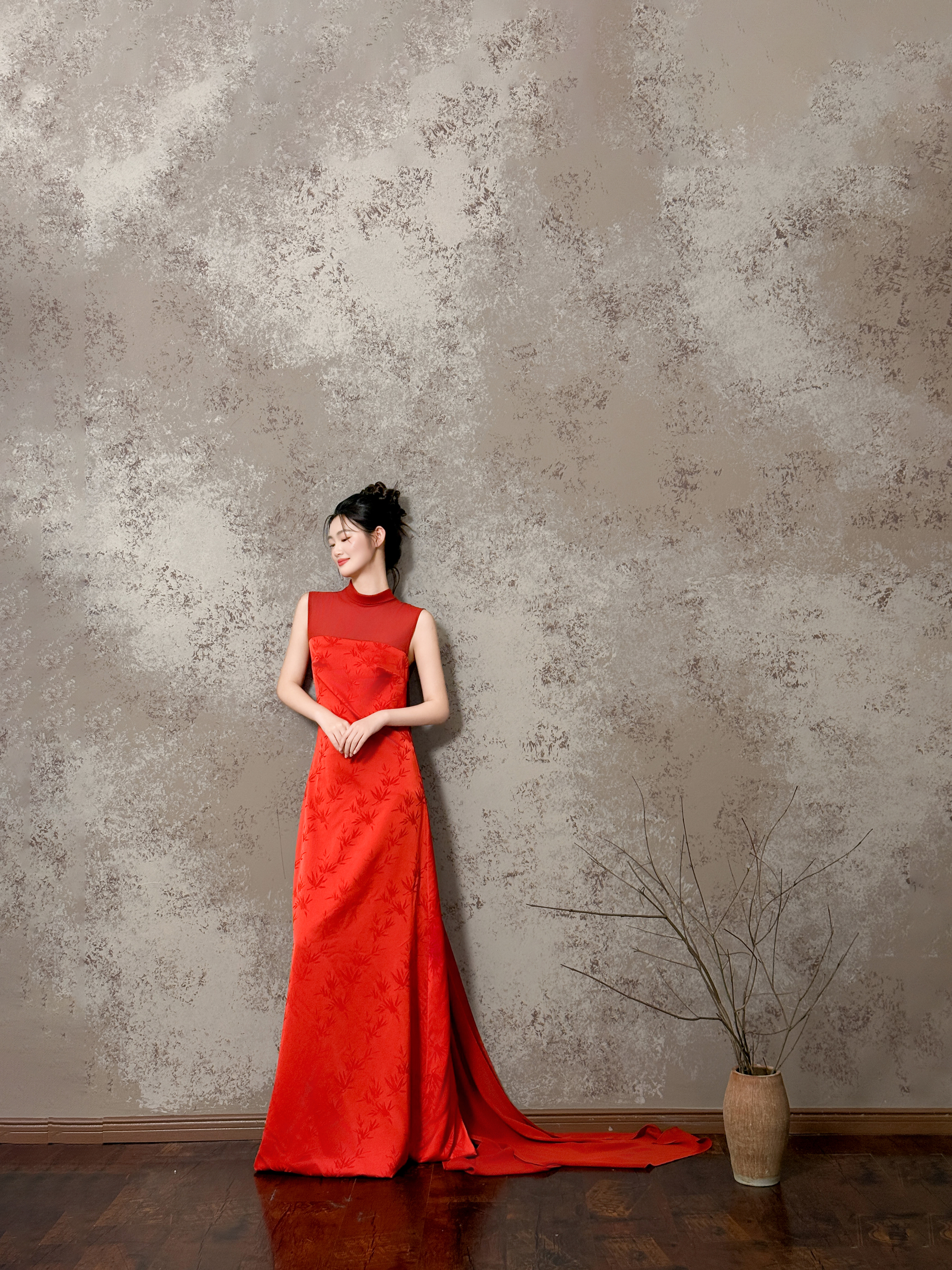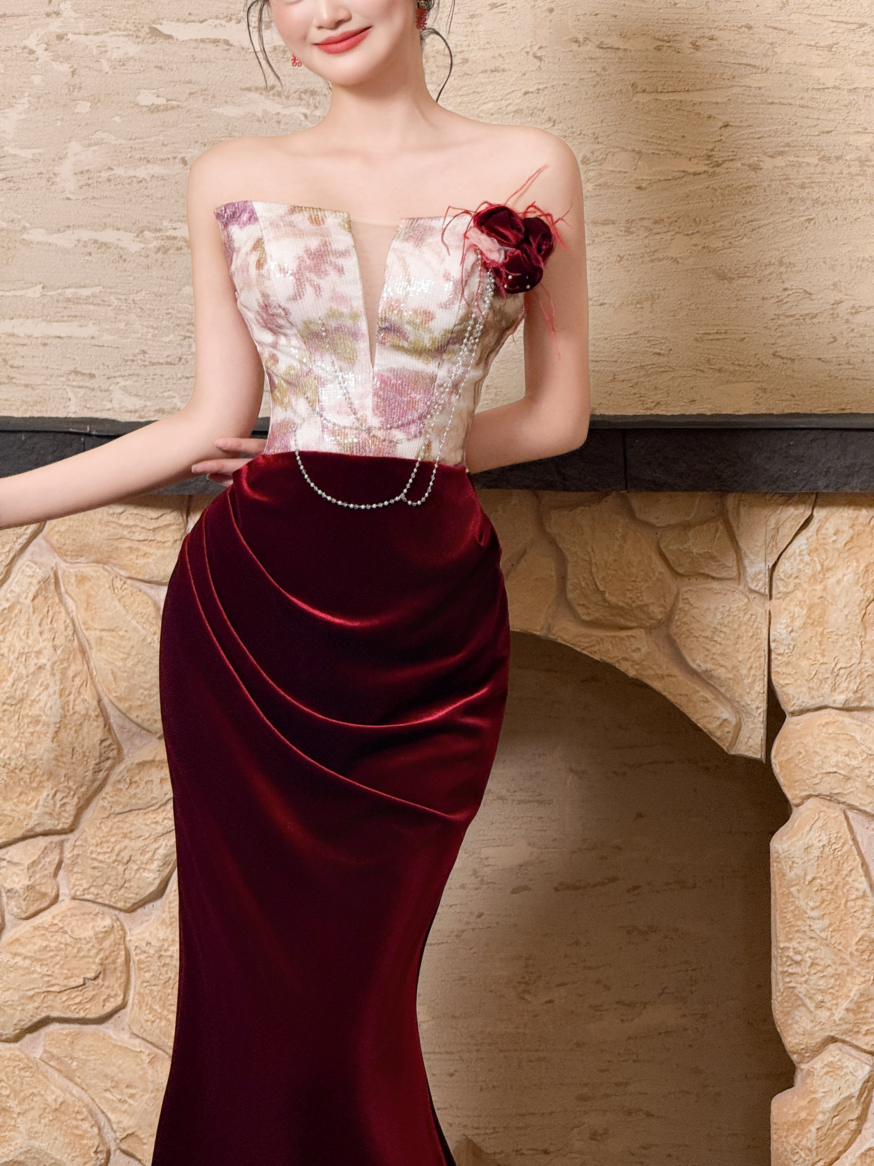 • 红色代表热情似乎的爱情 丝绒的面料高级又落落大方 鱼尾的款式凸显女性柔美优雅的气质 抹胸的设计凸显天鹅颈 酒红色衬的新娘肤色显白 既高级又复古#永远心动的绝美敬酒服