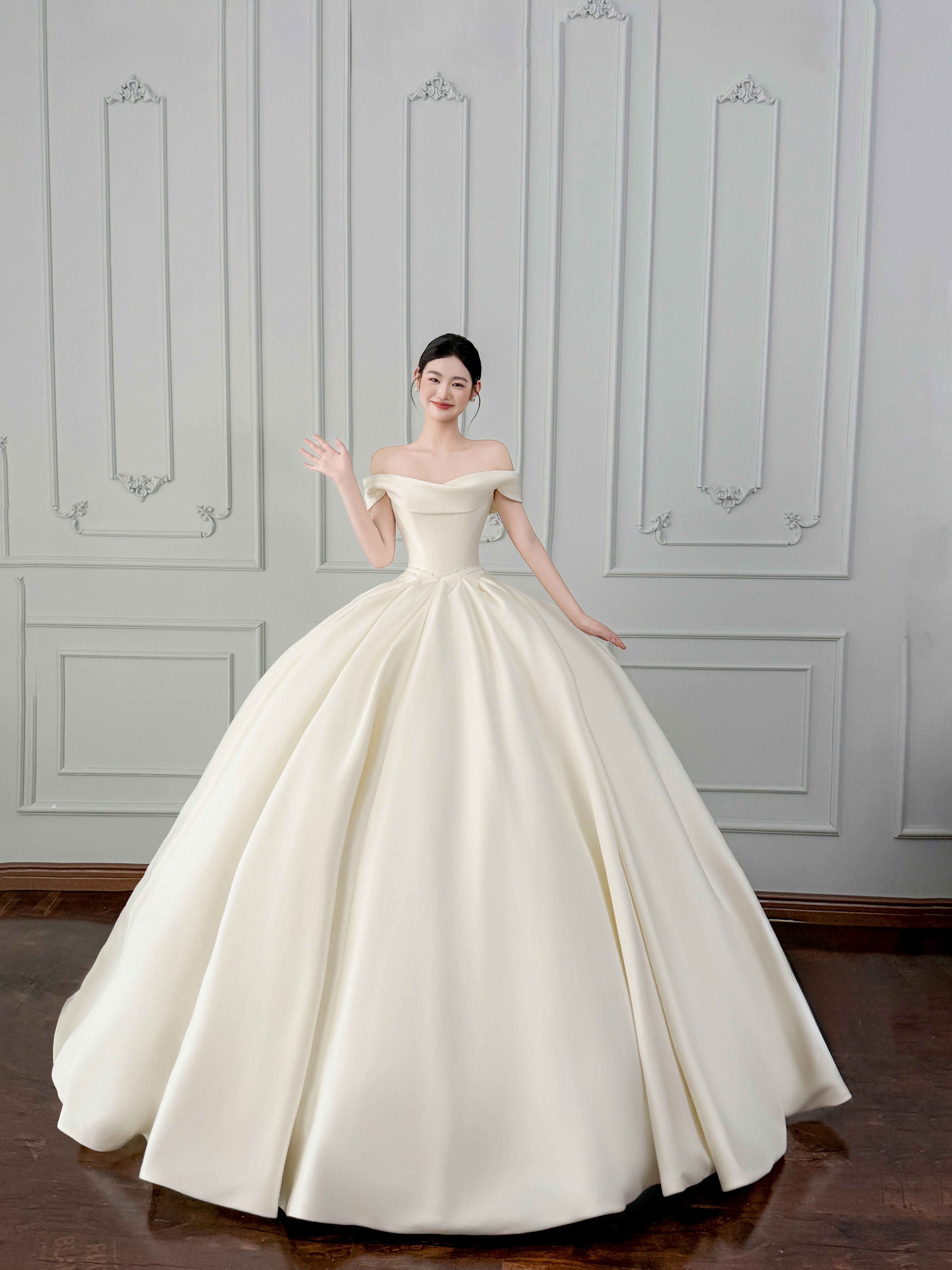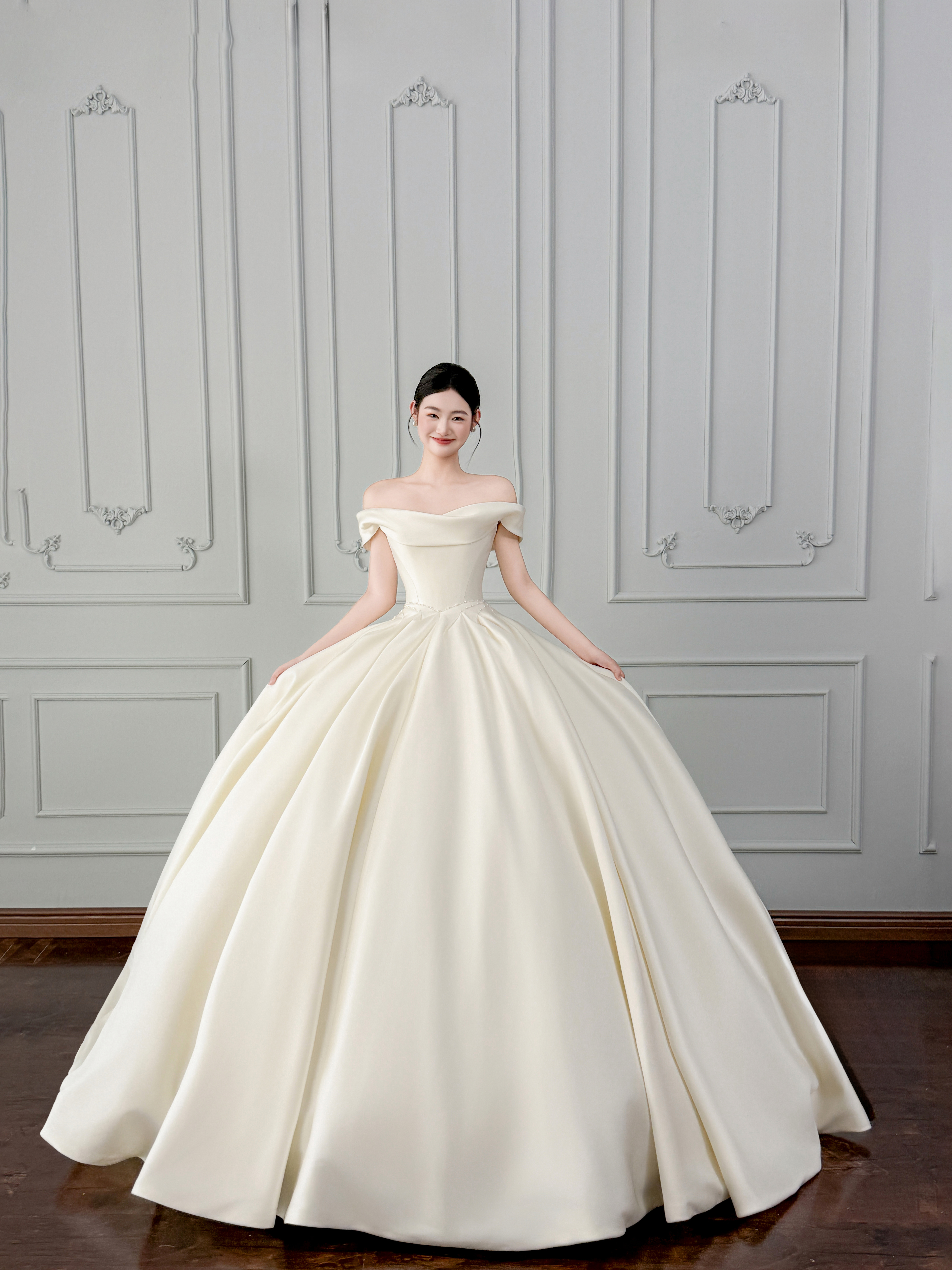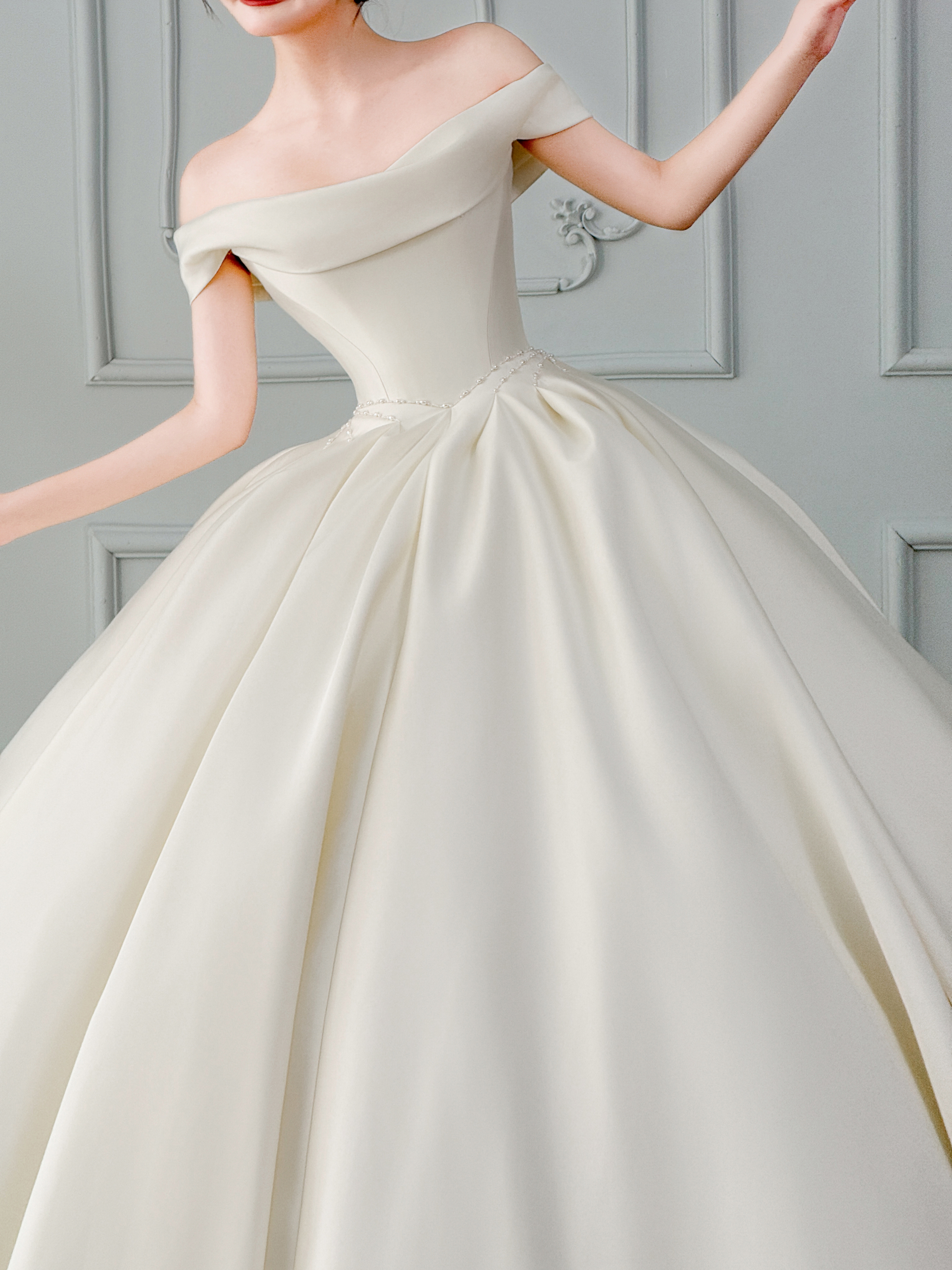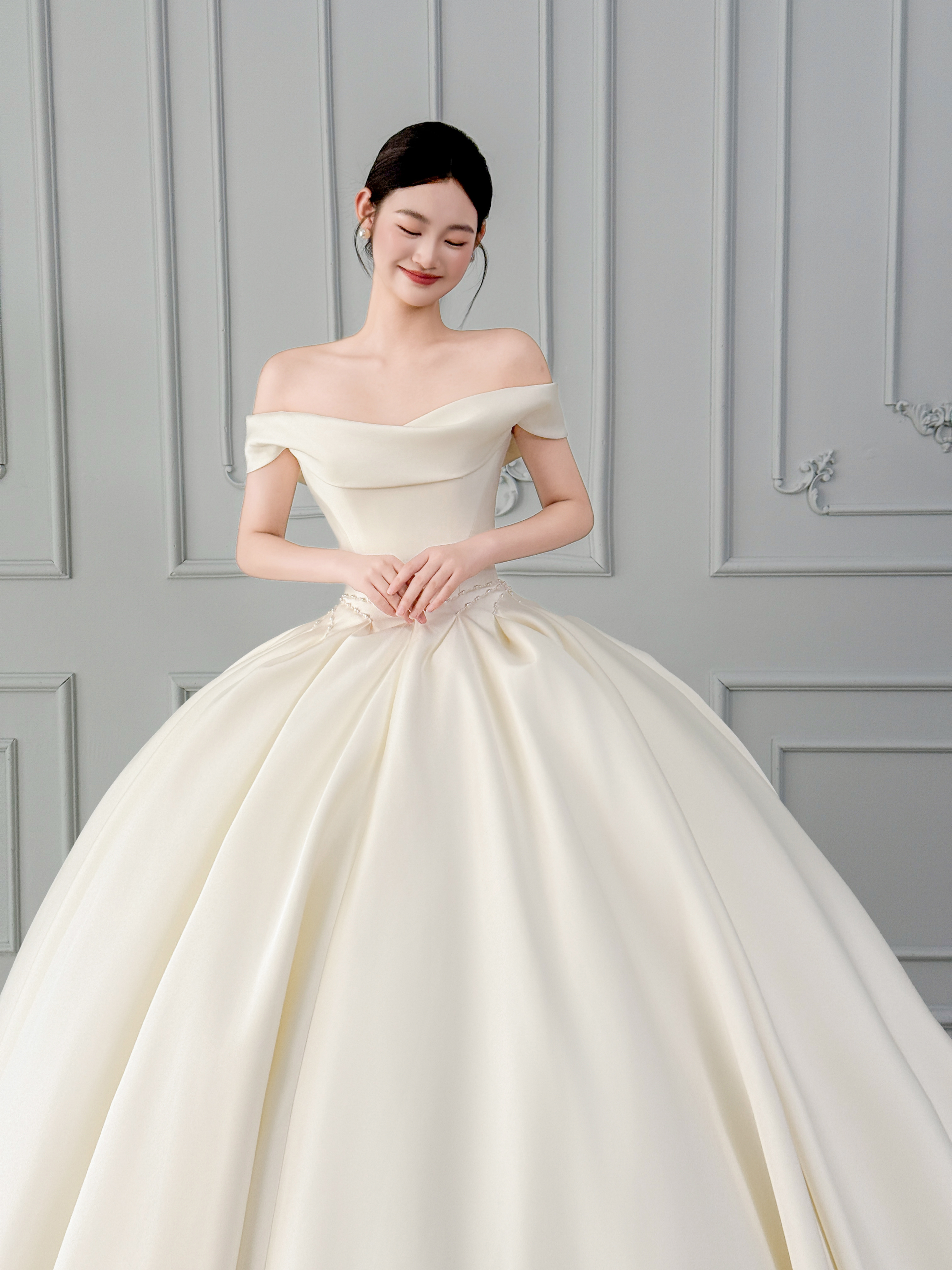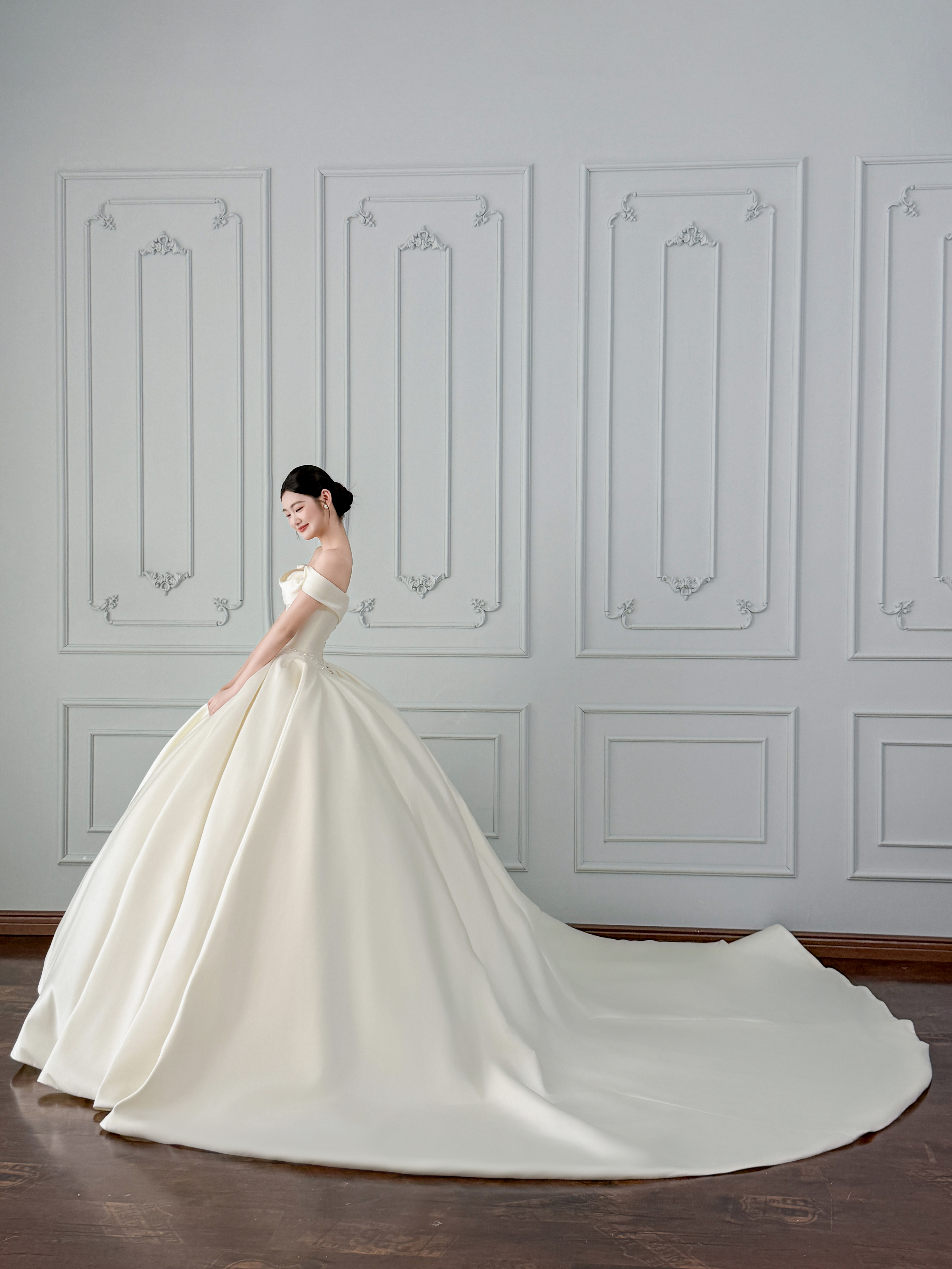 • LIXI 礼玺 天使碎片系列【暮雪】 干净高级感婚纱,永远都是浪漫宗旨 自带光泽感的缎面 如云朵般轻柔地包裹着少女曼妙 一字肩的设计,定格在领口 自然又显瘦 优雅和高级珍珠 配缎质感封神#清冷白月光缎面婚纱