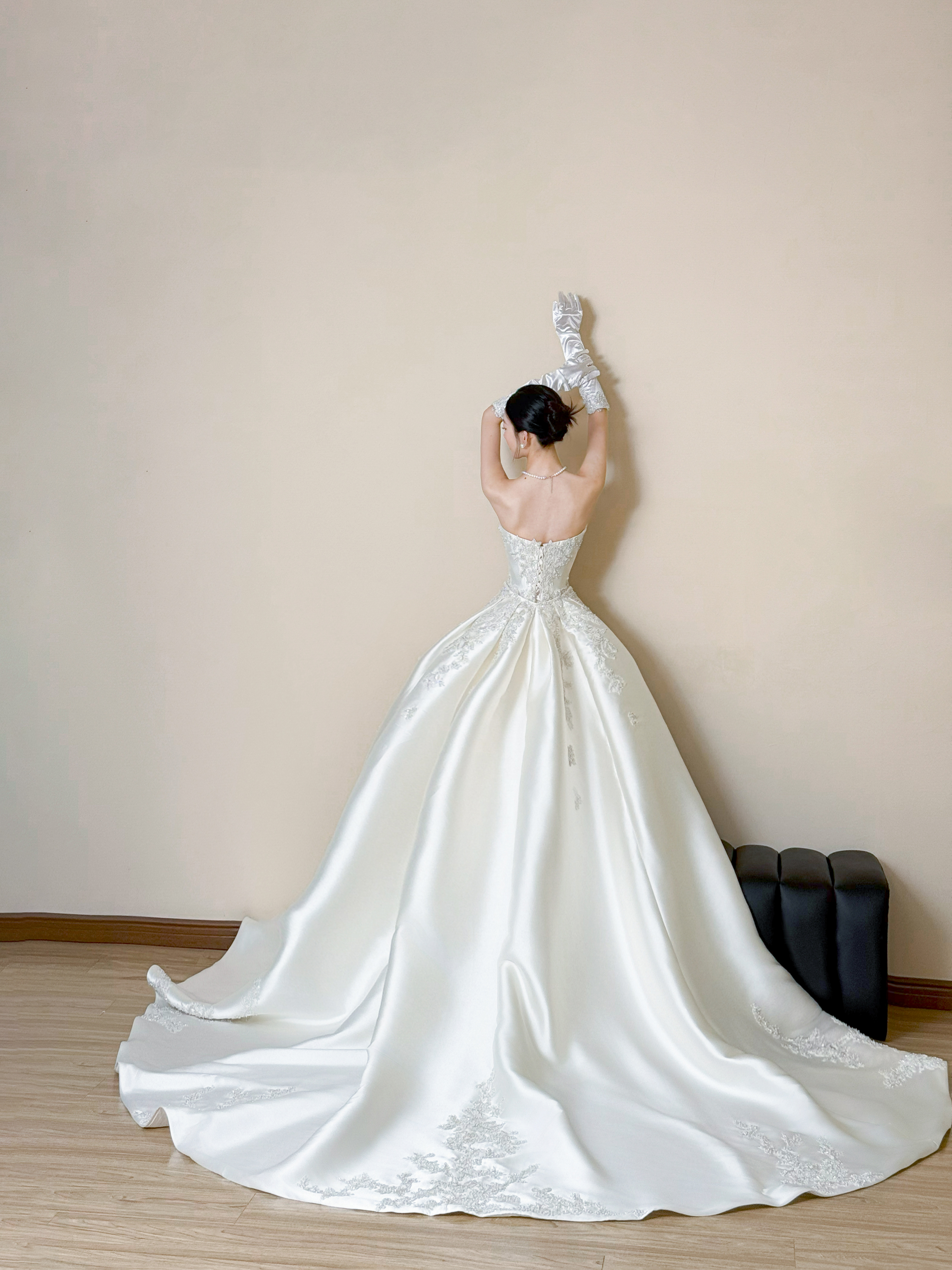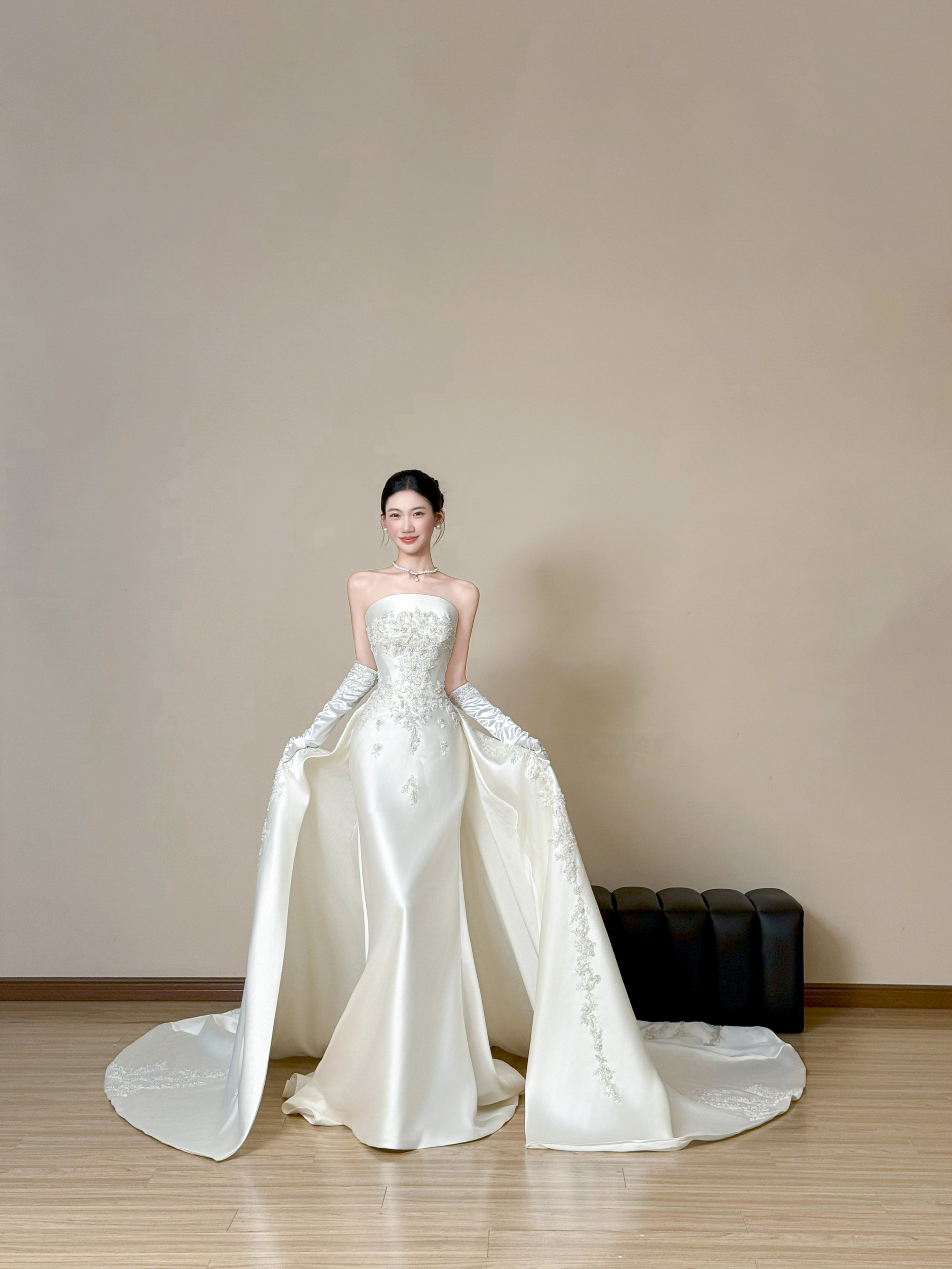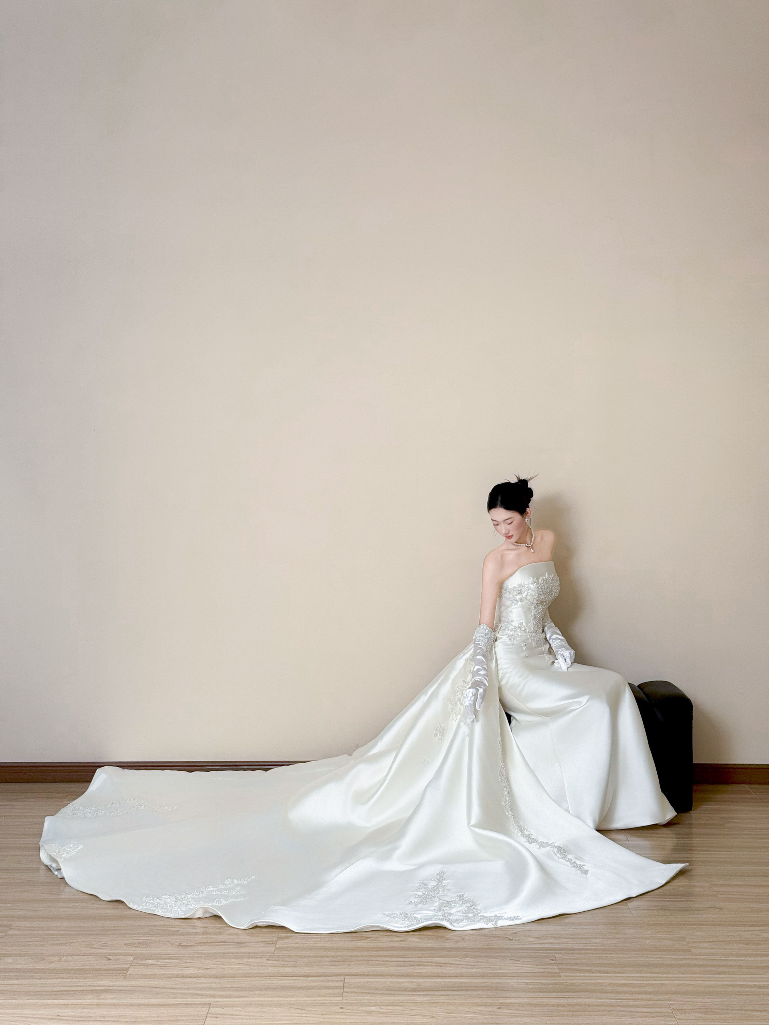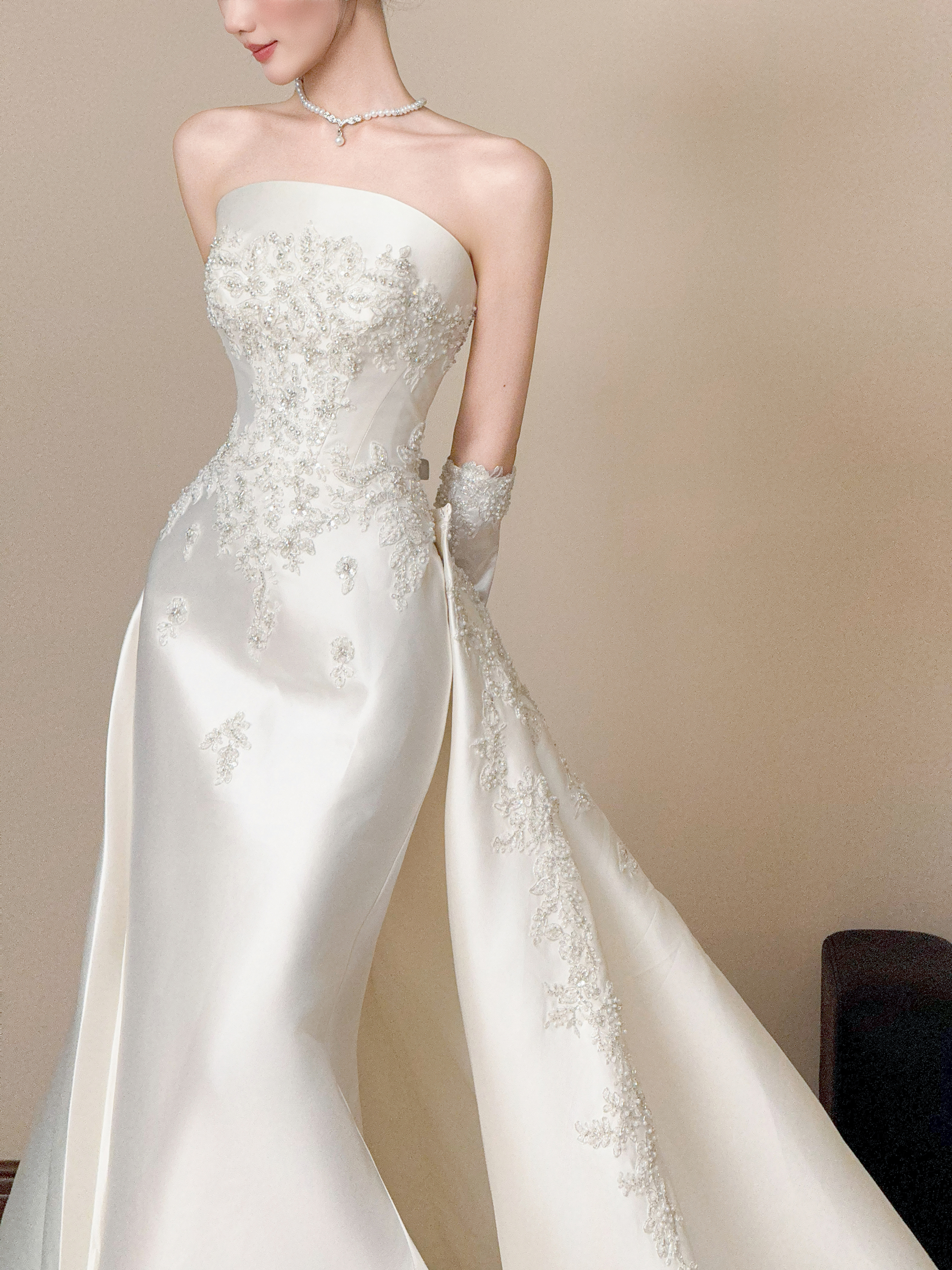• 奶油缎珍珠贝母般皎洁 珠钻刺绣宛若星河般璀璨夺目 抹胸修身裙身勾勒曼妙身姿 举手投足间皆是贵气与优雅#清冷白月光缎面婚纱